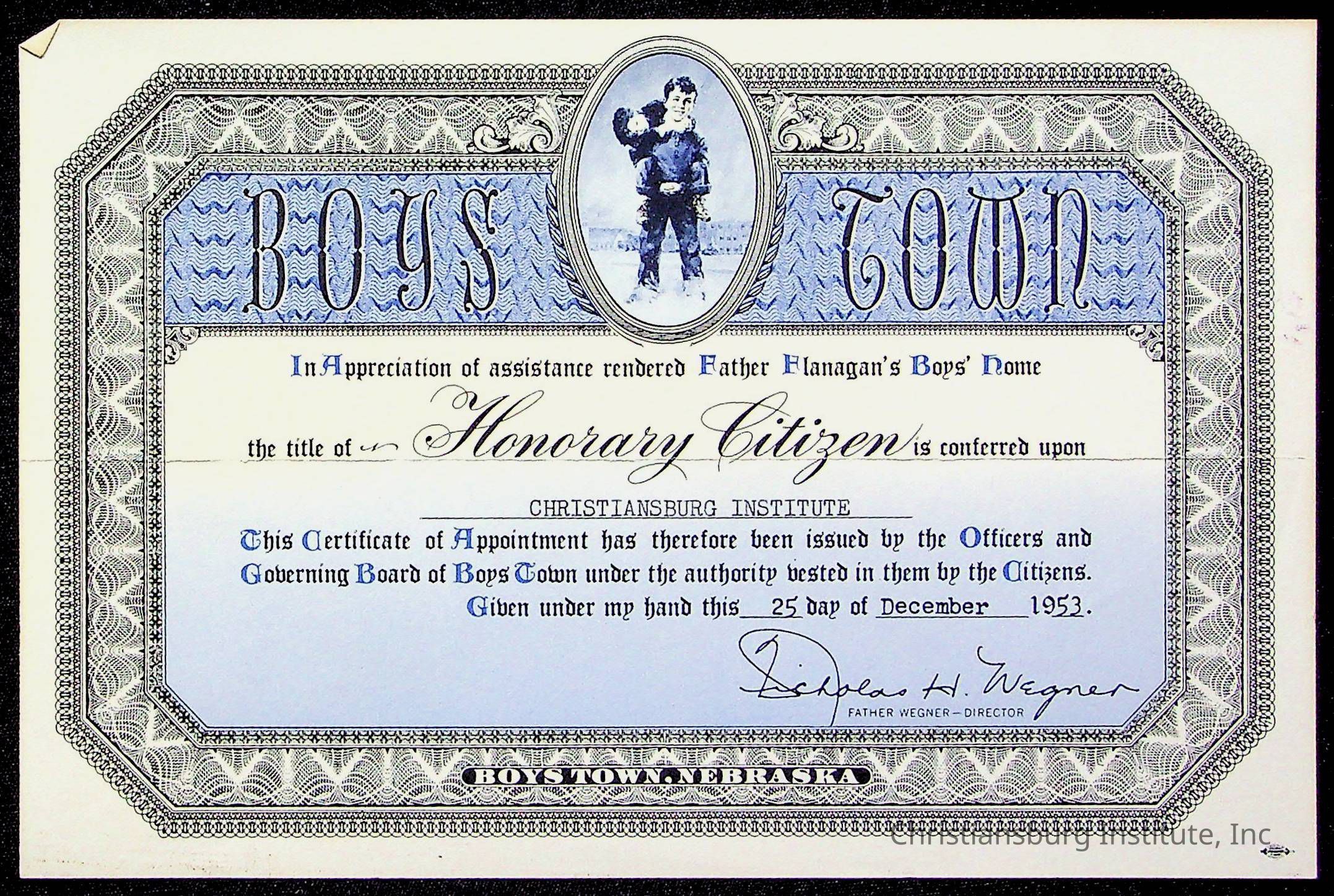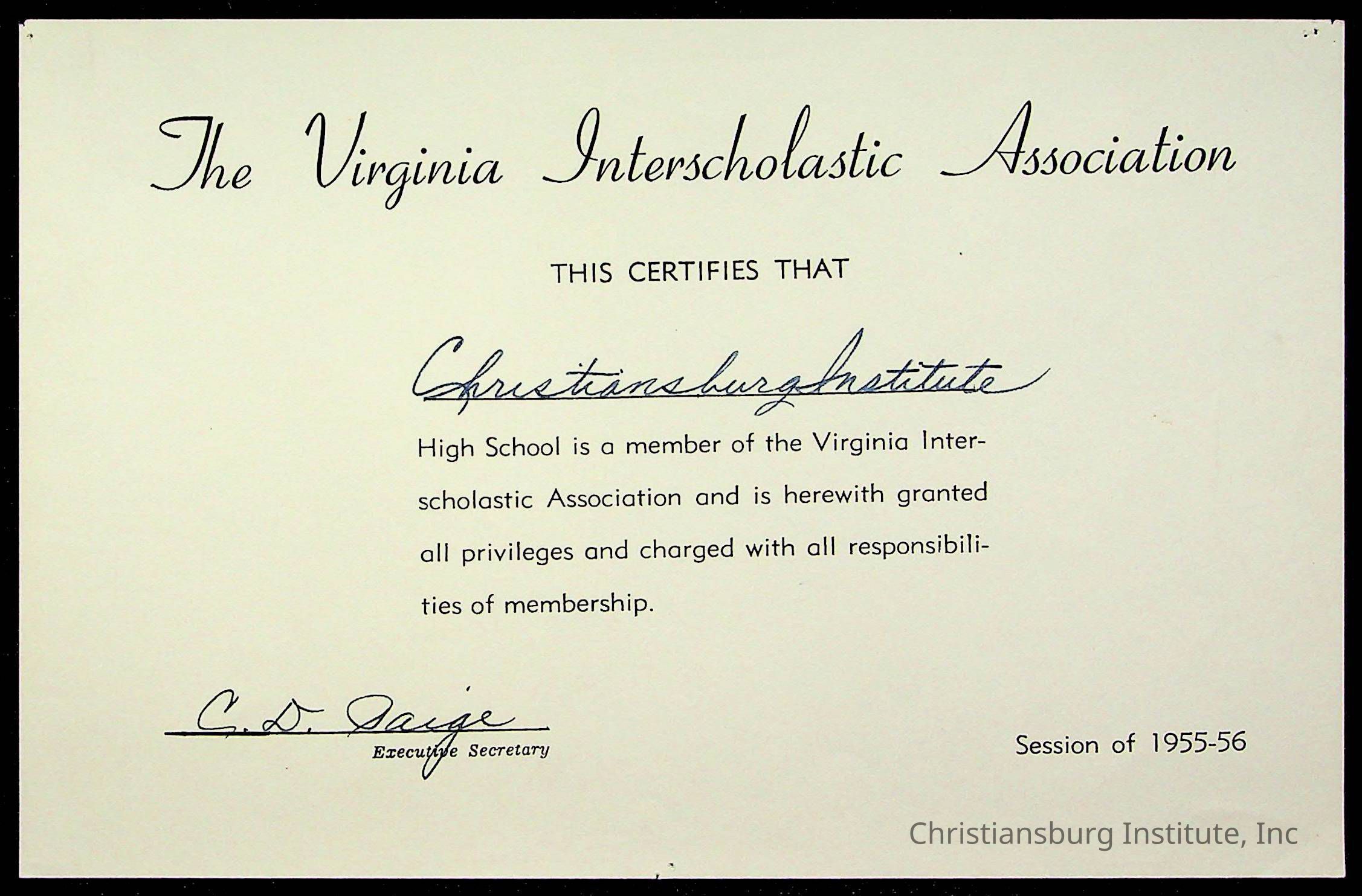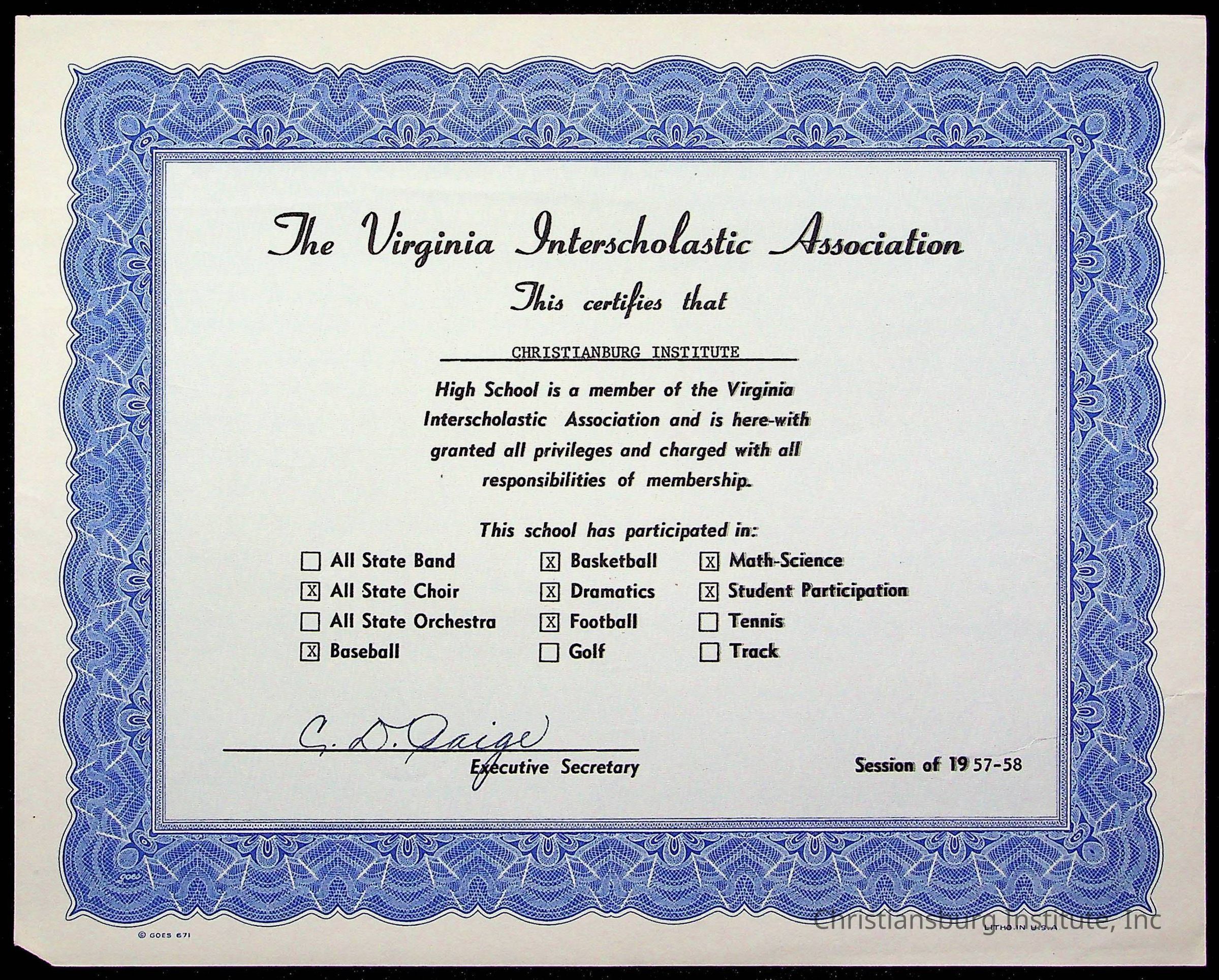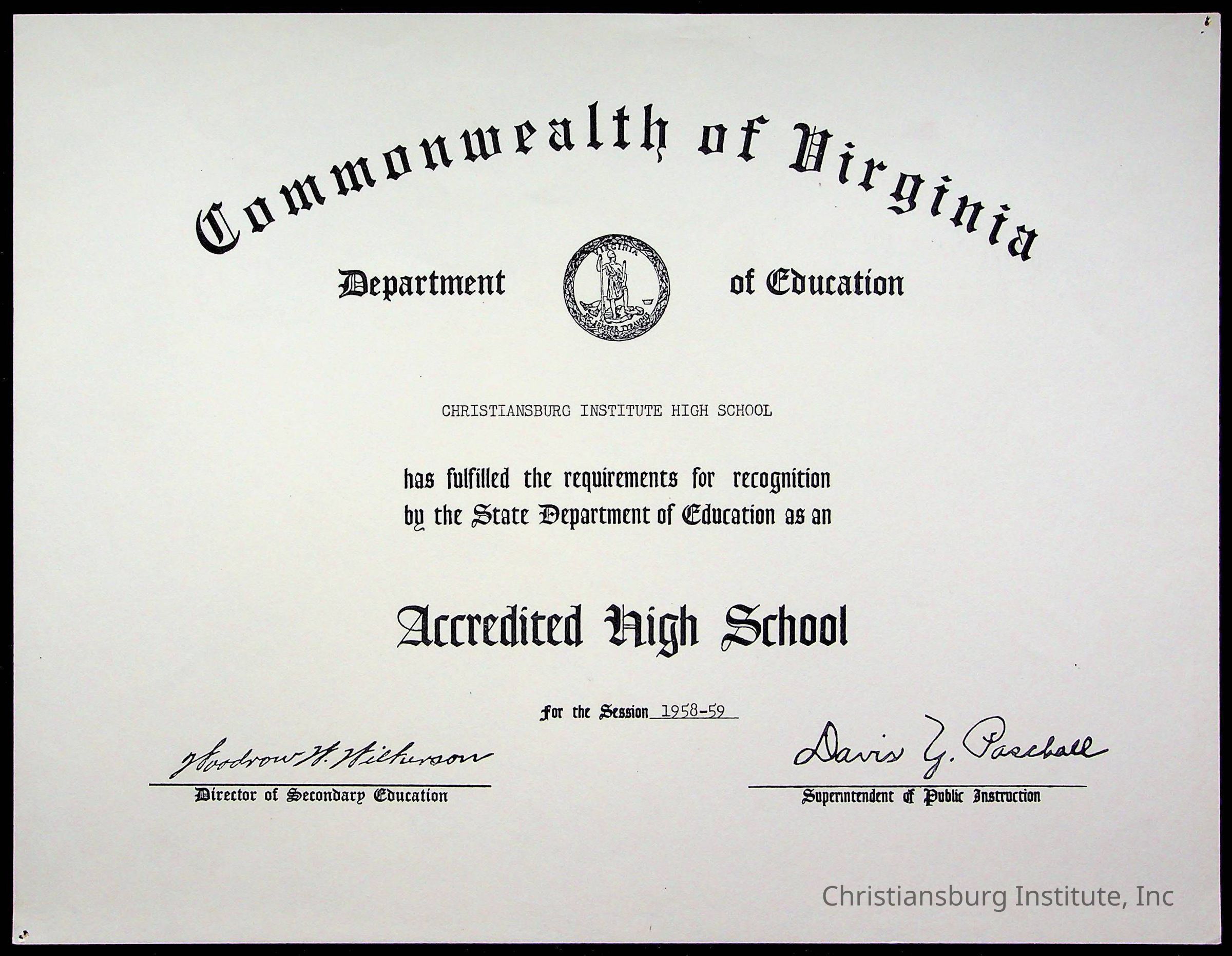 An archive of certificates issued to Christiansburg Institute including from the Commonwealth of Virginia, Boys Town, and the Virginia Interscholastic Association, date range 1951-1965.Collection