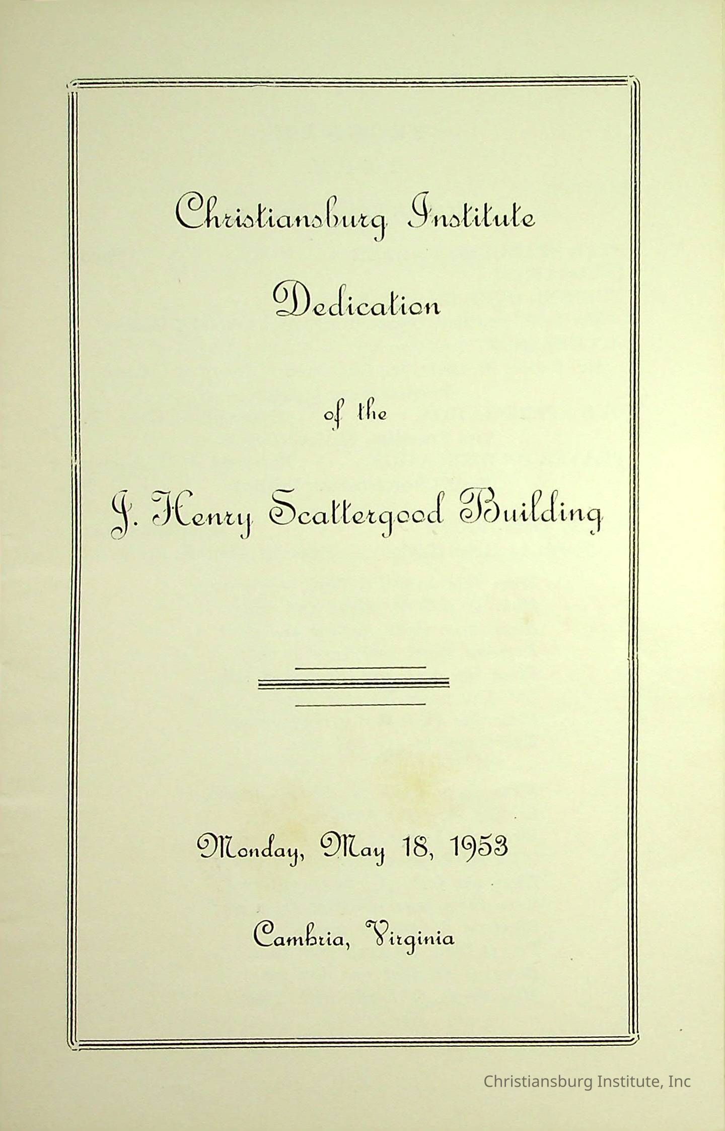An event program for the Christiansburg Institute Dedication of the J. Henry Scattergood Building on May 18th, 1953.Creator