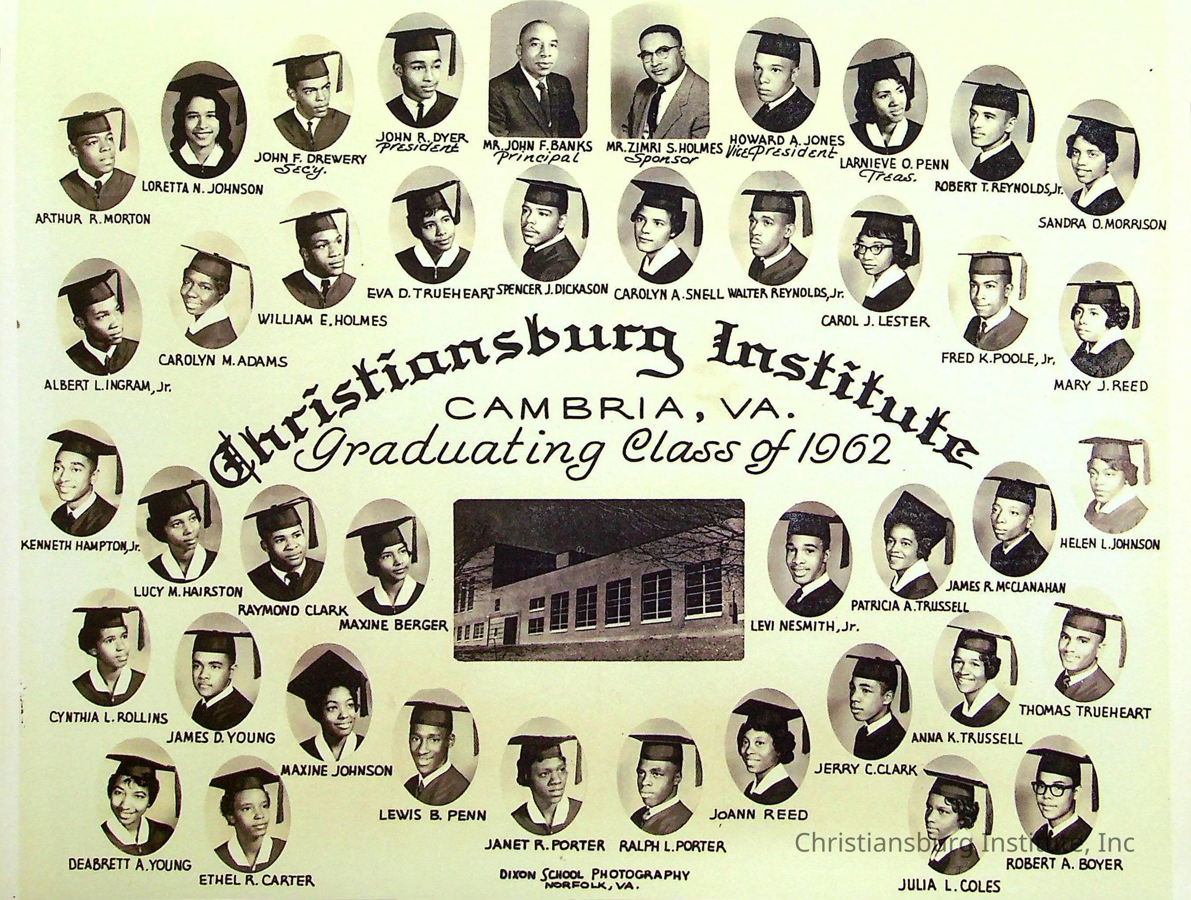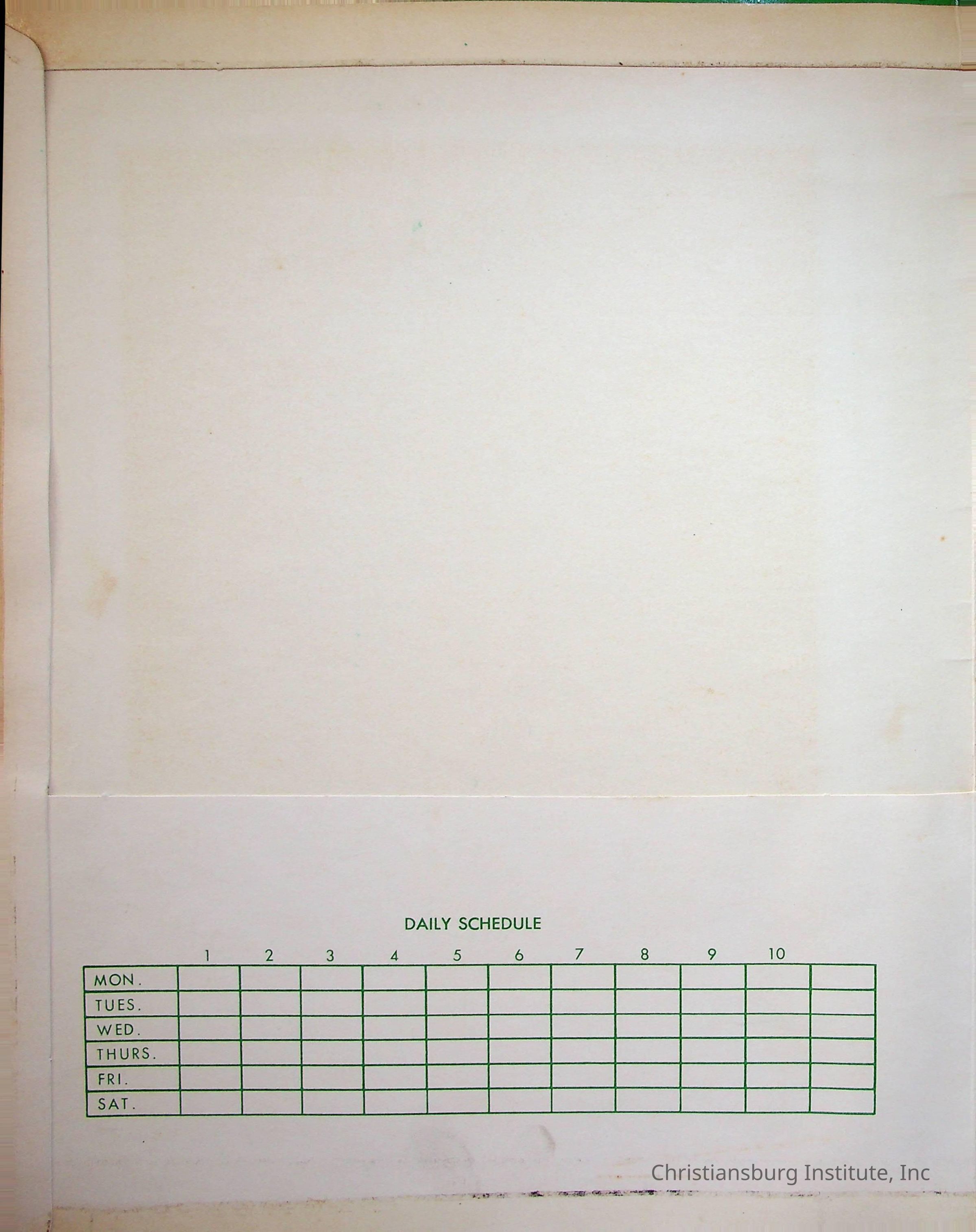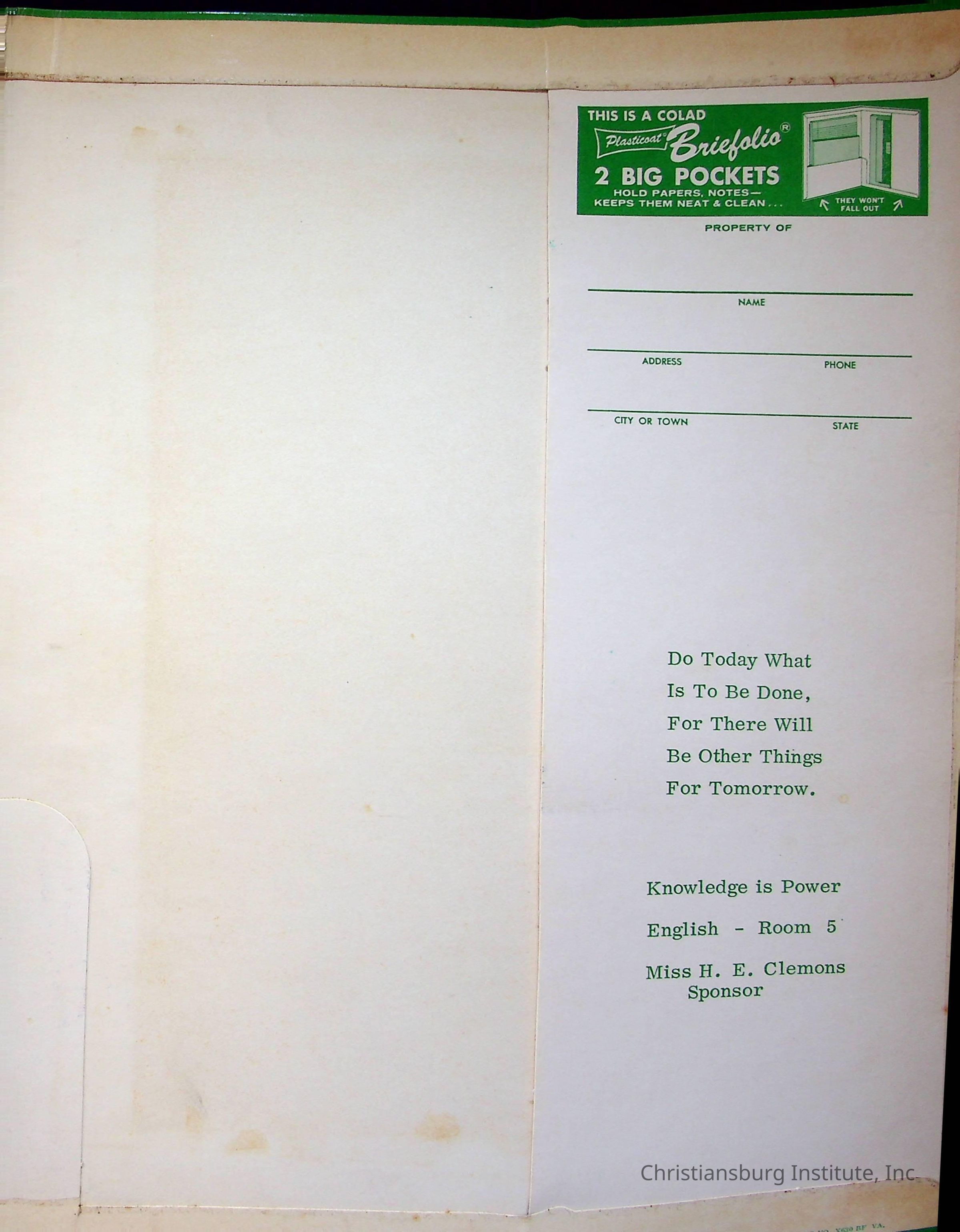 A Colad Plasticoat folder with Christiansburg Institute branding with contents. Contents include: Christiansburg Institute senior class graduating class of 1962 photo, photo of CI's campus.Collection
