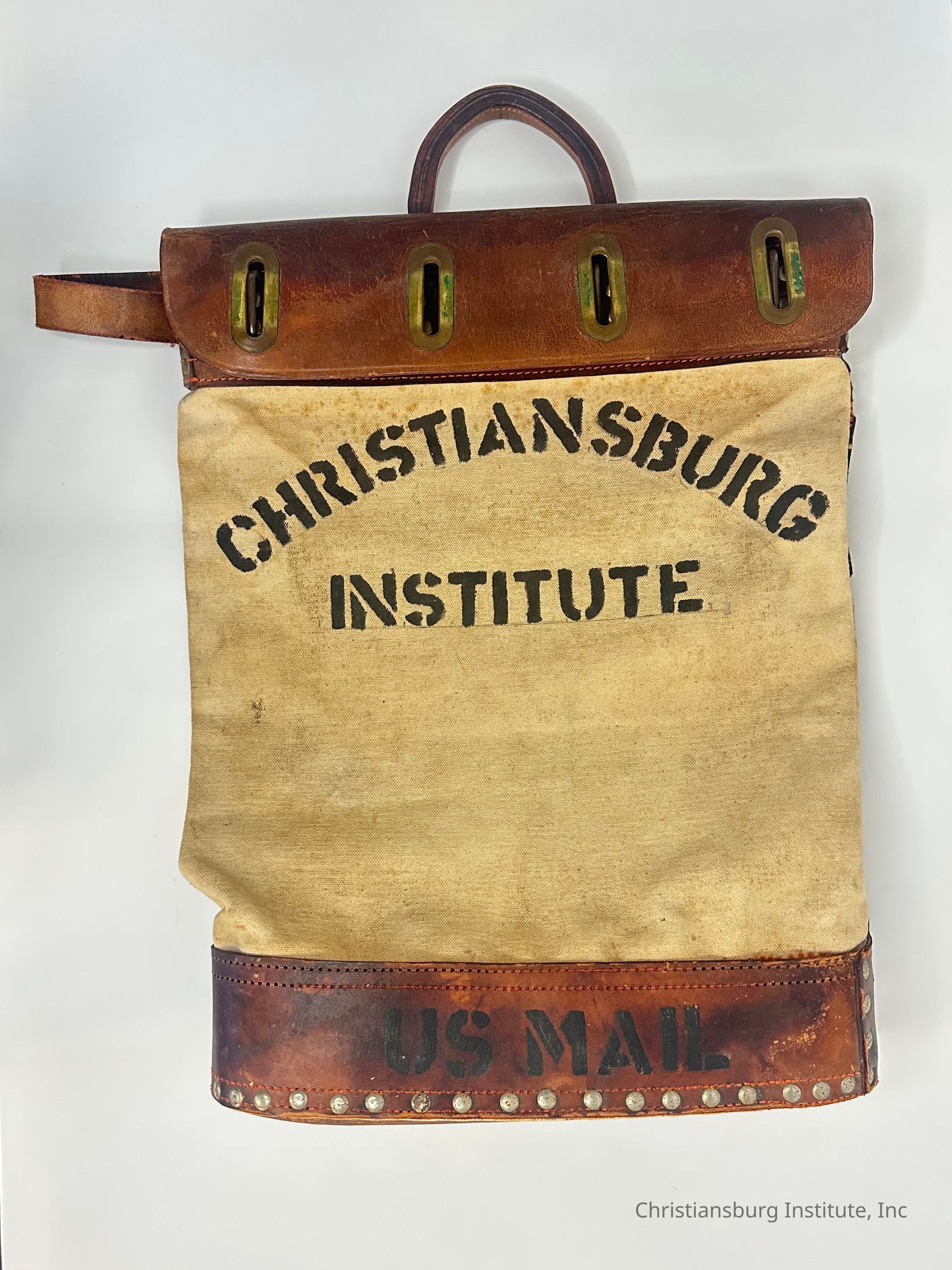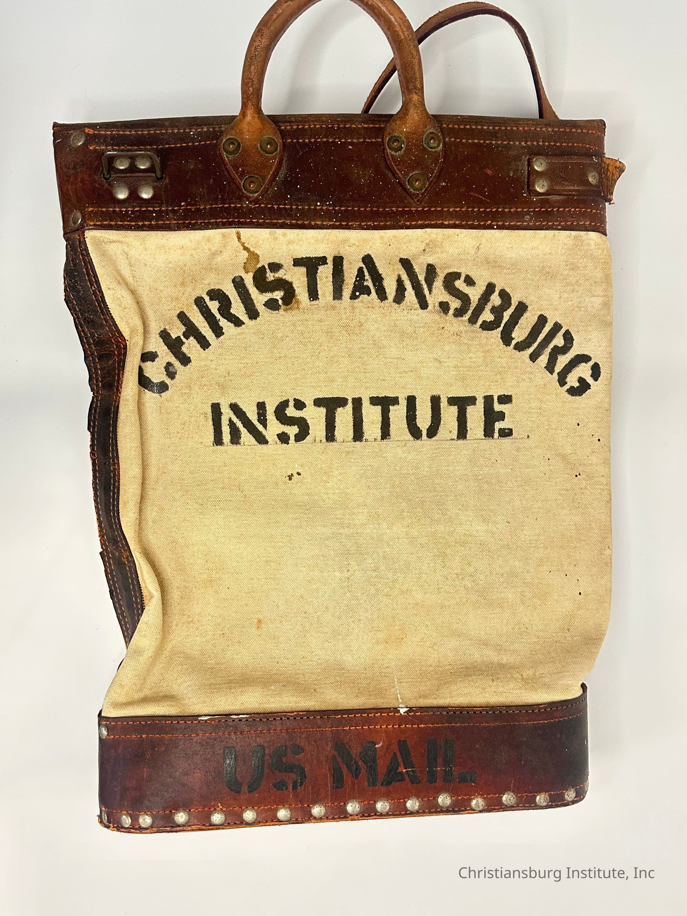 A white canvas and brown leather mail bag with the words 'Christiansburg Institute' printed on the canvas and 'US Mail' imprinted on the leather, undated.