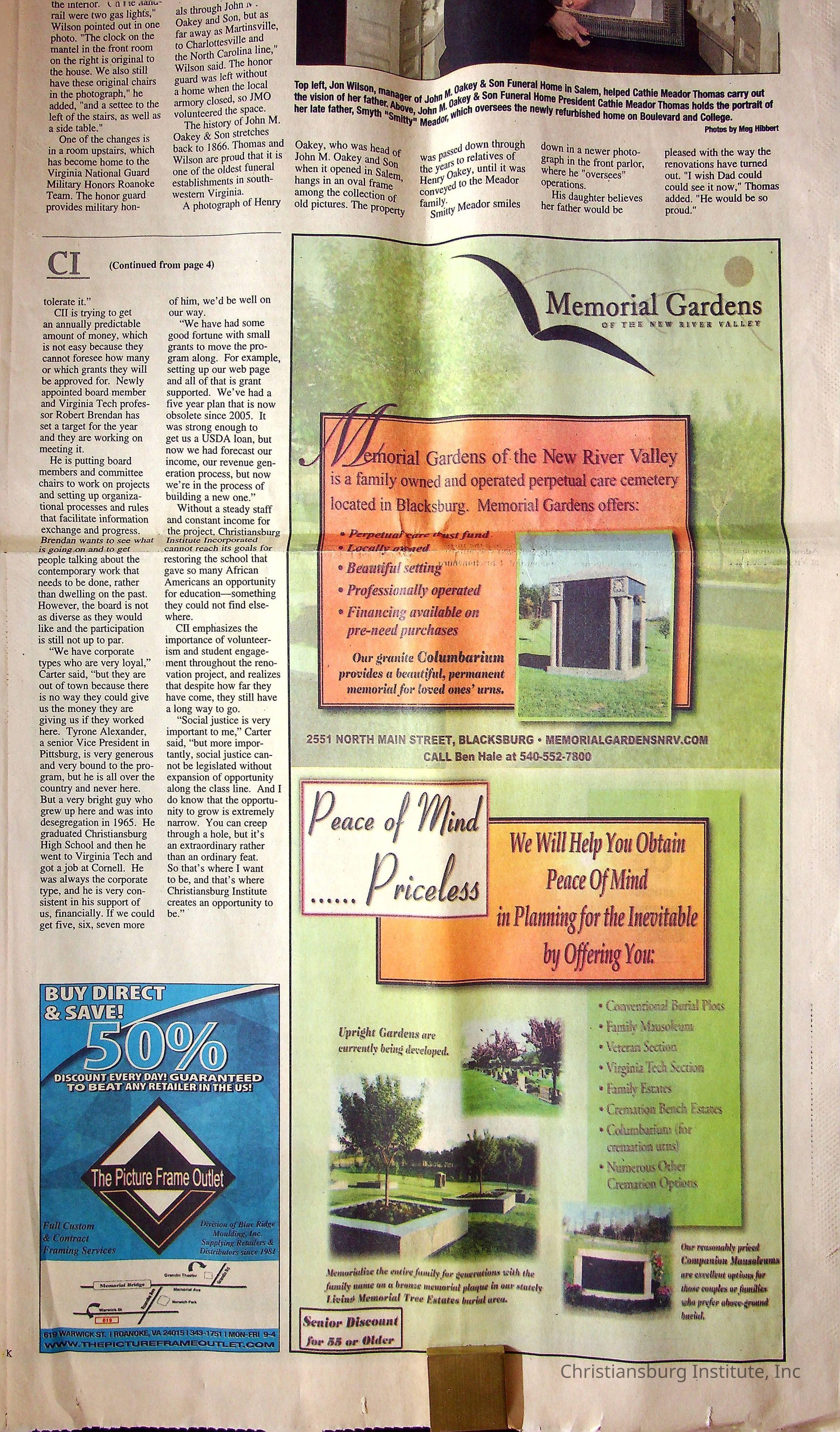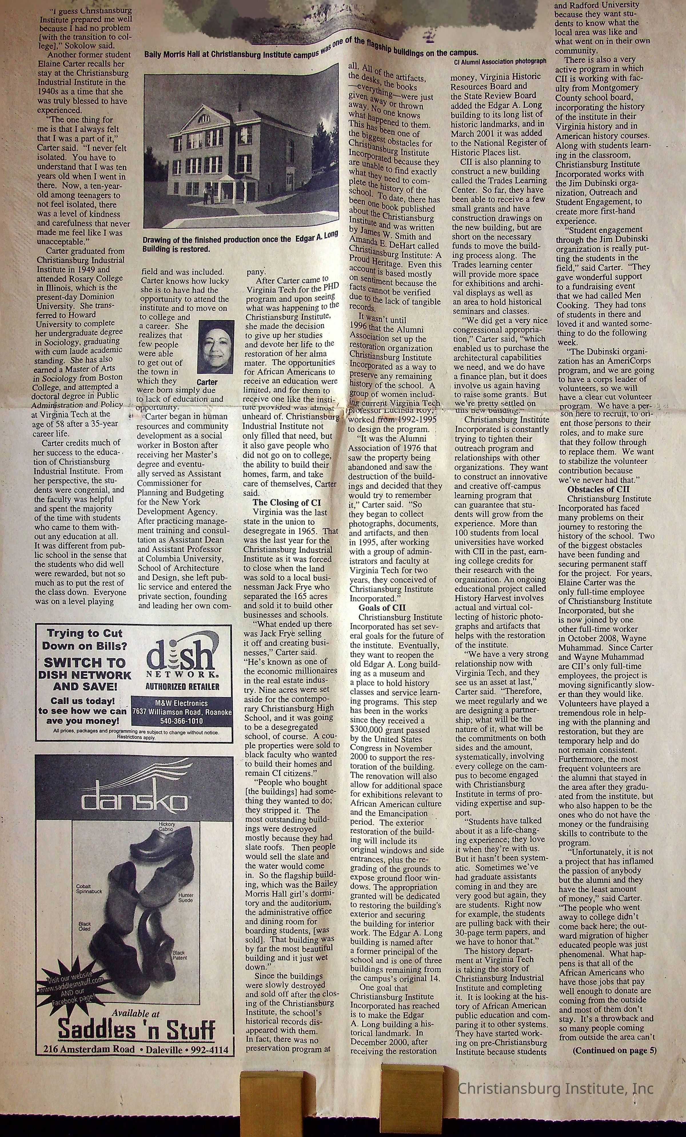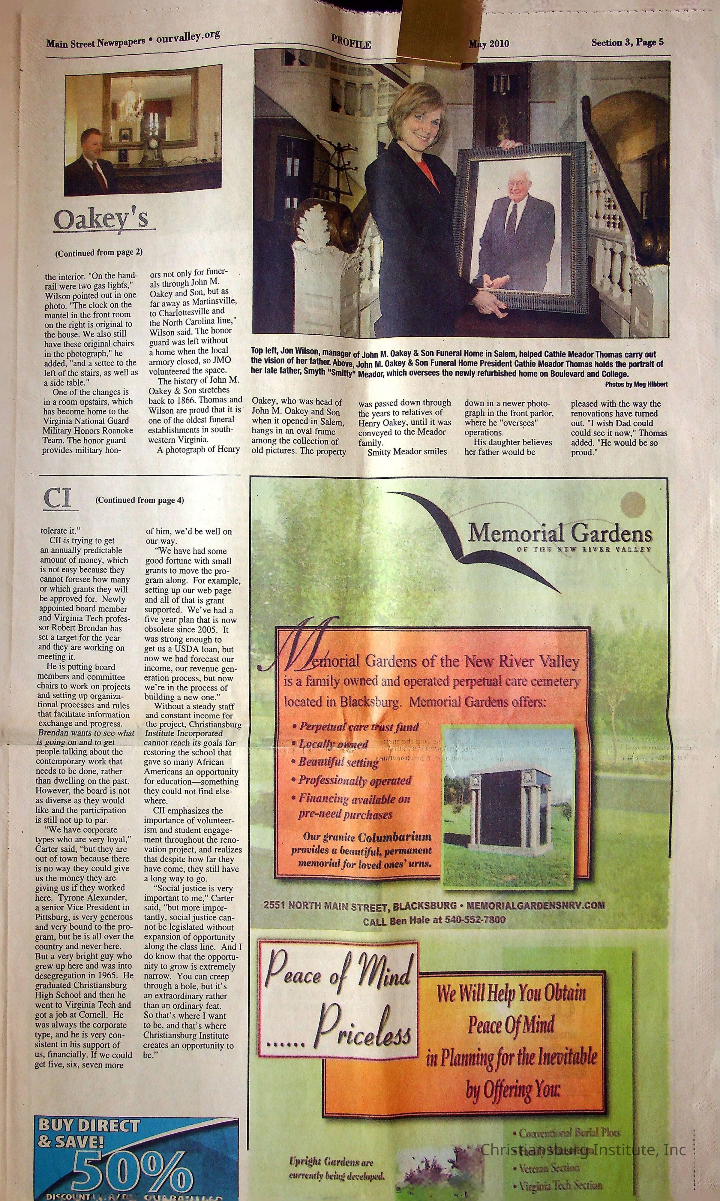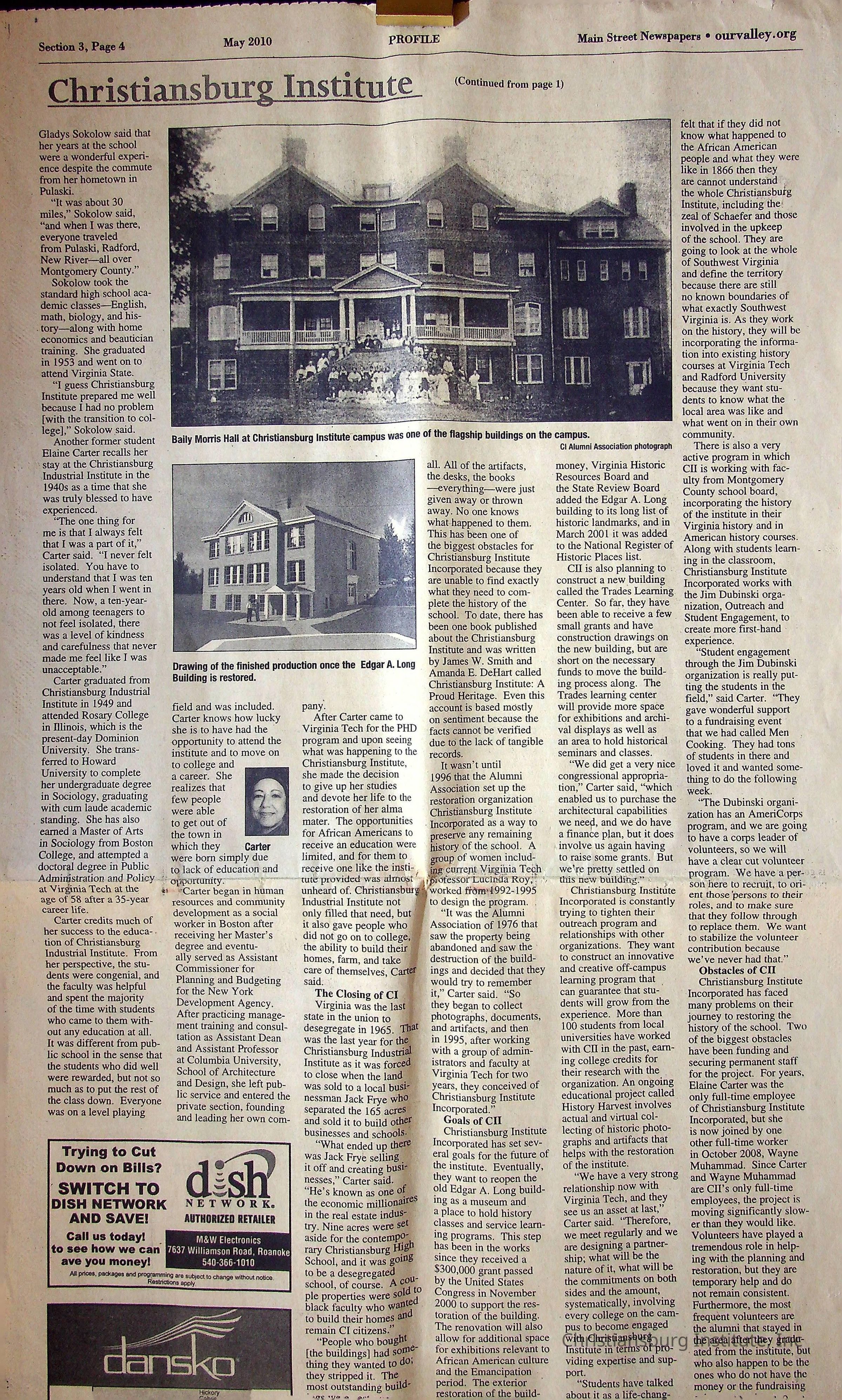 A newspaper clipping from Main Street Newspapers from May 2010 that discusses Christiansburg Institute.Collection