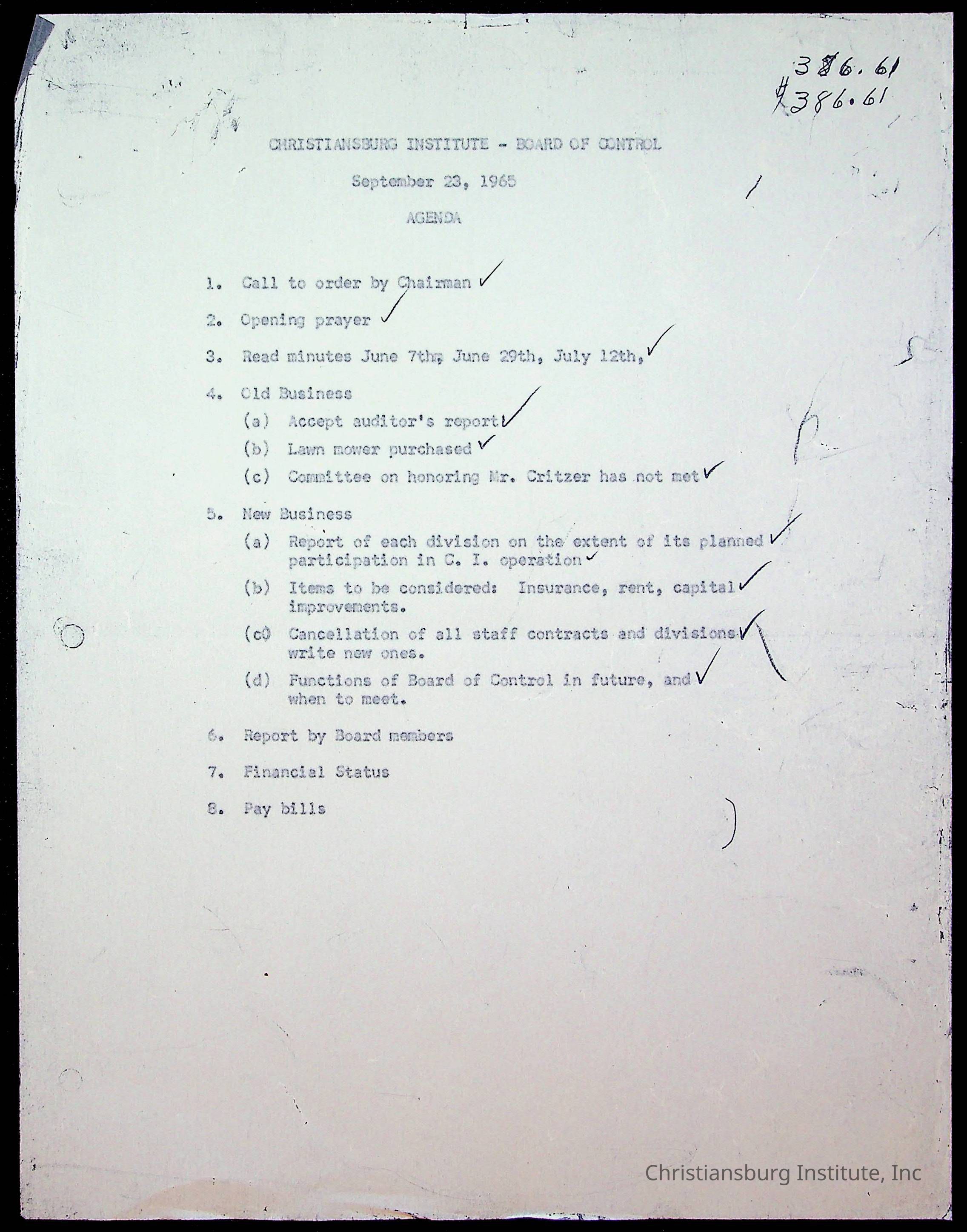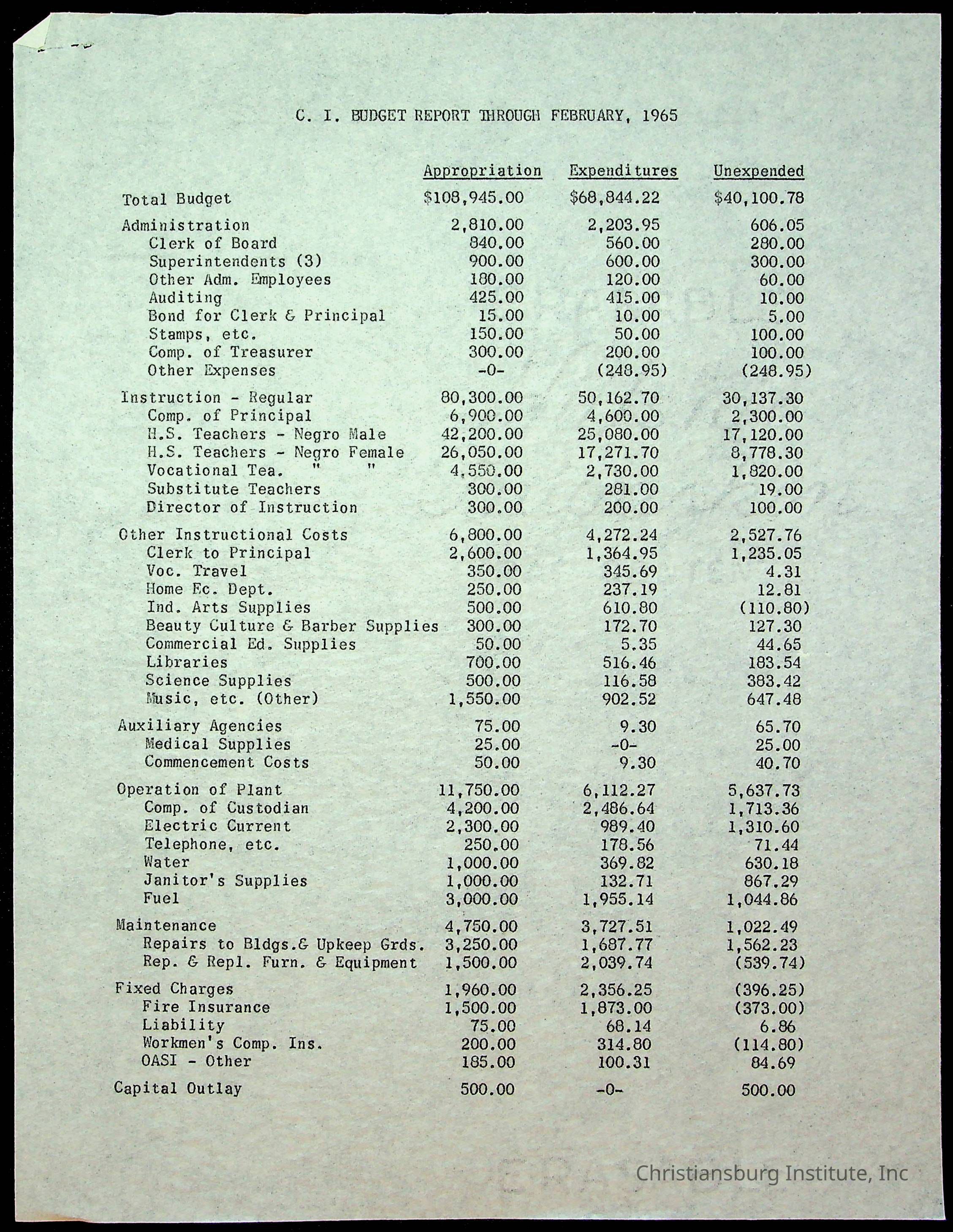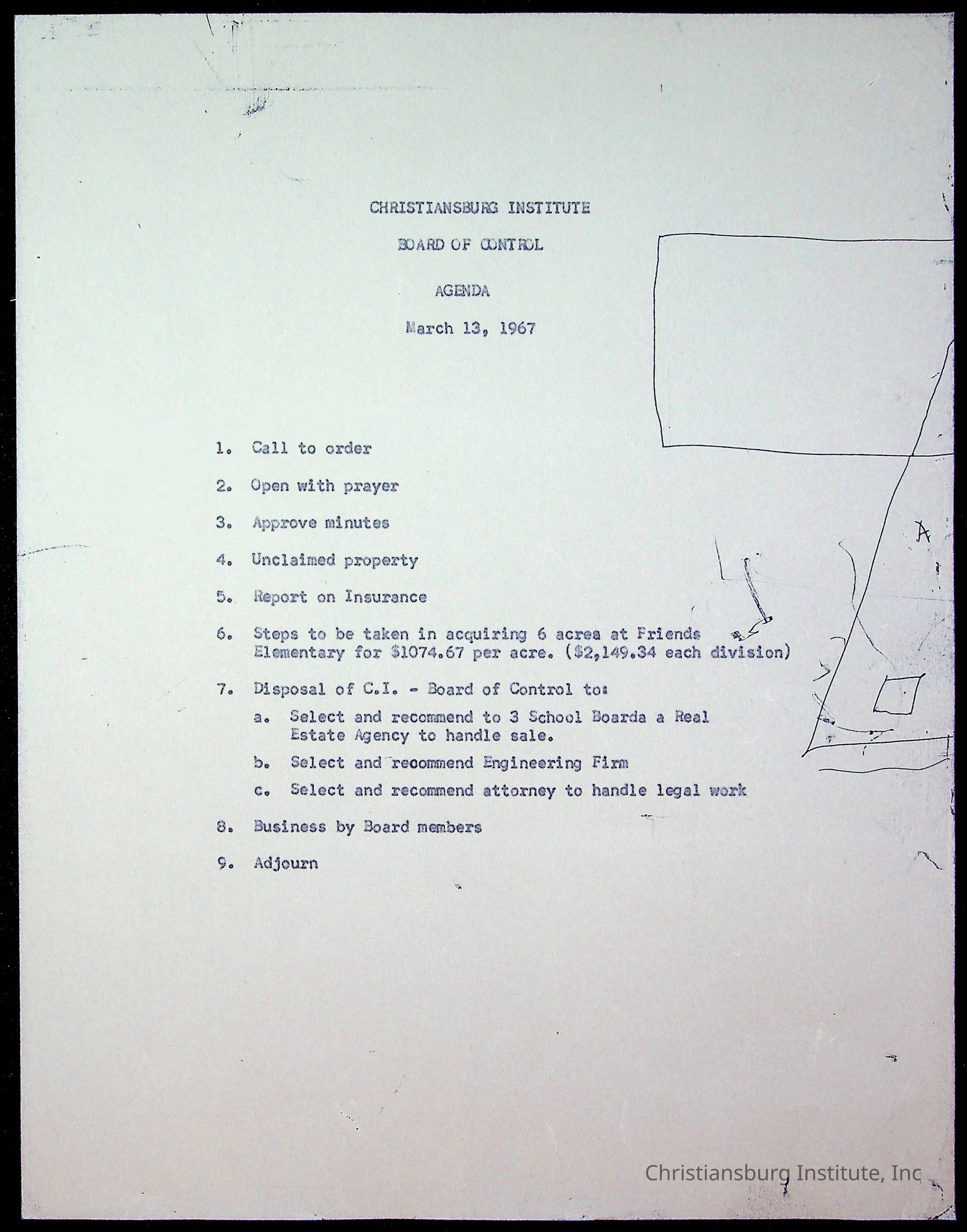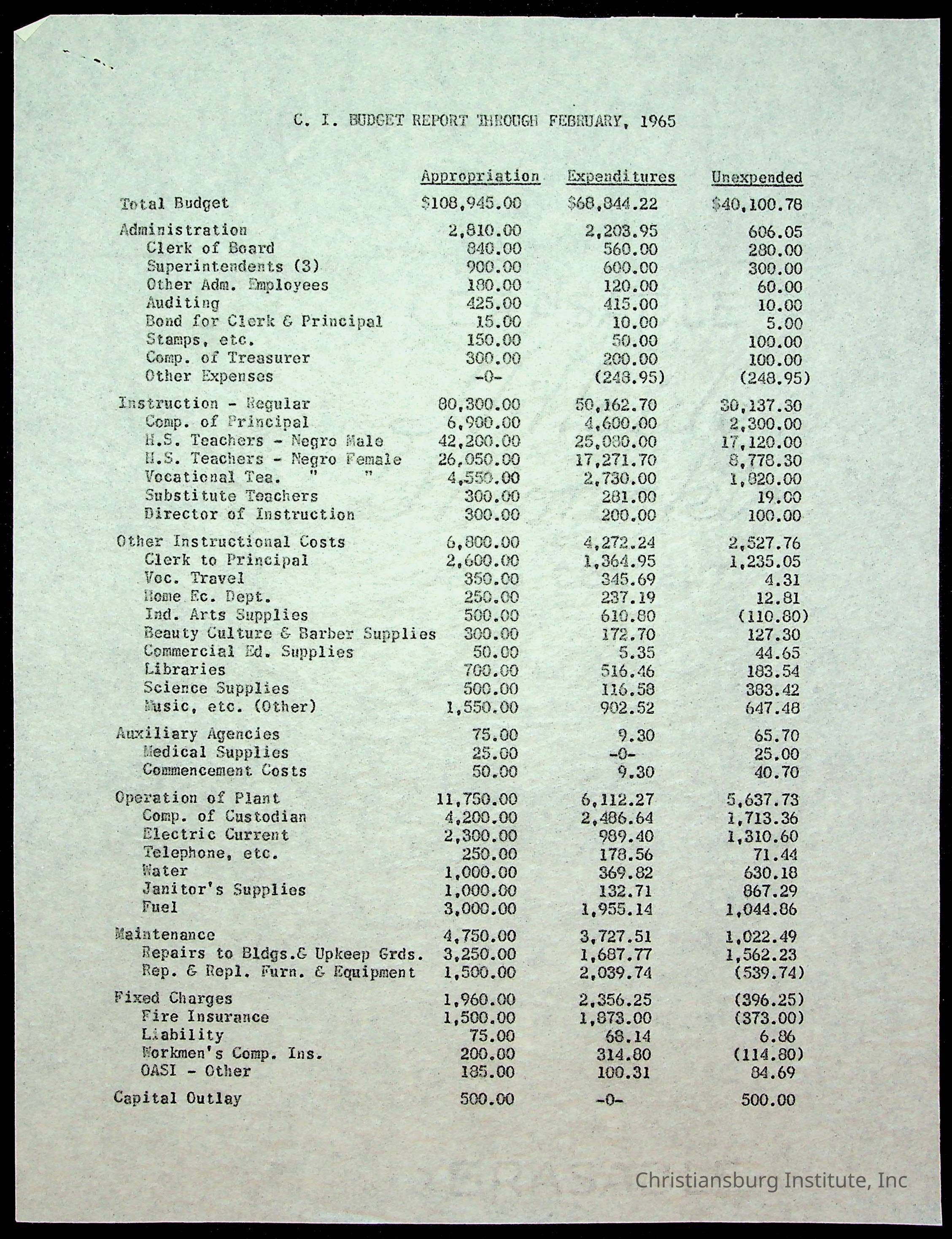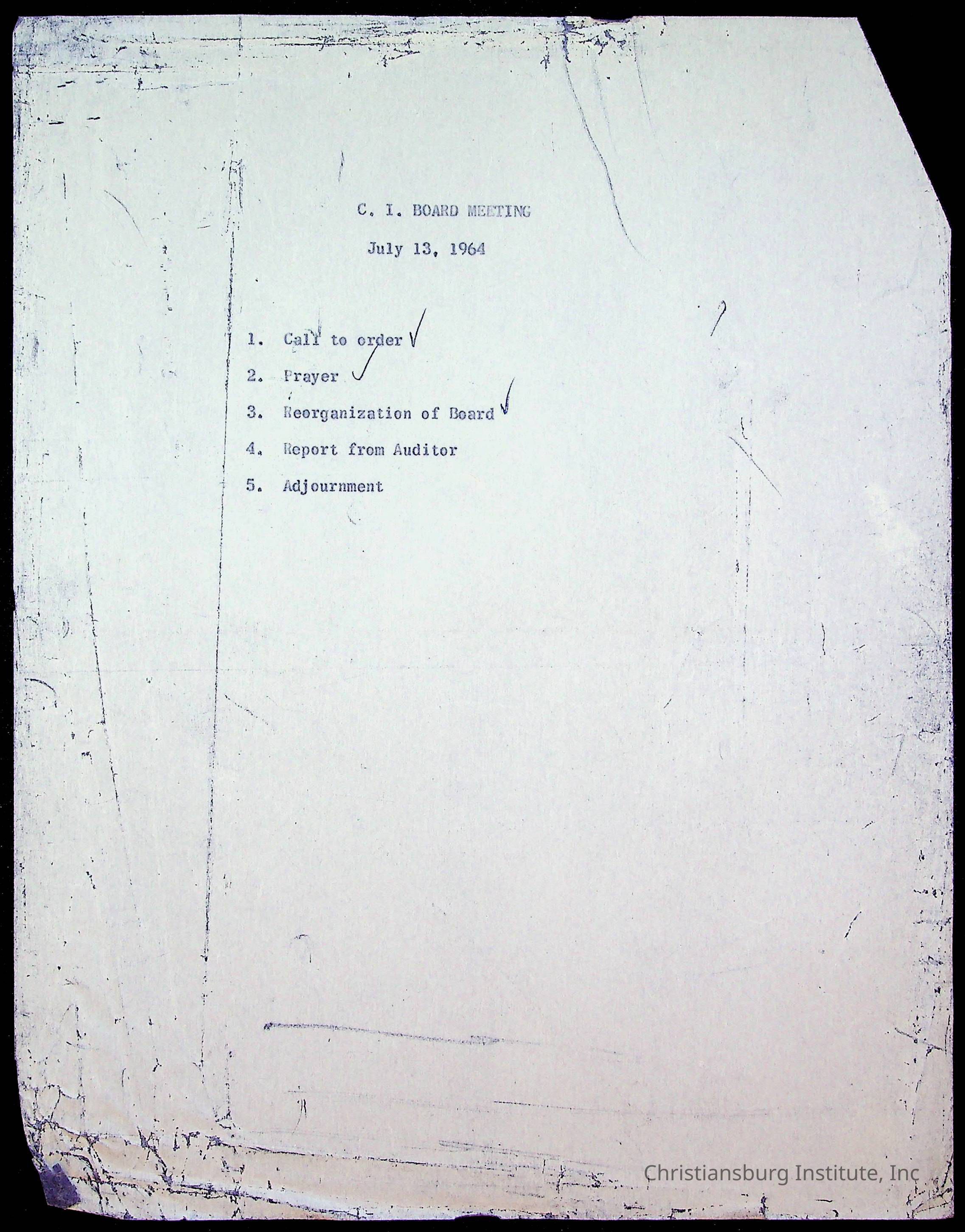 An archive of miscellaneous financial documents that relate to Christiansburg Institute, circa 1960s including; correspondences, loan documents, board meetings, and notes.Collection
