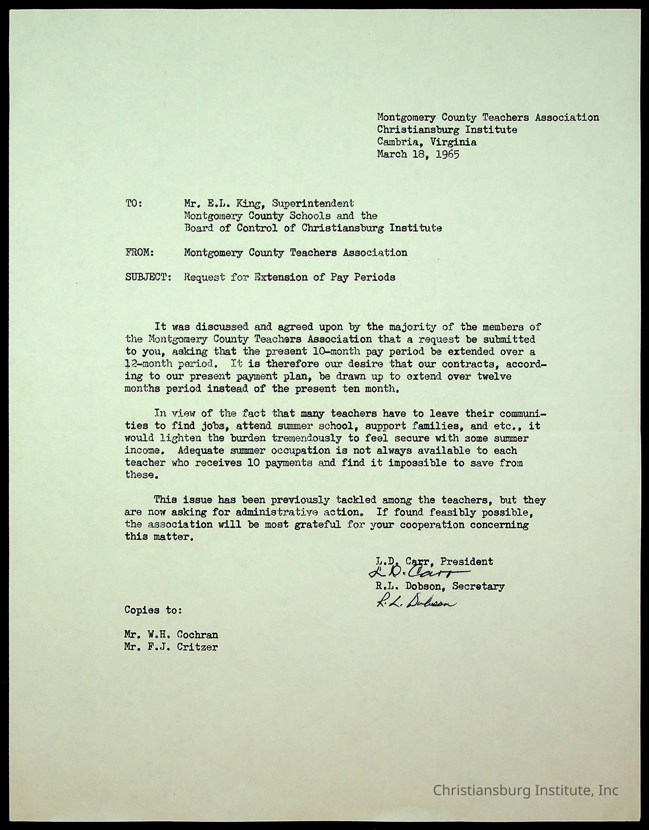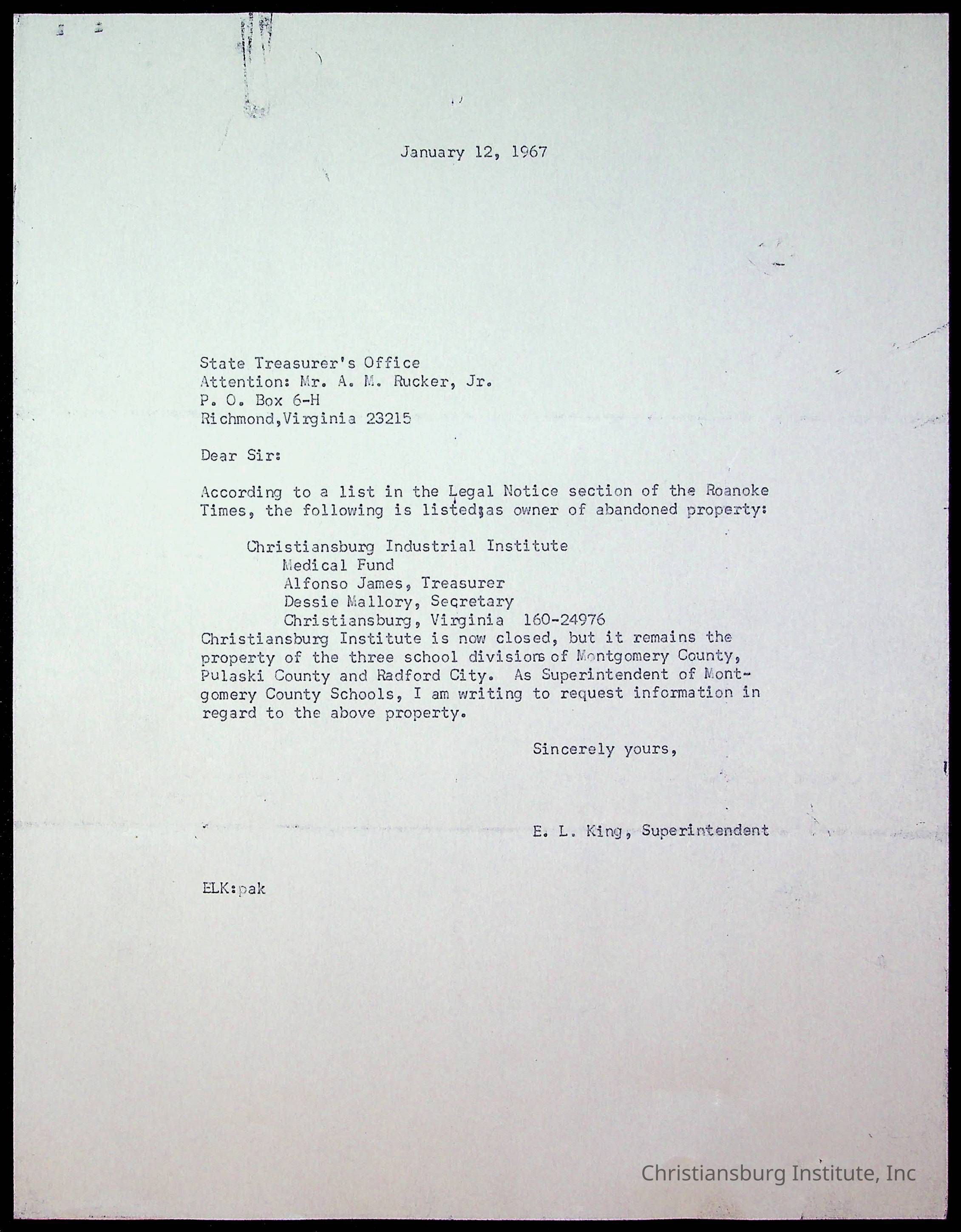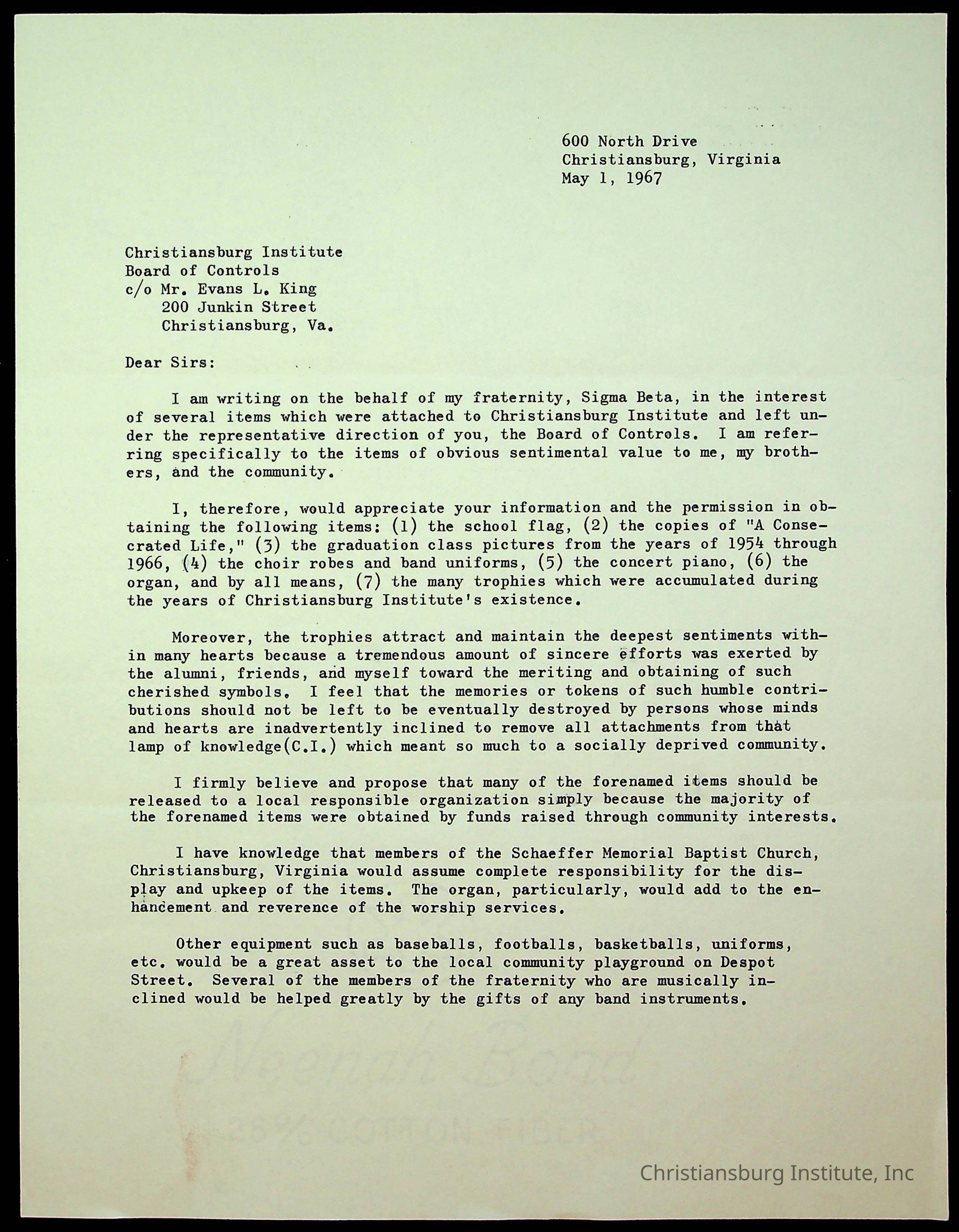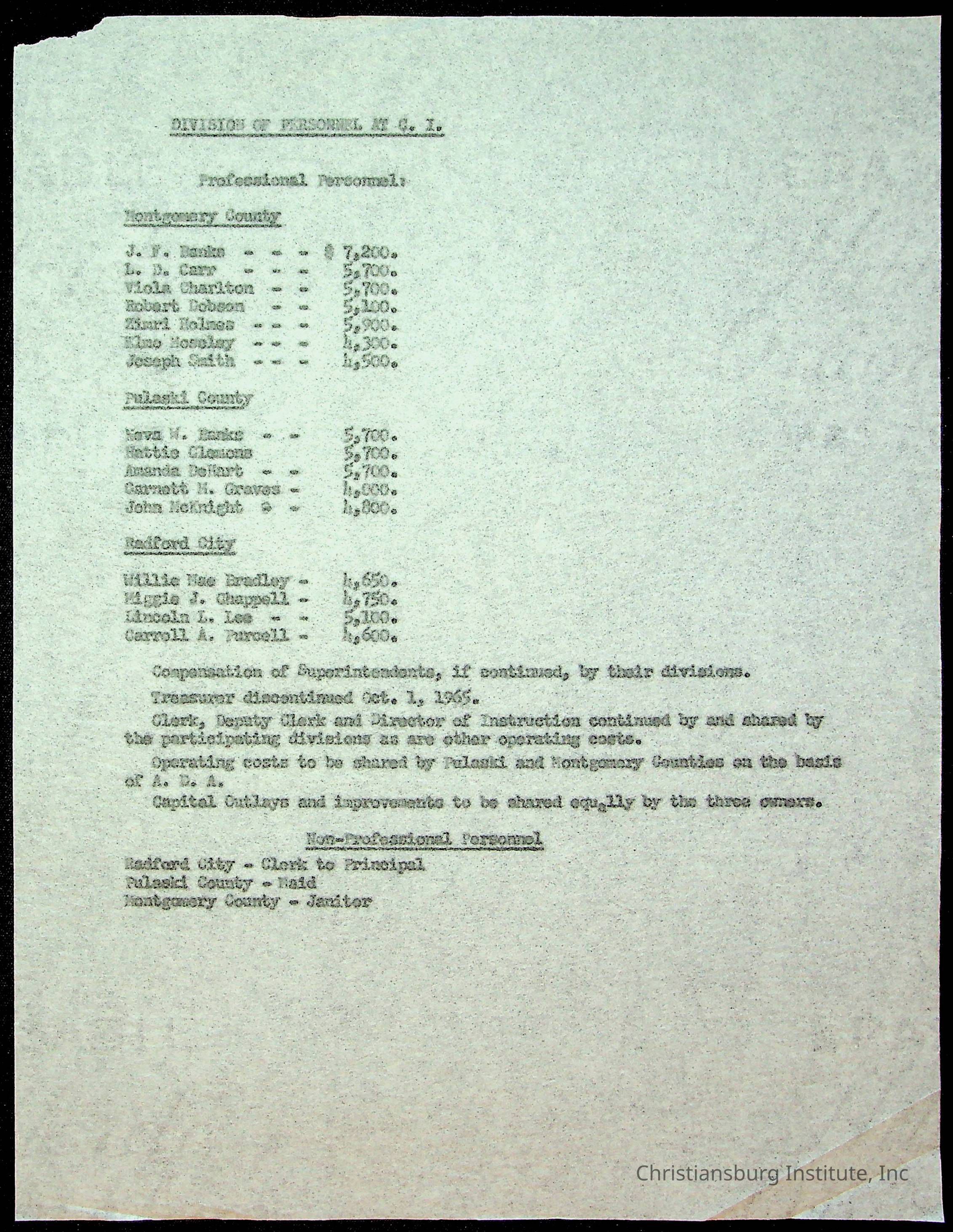 Copyright has been assigned to Christiansburg Institute Museum & Archives by Montgomery County Public Schools. For permission to publish materials created by the donor, contact CIMA@christiansburginstitute.com. Materials not created by Christiansburg Industrial Institute may still be under copyright.