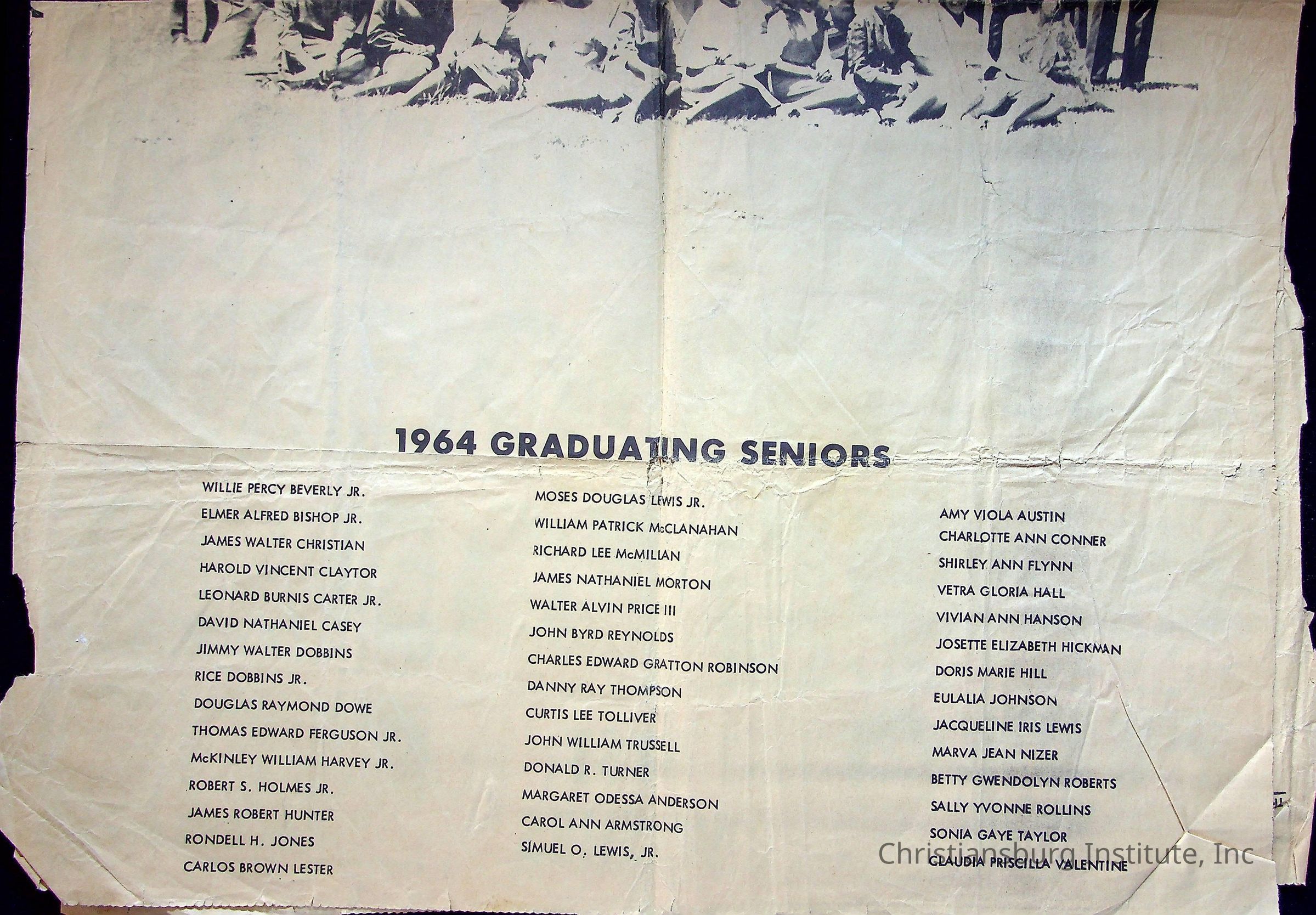 A newspaper clipping from Montgomery News Messenger from June 4th, 1964 that announces the 1964 graduating seniors from Christiansburg Institute with a photograph.Collection
