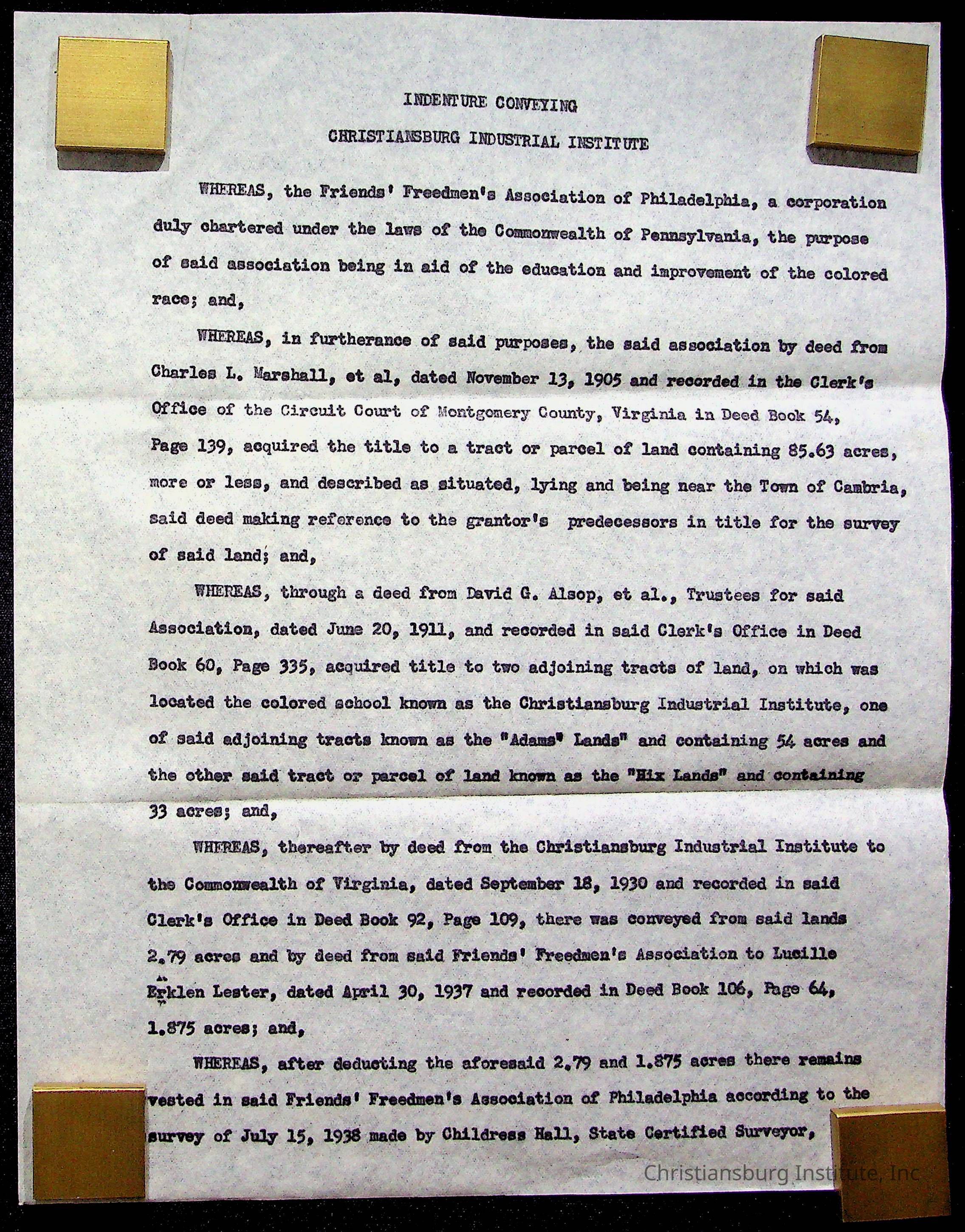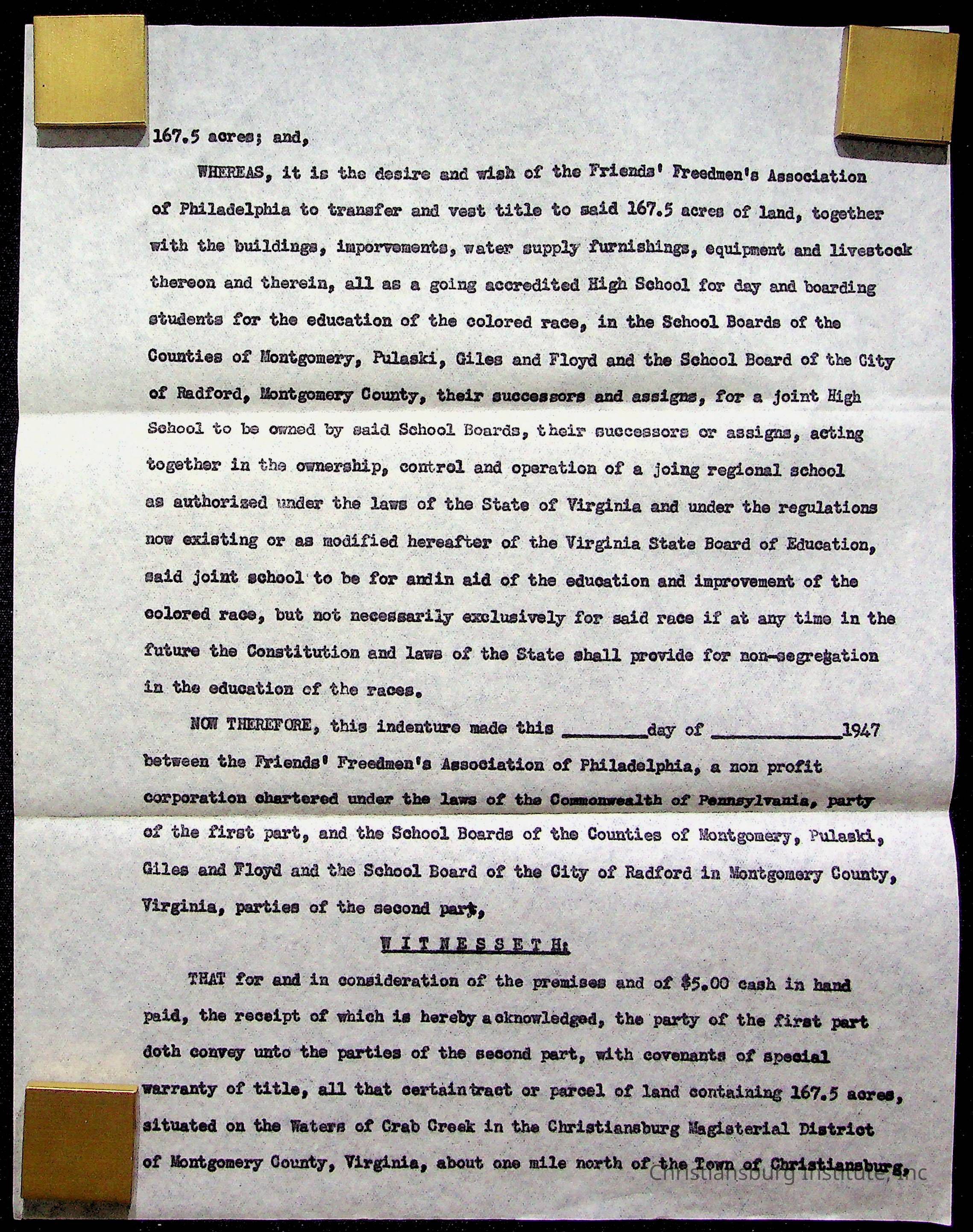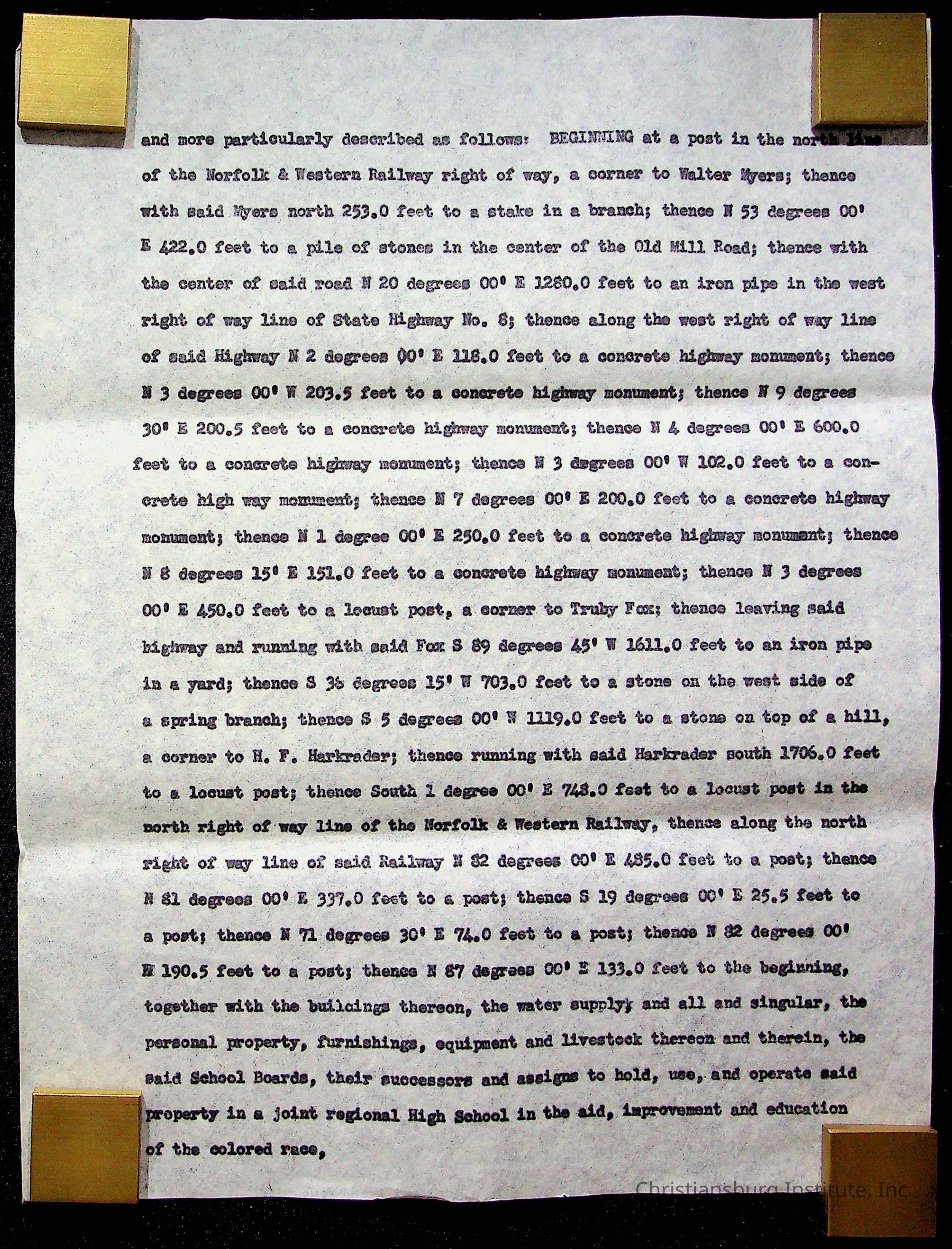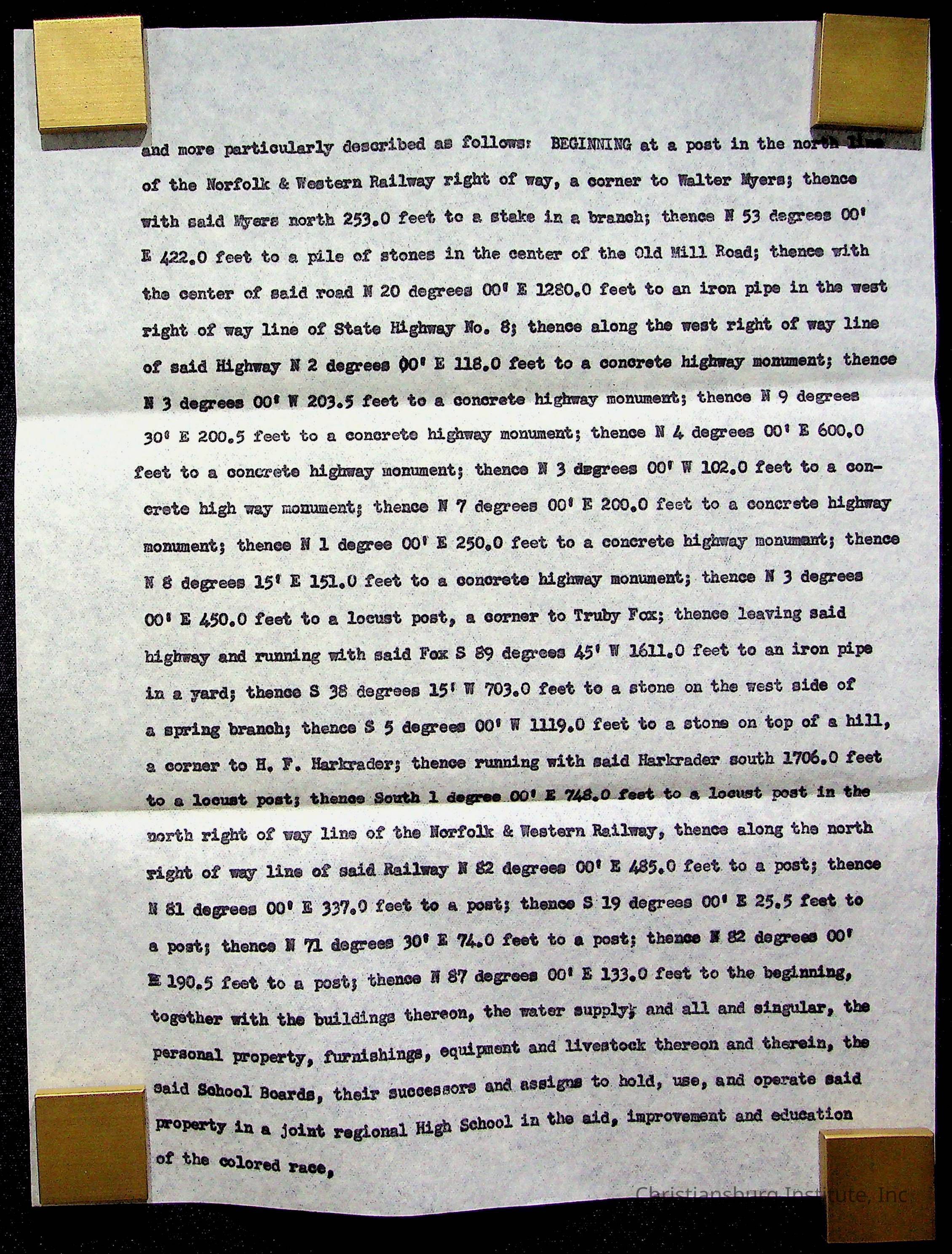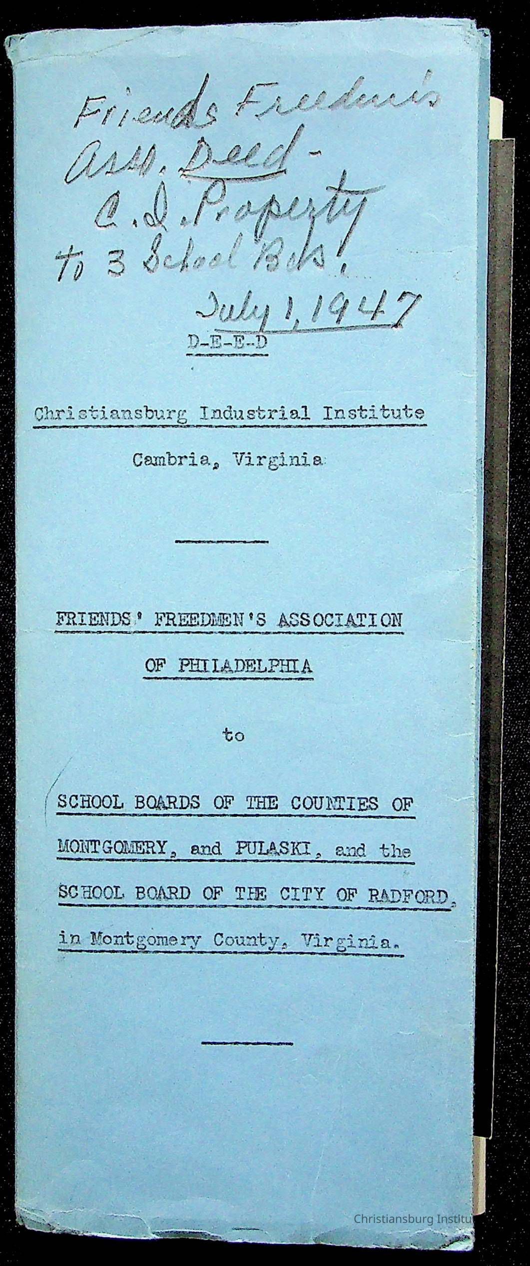 An archive of materials relating to the Christiansburg Institute including copies of deeds, correspondence, insurance paperwork, and other materials, circa 1940s-1960s.Collection