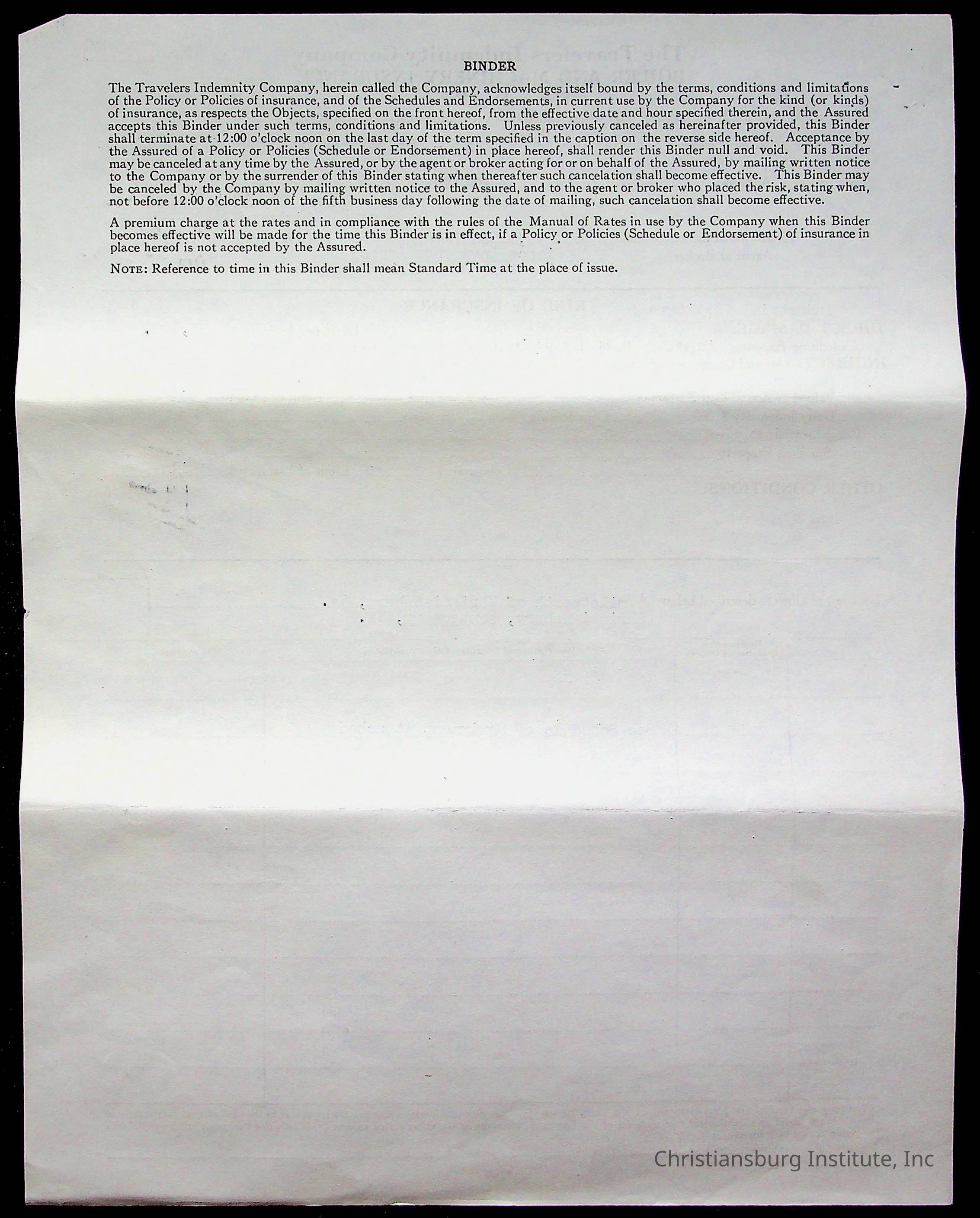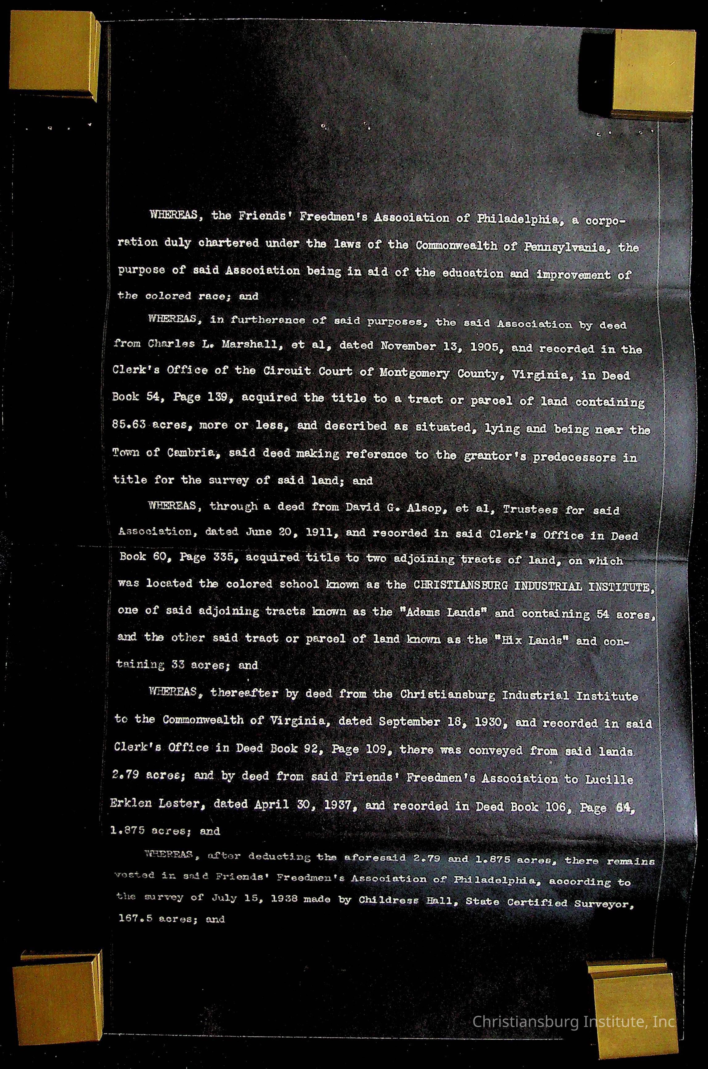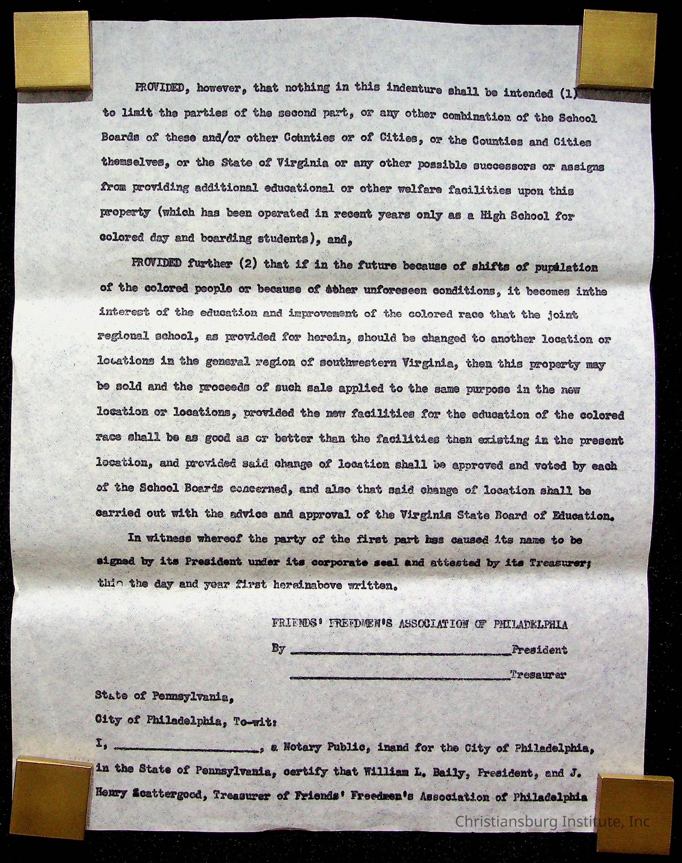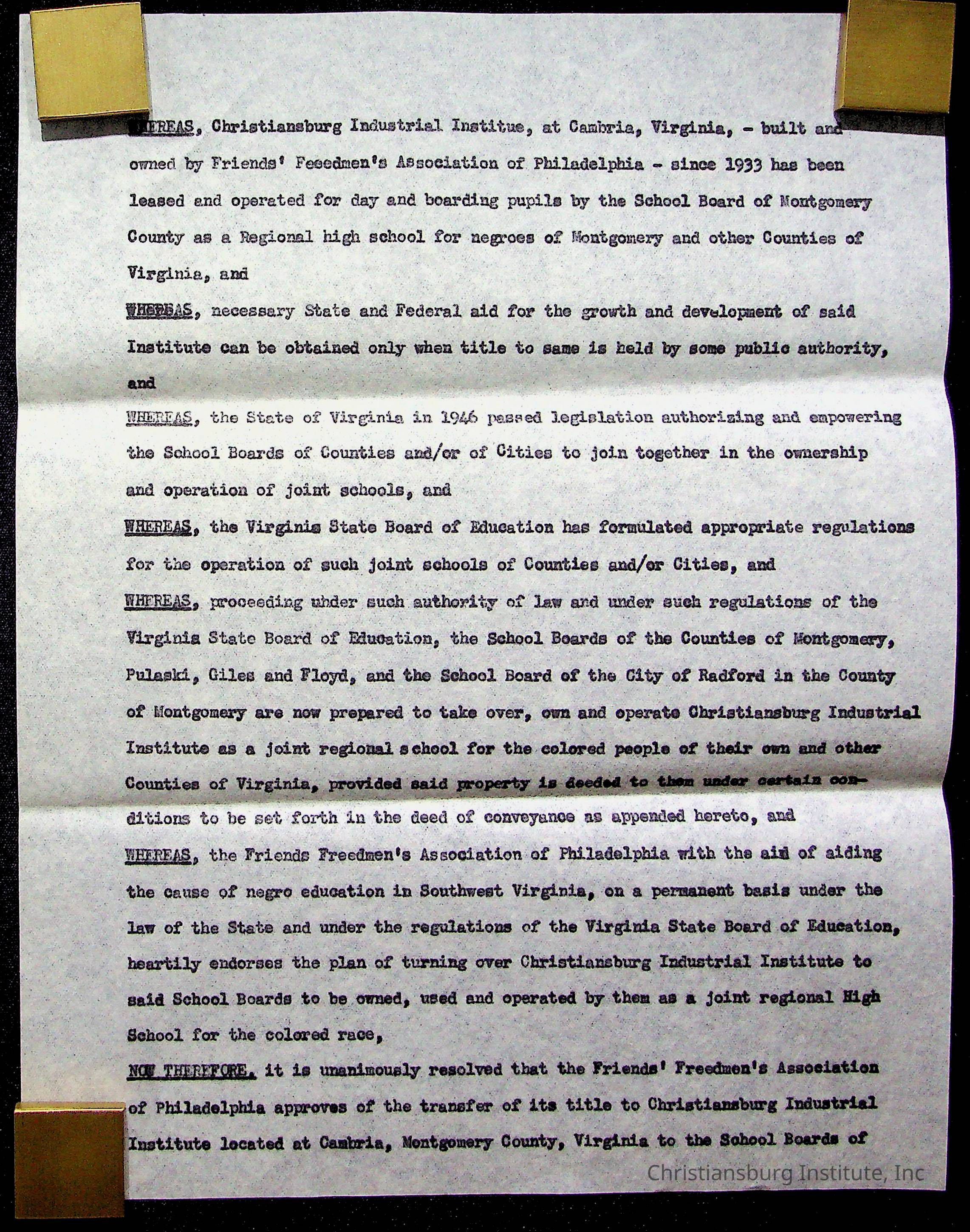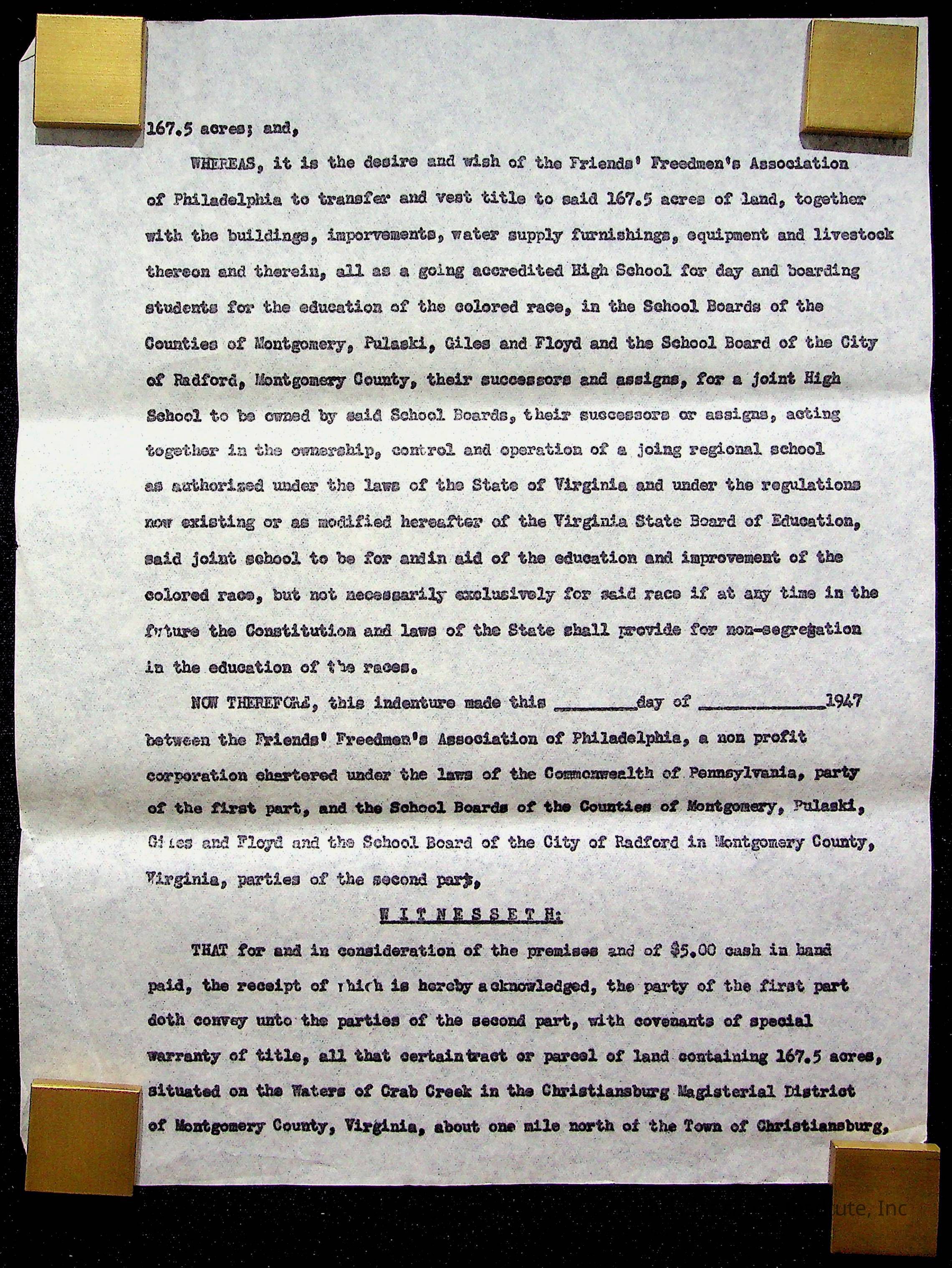 An archive of materials relating to the Christiansburg Institute including copies of deeds, correspondence, insurance paperwork, and other materials, circa 1940s-1960s.Collection
