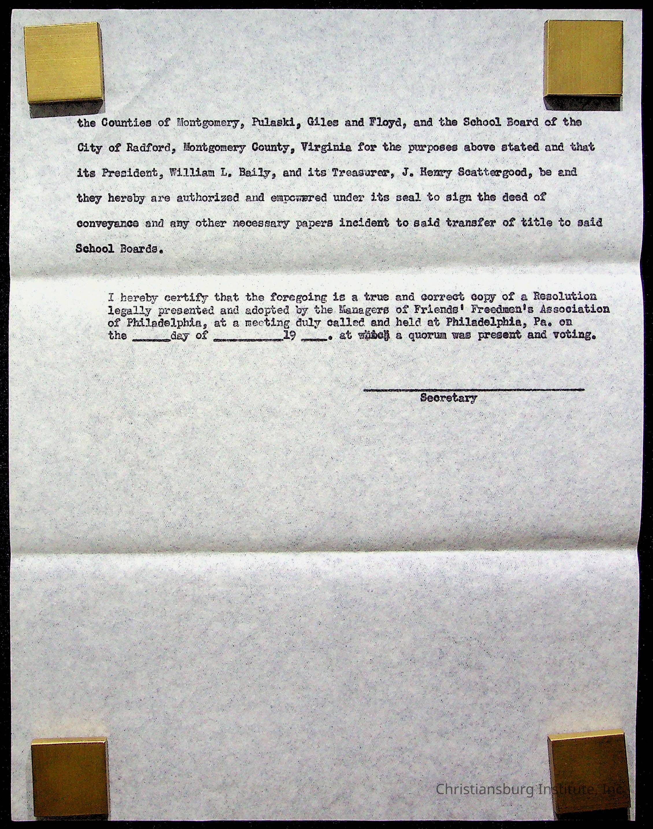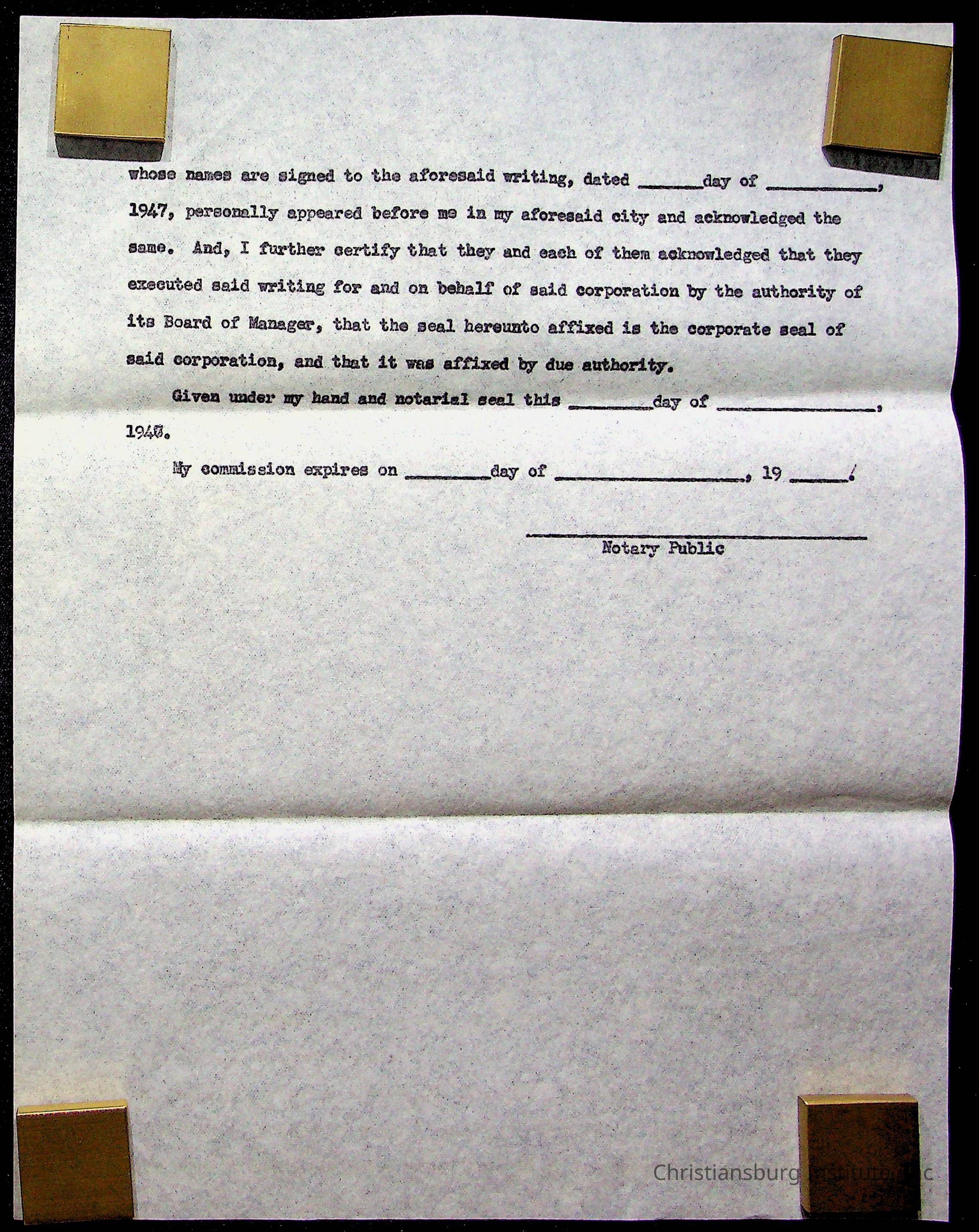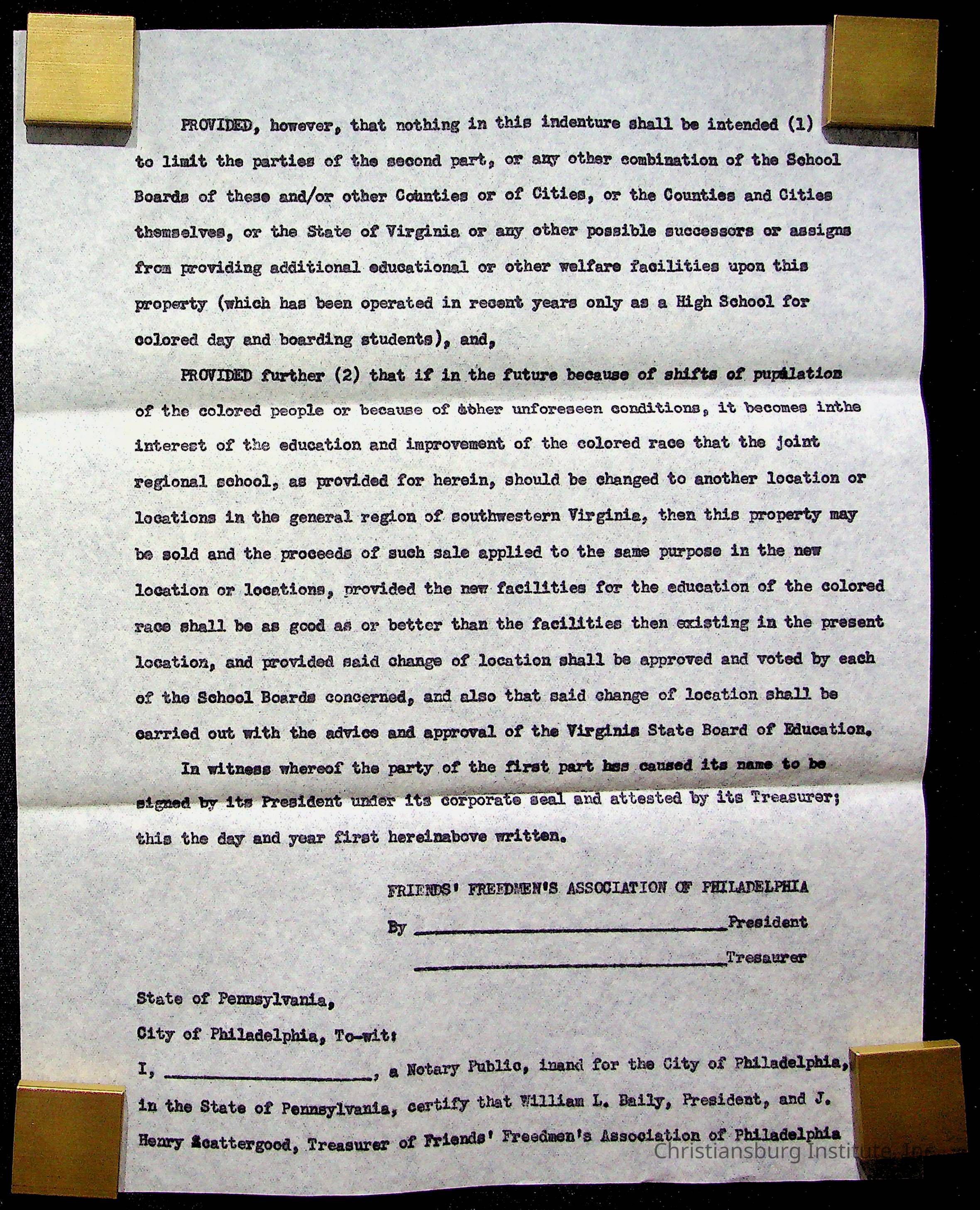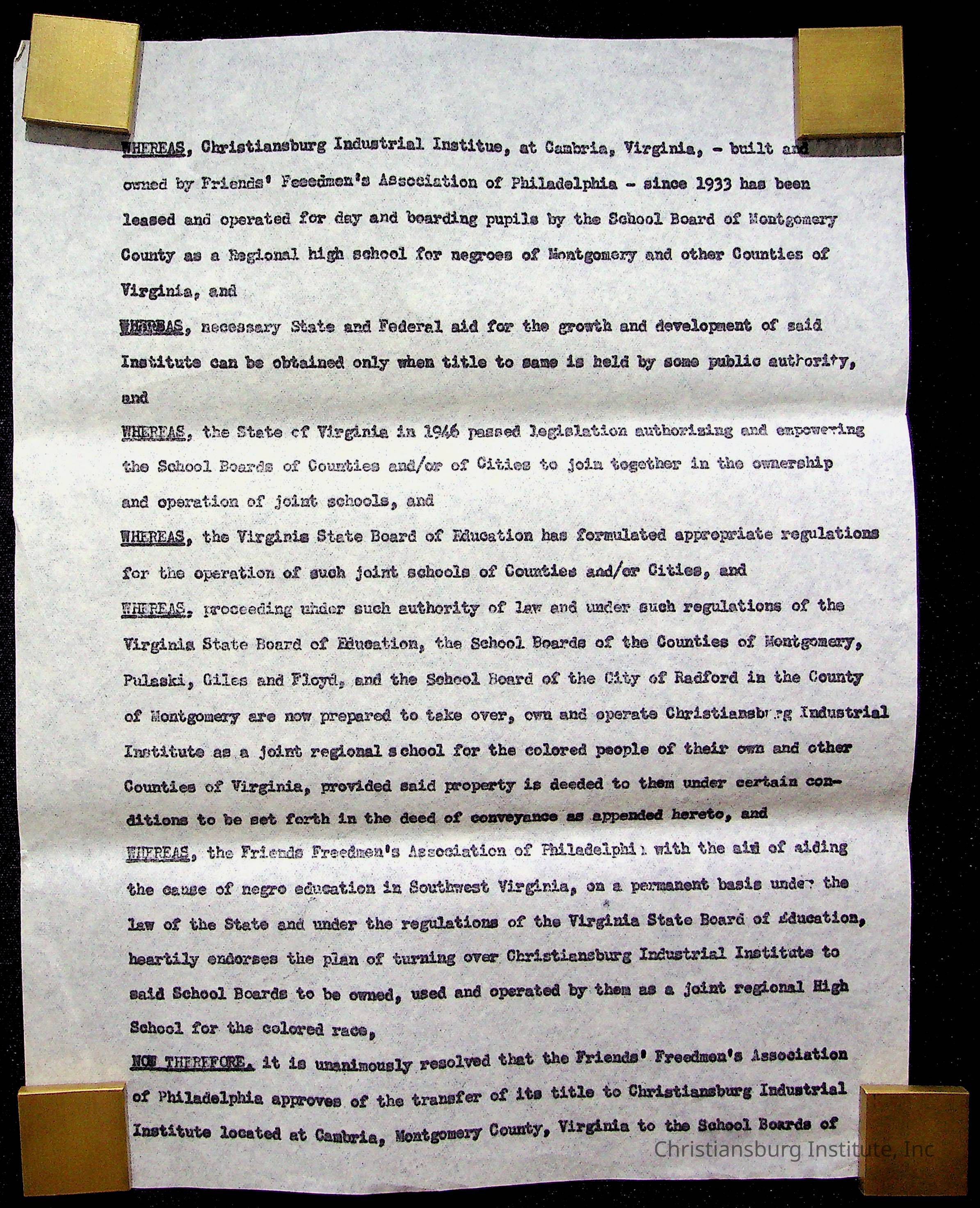 An archive of materials relating to the Christiansburg Institute including copies of deeds, correspondence, insurance paperwork, and other materials, circa 1940s-1960s.Collection