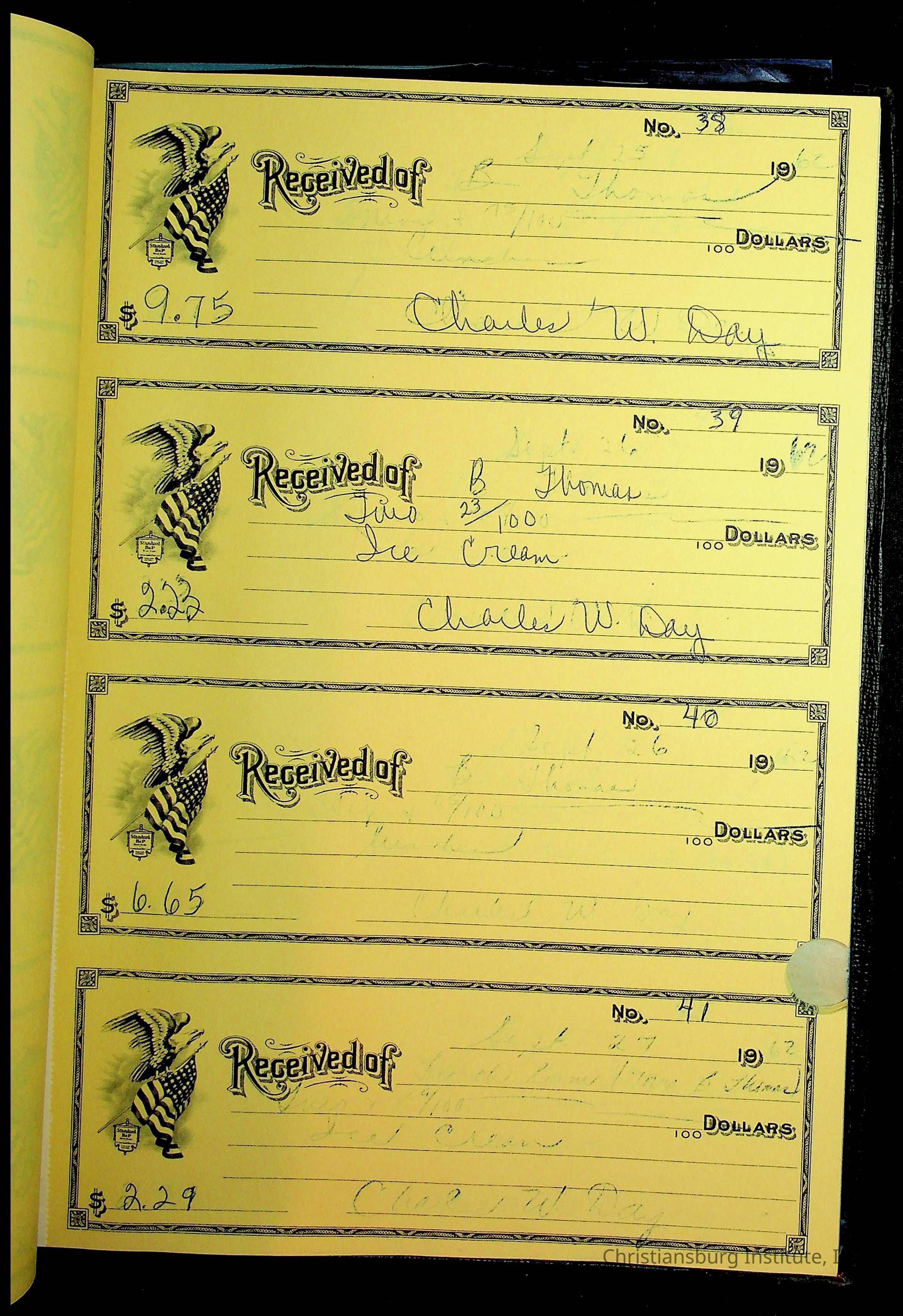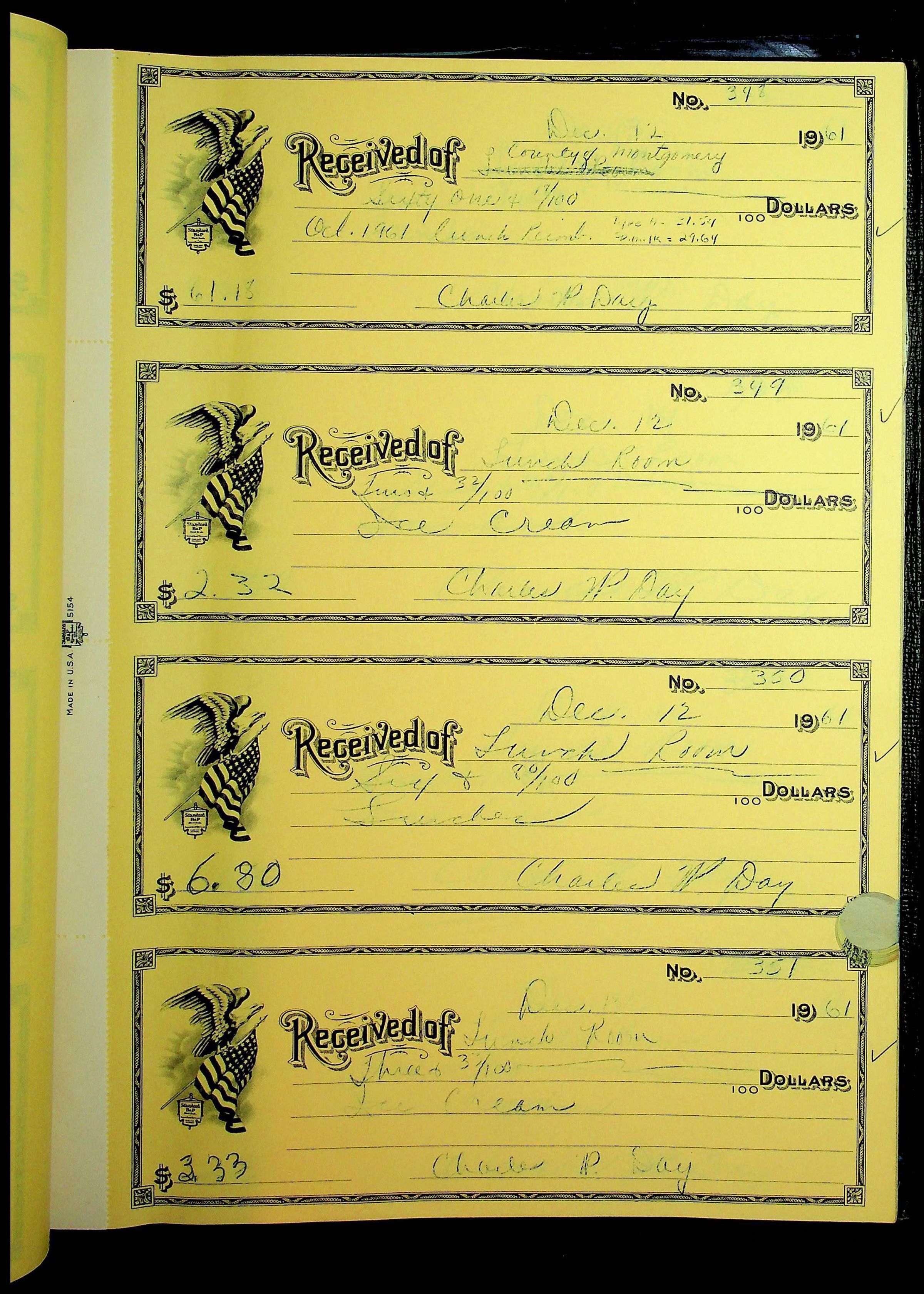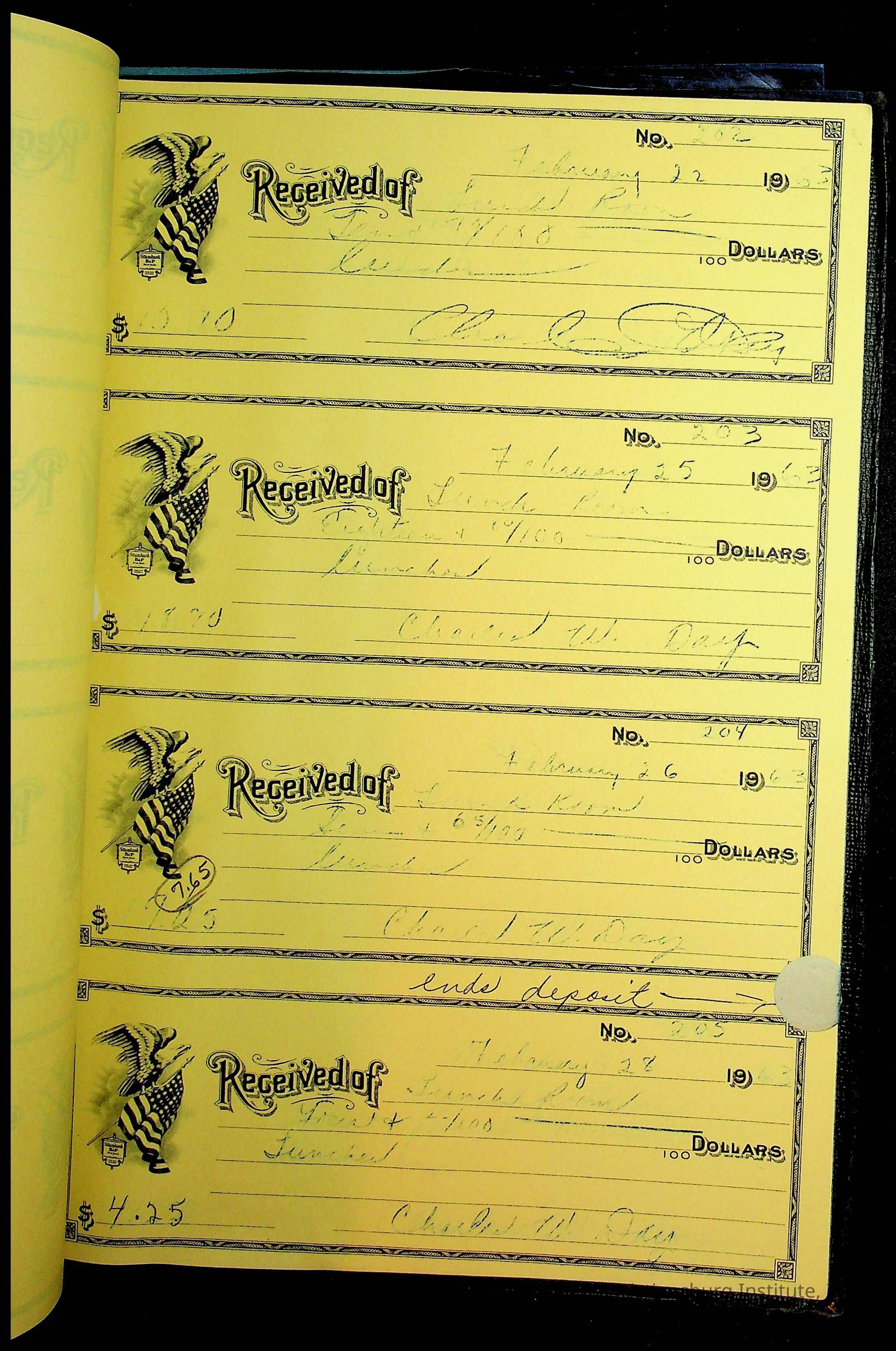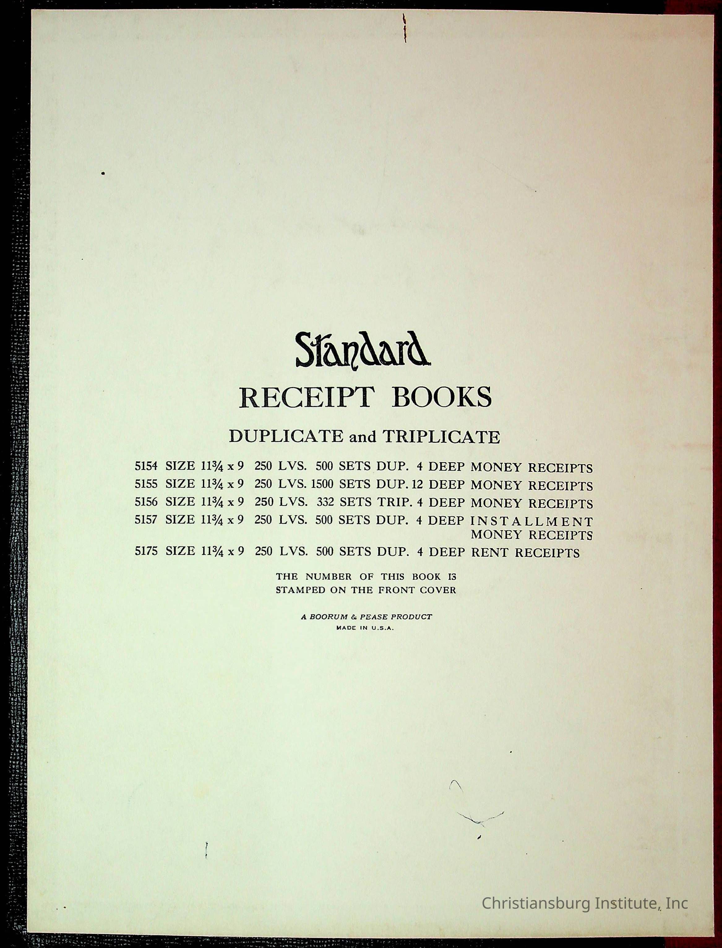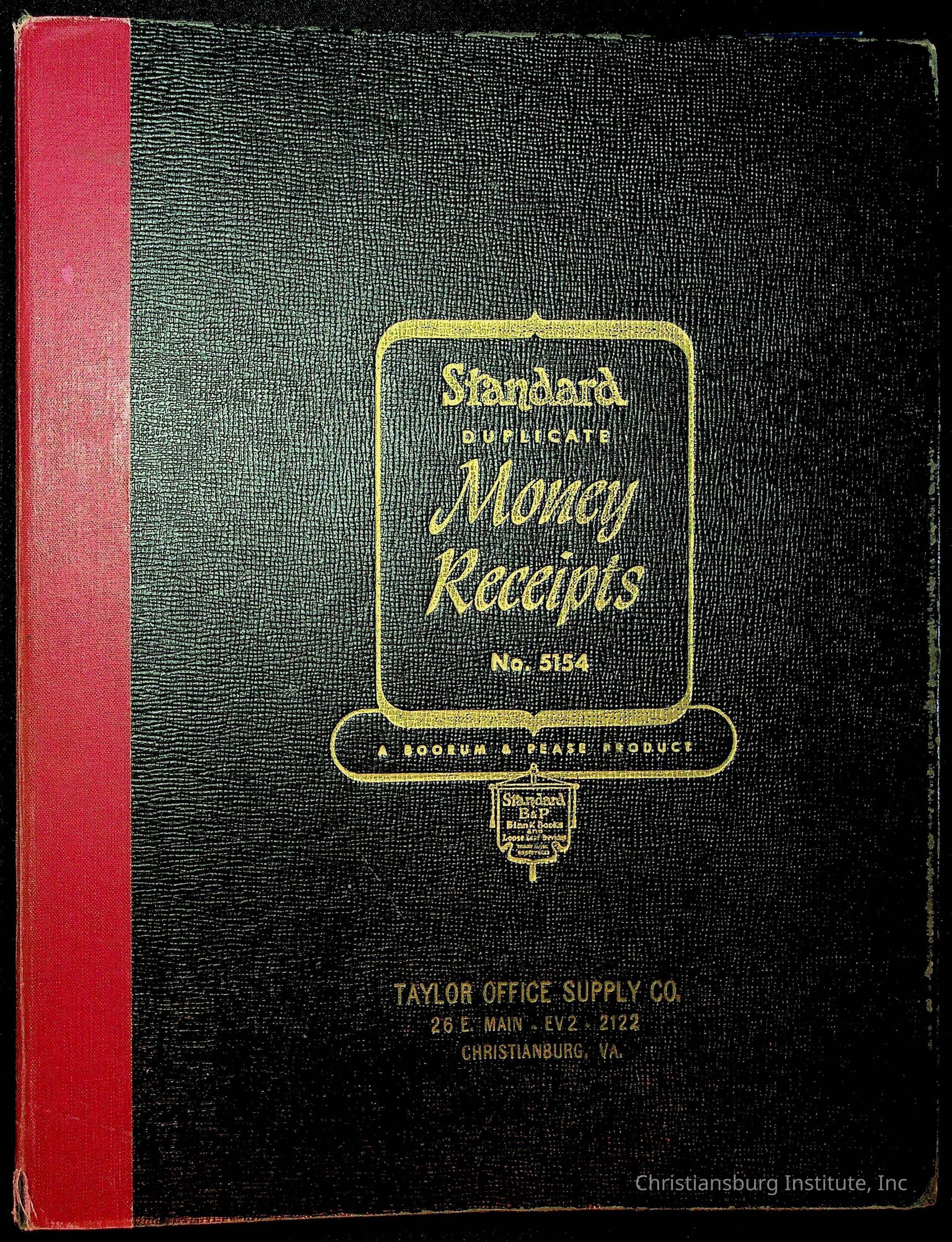 A receipt book manufactured by Boorum & Pease and used by Christiansburg Institute to document expenses and receipts from 1961 through 1963.