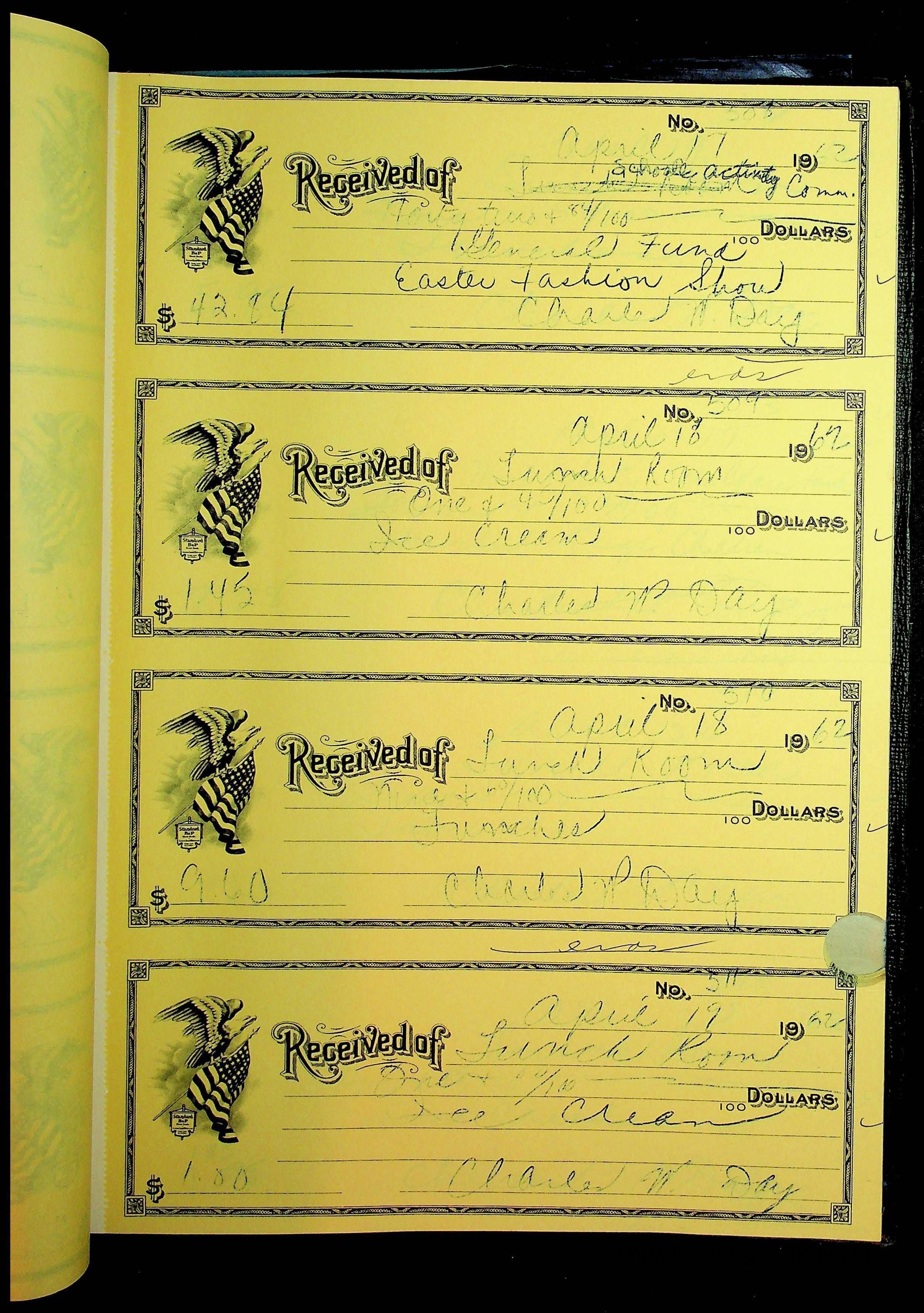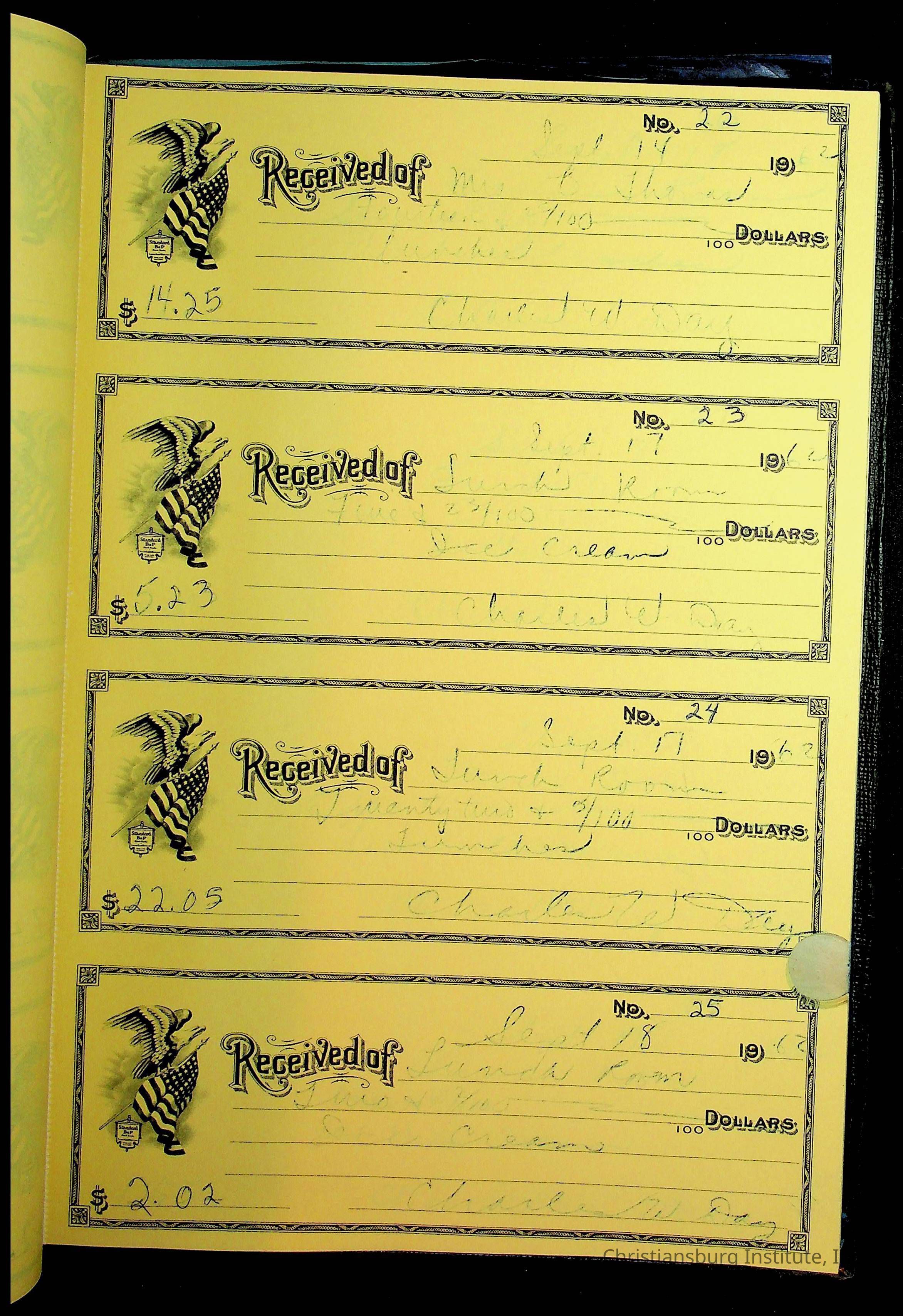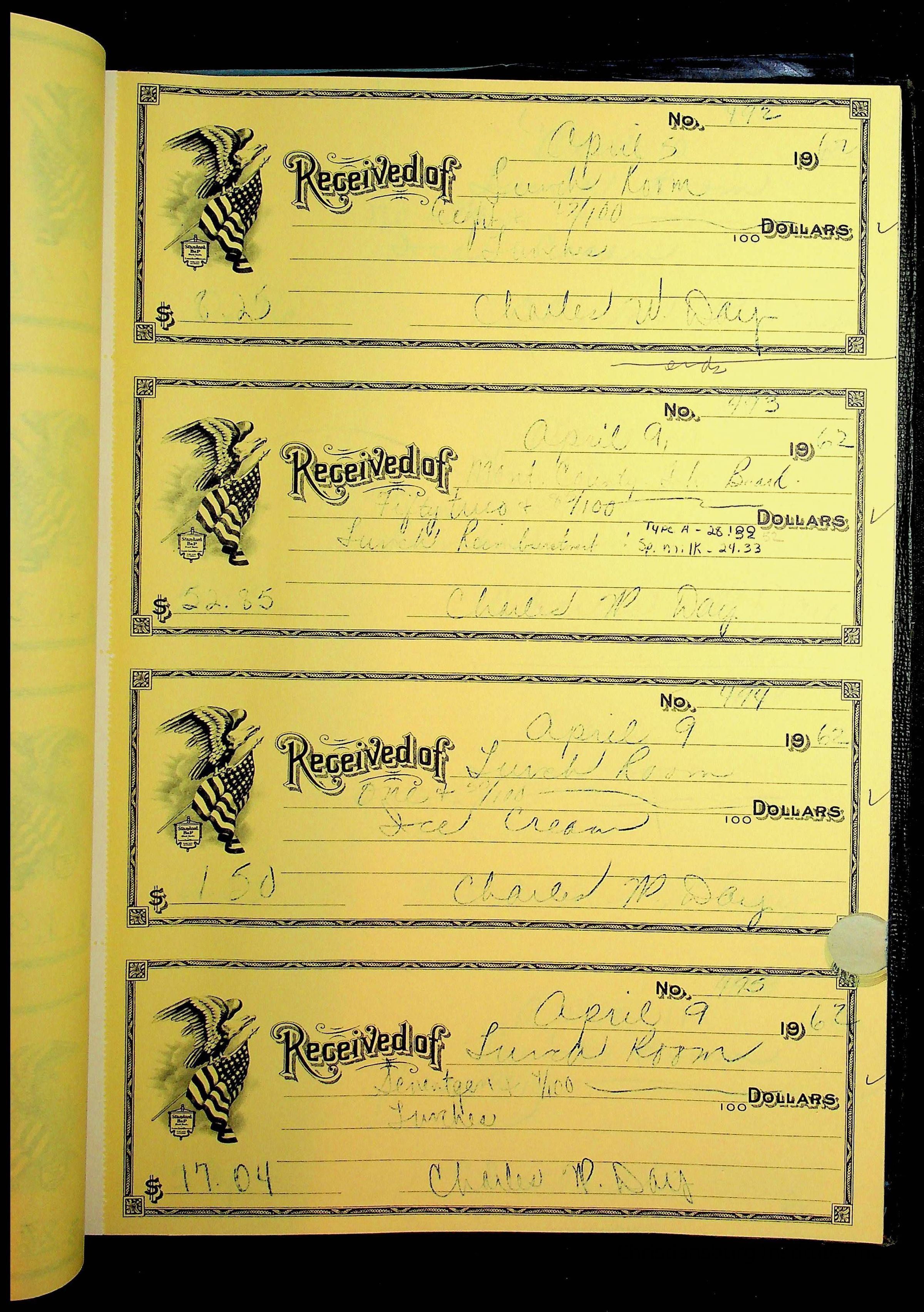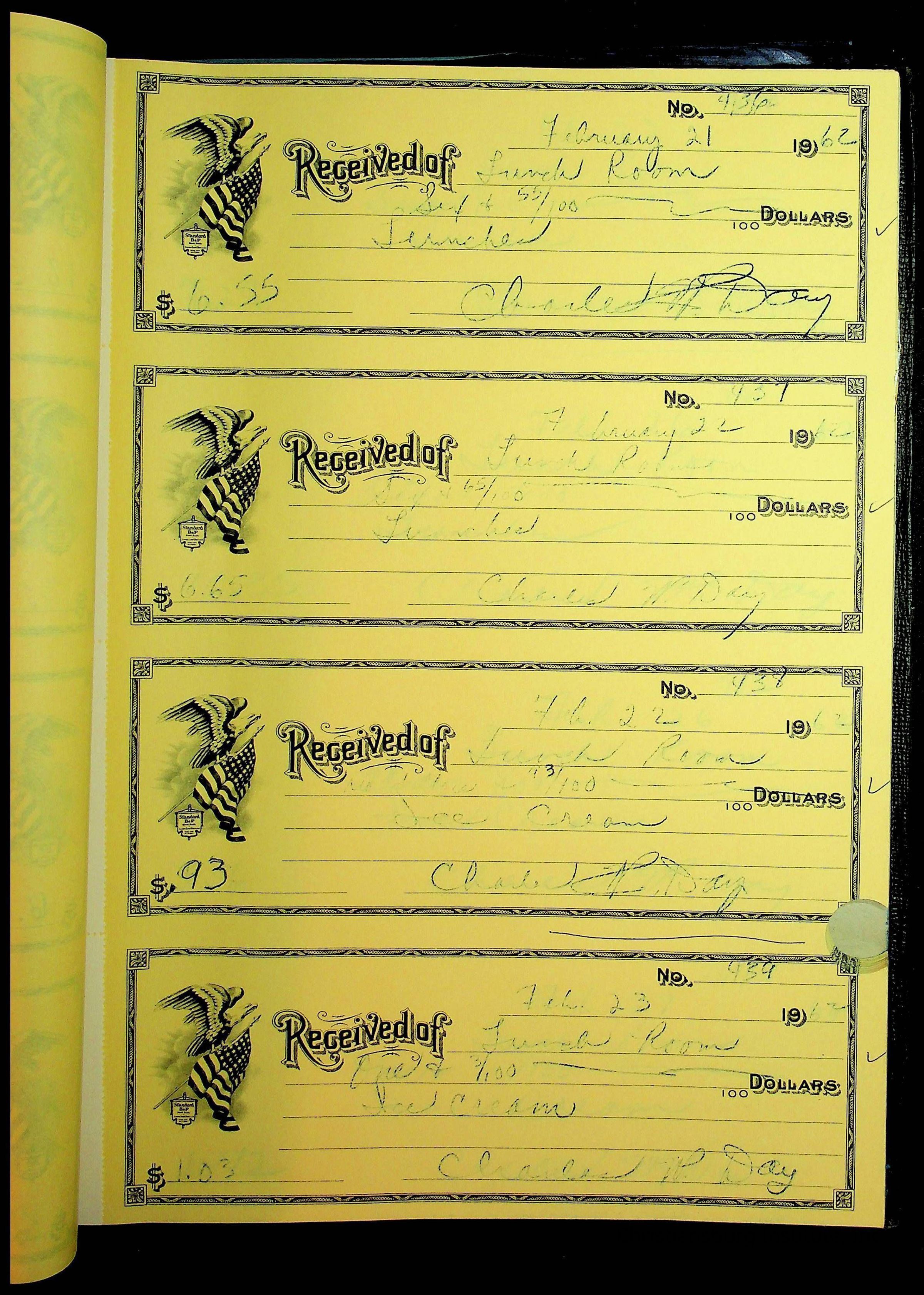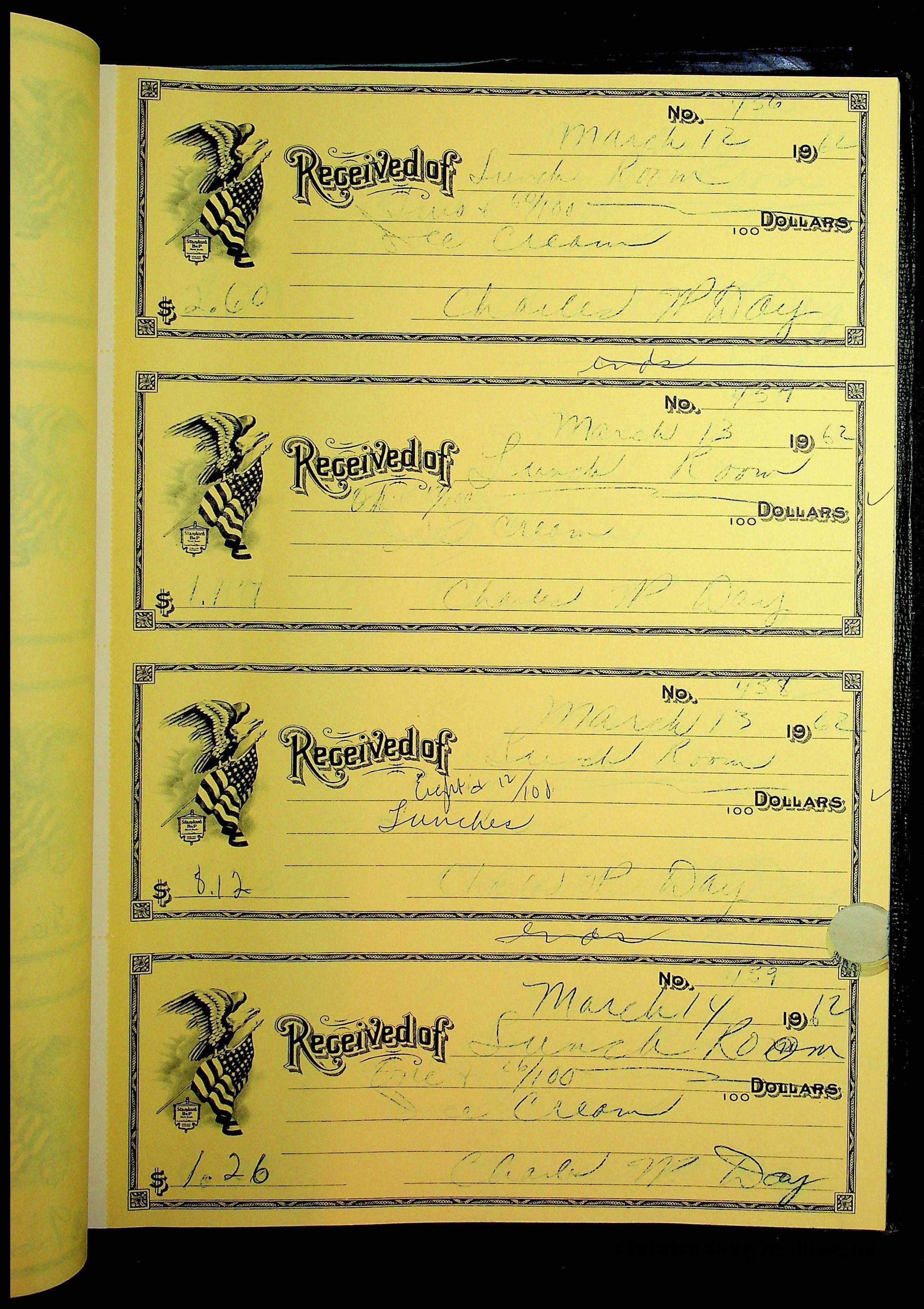 A receipt book manufactured by Boorum & Pease and used by Christiansburg Institute to document expenses and receipts from 1961 through 1963.