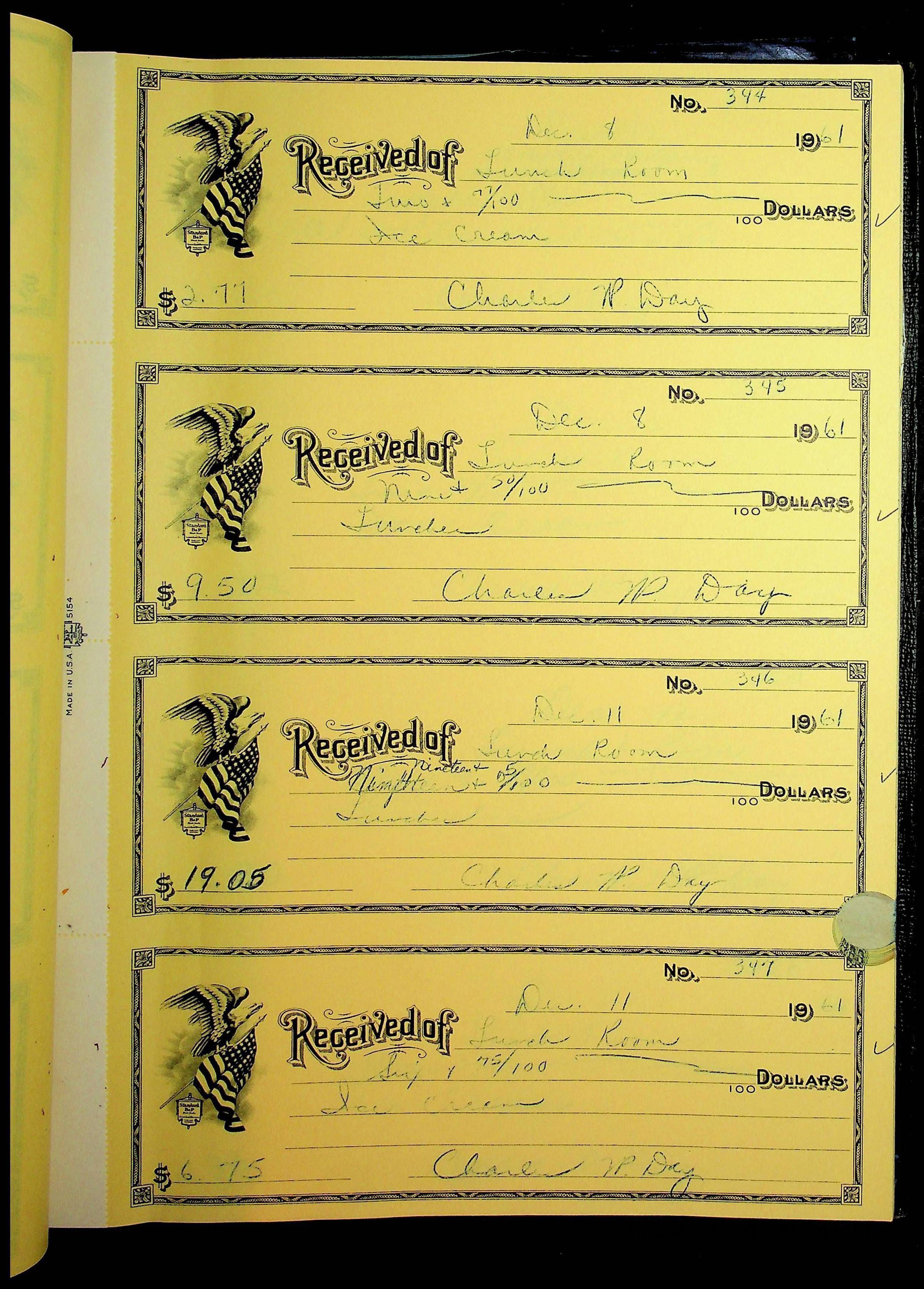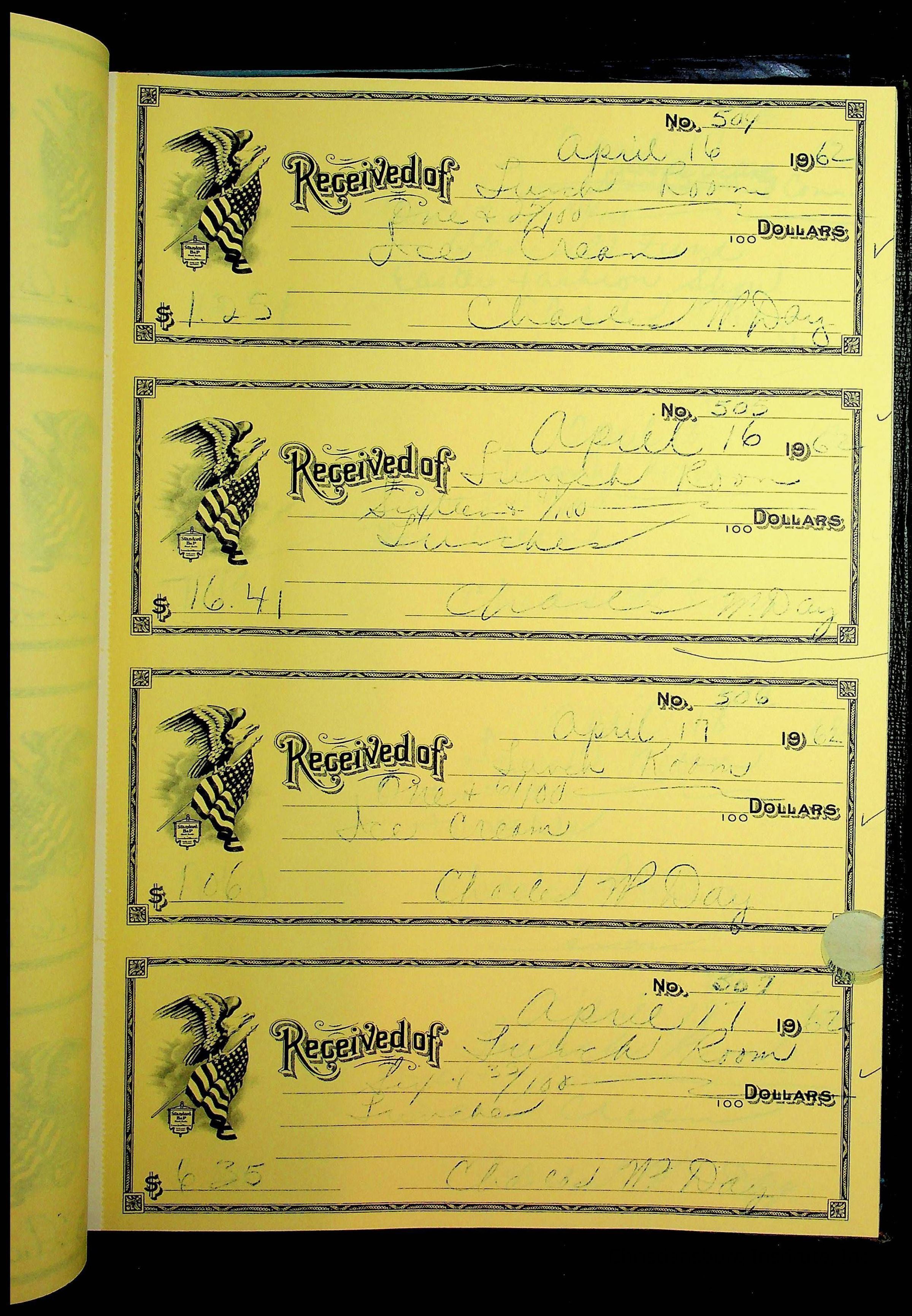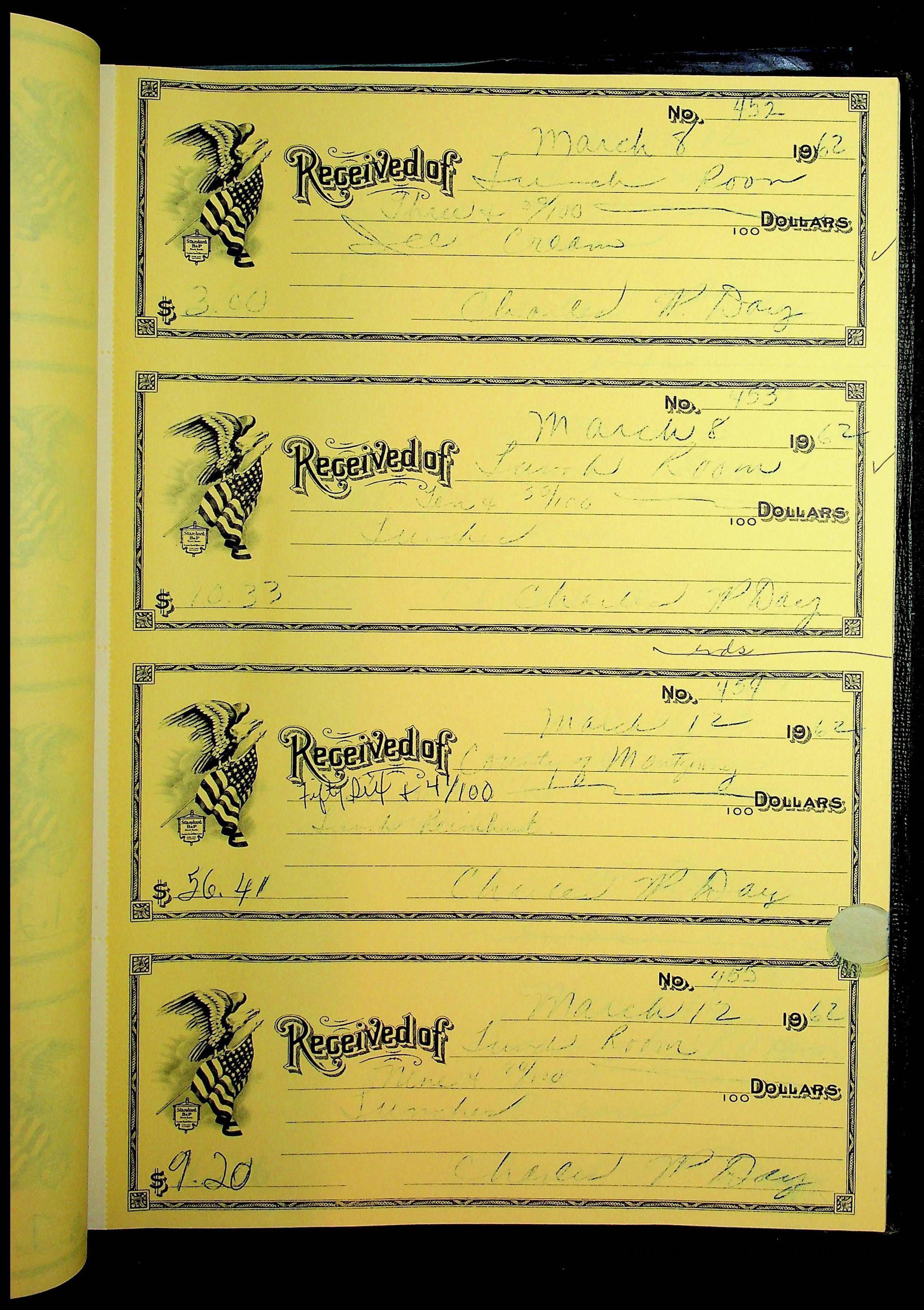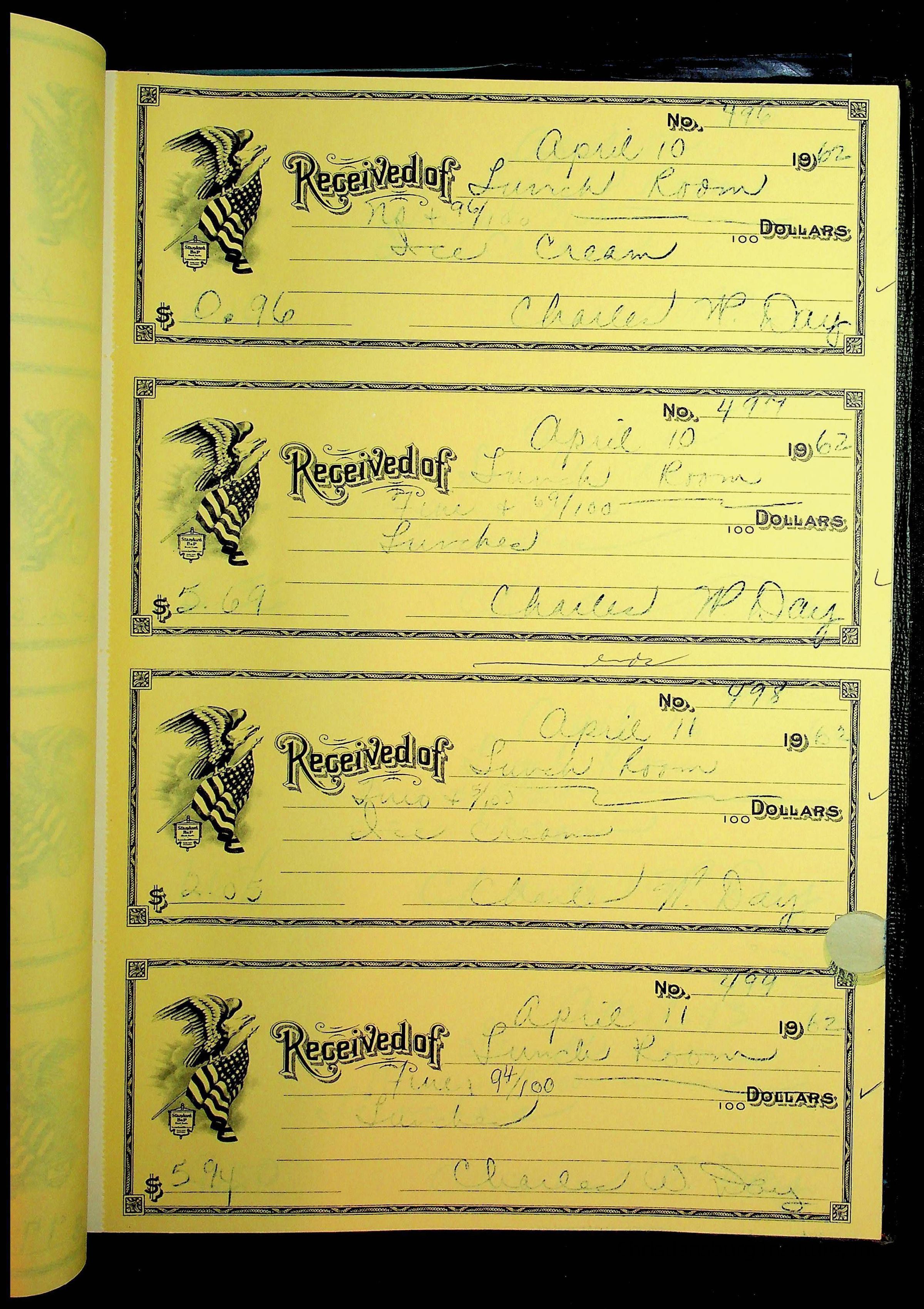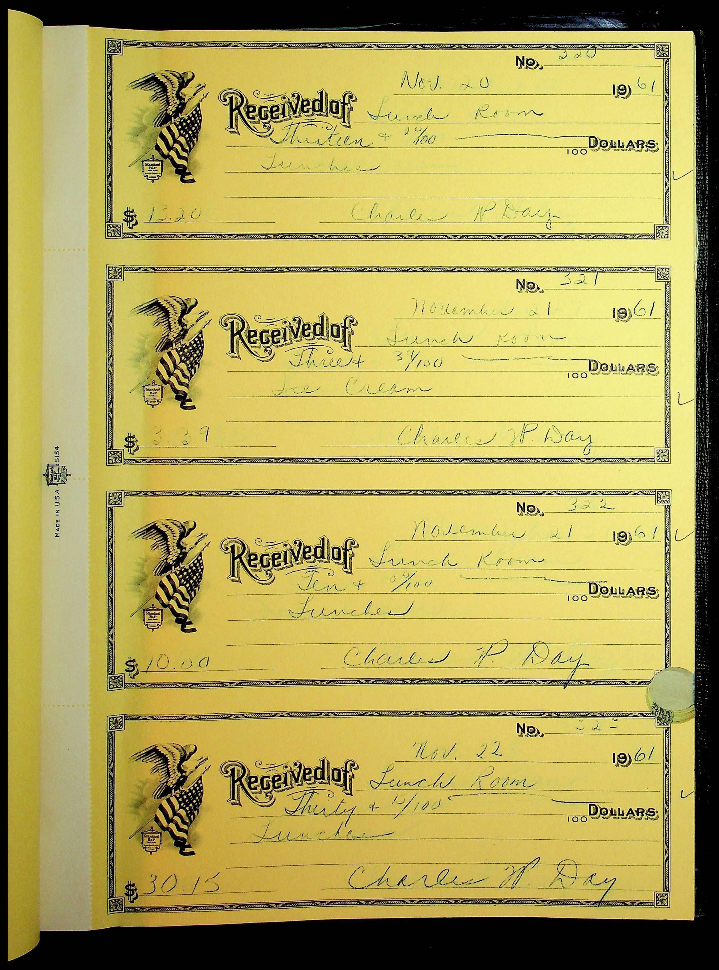 A receipt book manufactured by Boorum & Pease and used by Christiansburg Institute to document expenses and receipts from 1961 through 1963.