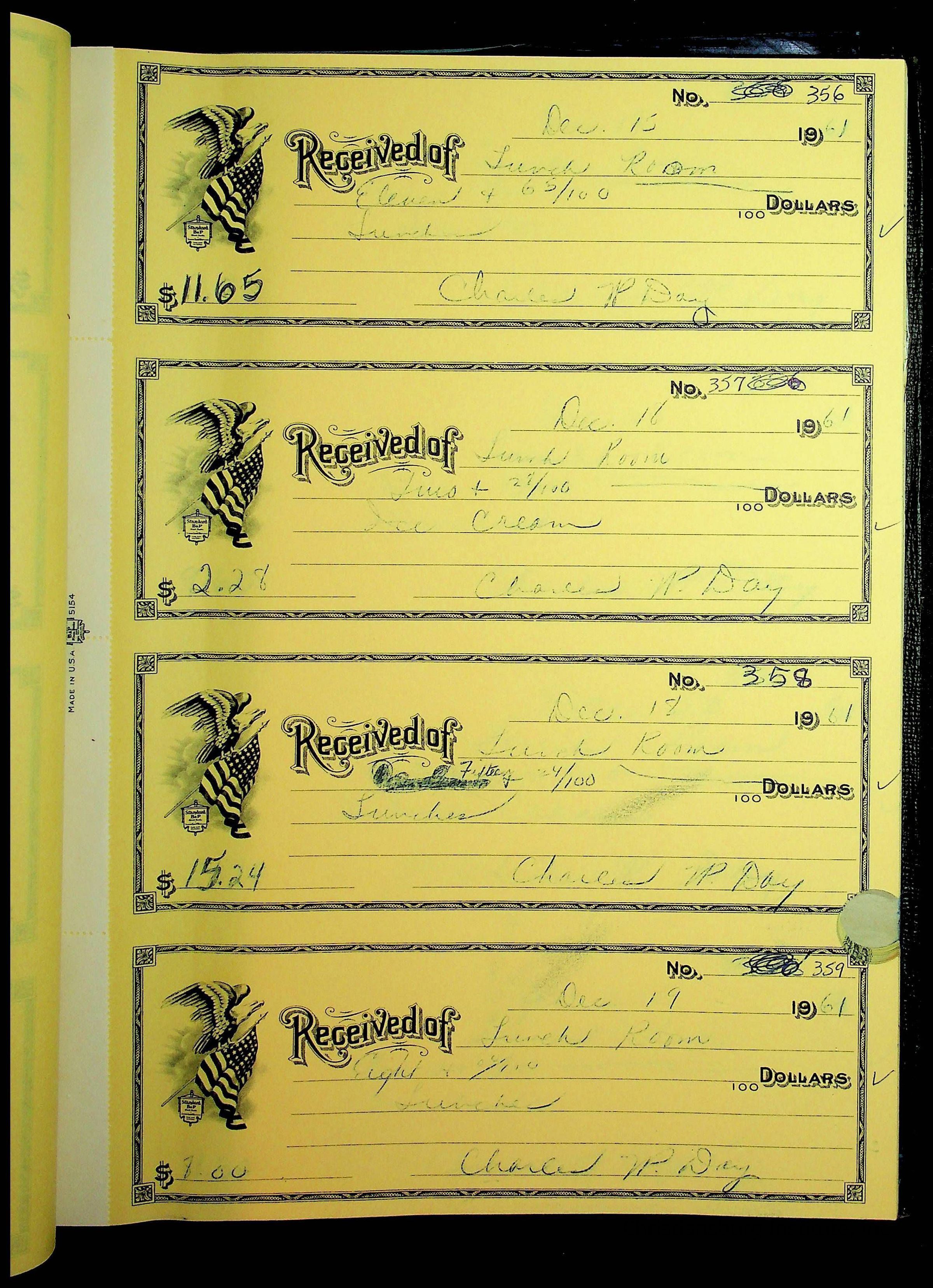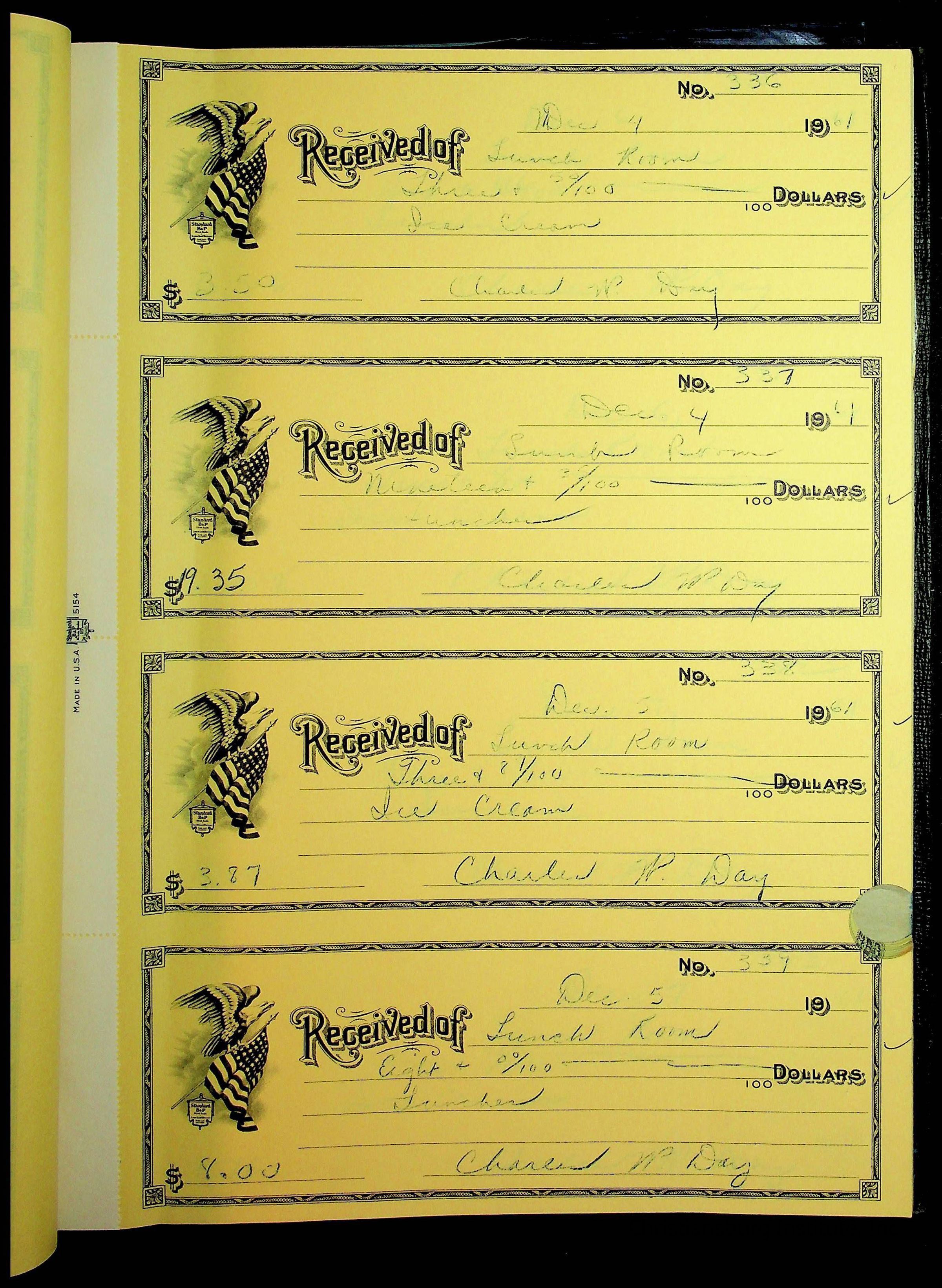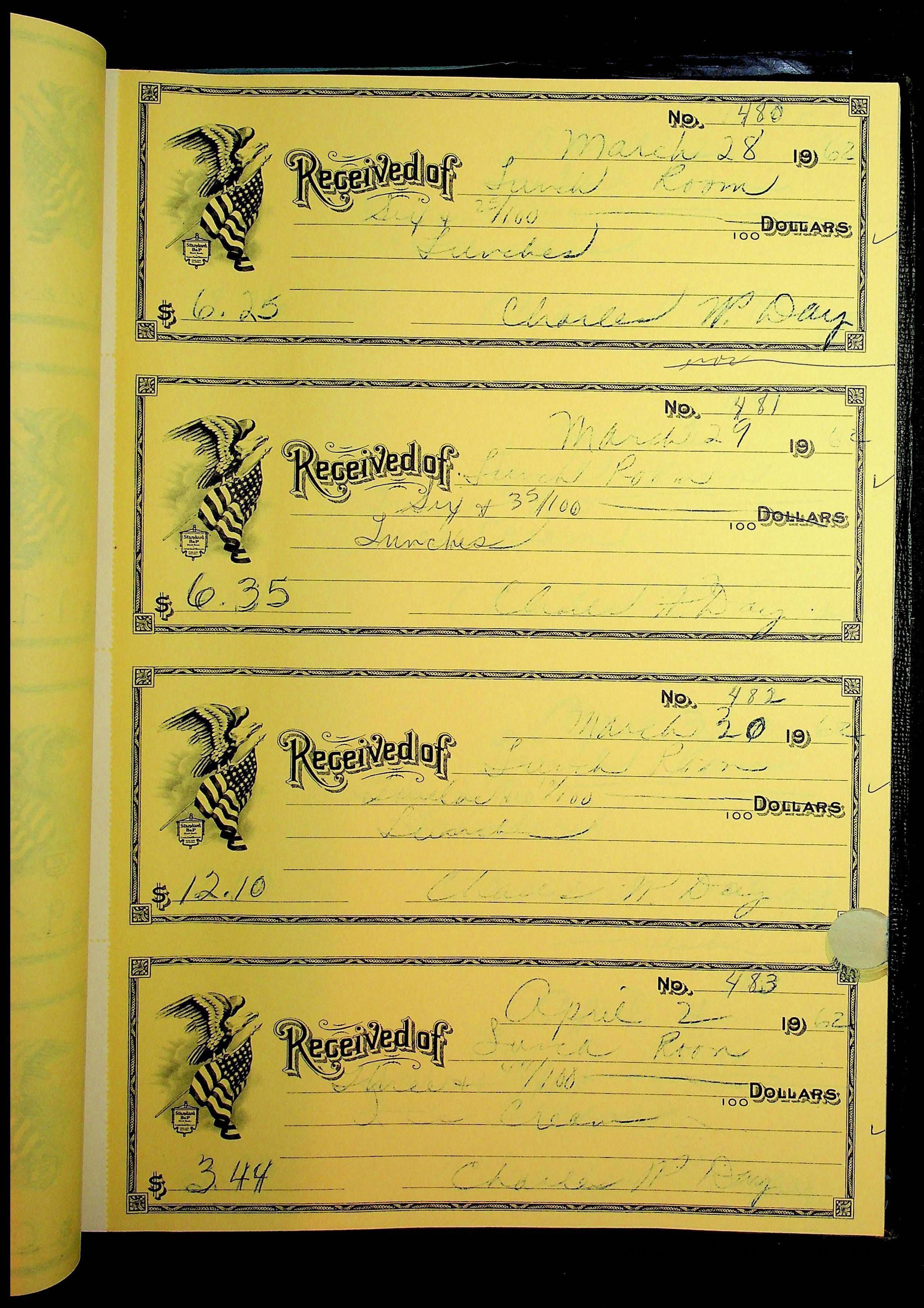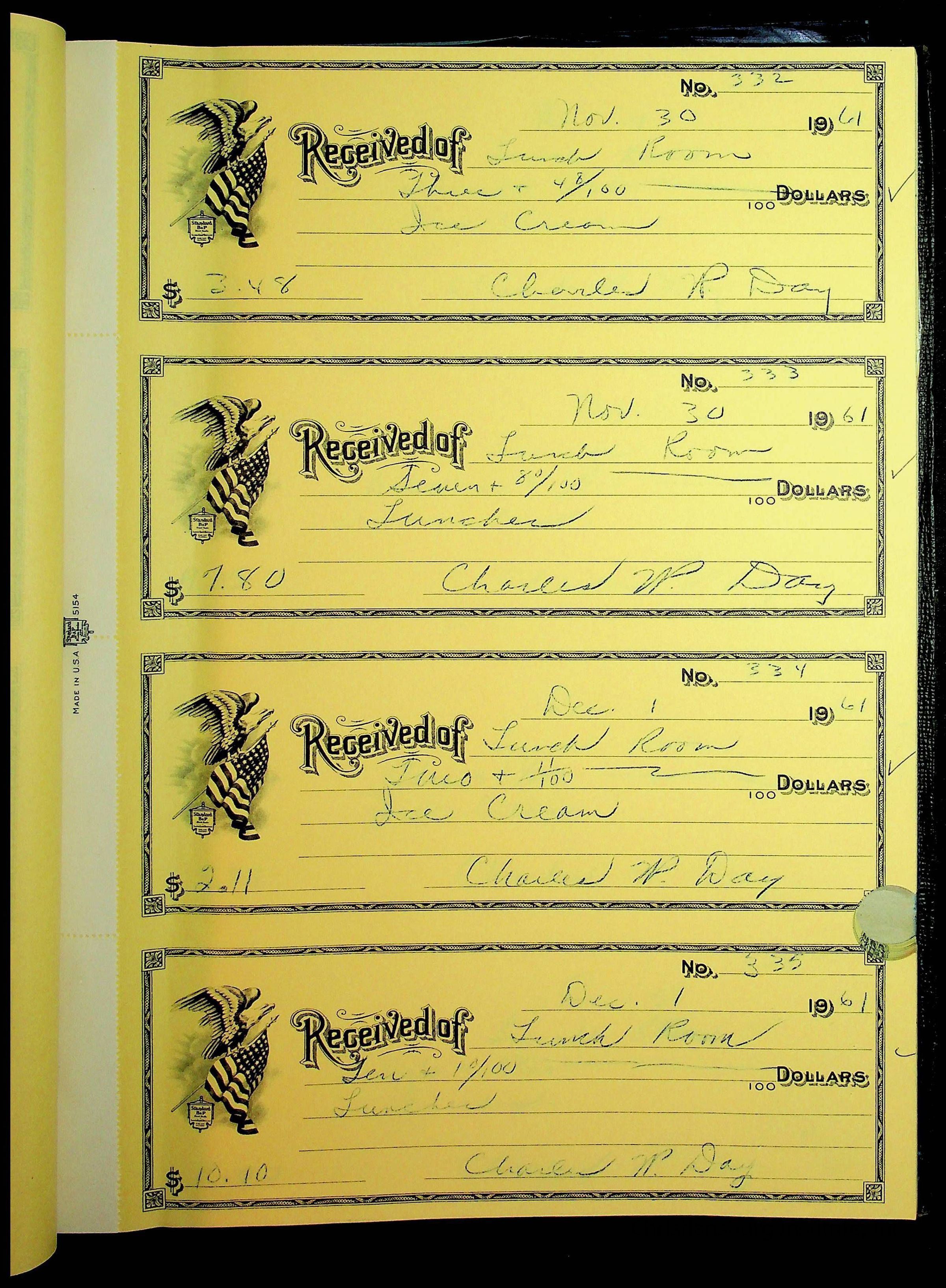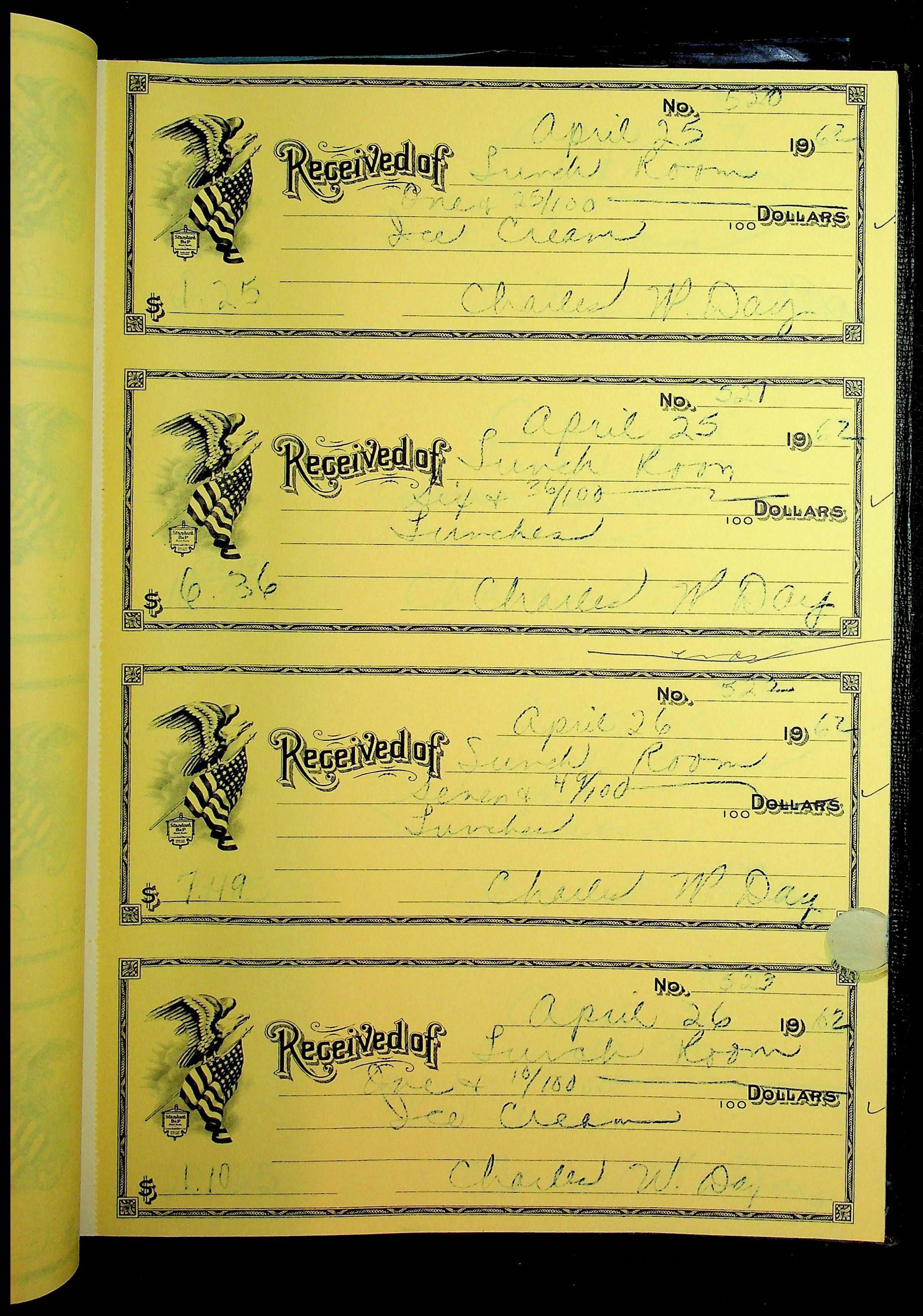 A receipt book manufactured by Boorum & Pease and used by Christiansburg Institute to document expenses and receipts from 1961 through 1963.