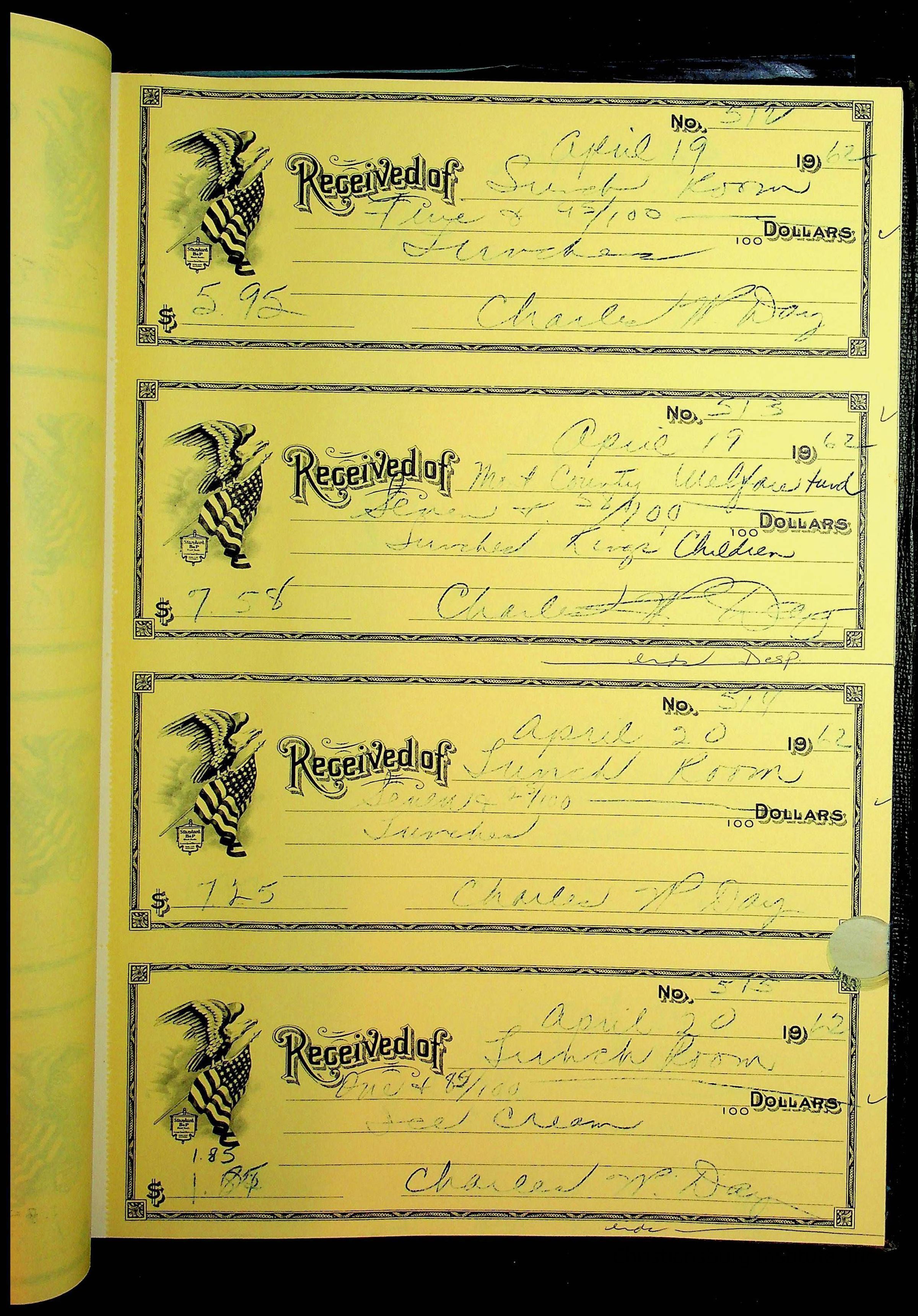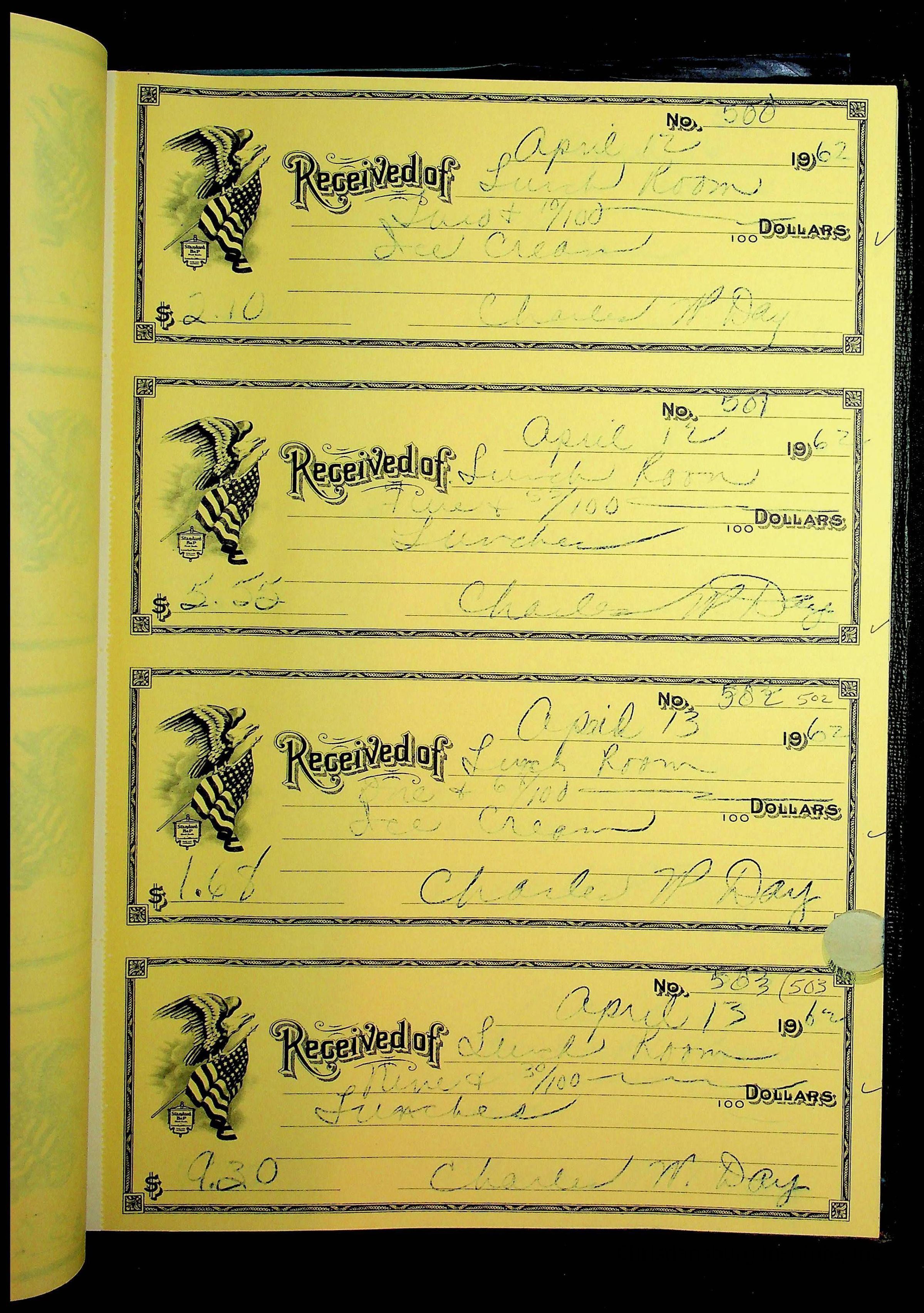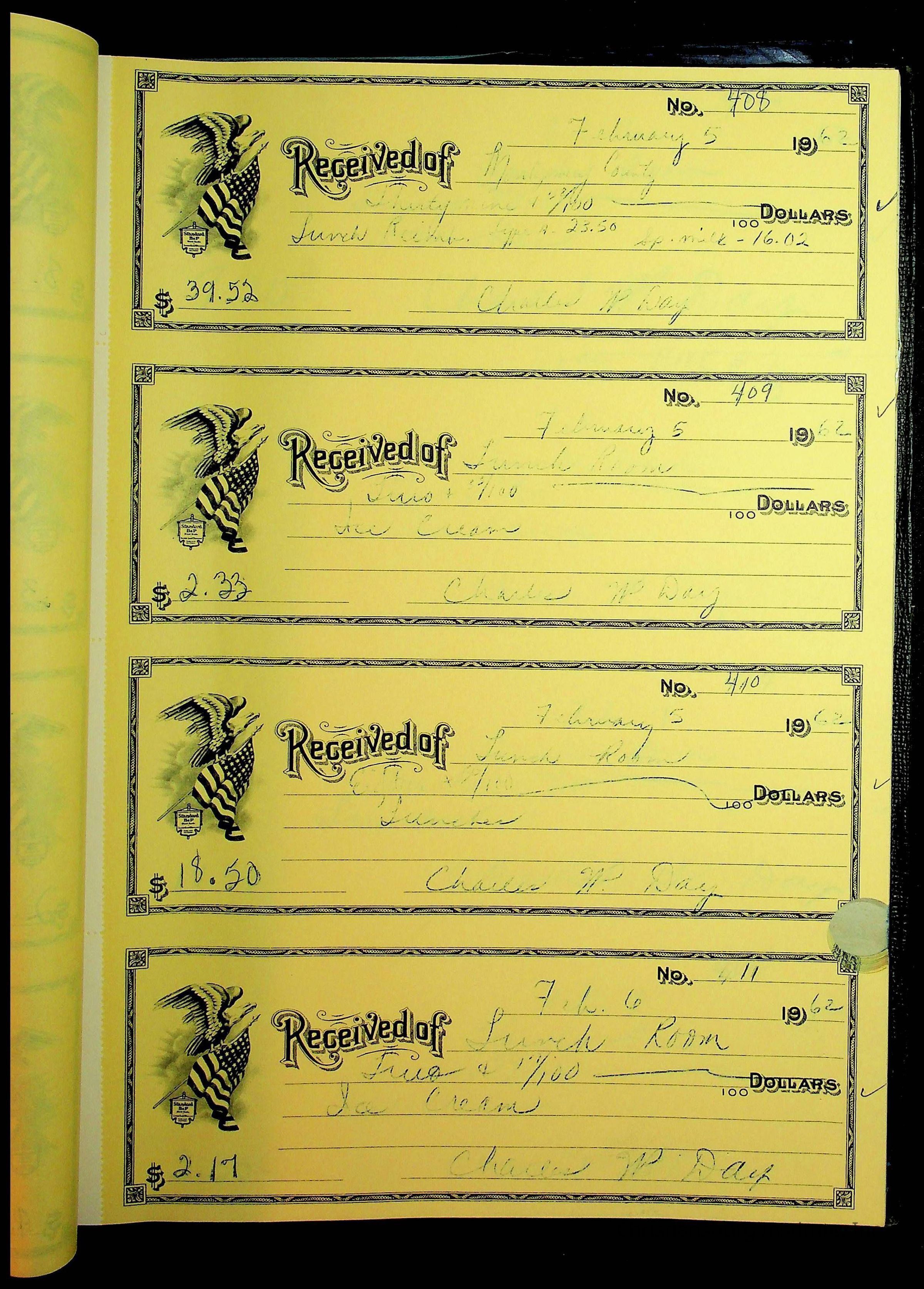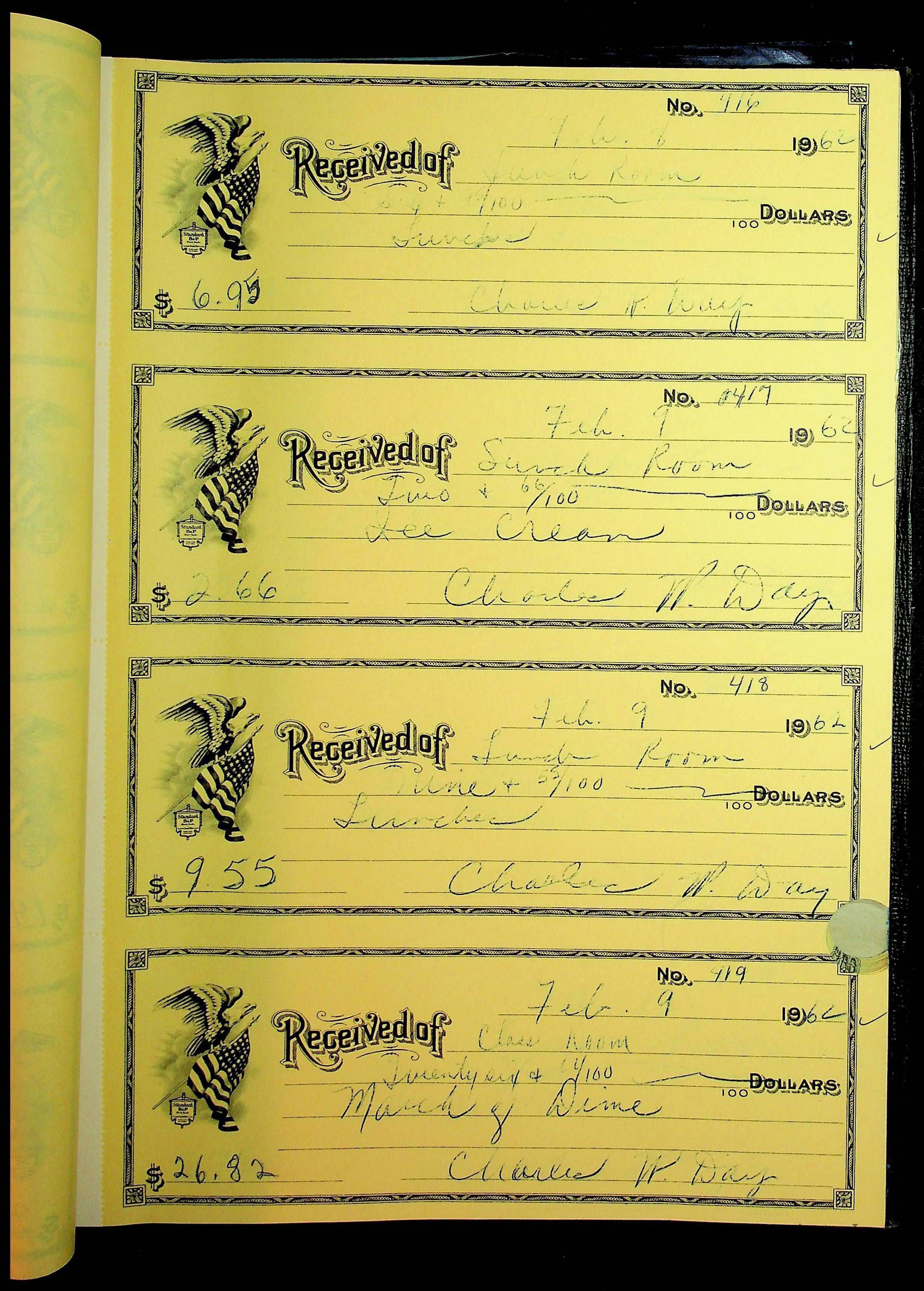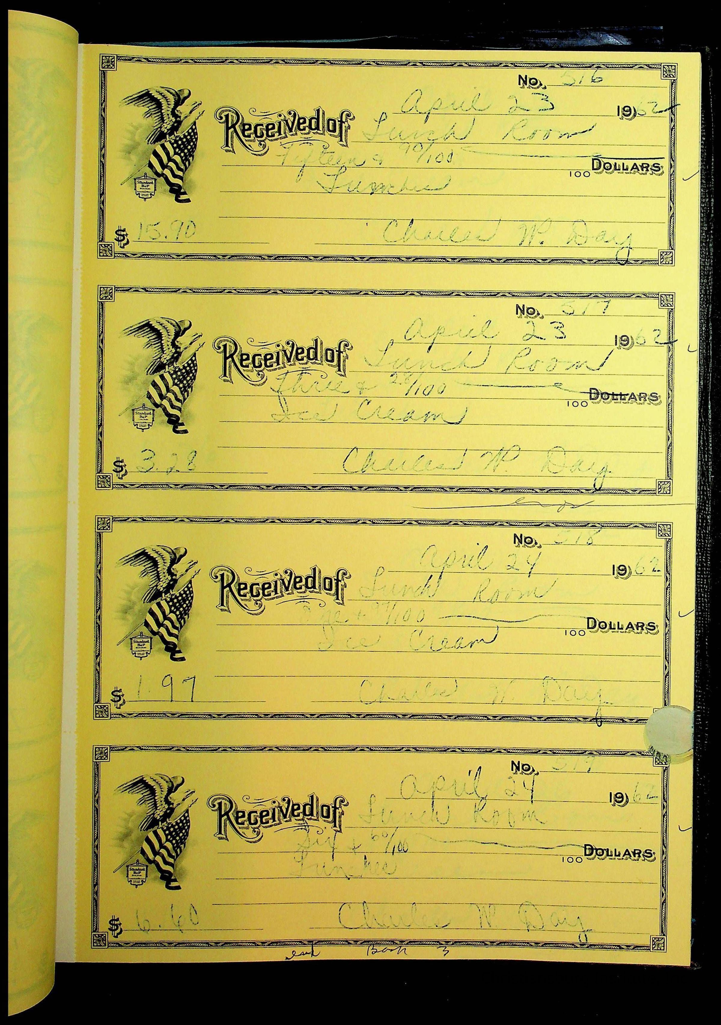 A receipt book manufactured by Boorum & Pease and used by Christiansburg Institute to document expenses and receipts from 1961 through 1963.