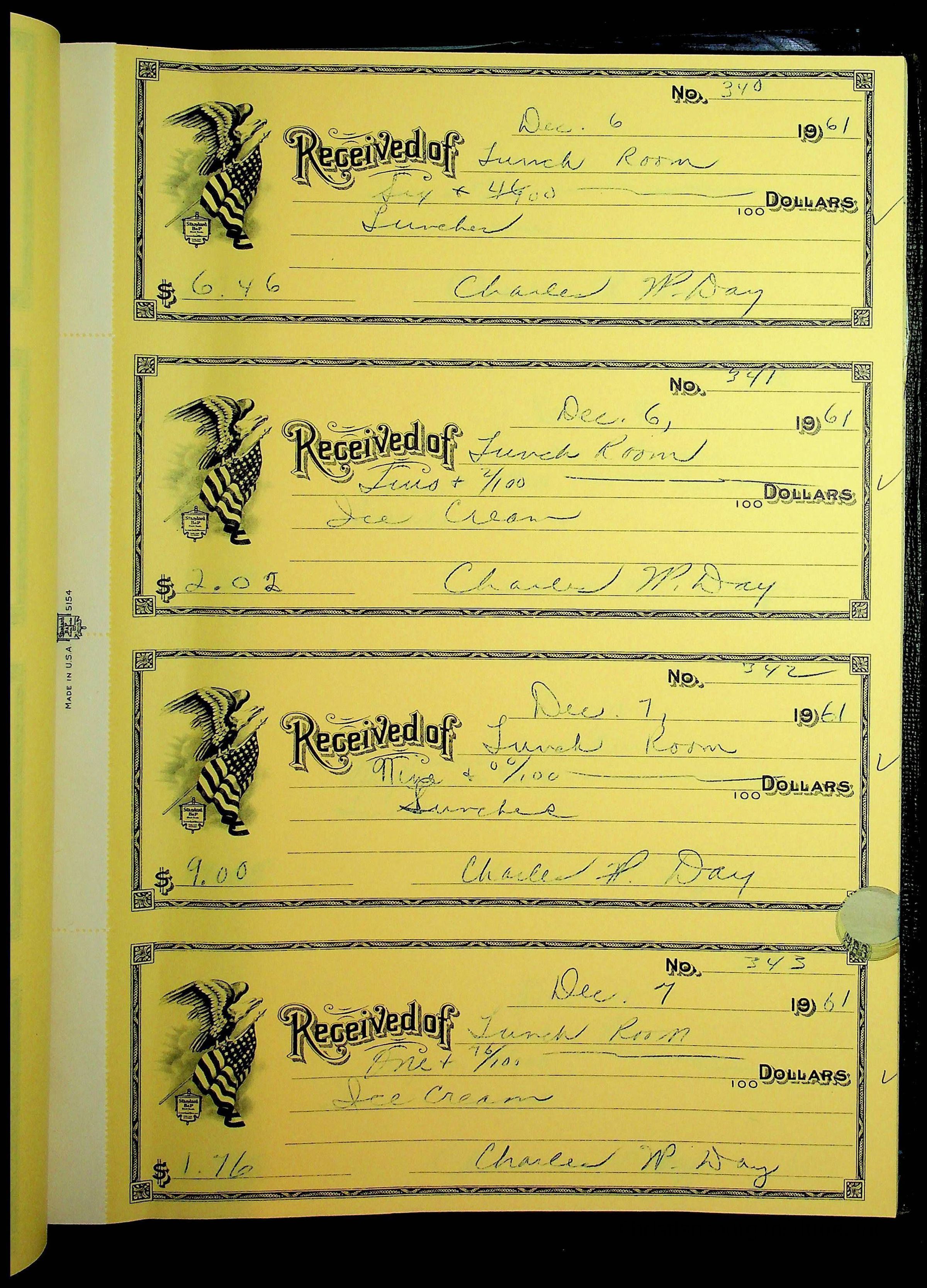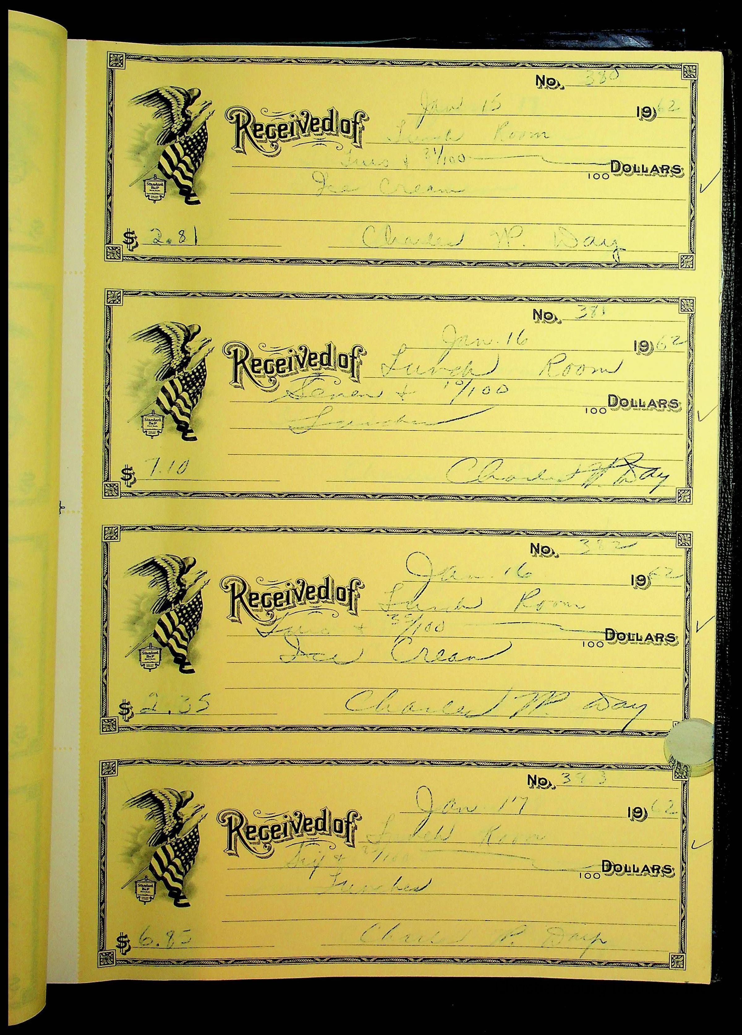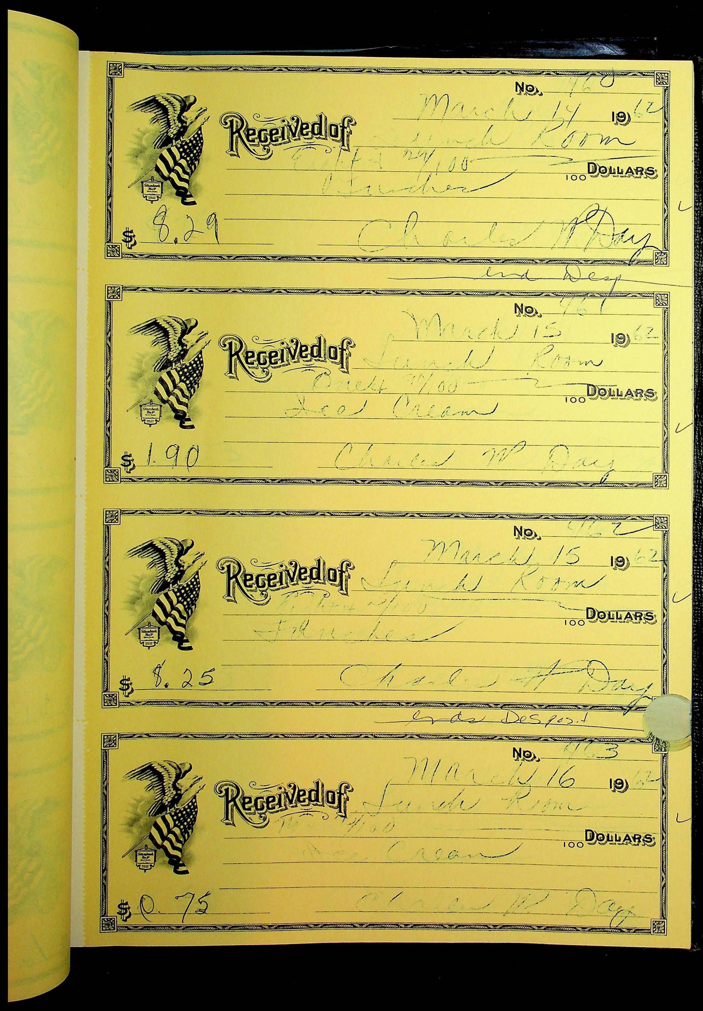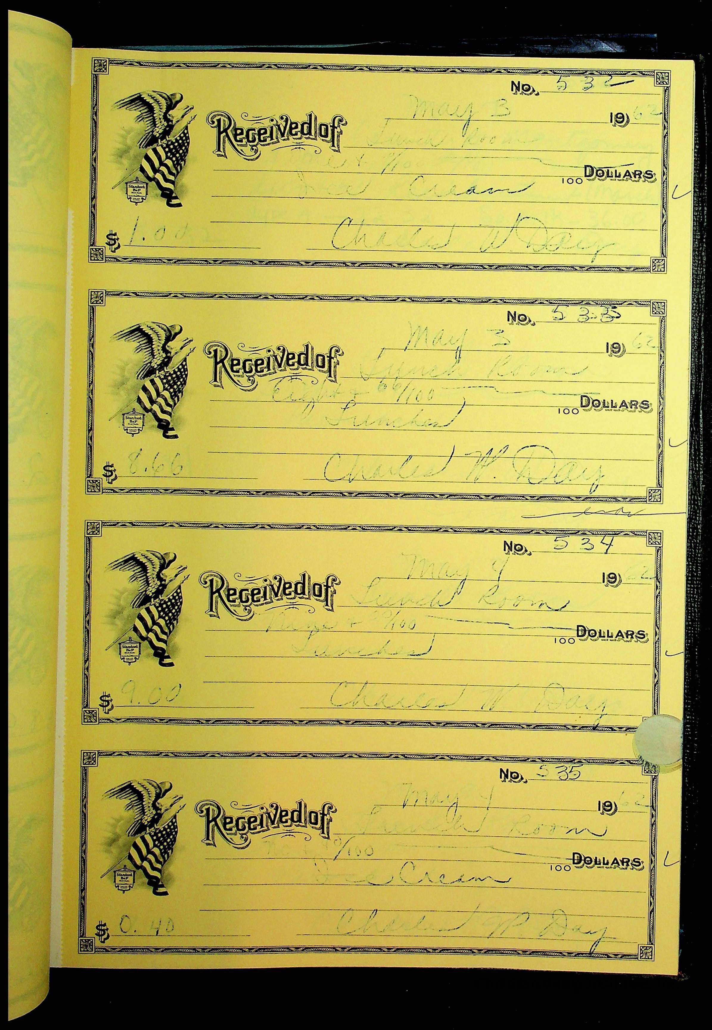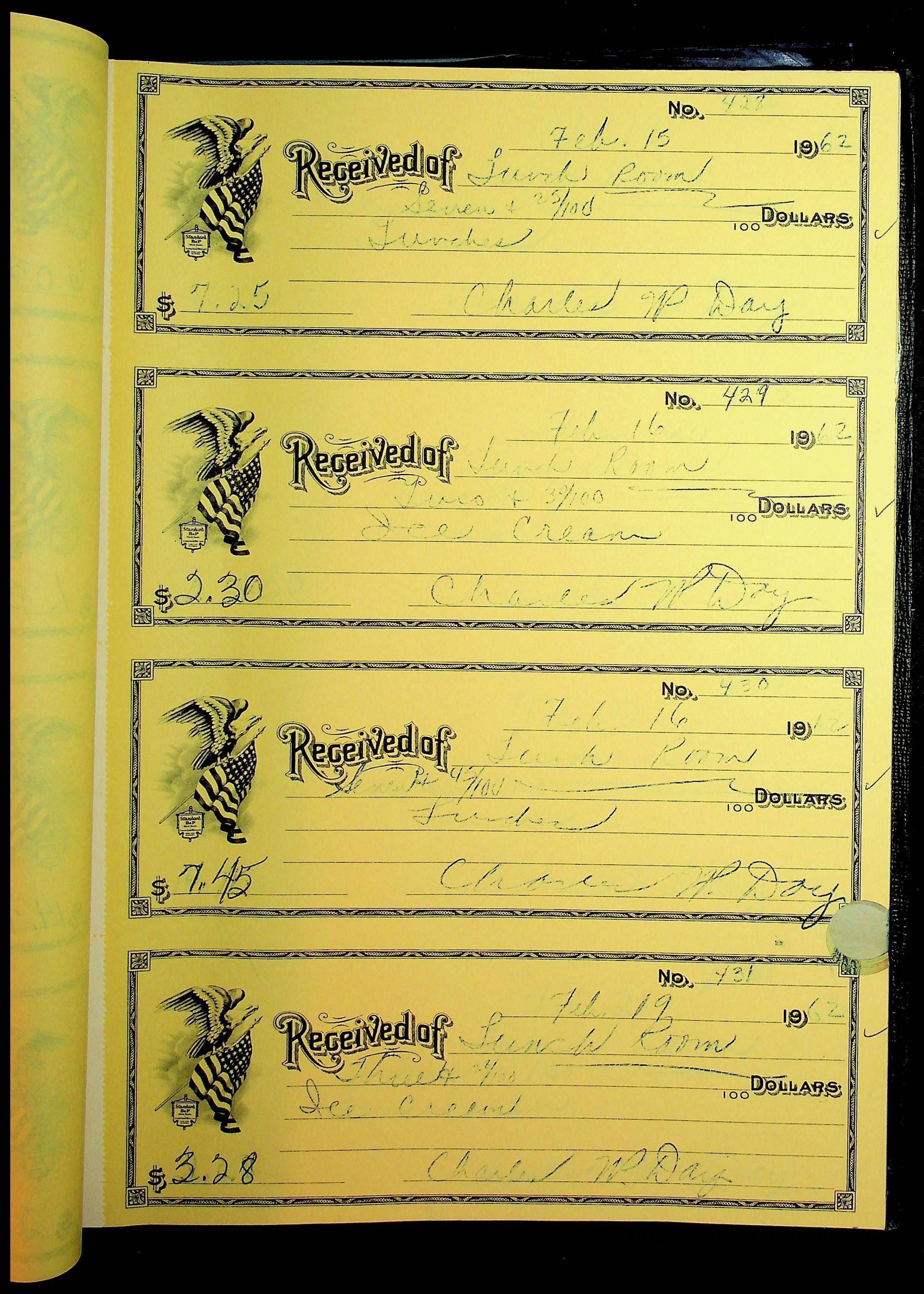 A receipt book manufactured by Boorum & Pease and used by Christiansburg Institute to document expenses and receipts from 1961 through 1963.