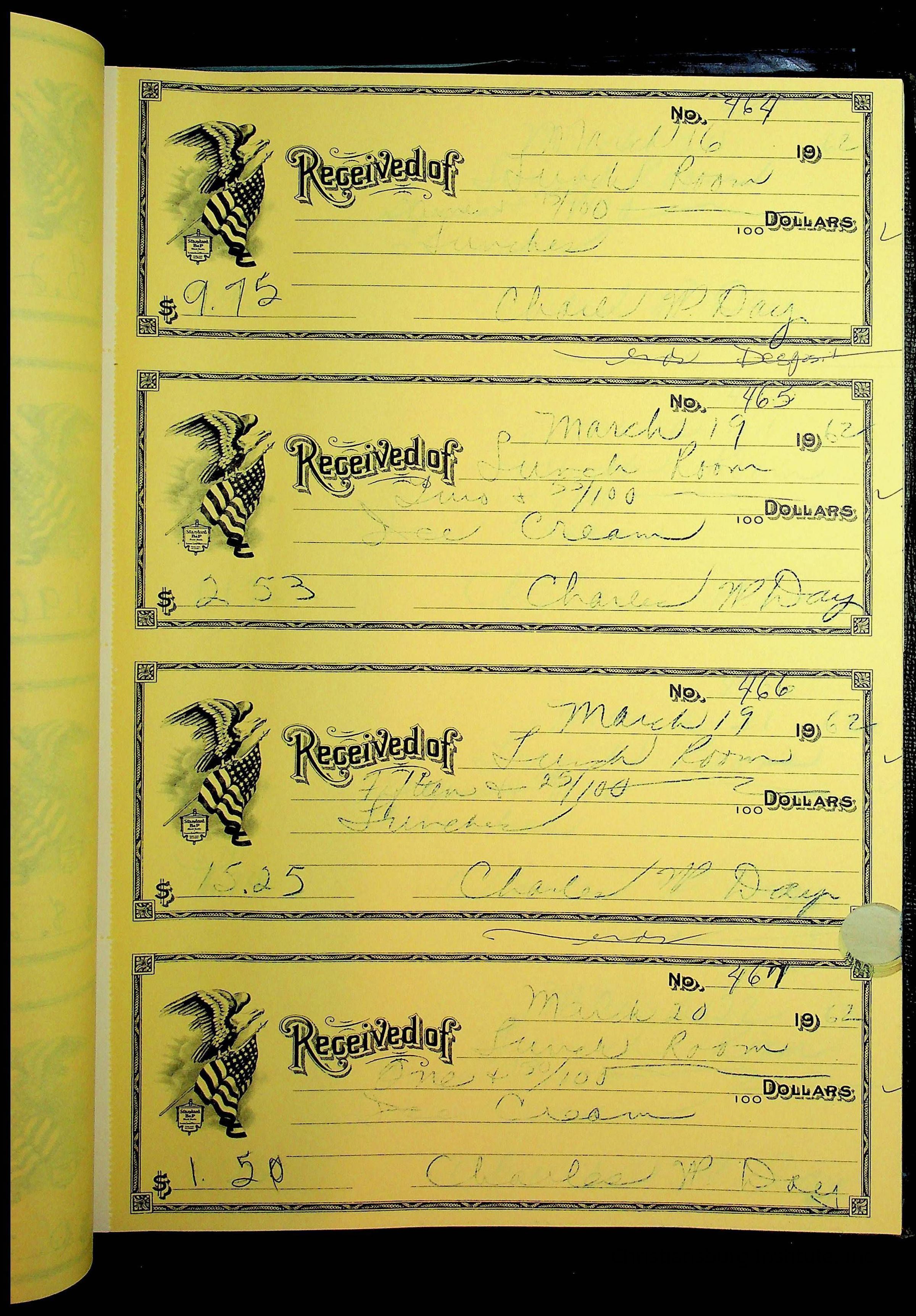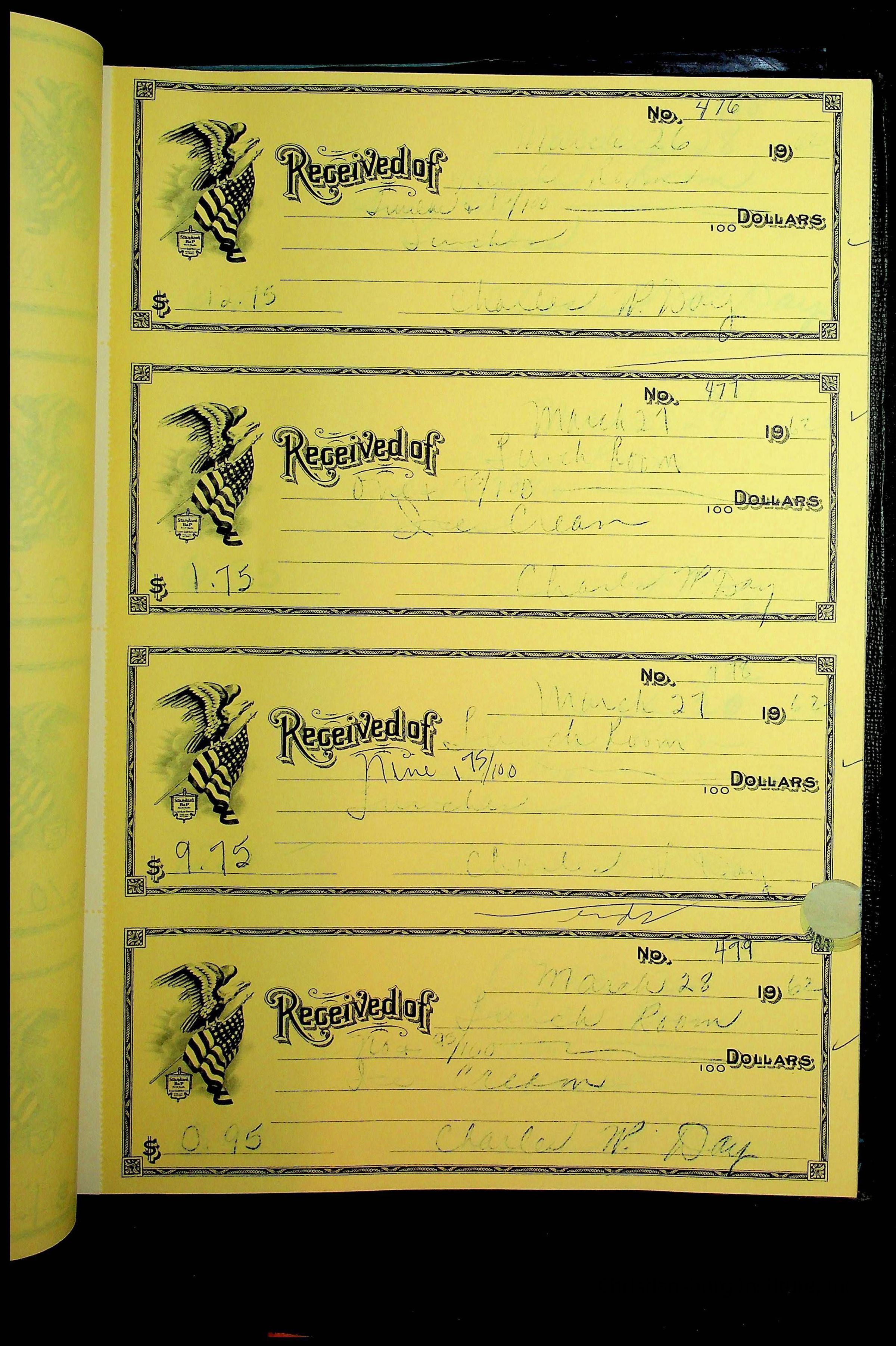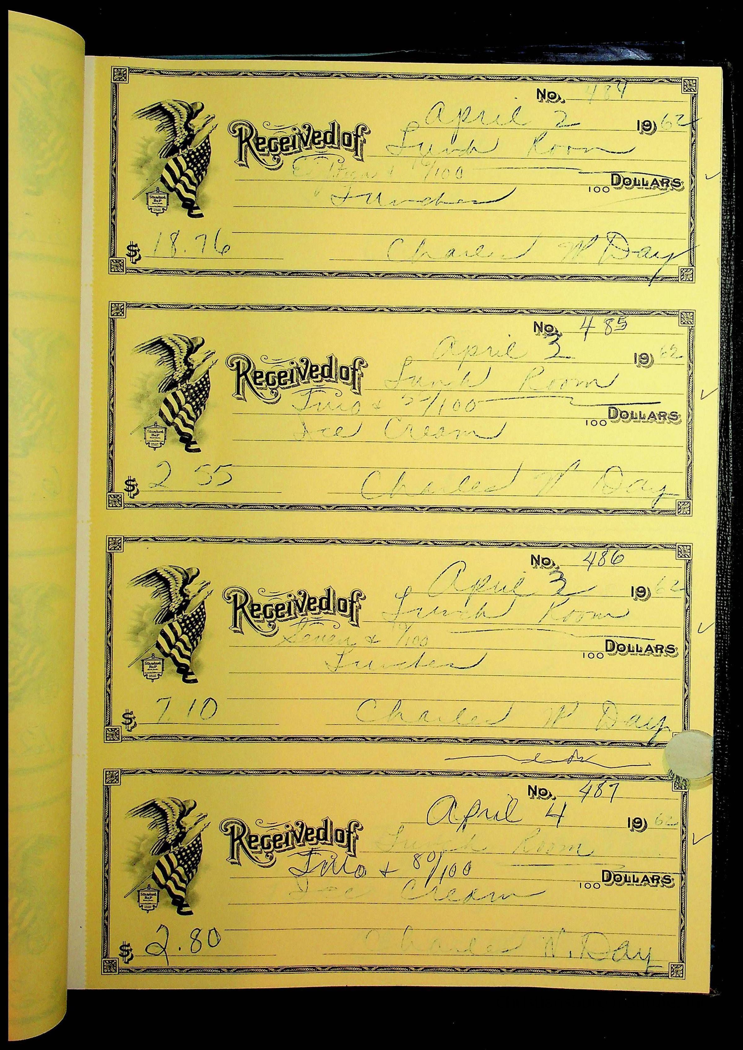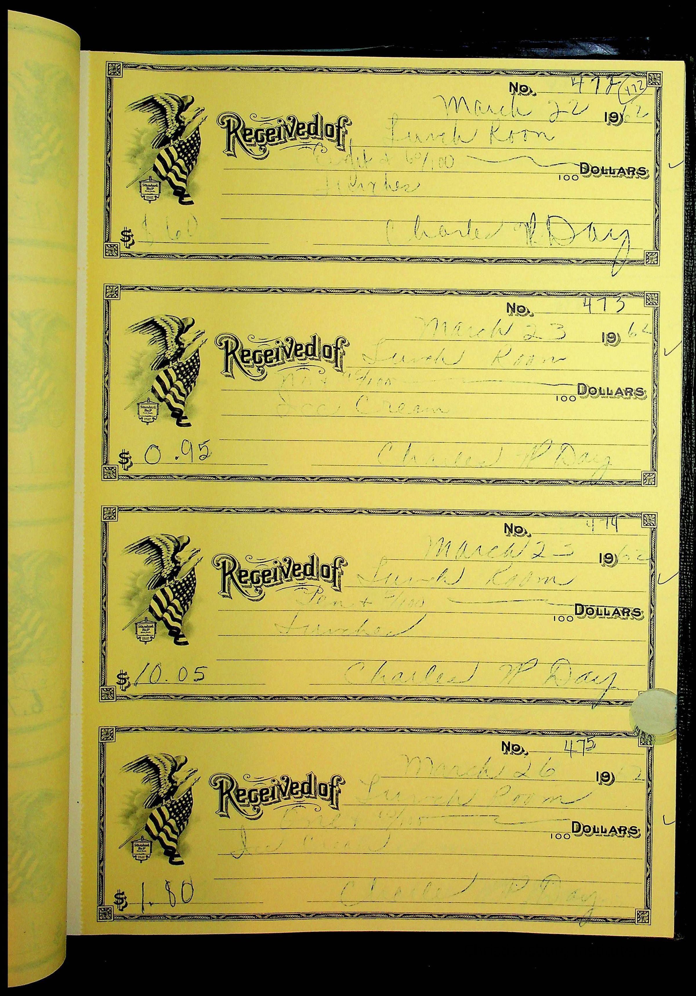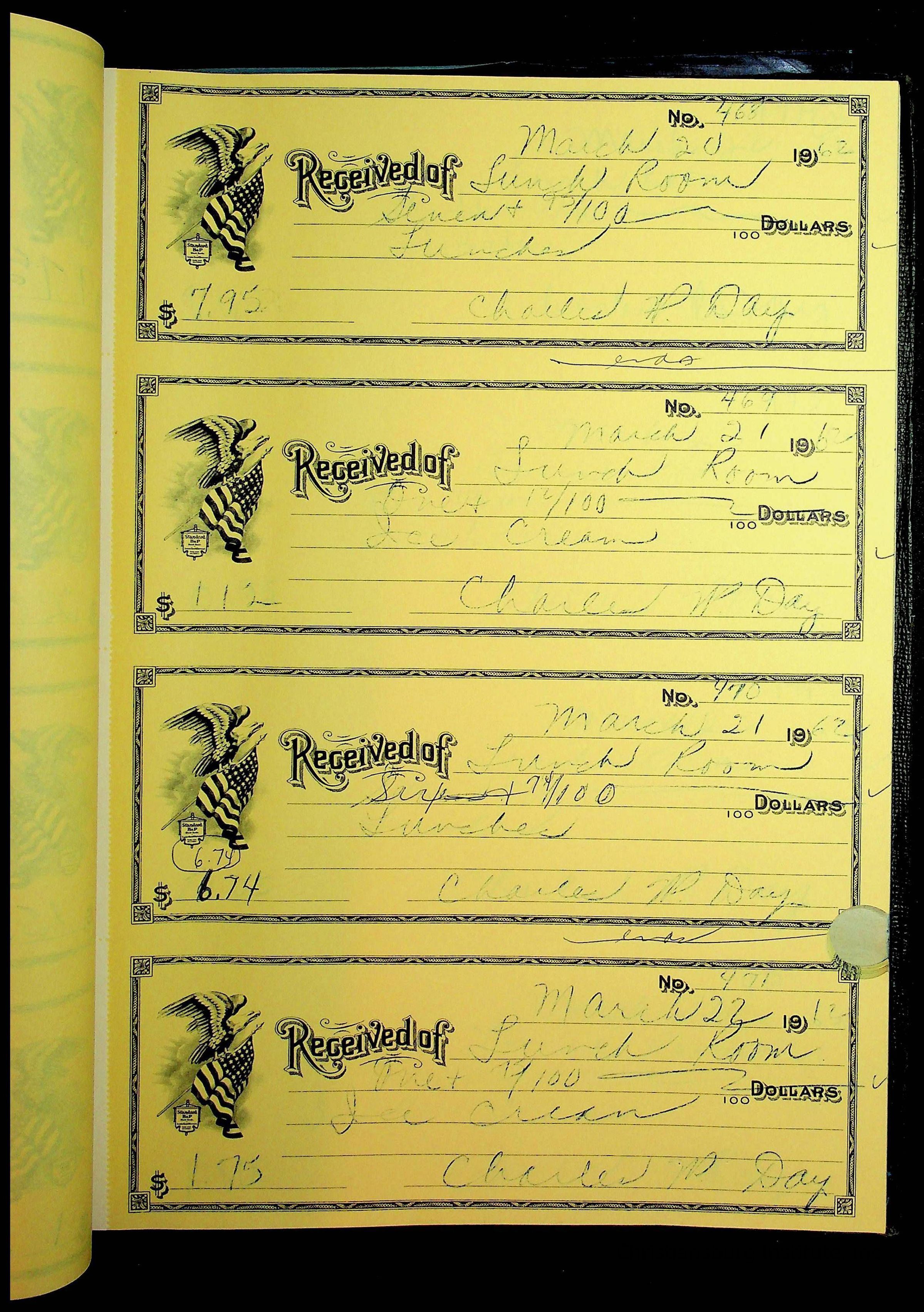 A receipt book manufactured by Boorum & Pease and used by Christiansburg Institute to document expenses and receipts from 1961 through 1963.