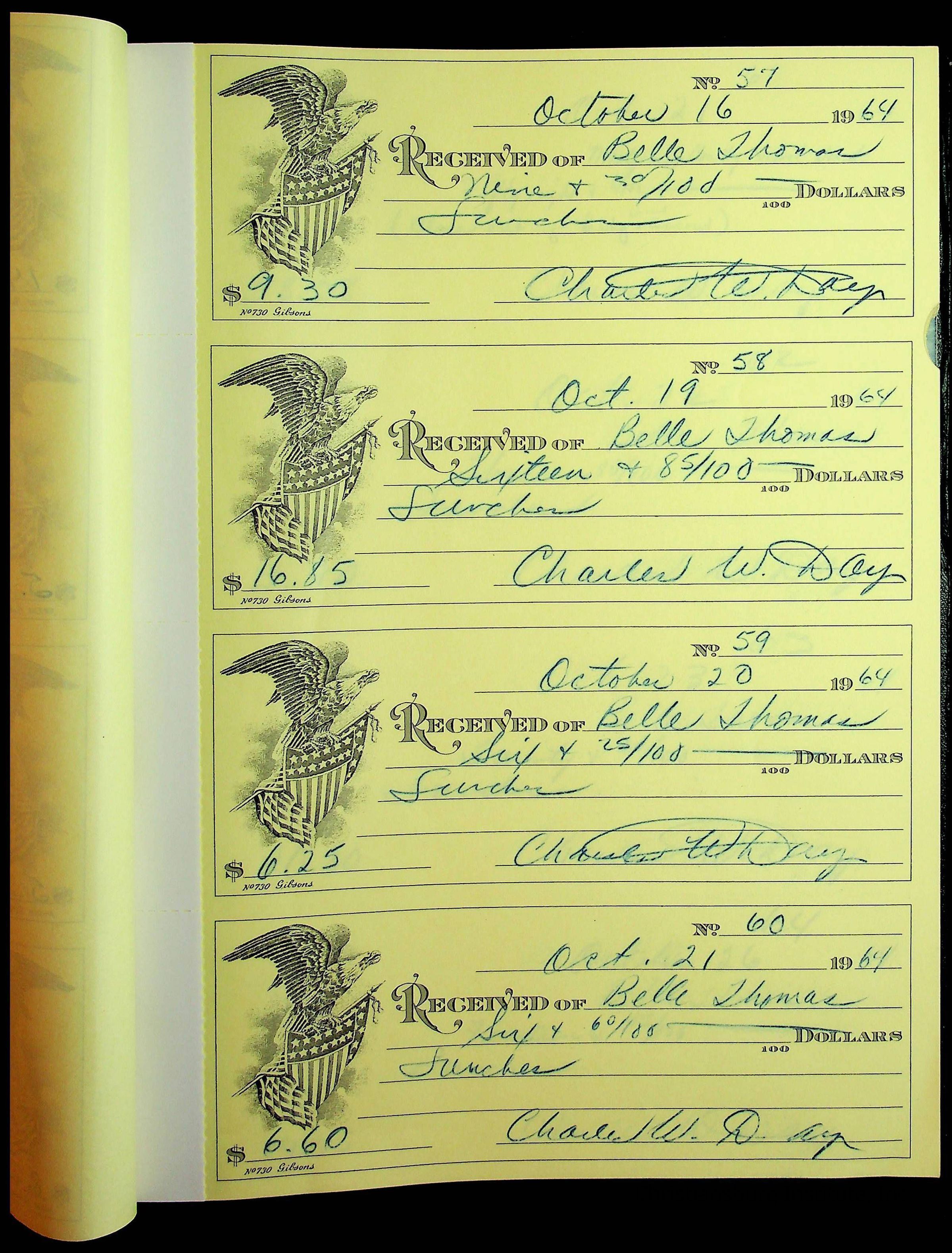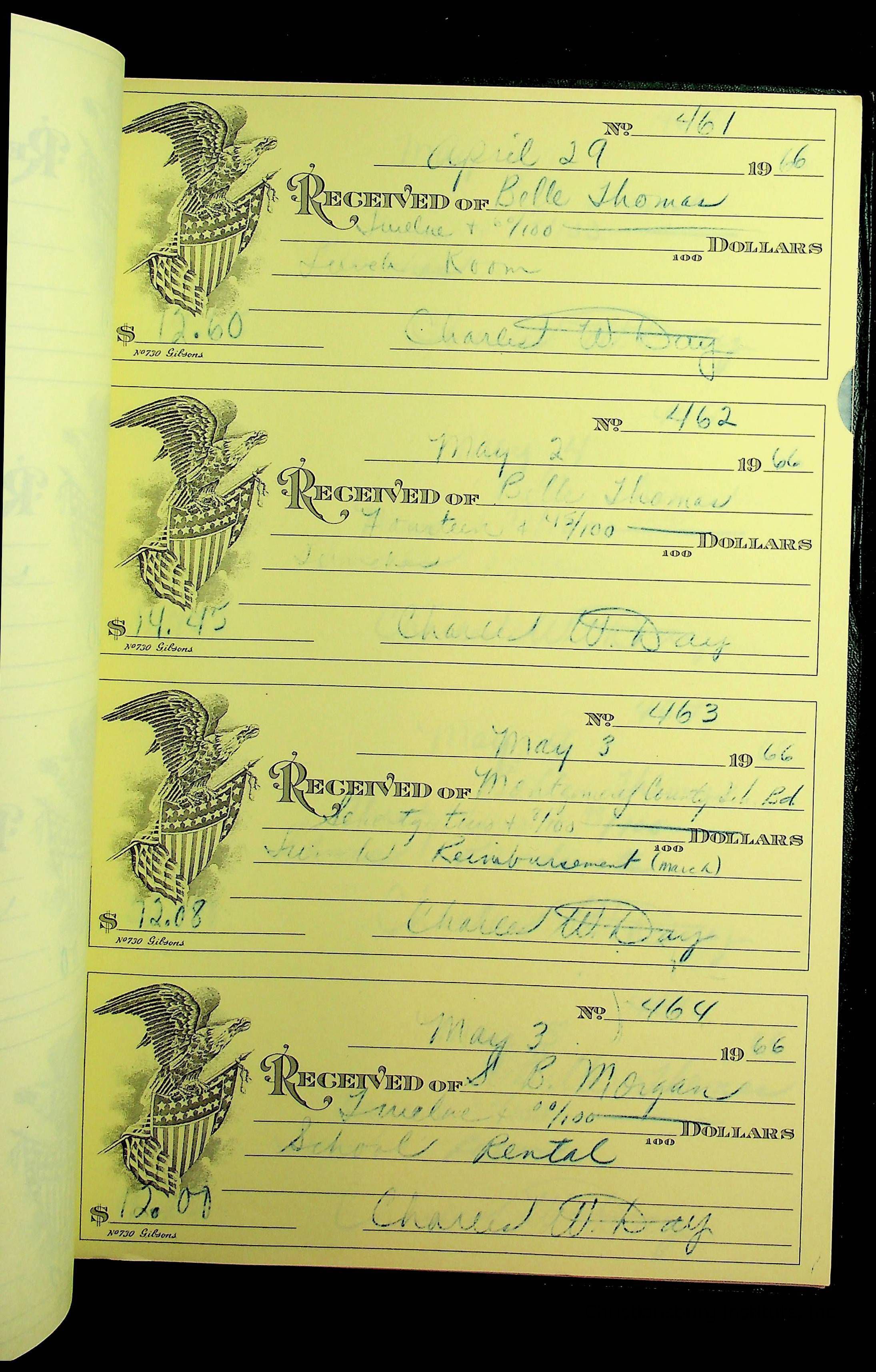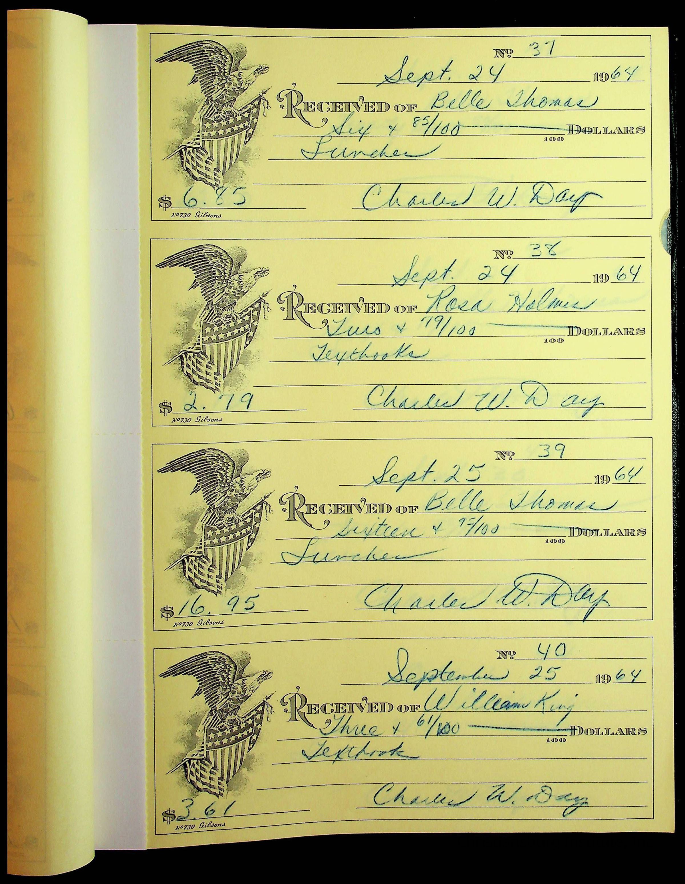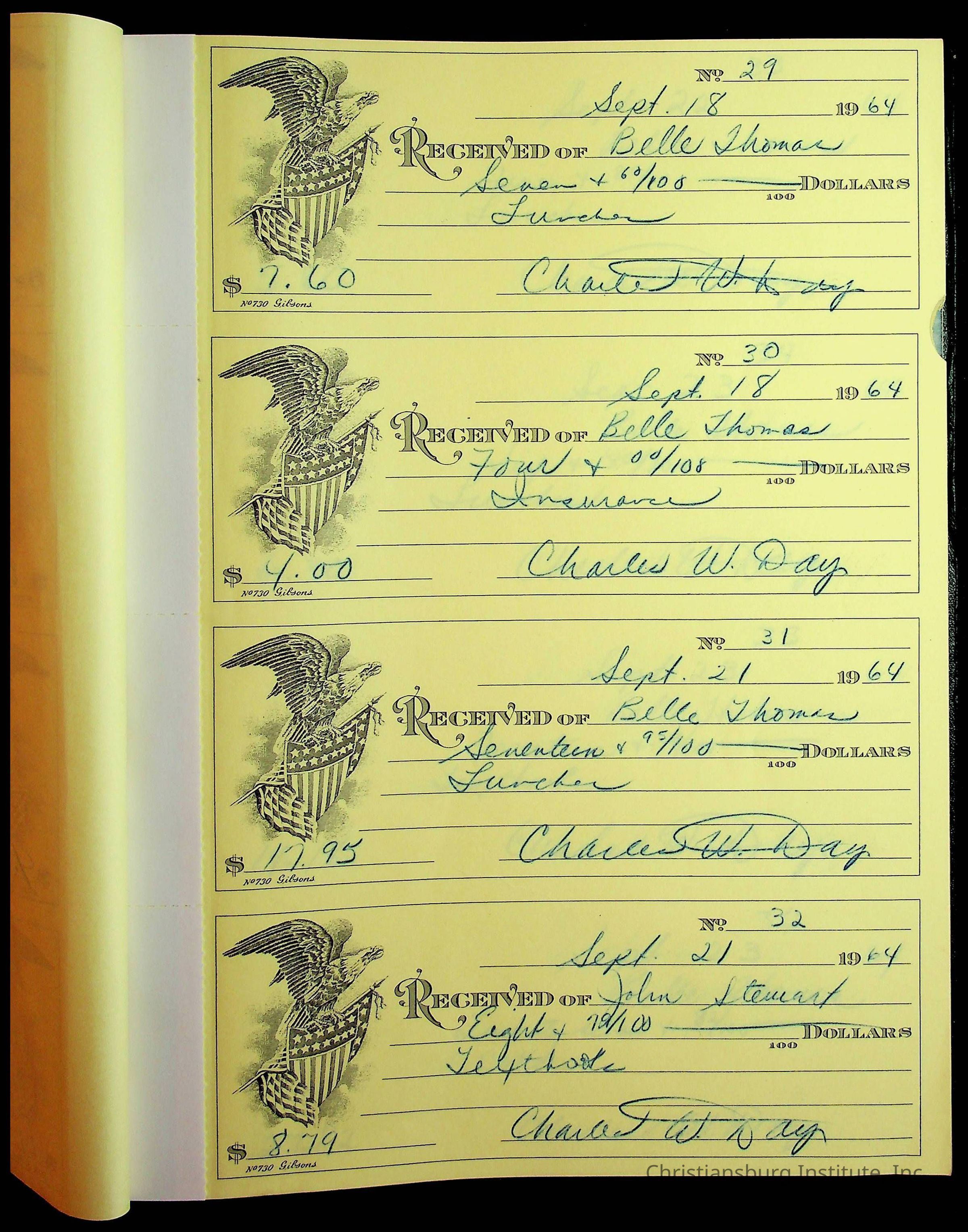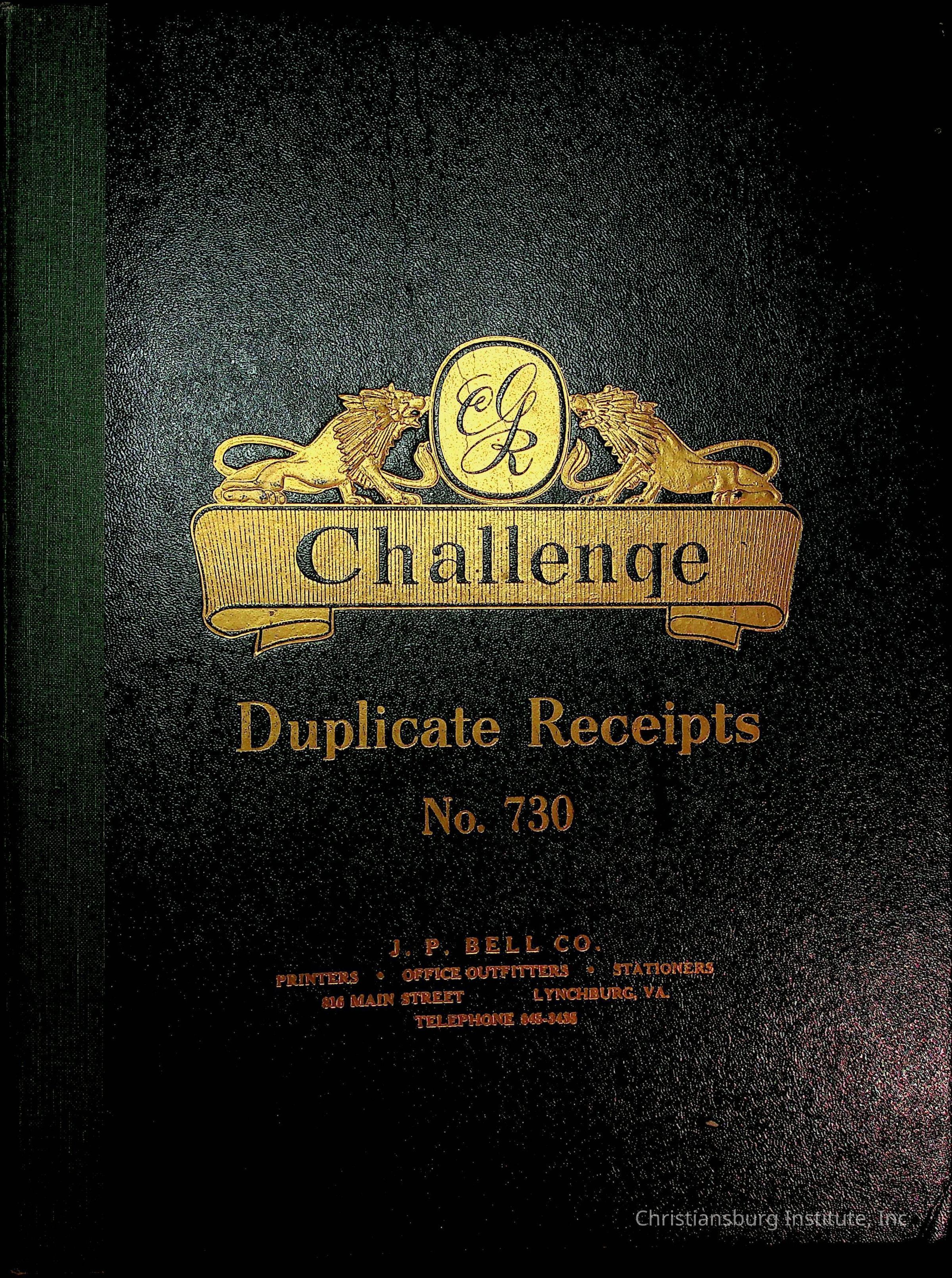 A receipt book manufactured by J.P. Bell company and used by Christiansburg Institute to document expenses and receipts from 1964 through 1966.
