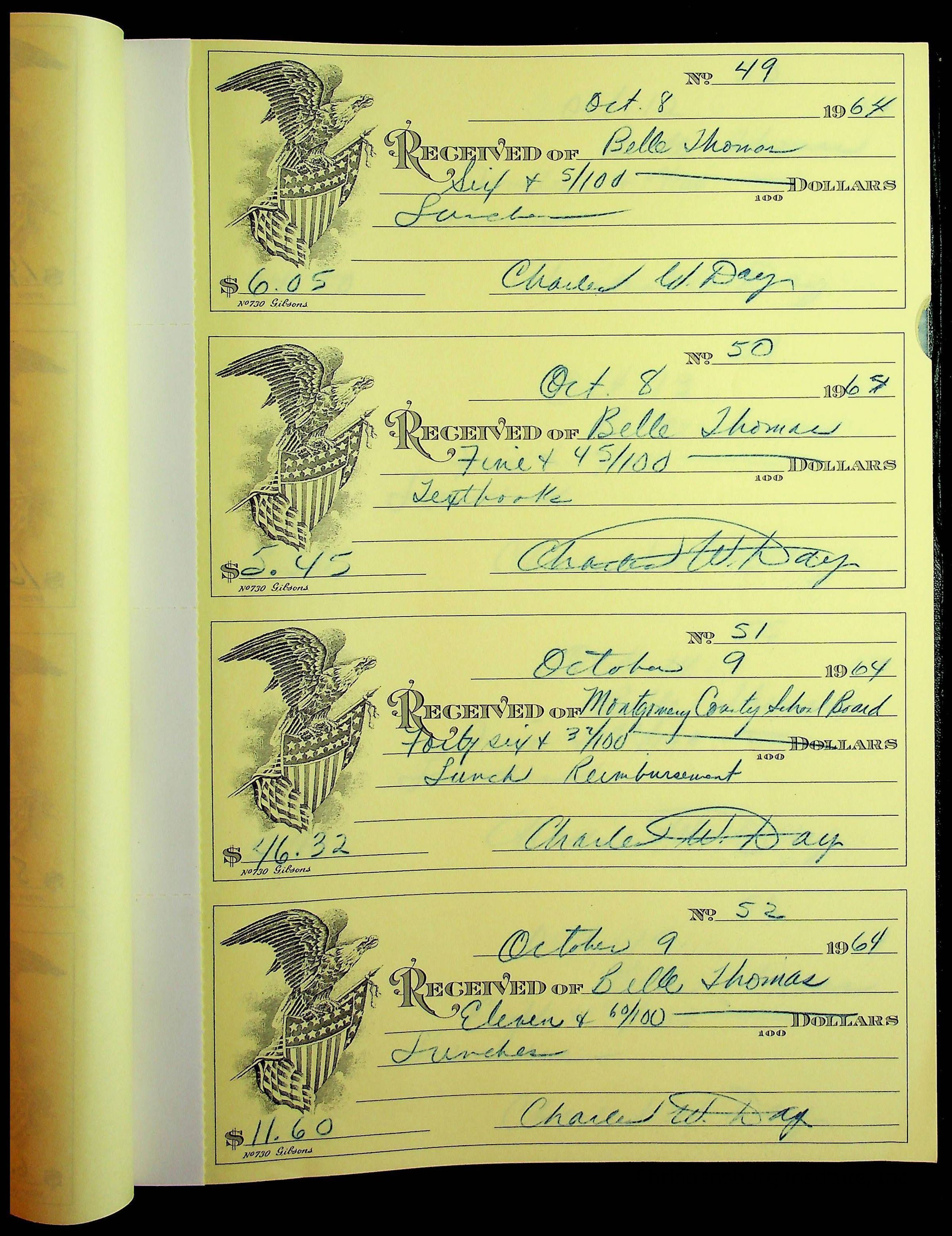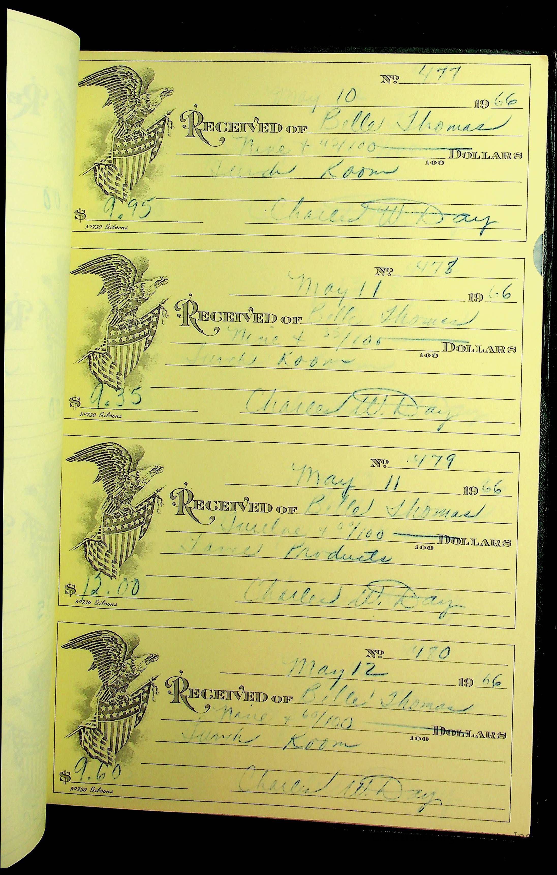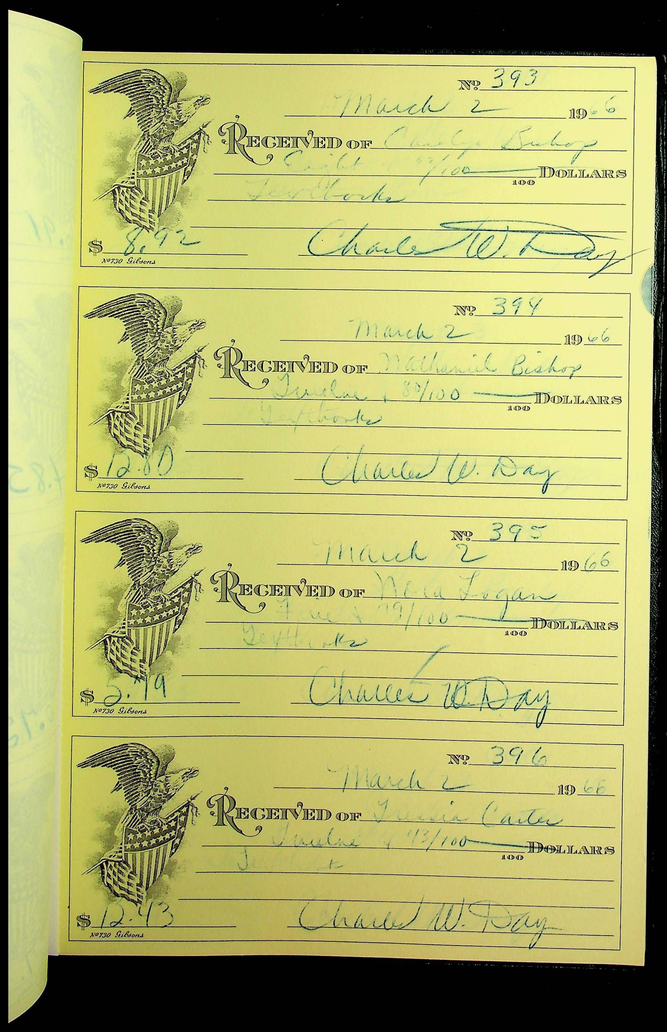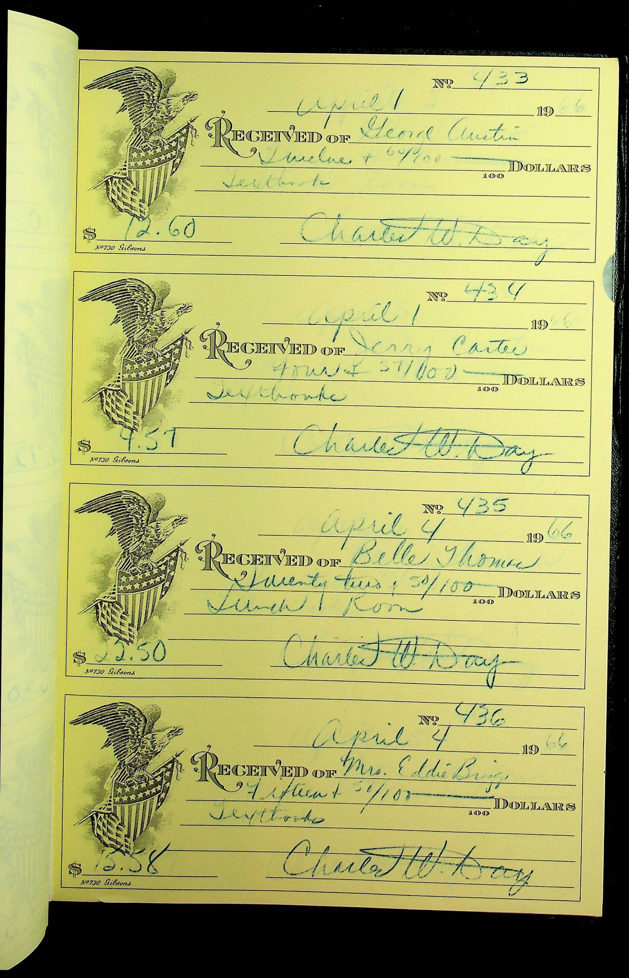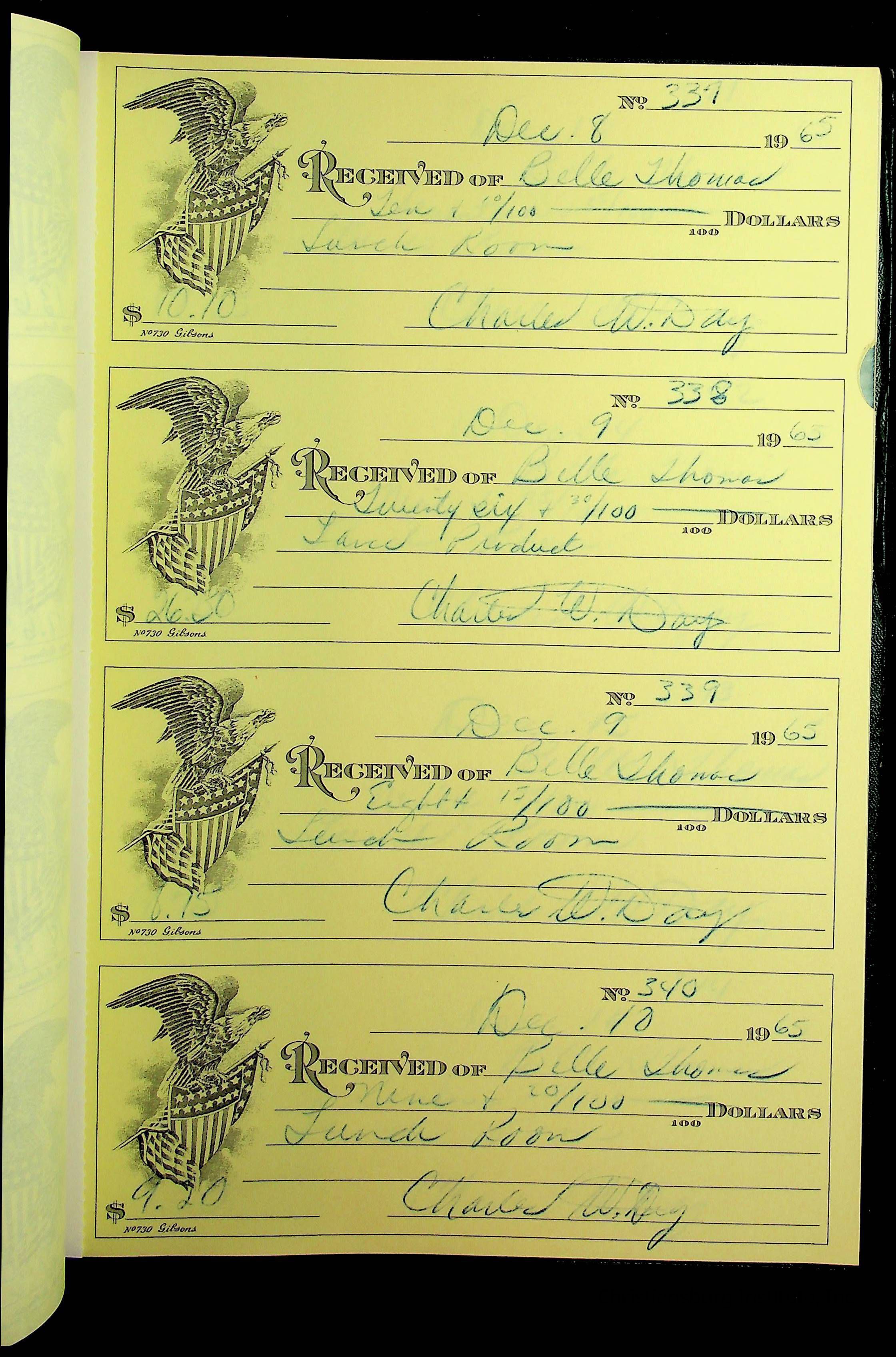 A receipt book manufactured by J.P. Bell company and used by Christiansburg Institute to document expenses and receipts from 1964 through 1966.