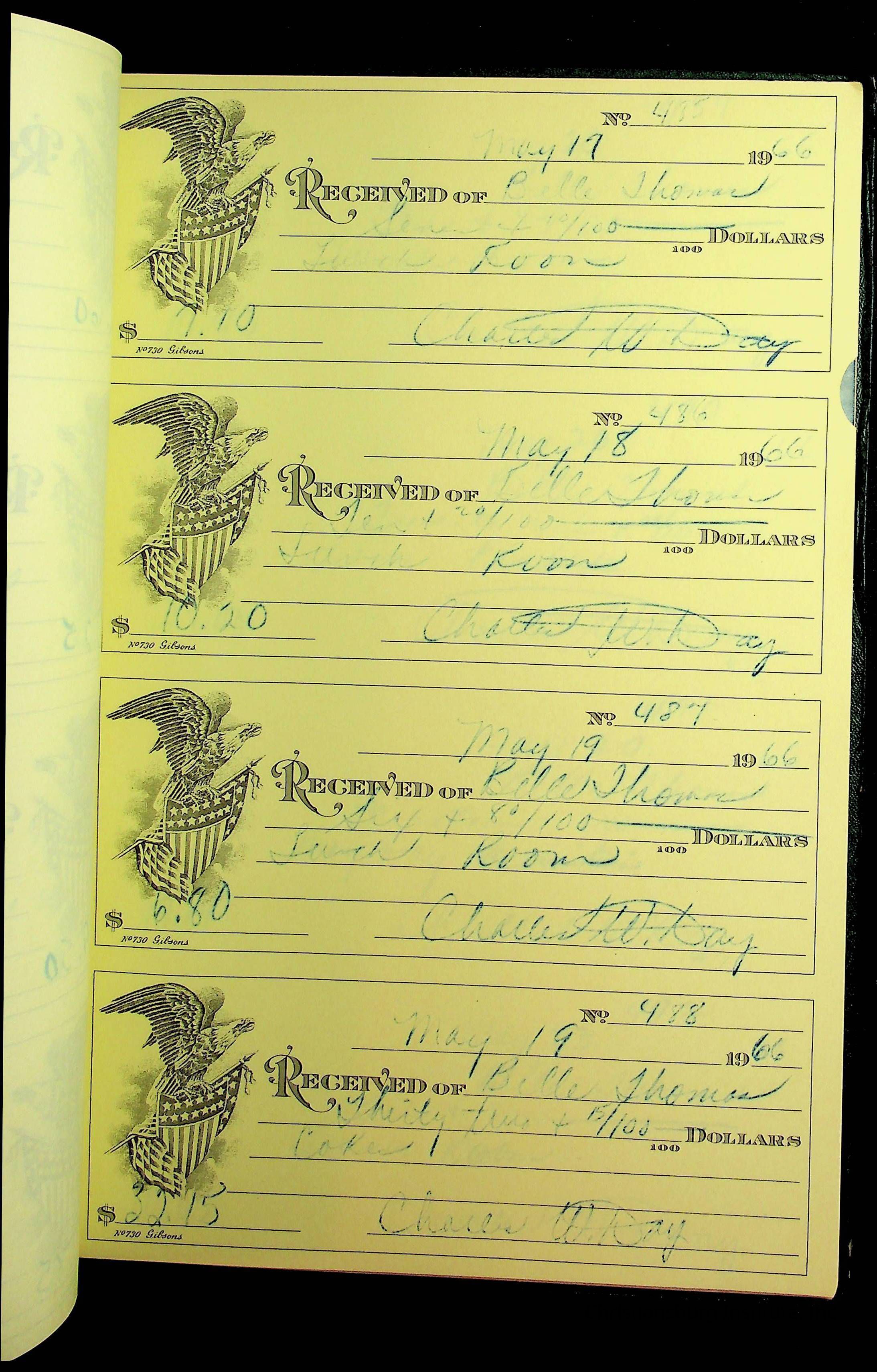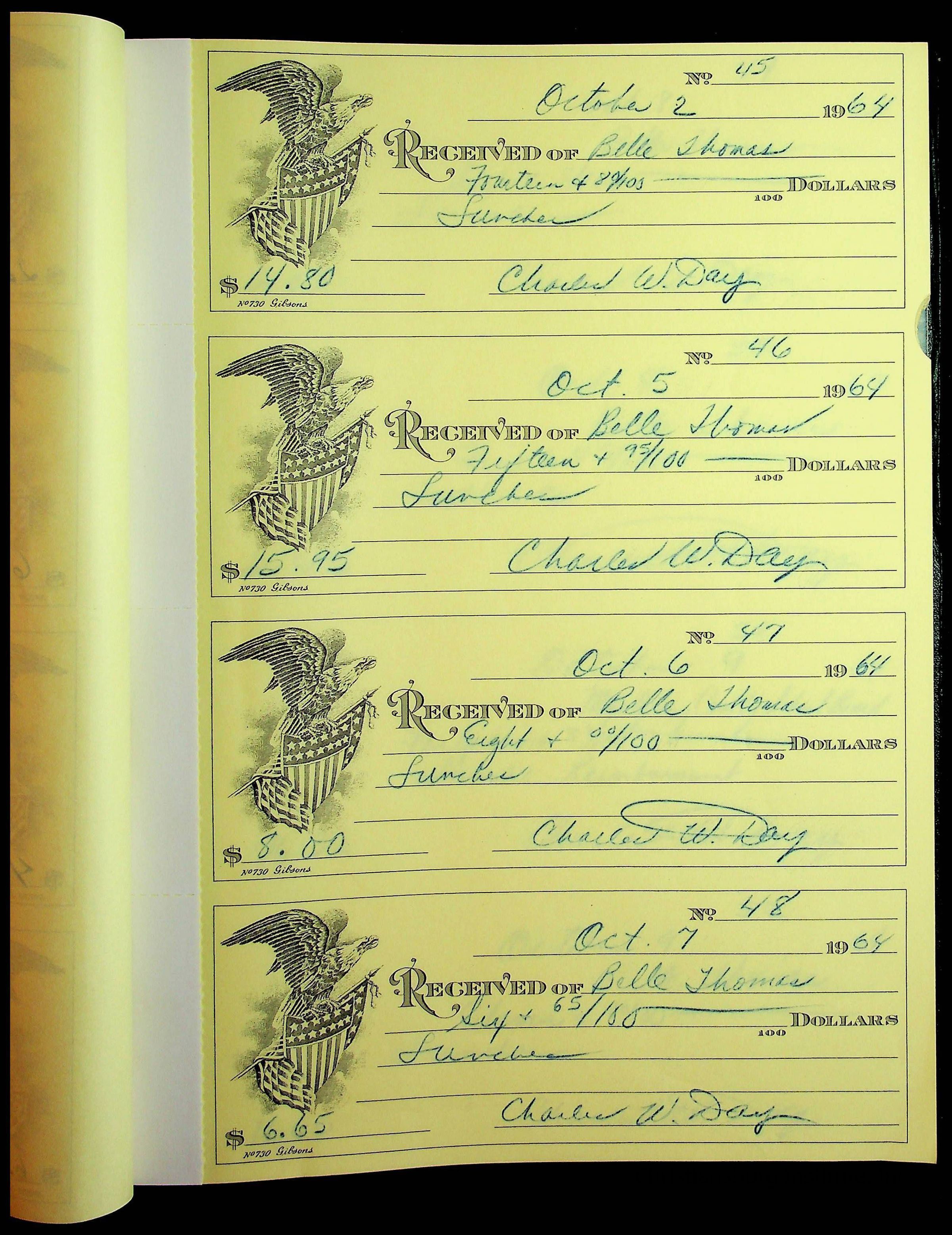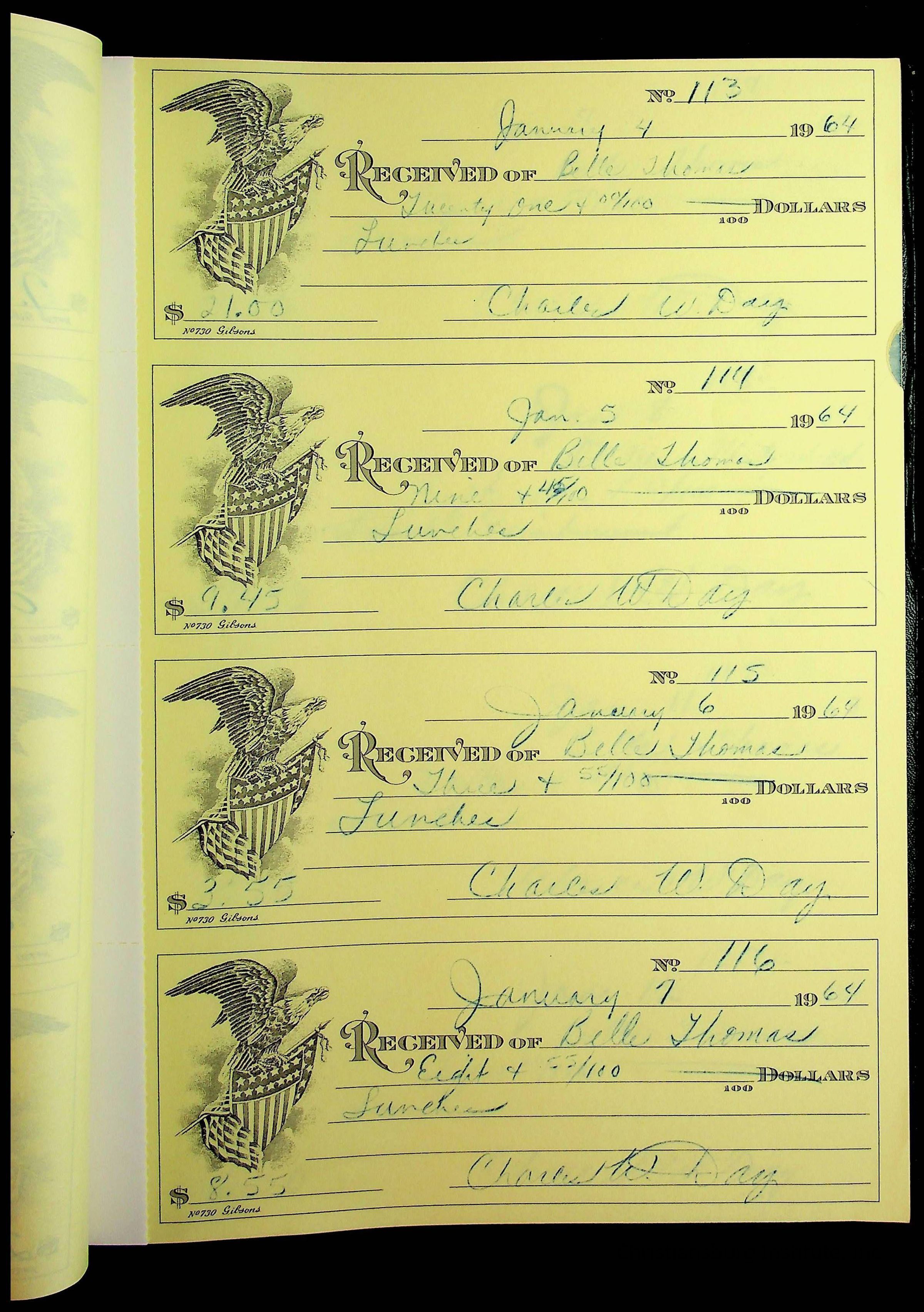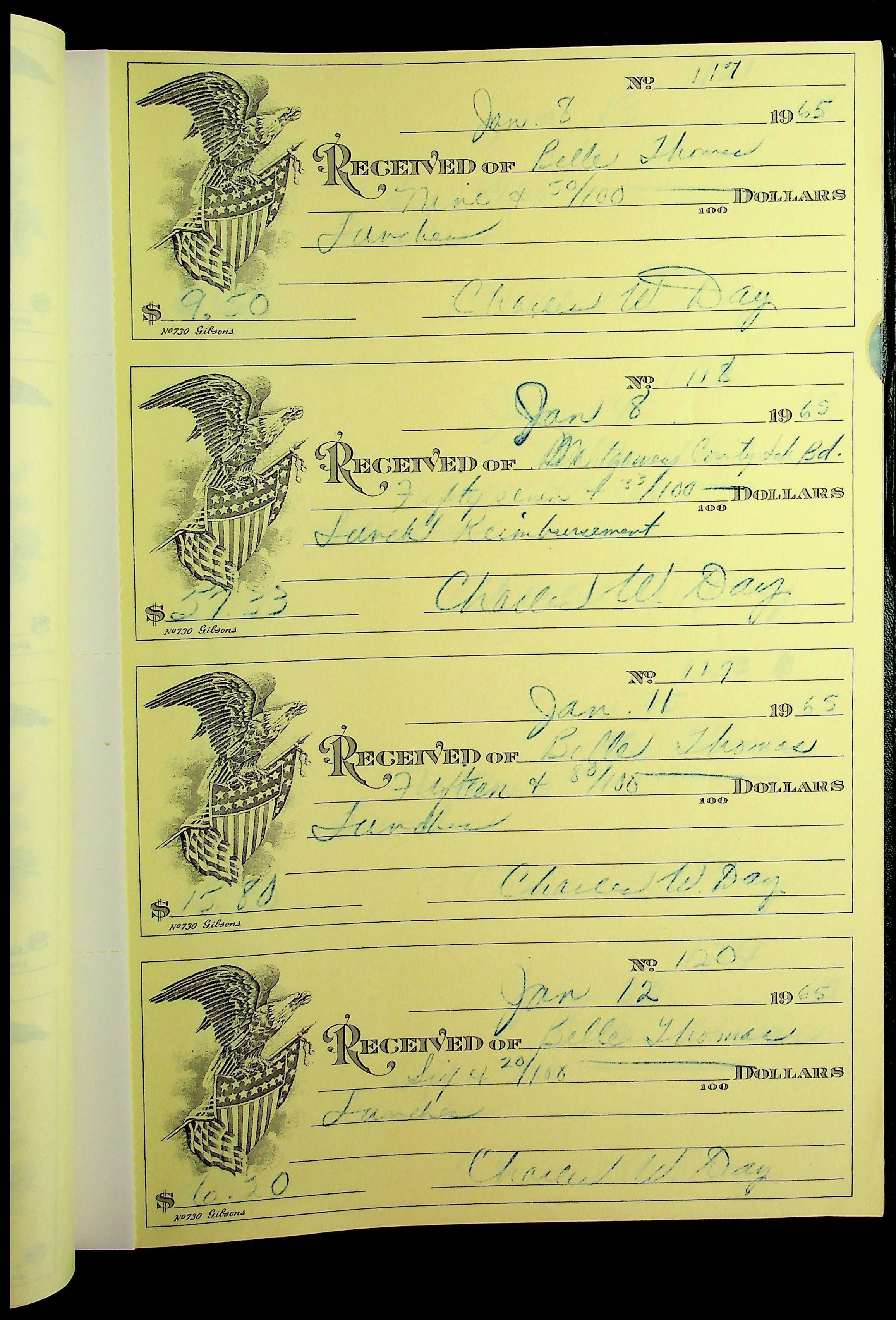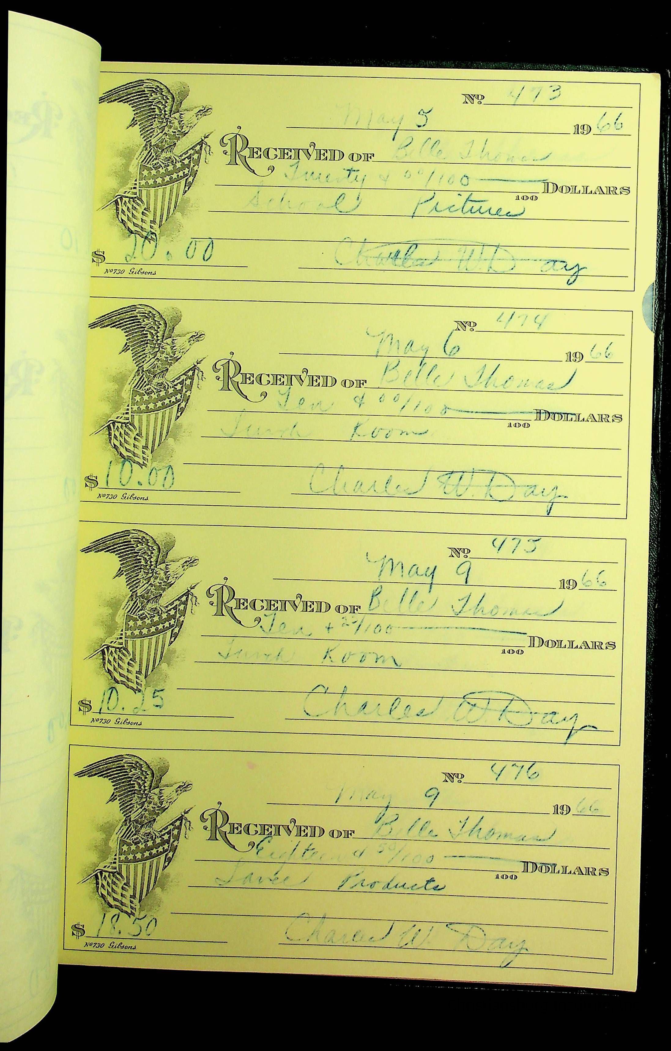 A receipt book manufactured by J.P. Bell company and used by Christiansburg Institute to document expenses and receipts from 1964 through 1966.
