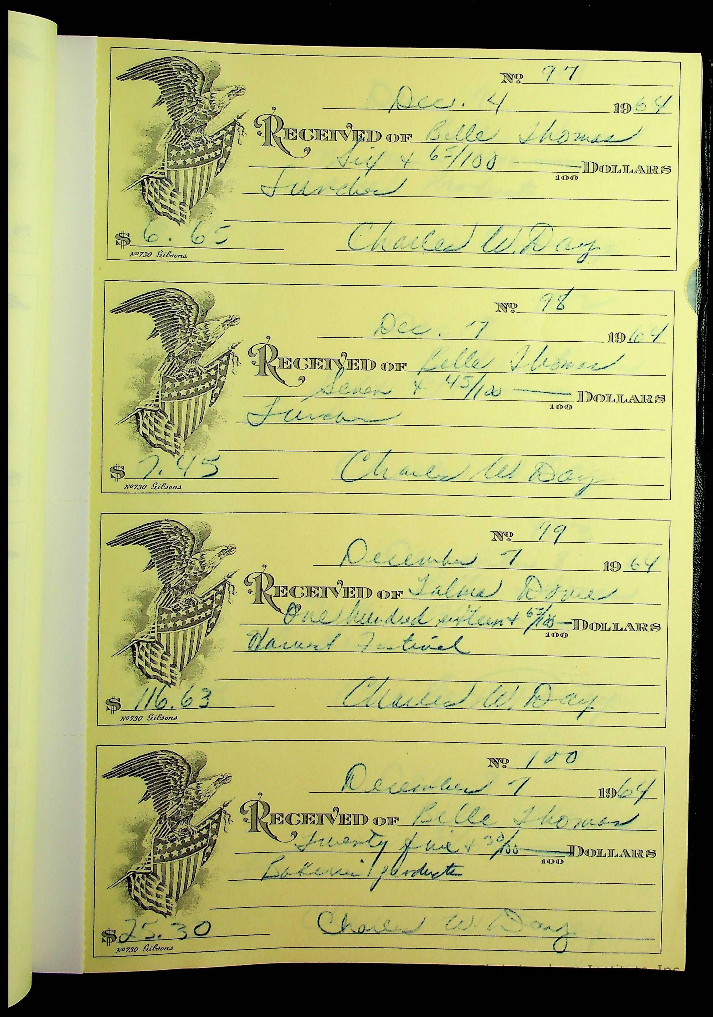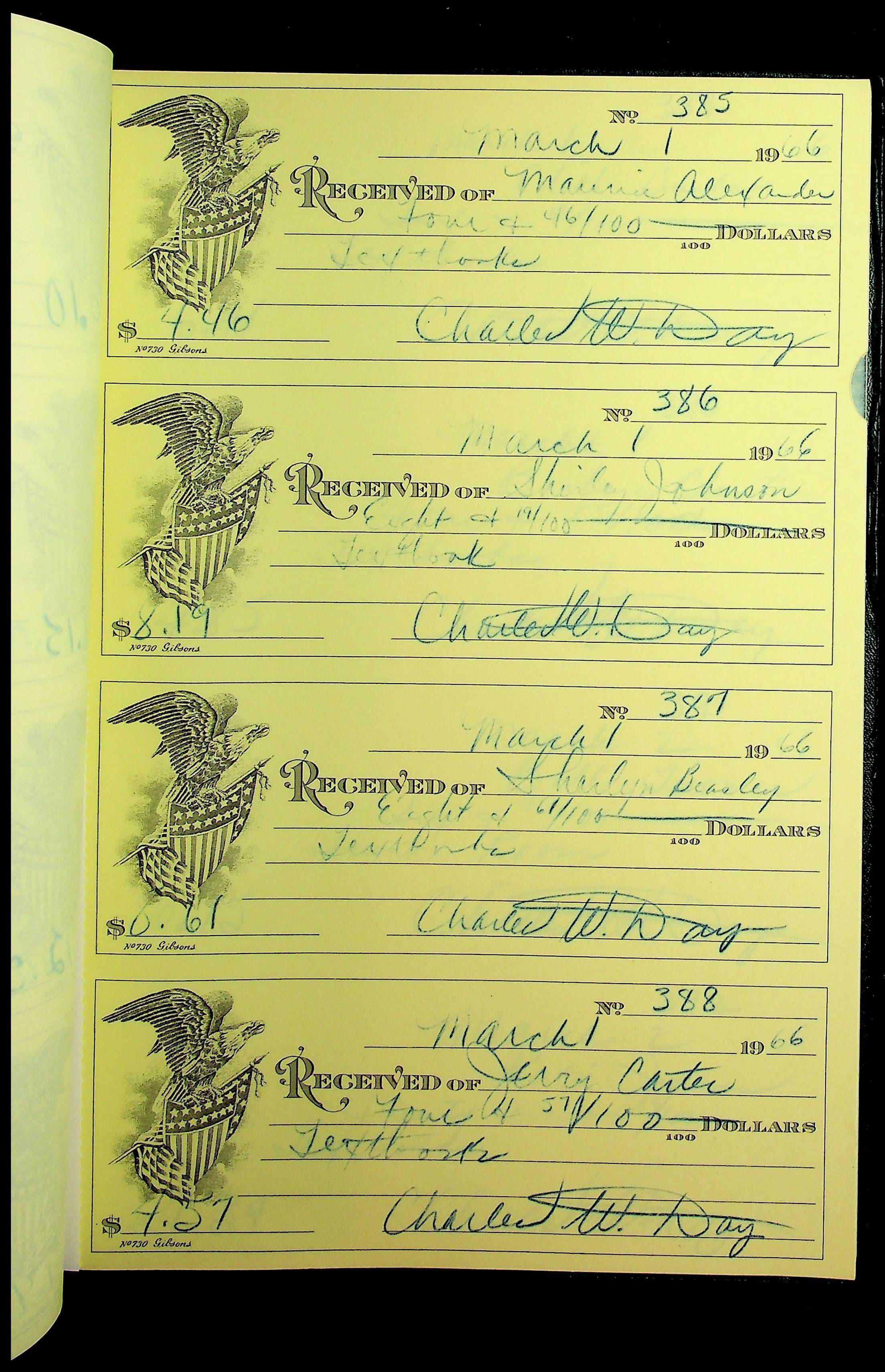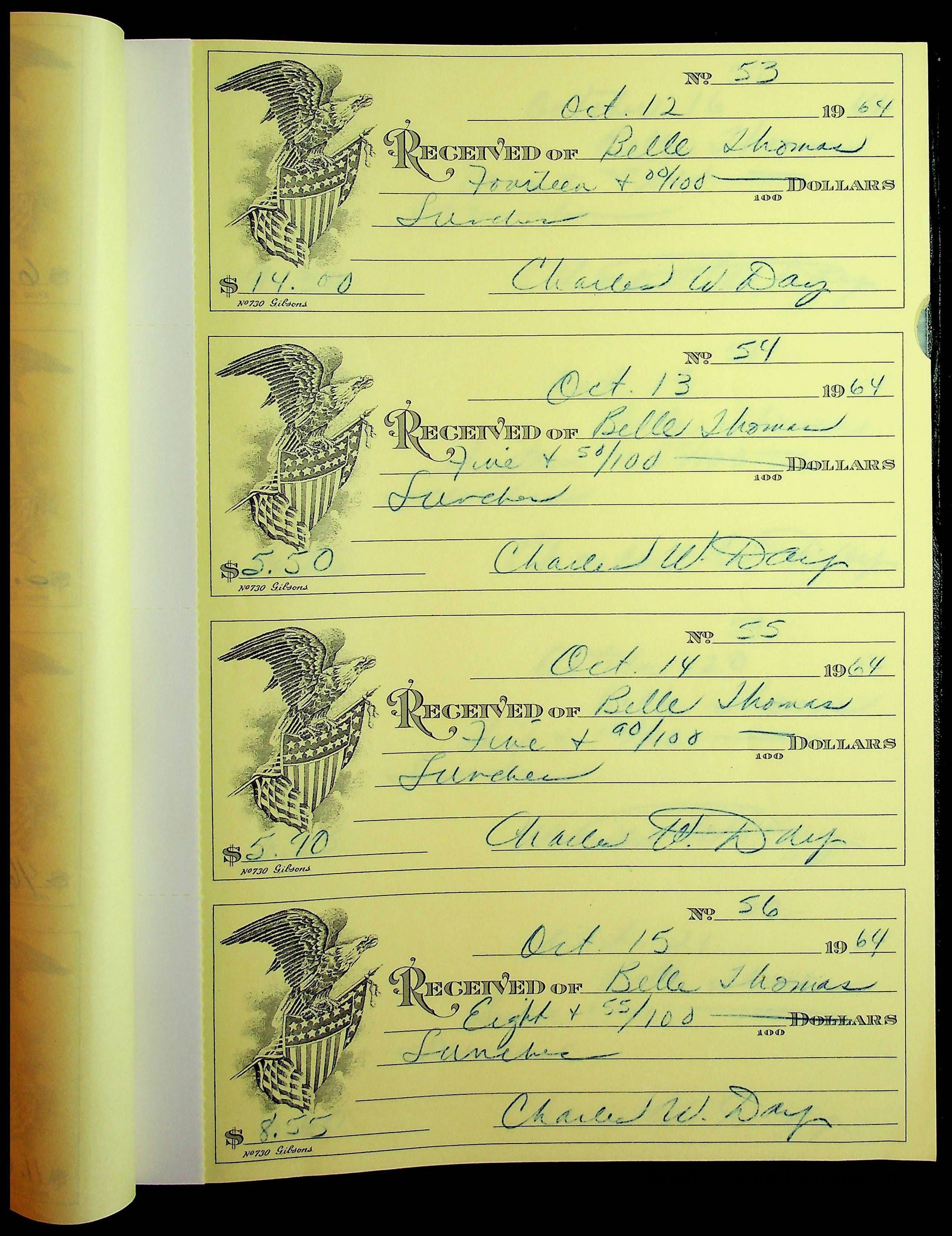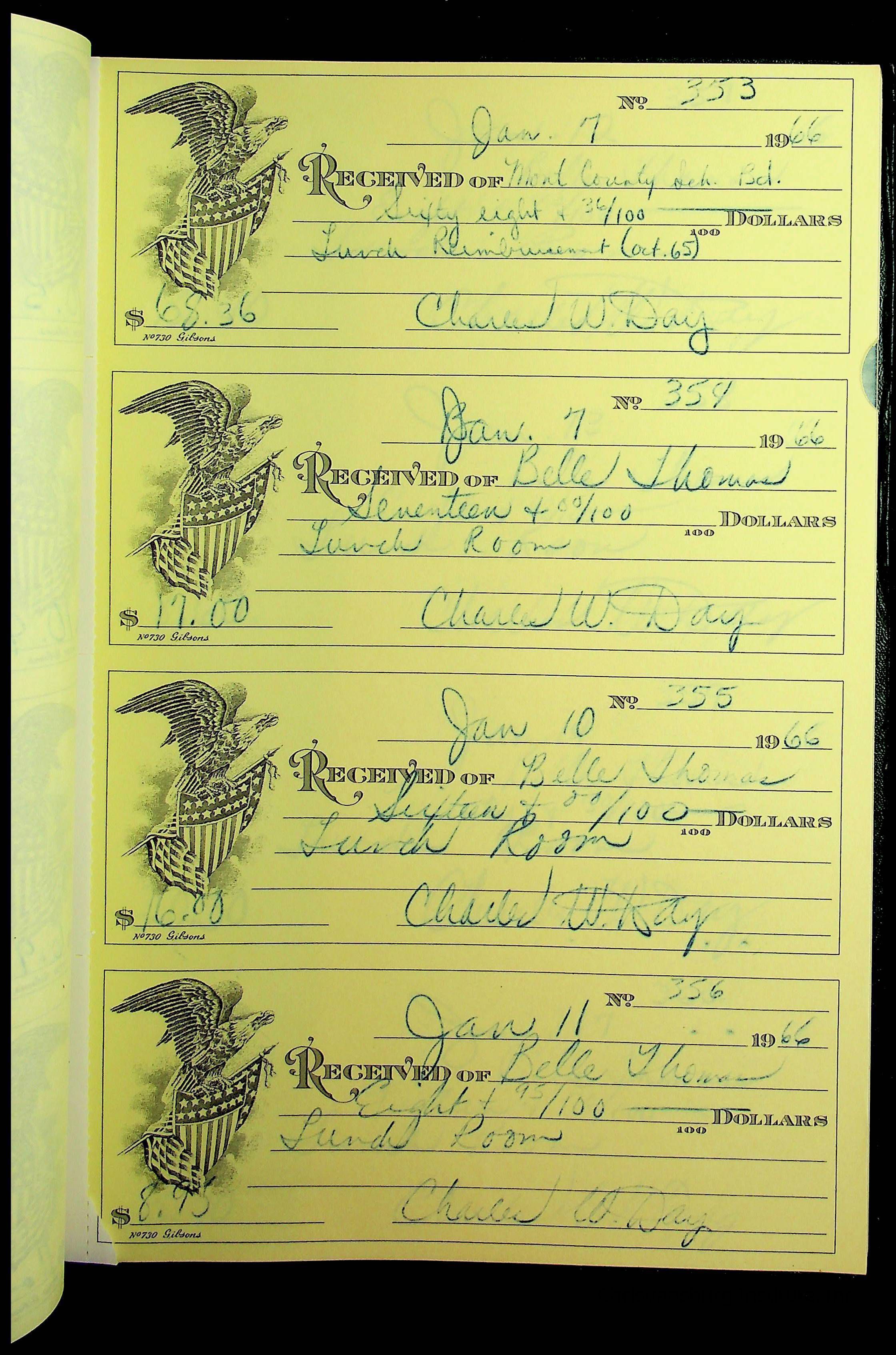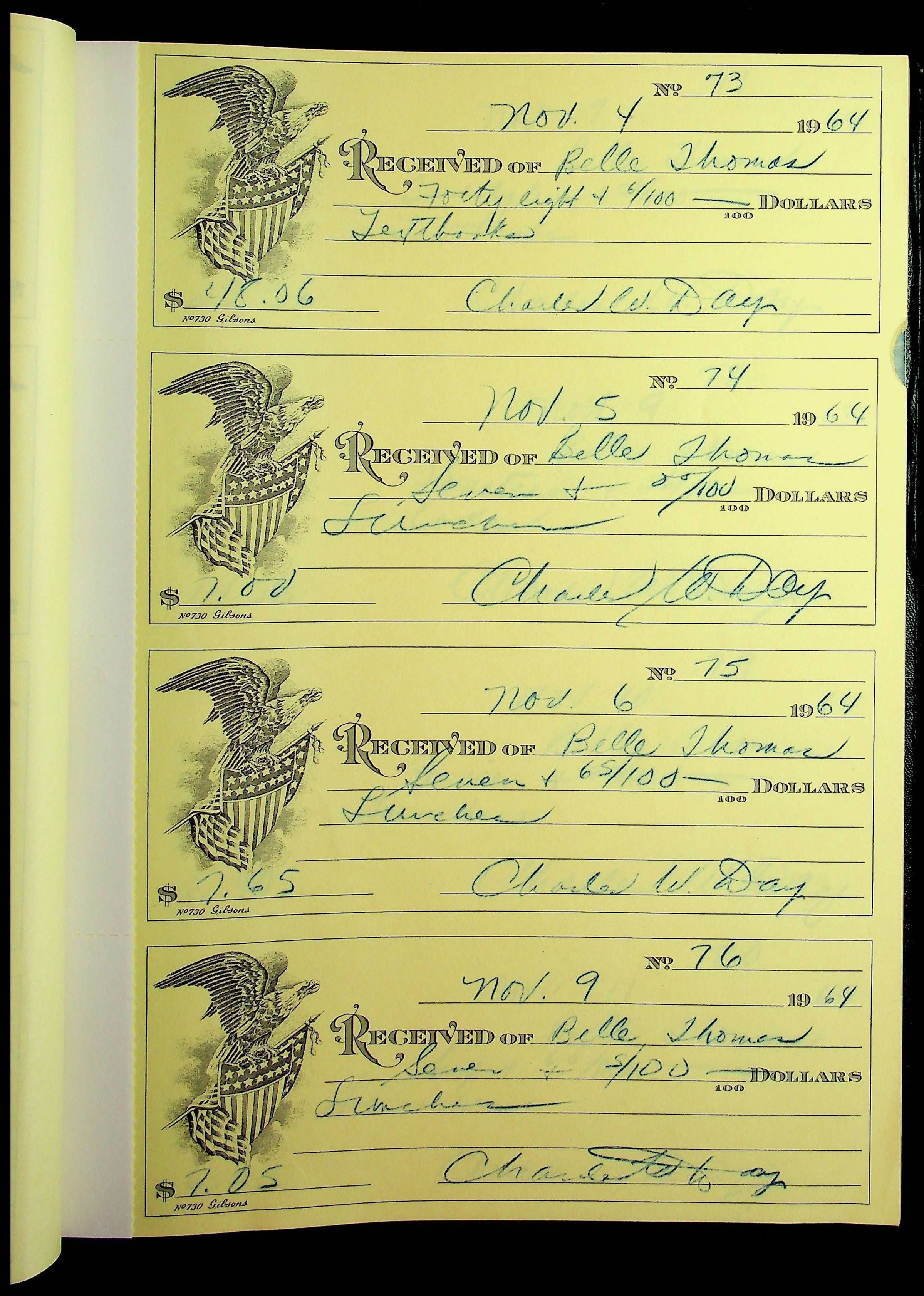 A receipt book manufactured by J.P. Bell company and used by Christiansburg Institute to document expenses and receipts from 1964 through 1966.