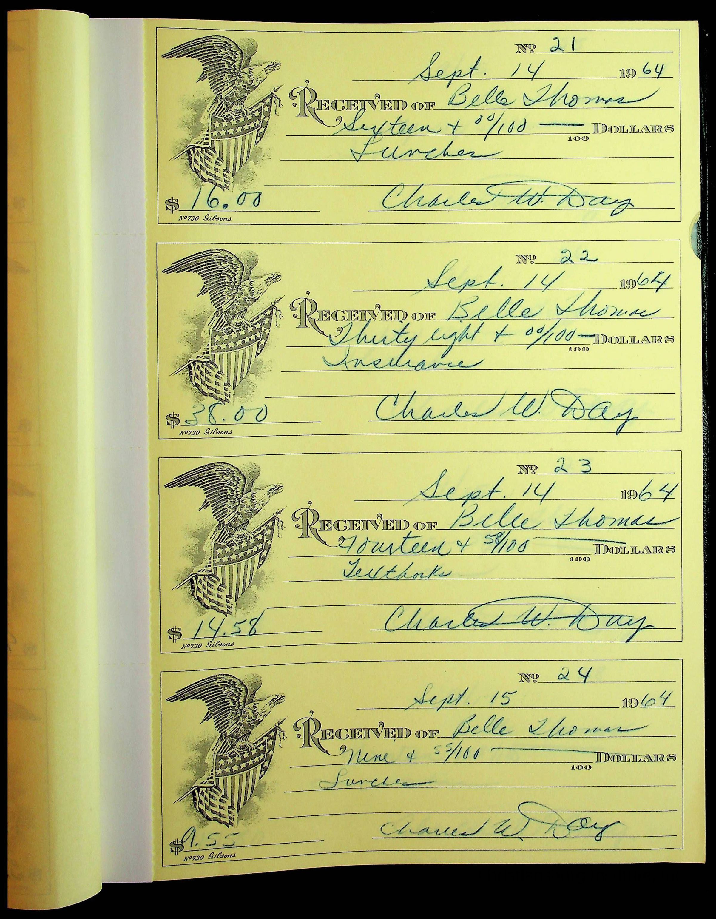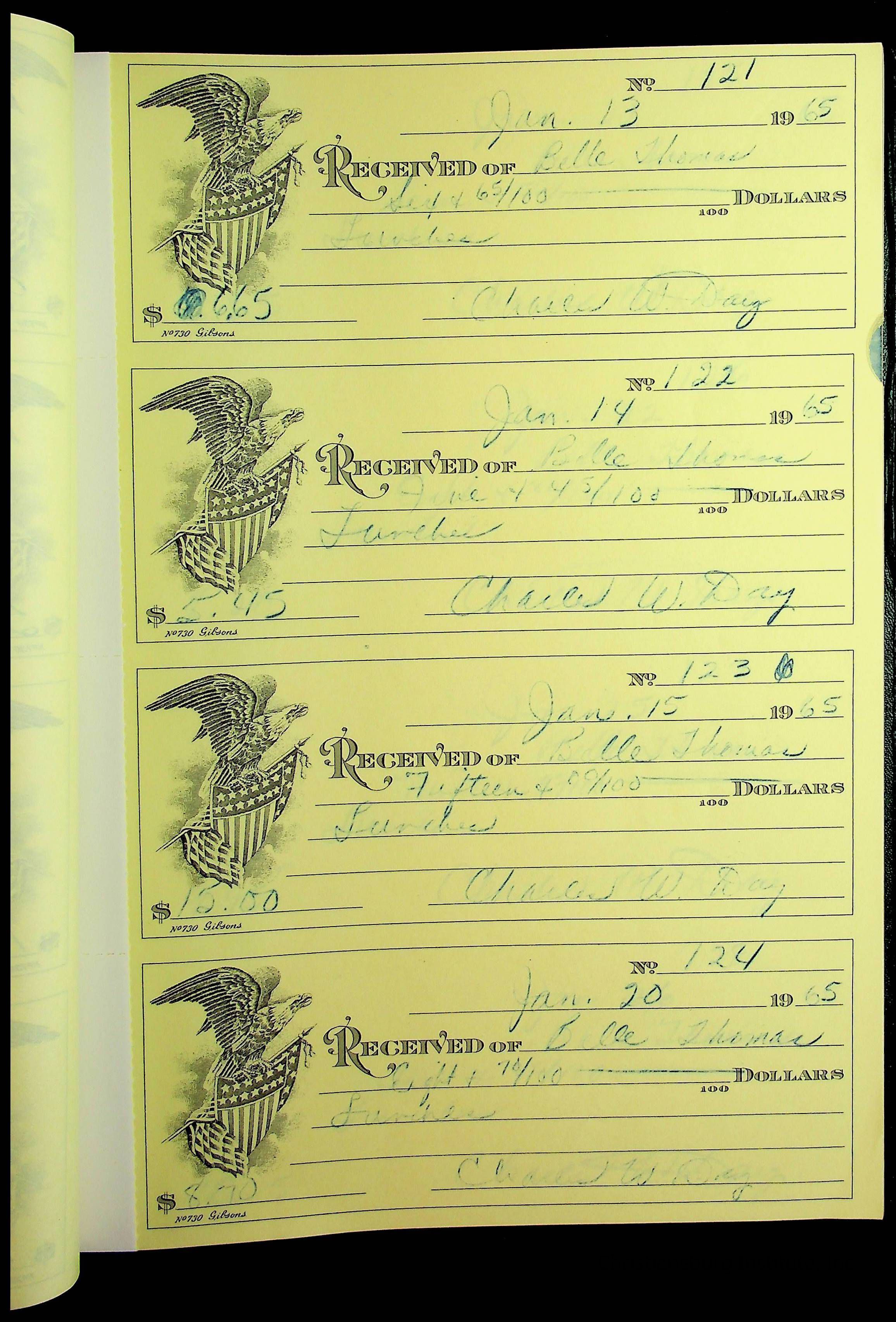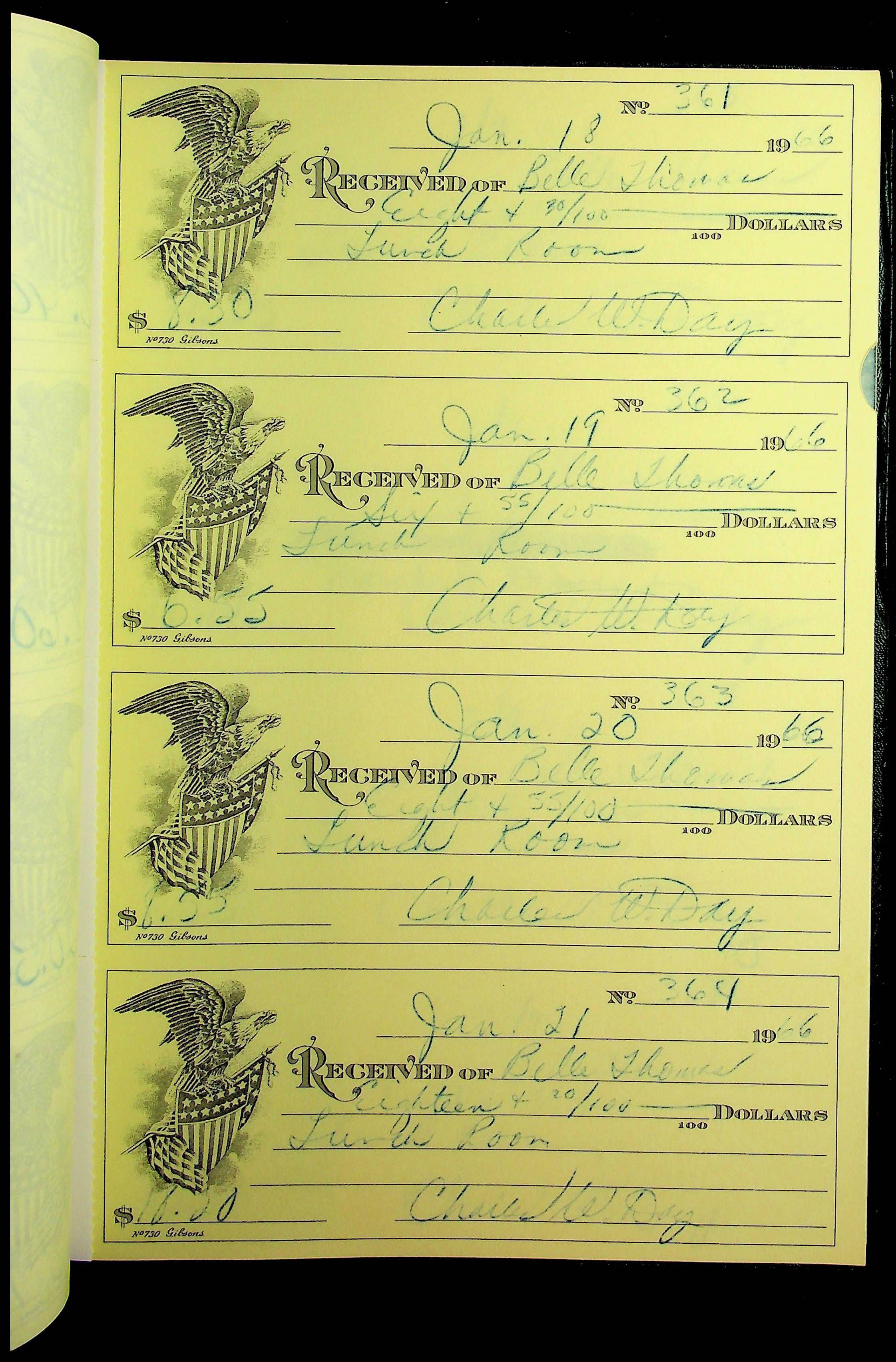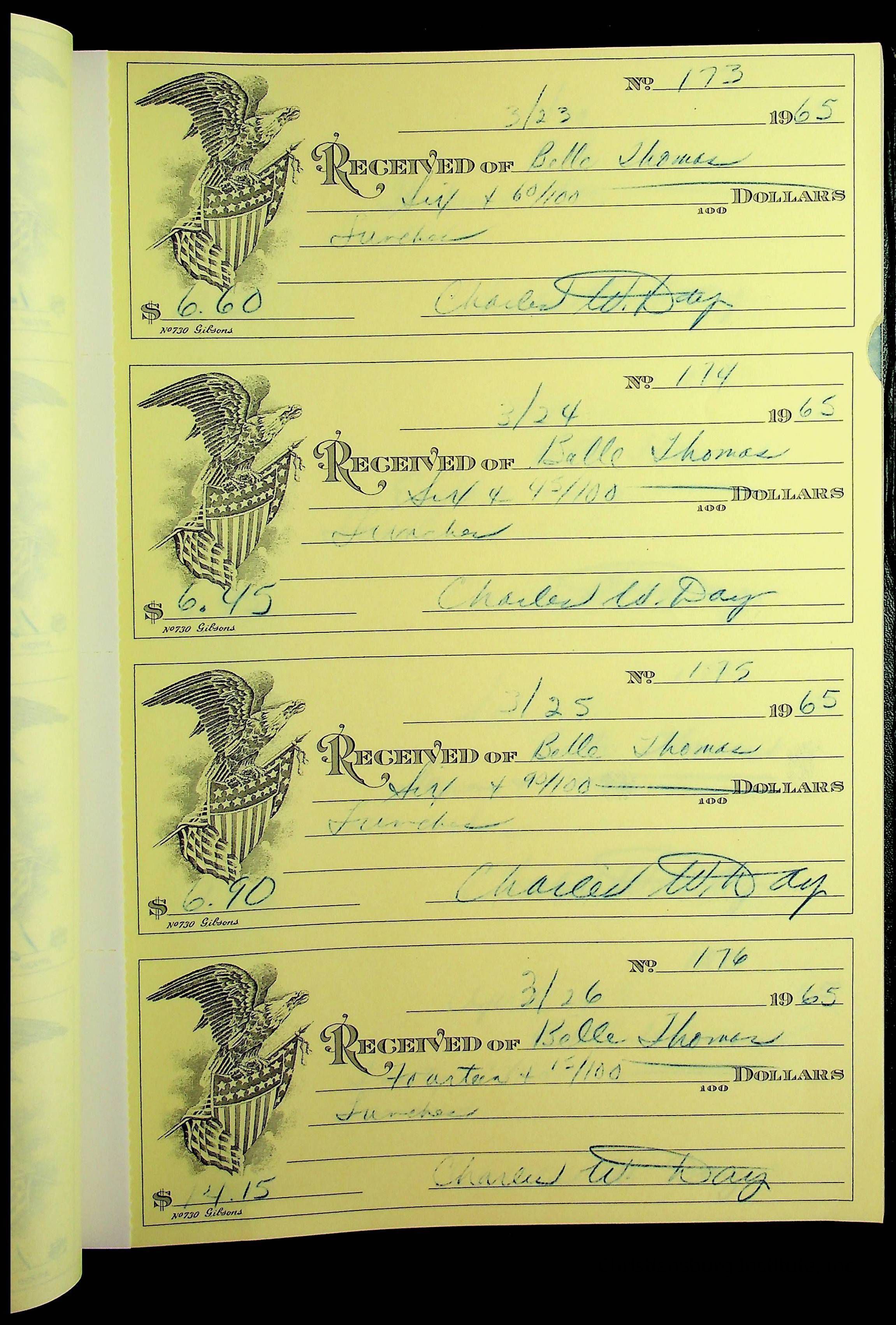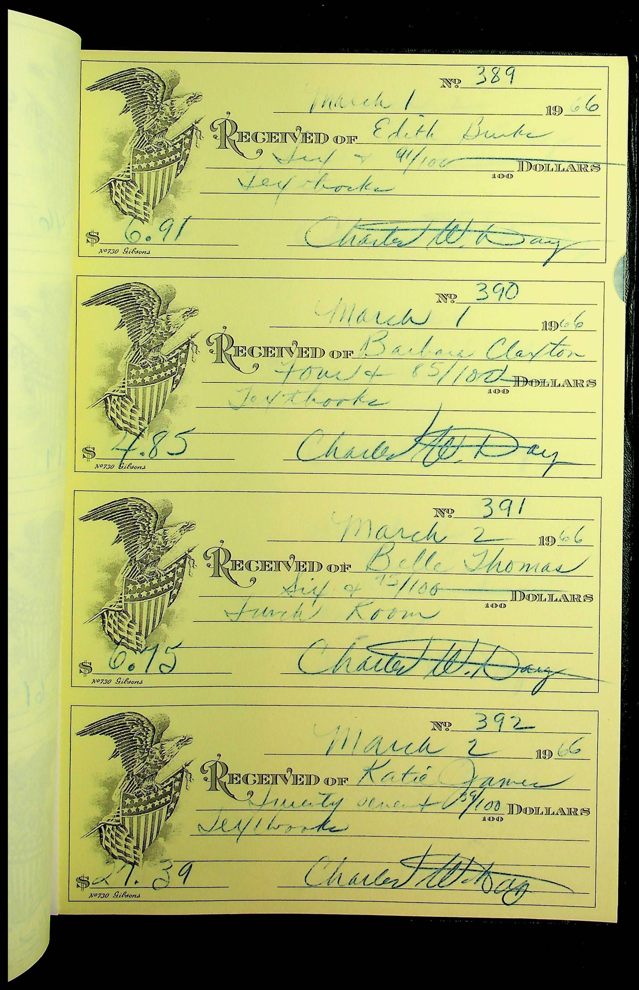 A receipt book manufactured by J.P. Bell company and used by Christiansburg Institute to document expenses and receipts from 1964 through 1966.