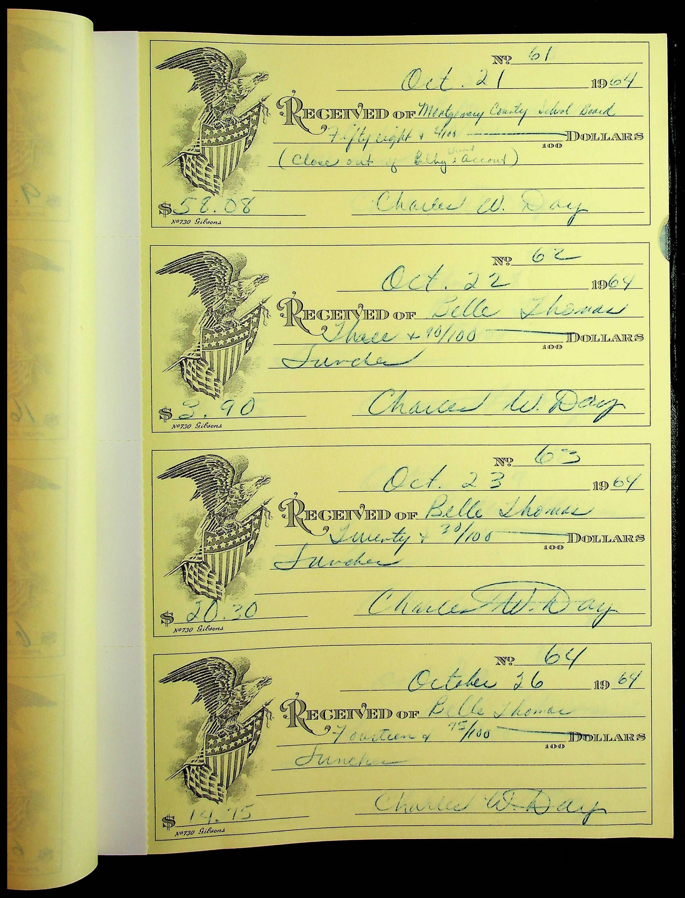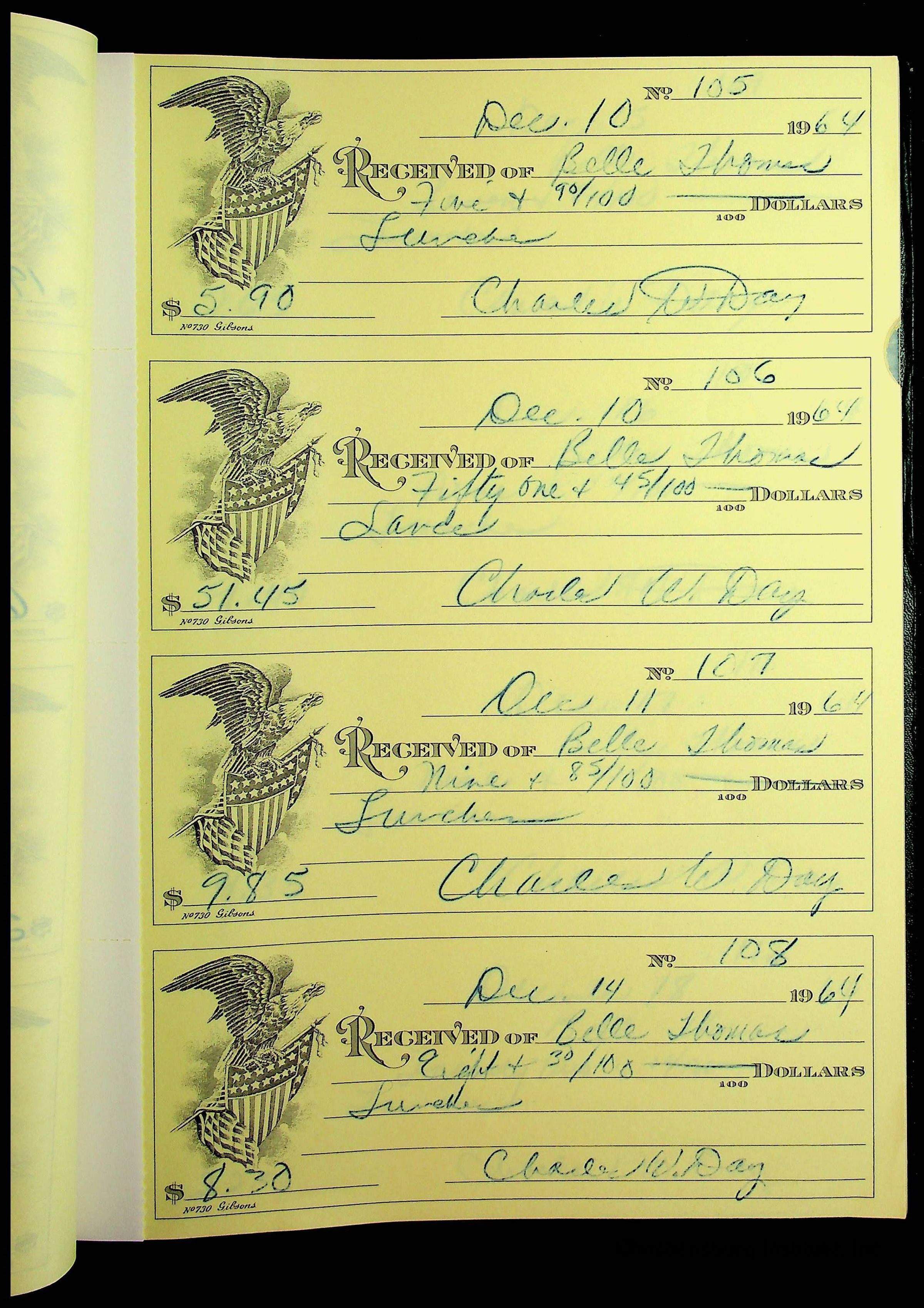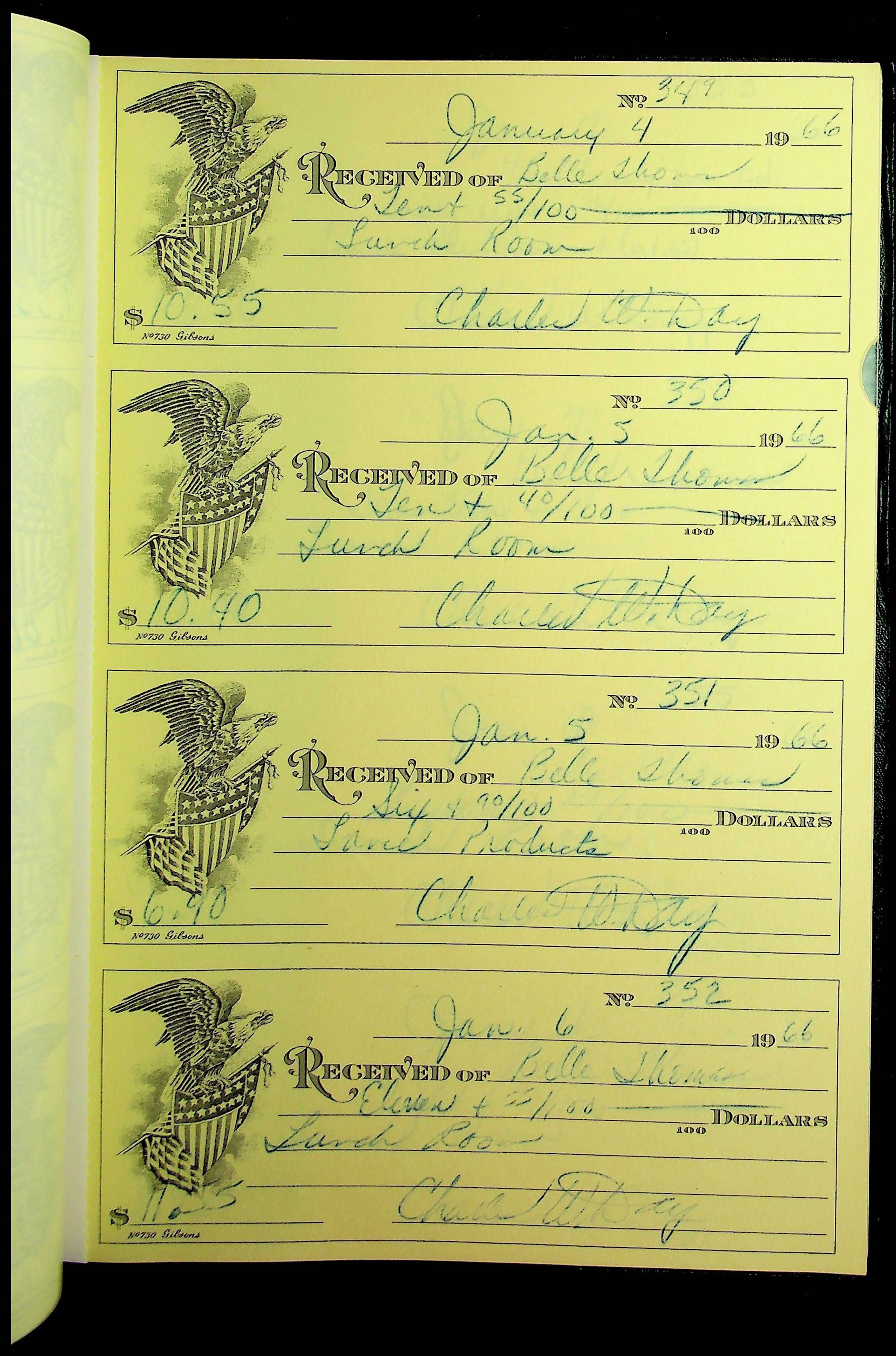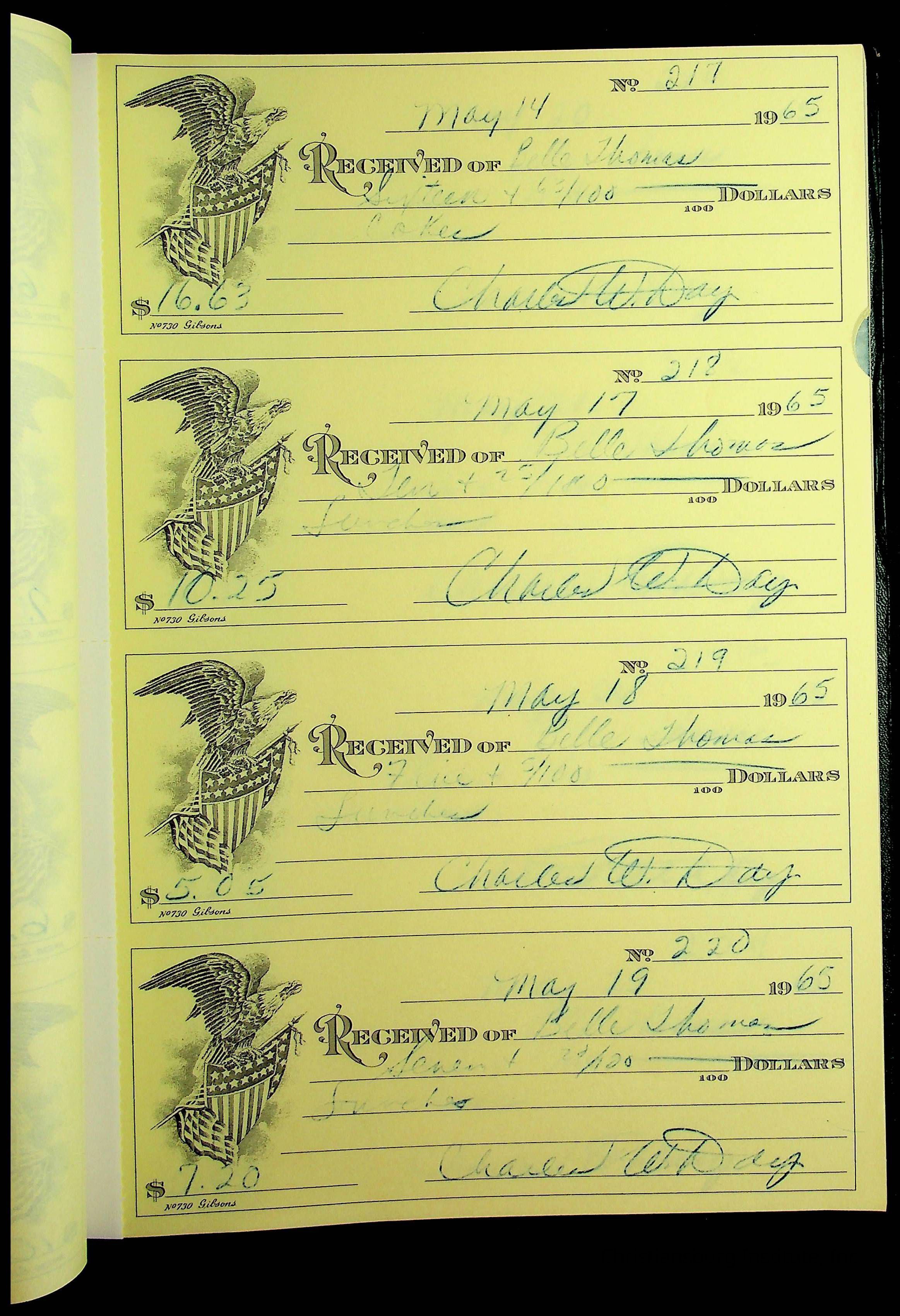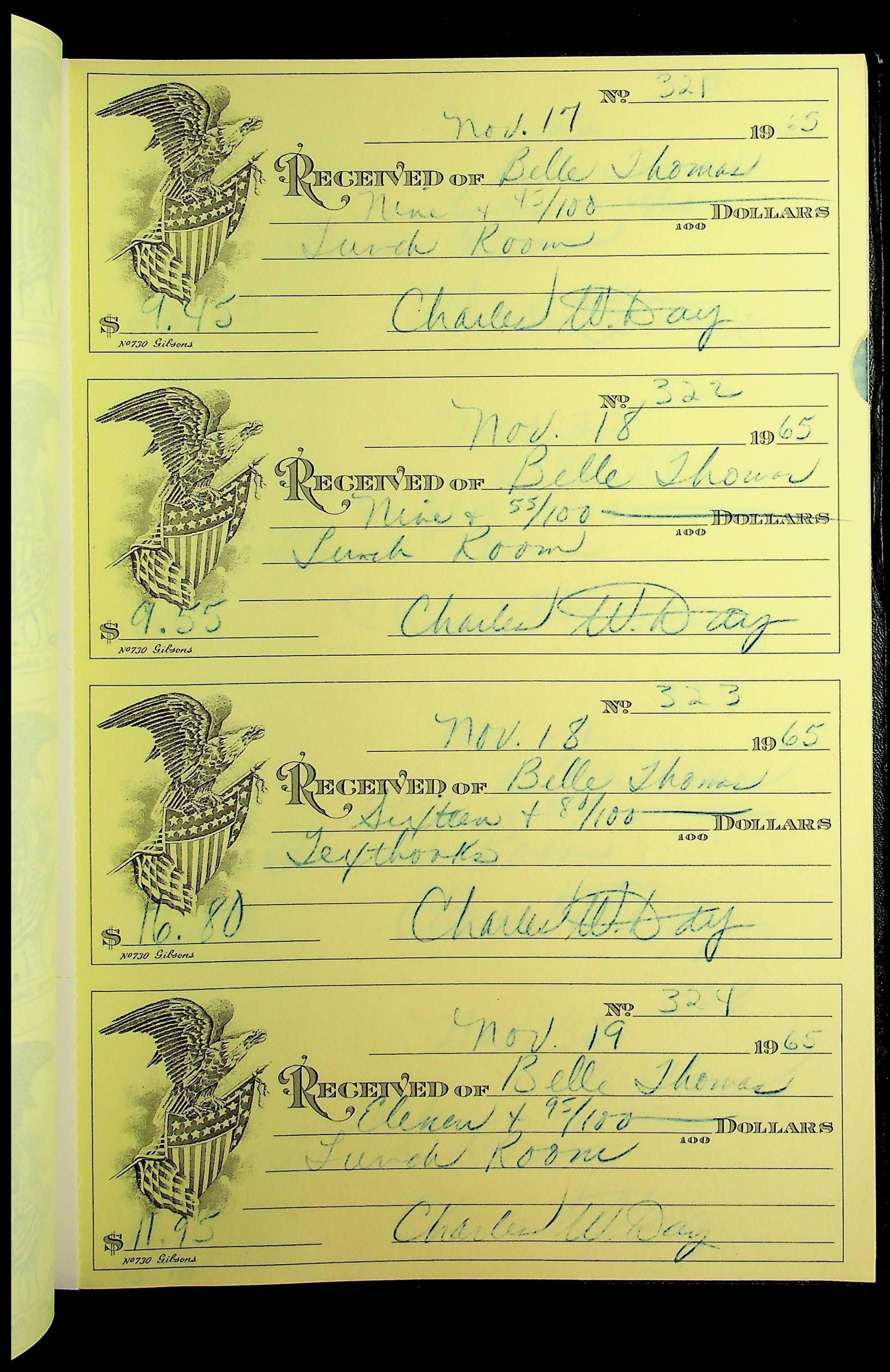 A receipt book manufactured by J.P. Bell company and used by Christiansburg Institute to document expenses and receipts from 1964 through 1966.