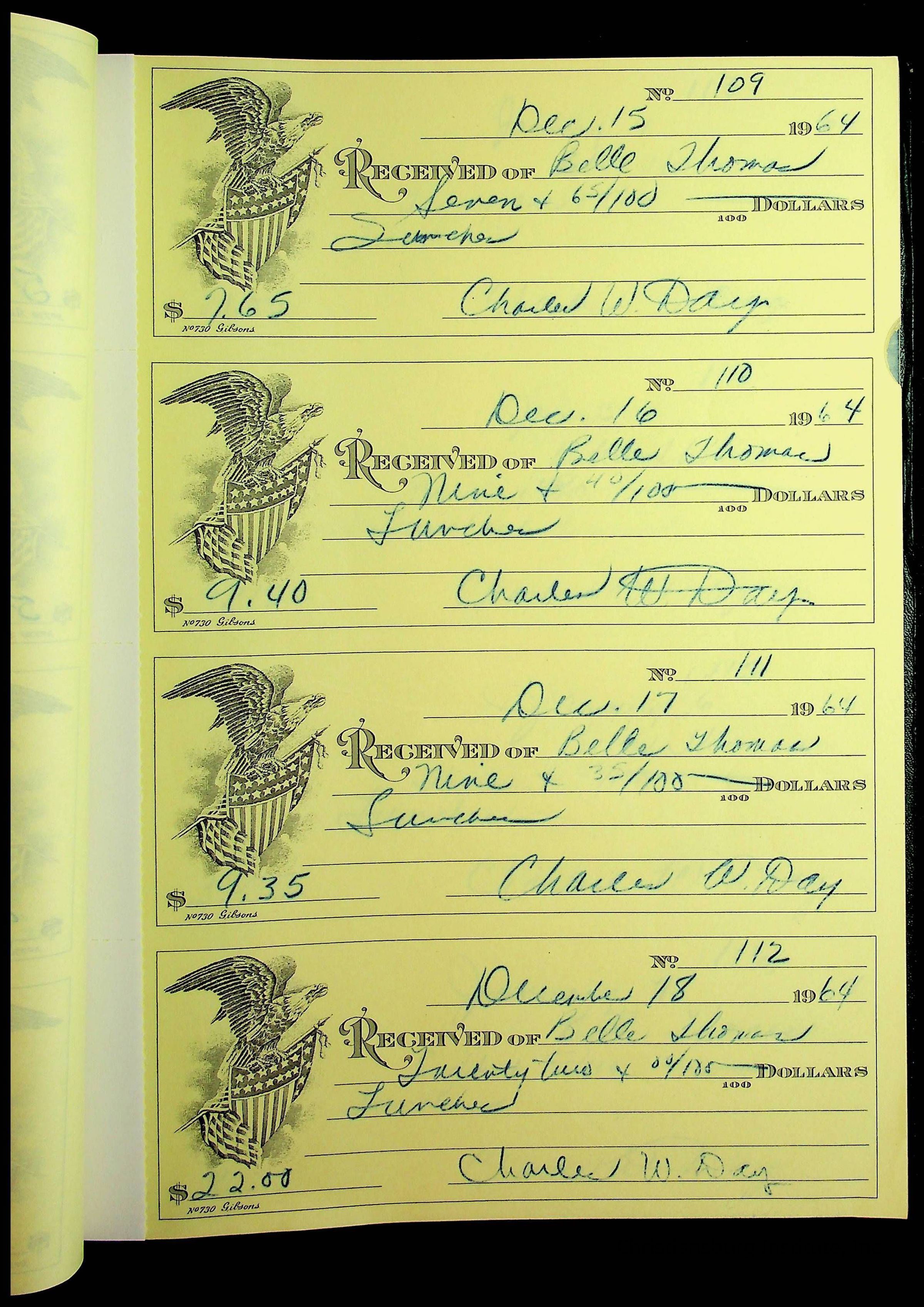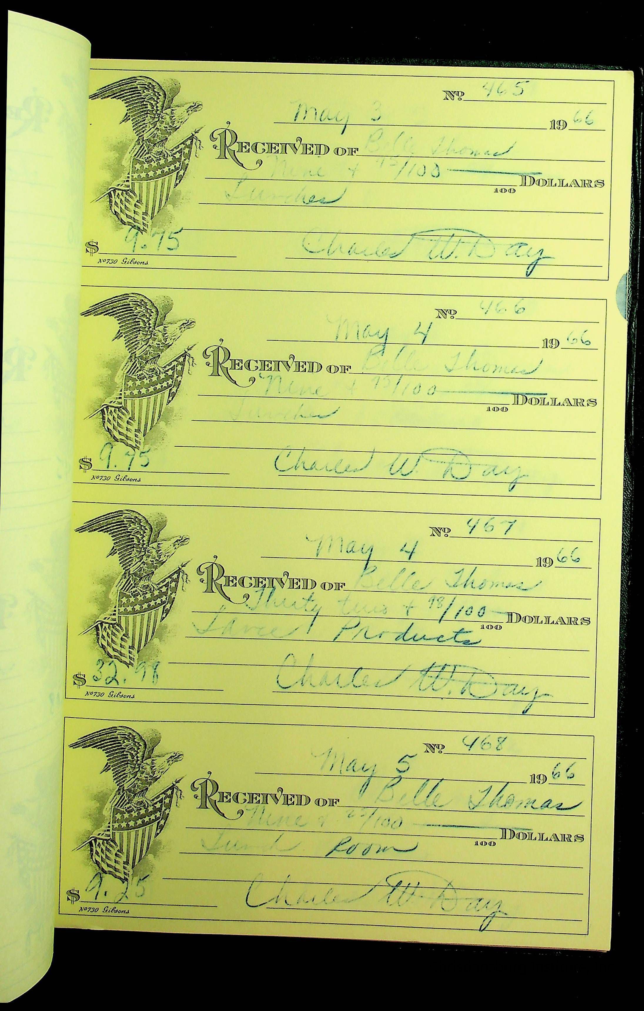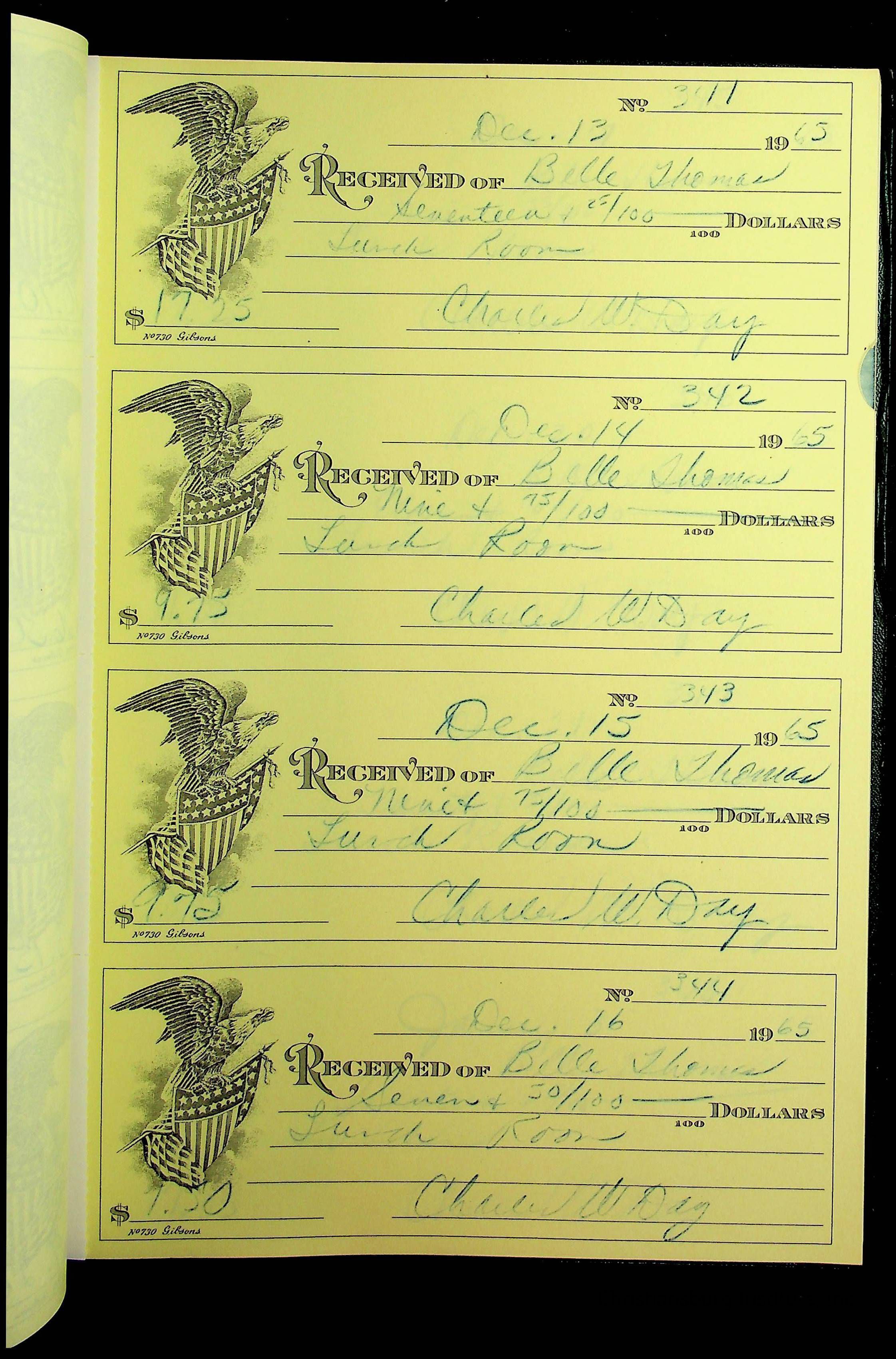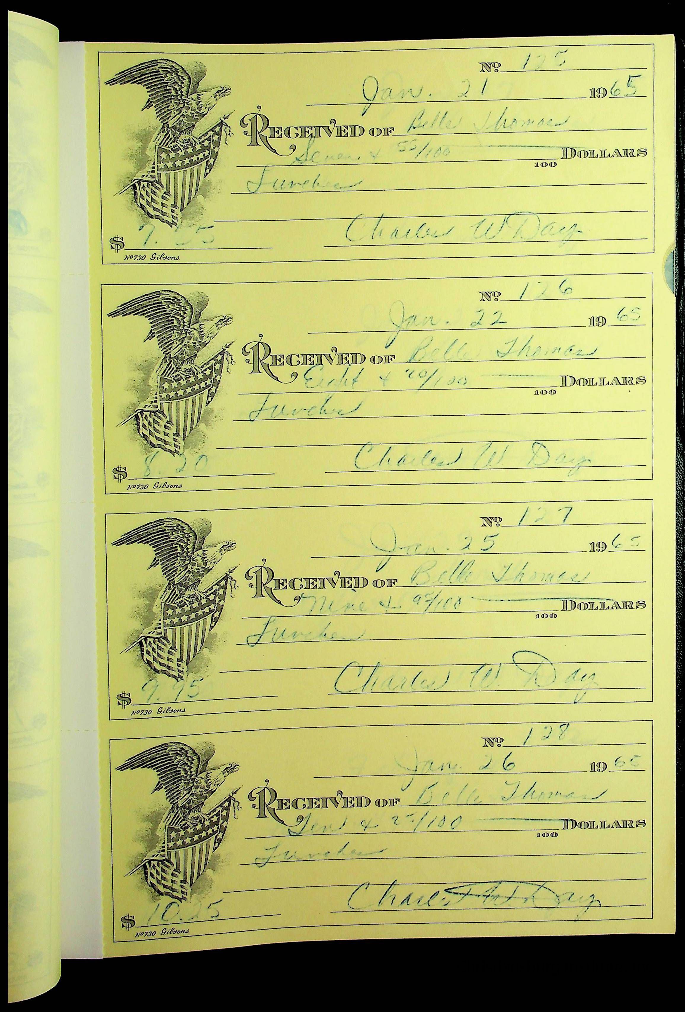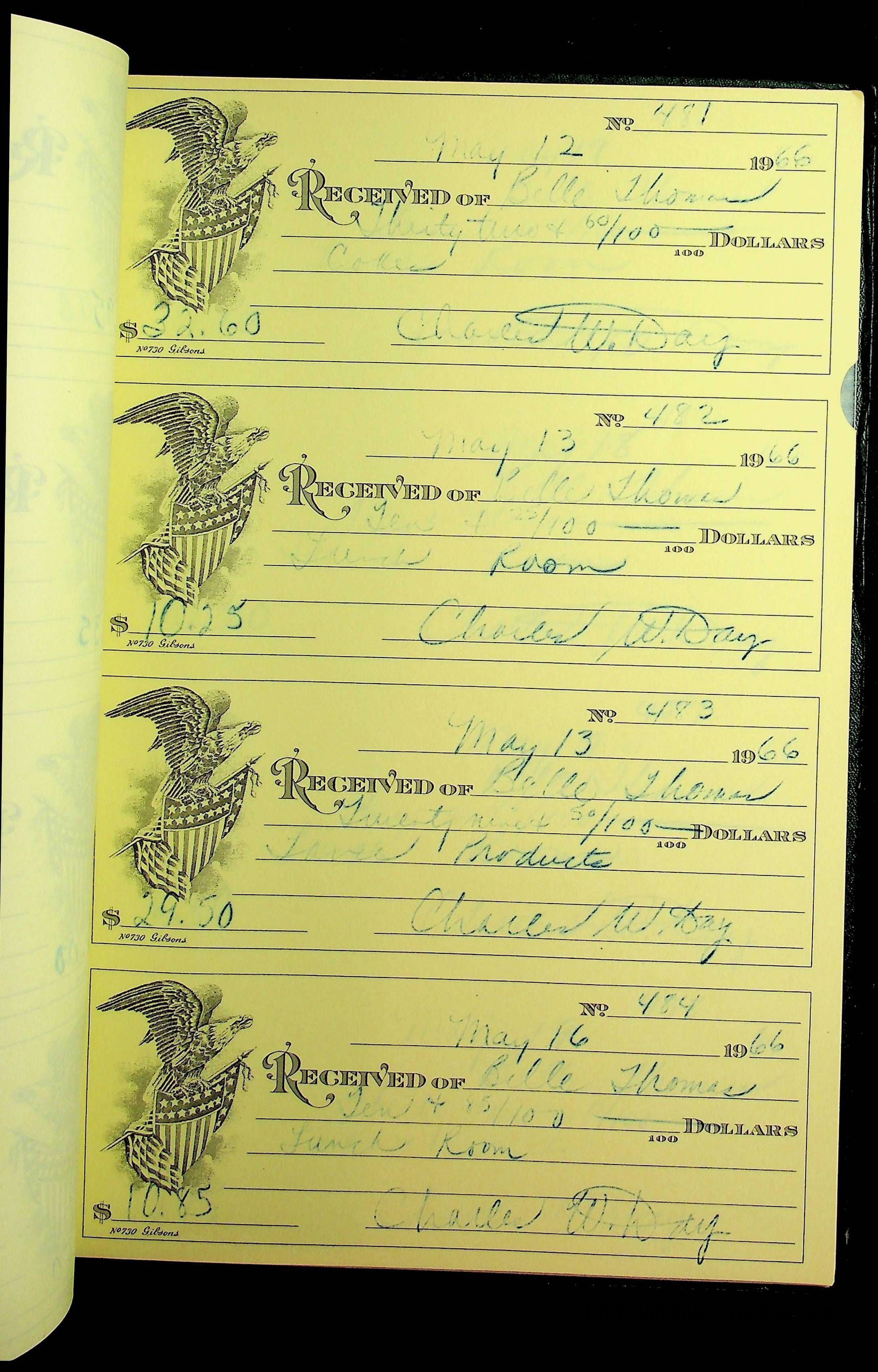 A receipt book manufactured by J.P. Bell company and used by Christiansburg Institute to document expenses and receipts from 1964 through 1966.
