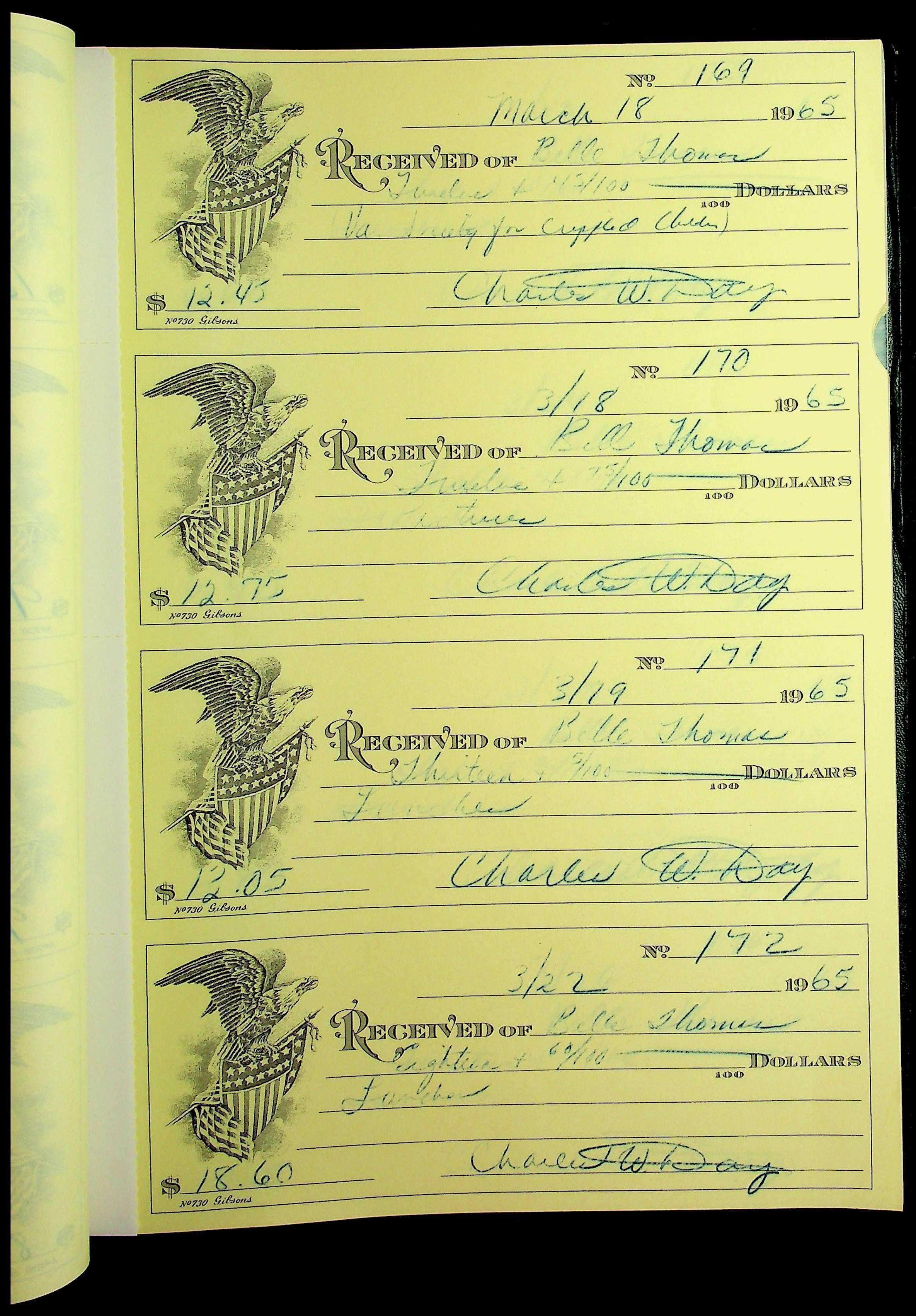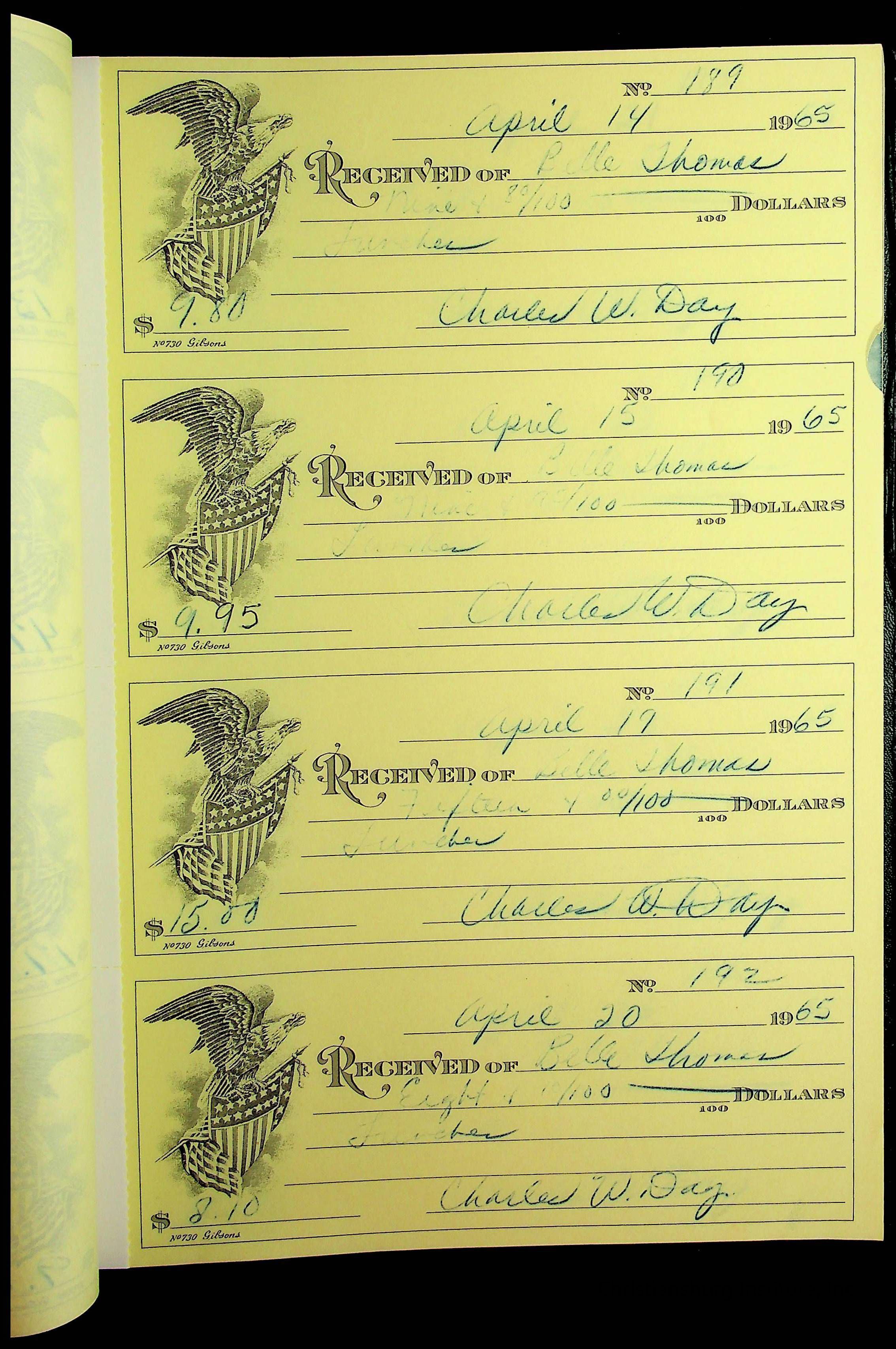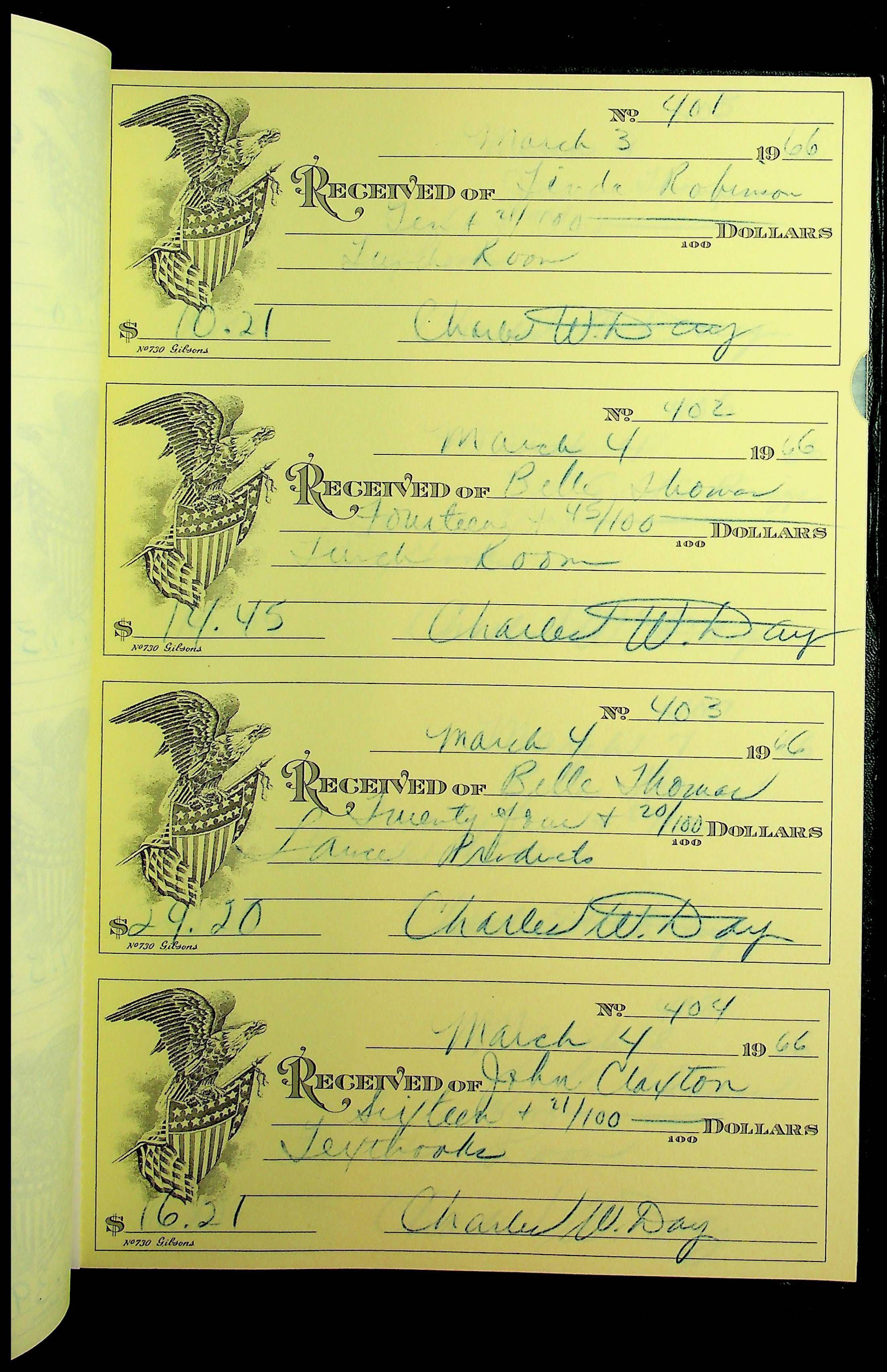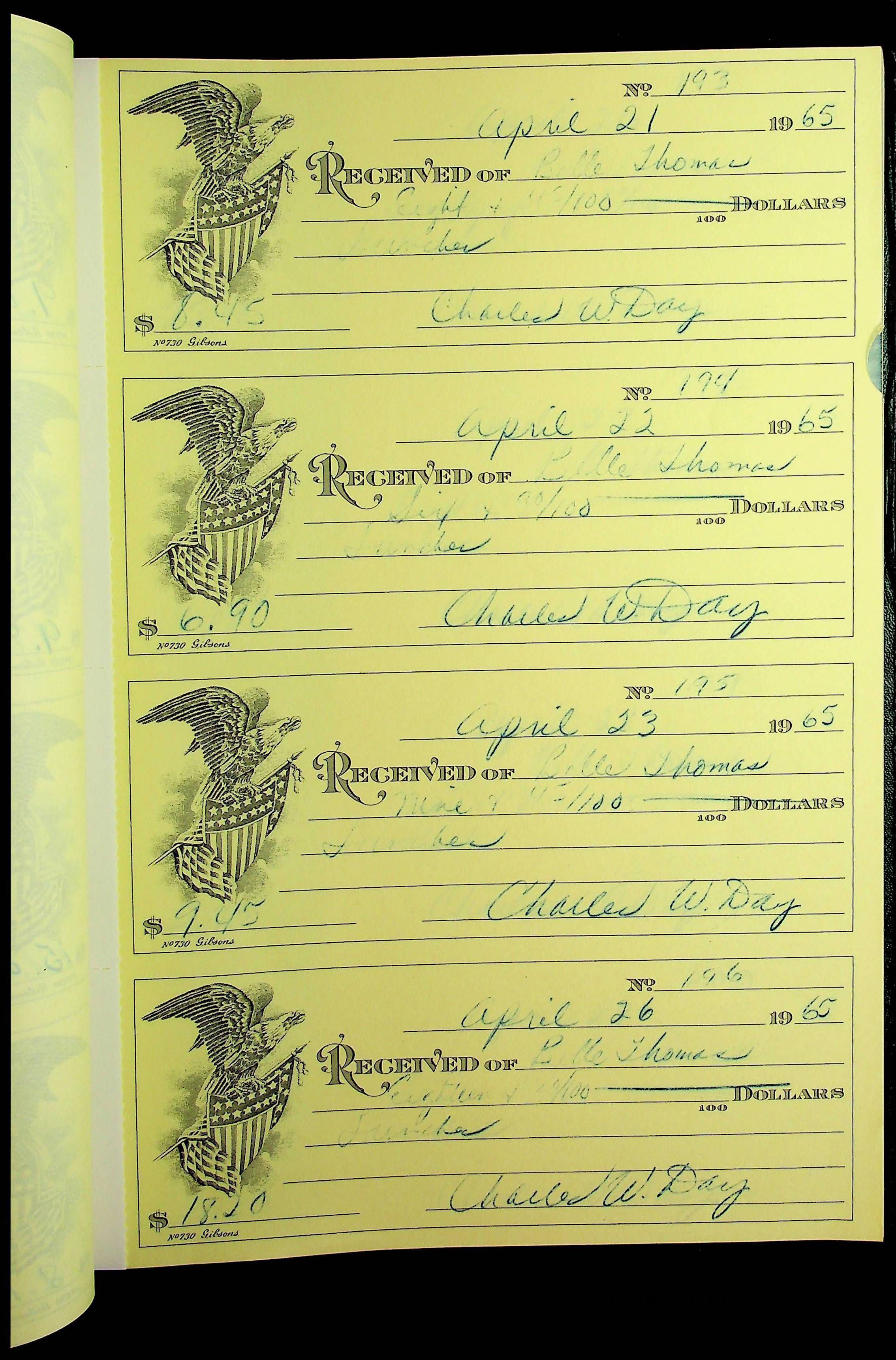 A receipt book manufactured by J.P. Bell company and used by Christiansburg Institute to document expenses and receipts from 1964 through 1966.