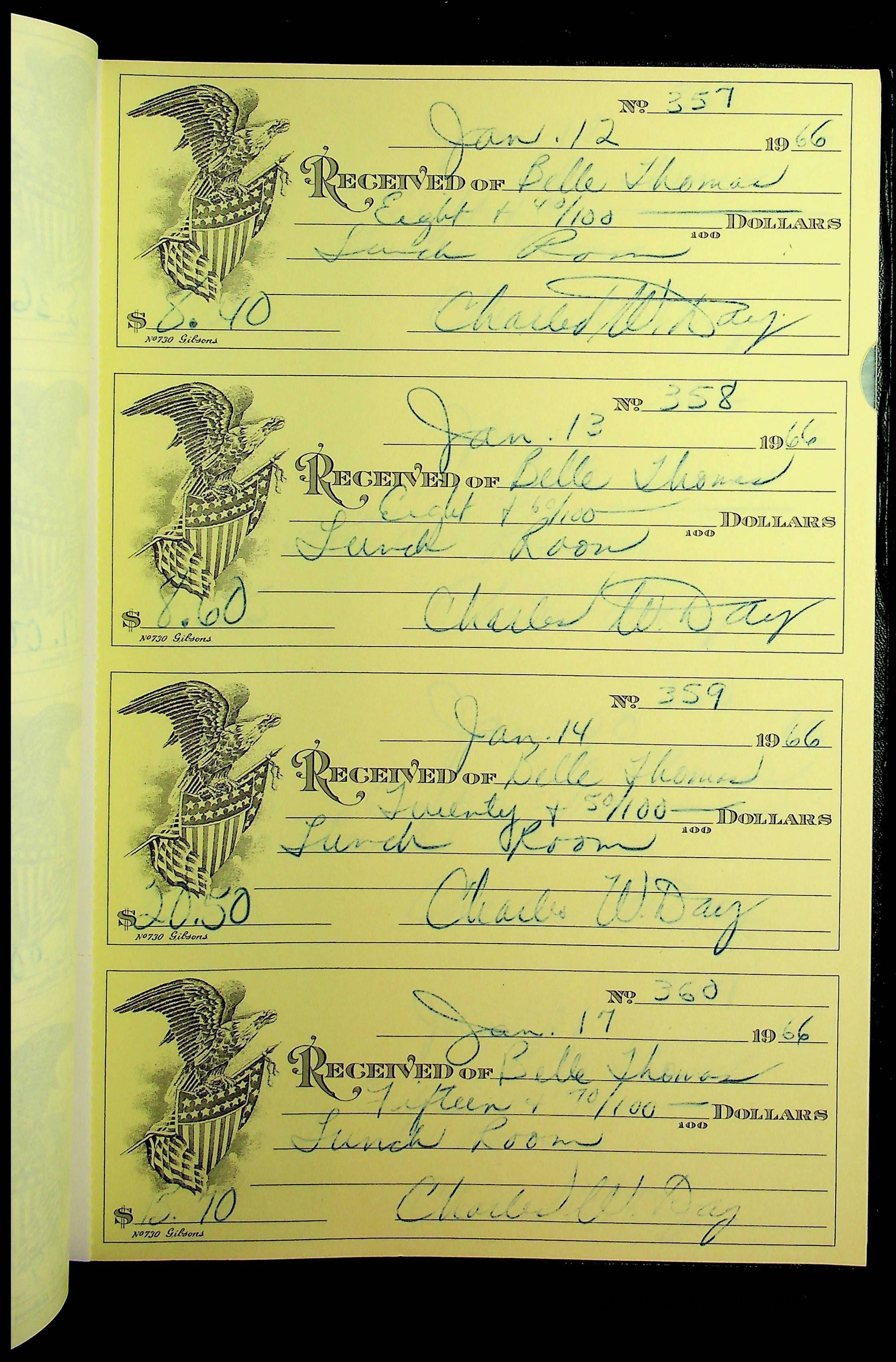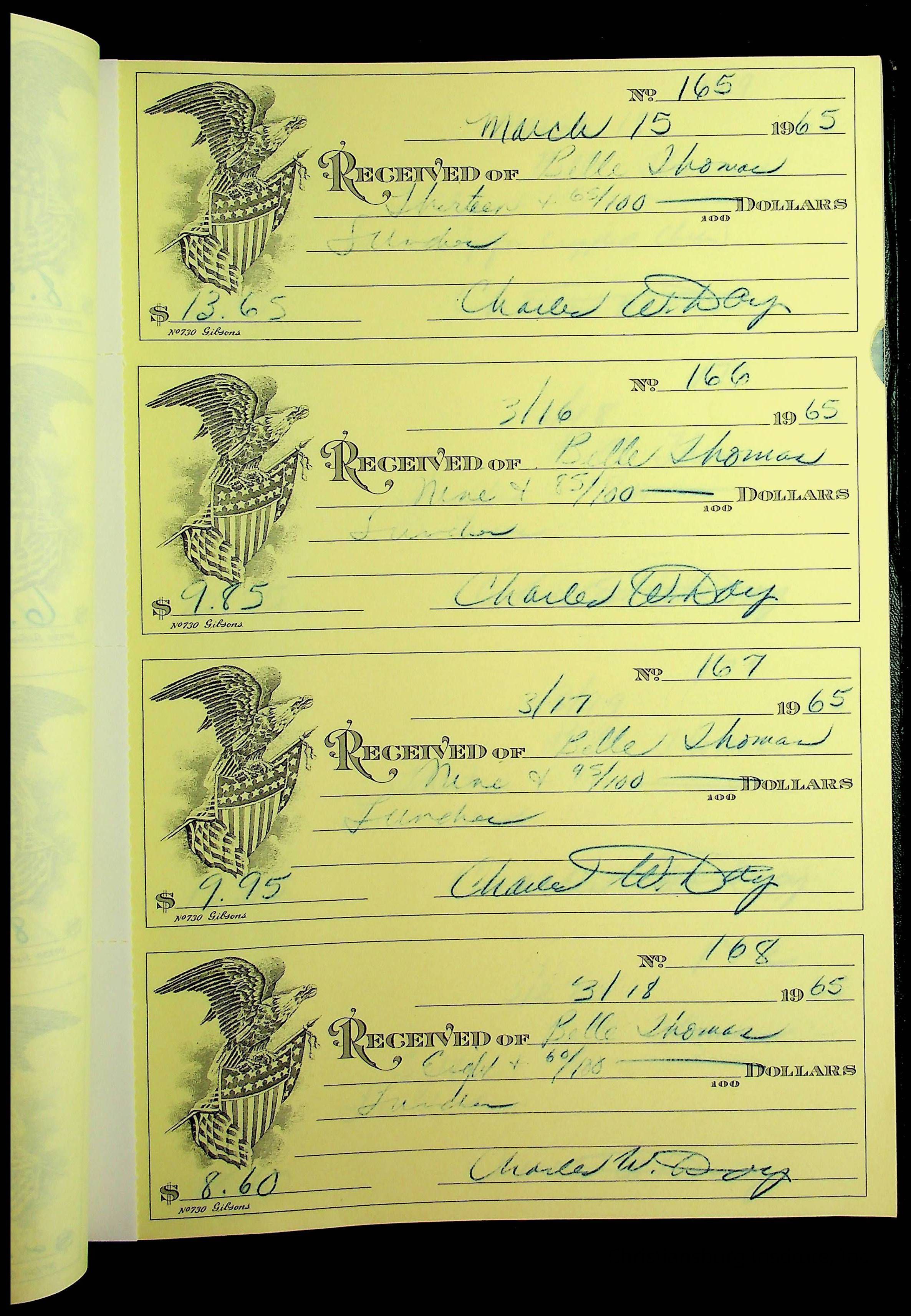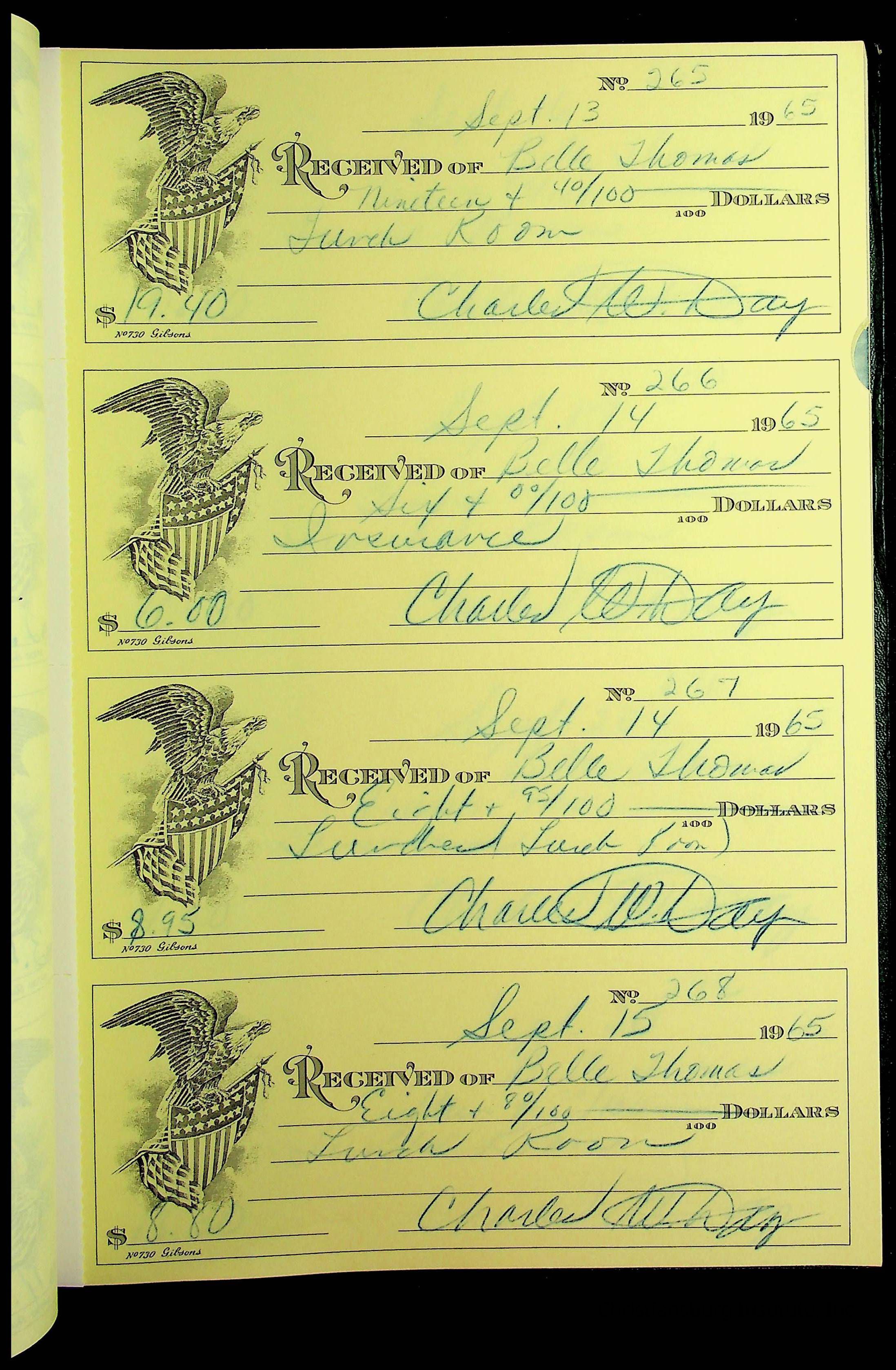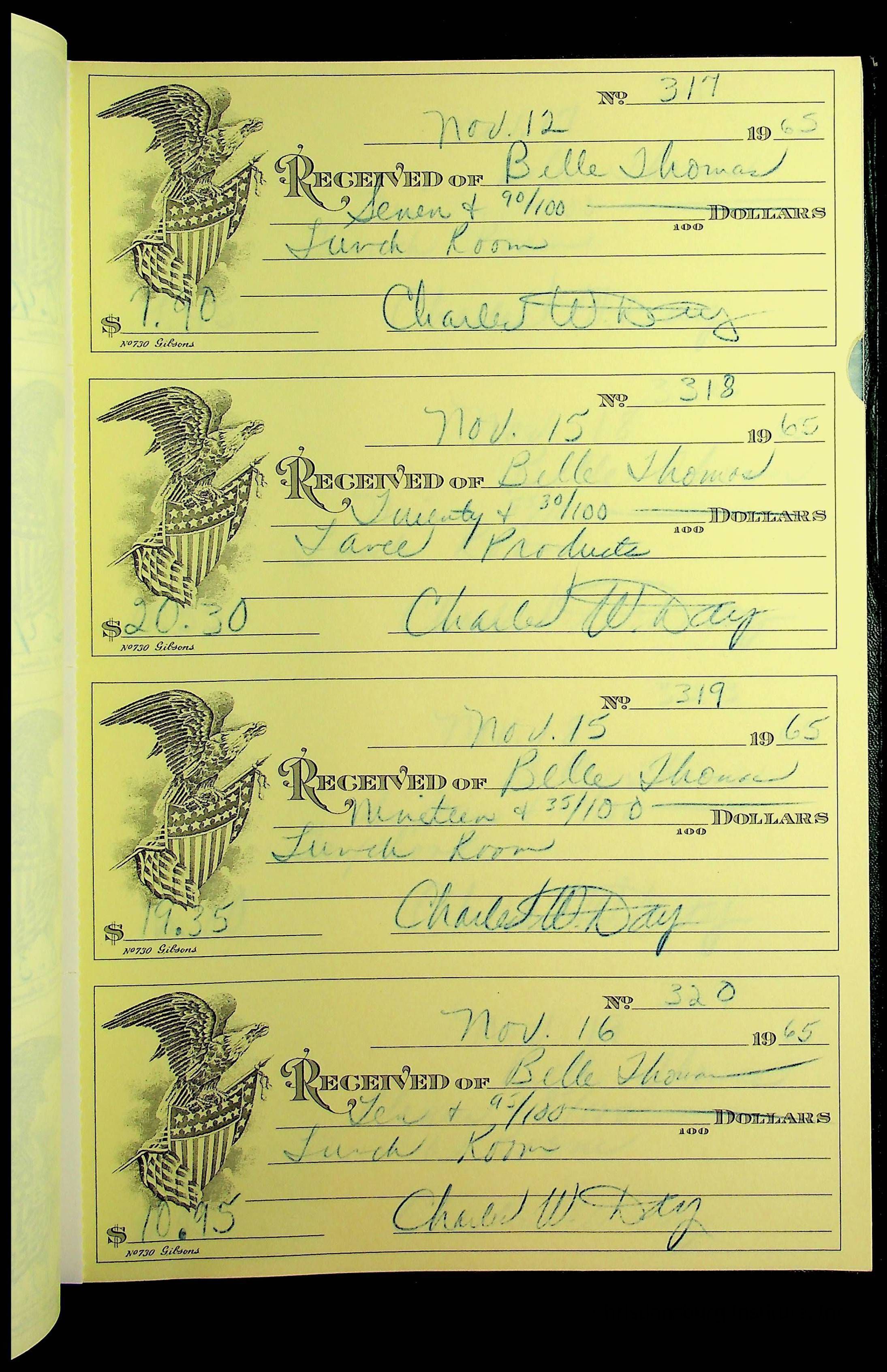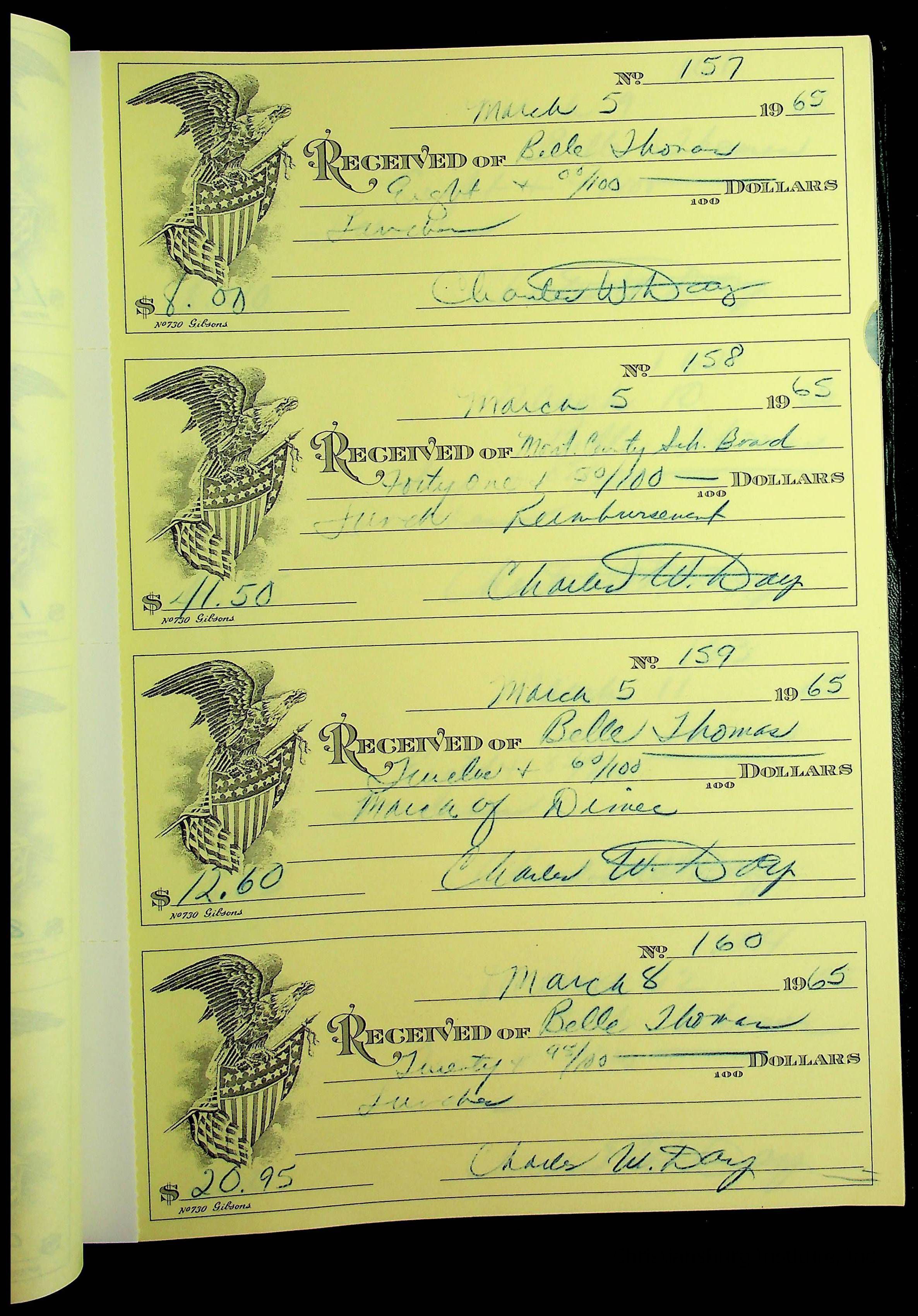 A receipt book manufactured by J.P. Bell company and used by Christiansburg Institute to document expenses and receipts from 1964 through 1966.