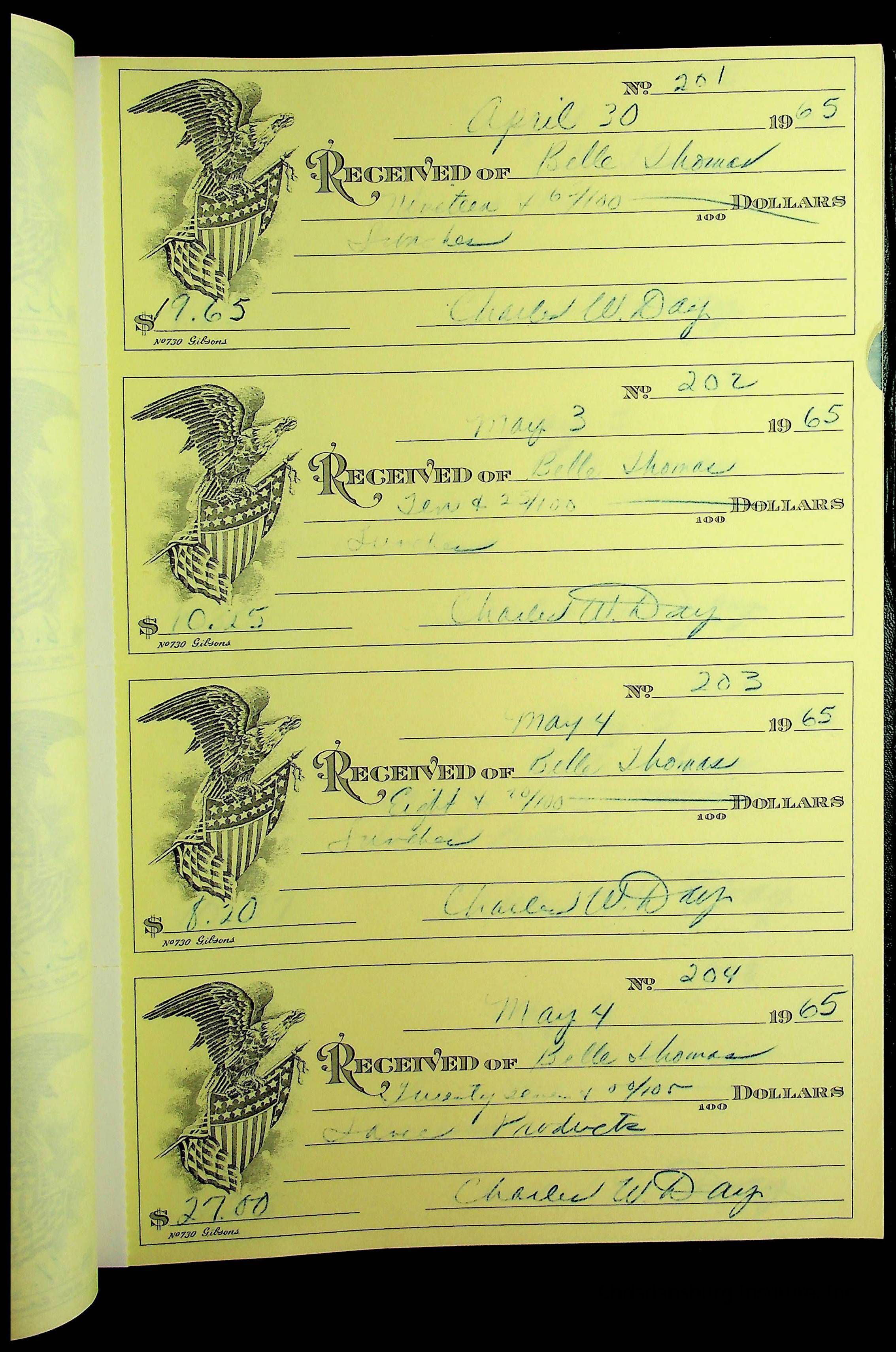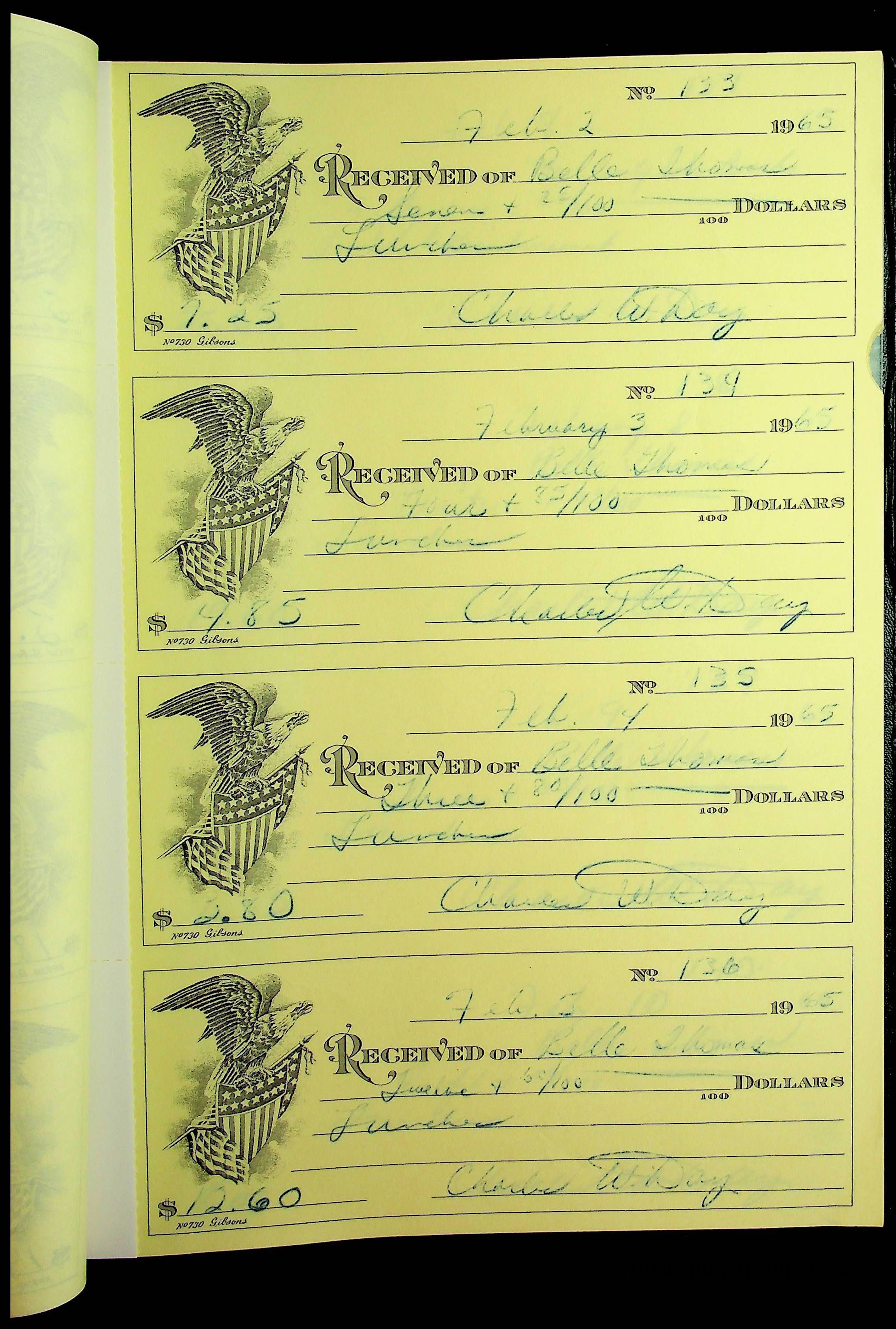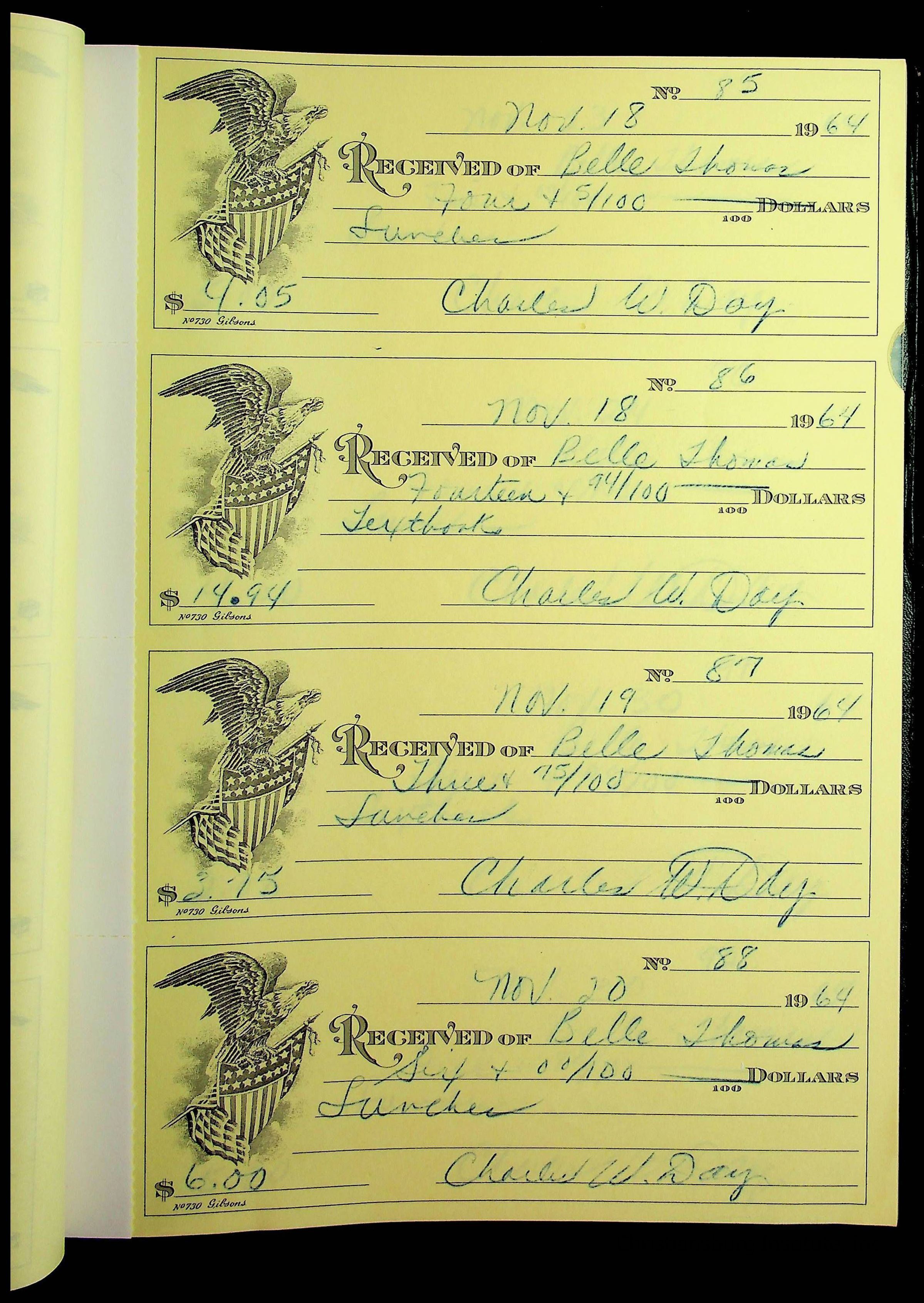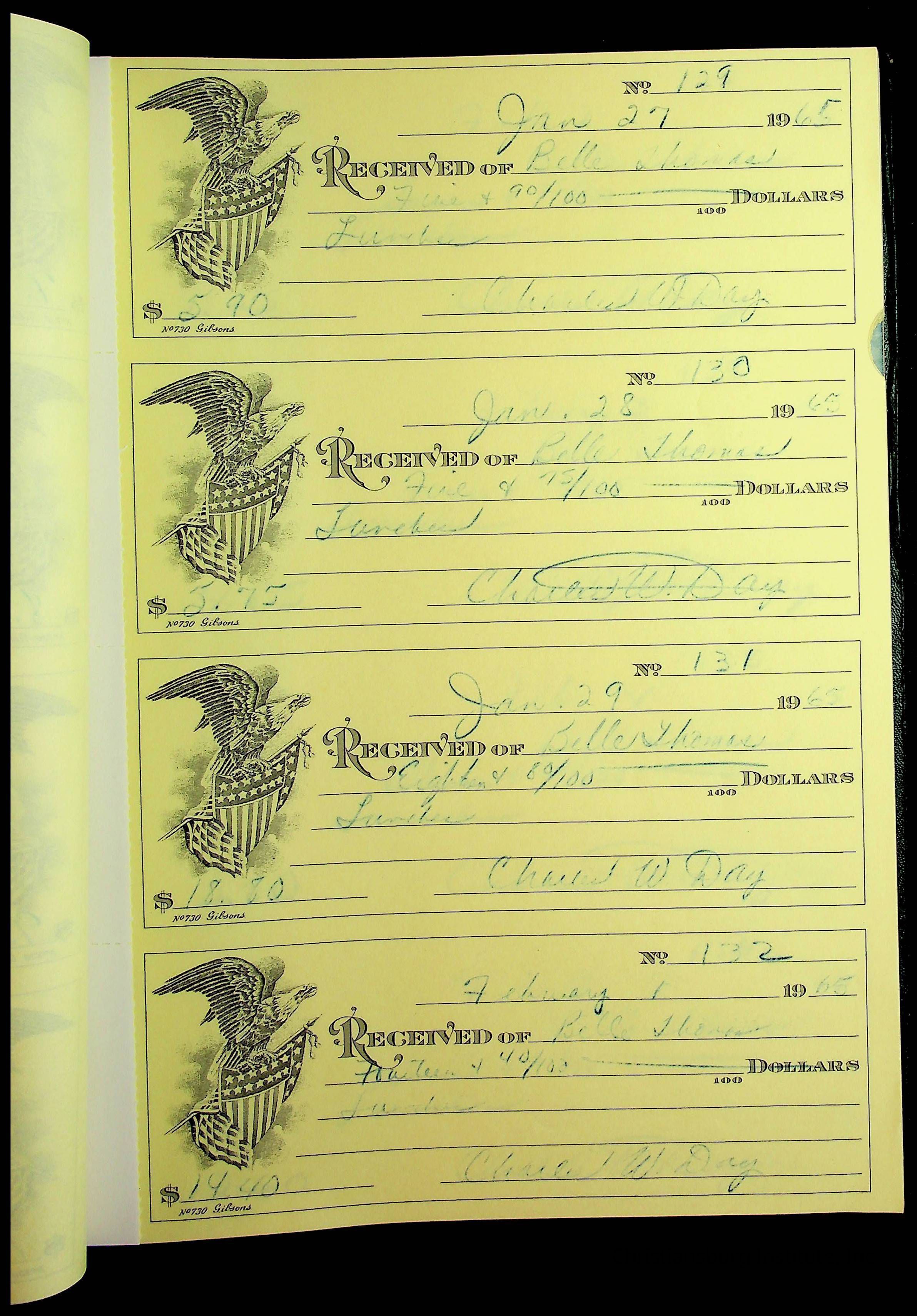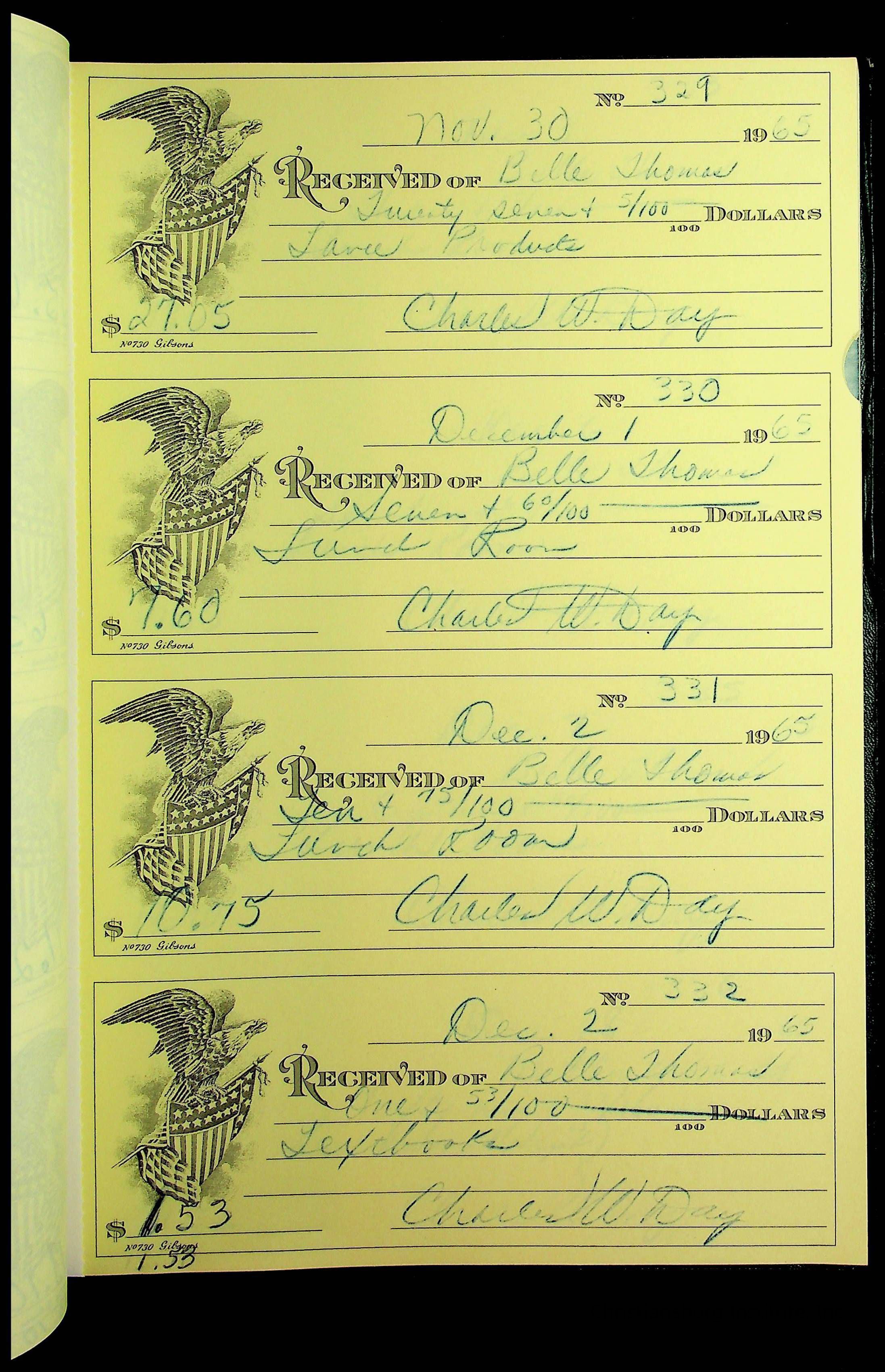 A receipt book manufactured by J.P. Bell company and used by Christiansburg Institute to document expenses and receipts from 1964 through 1966.