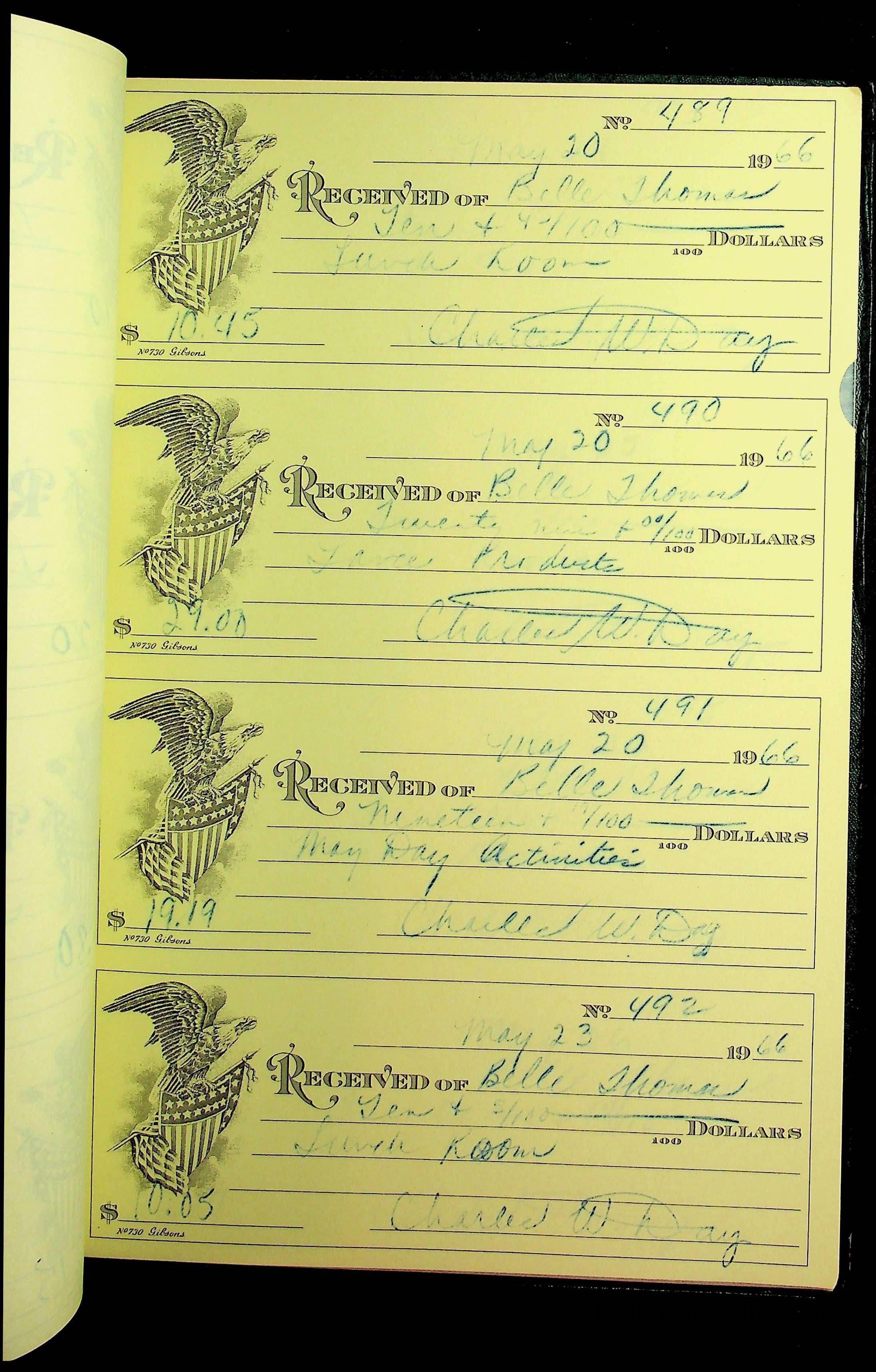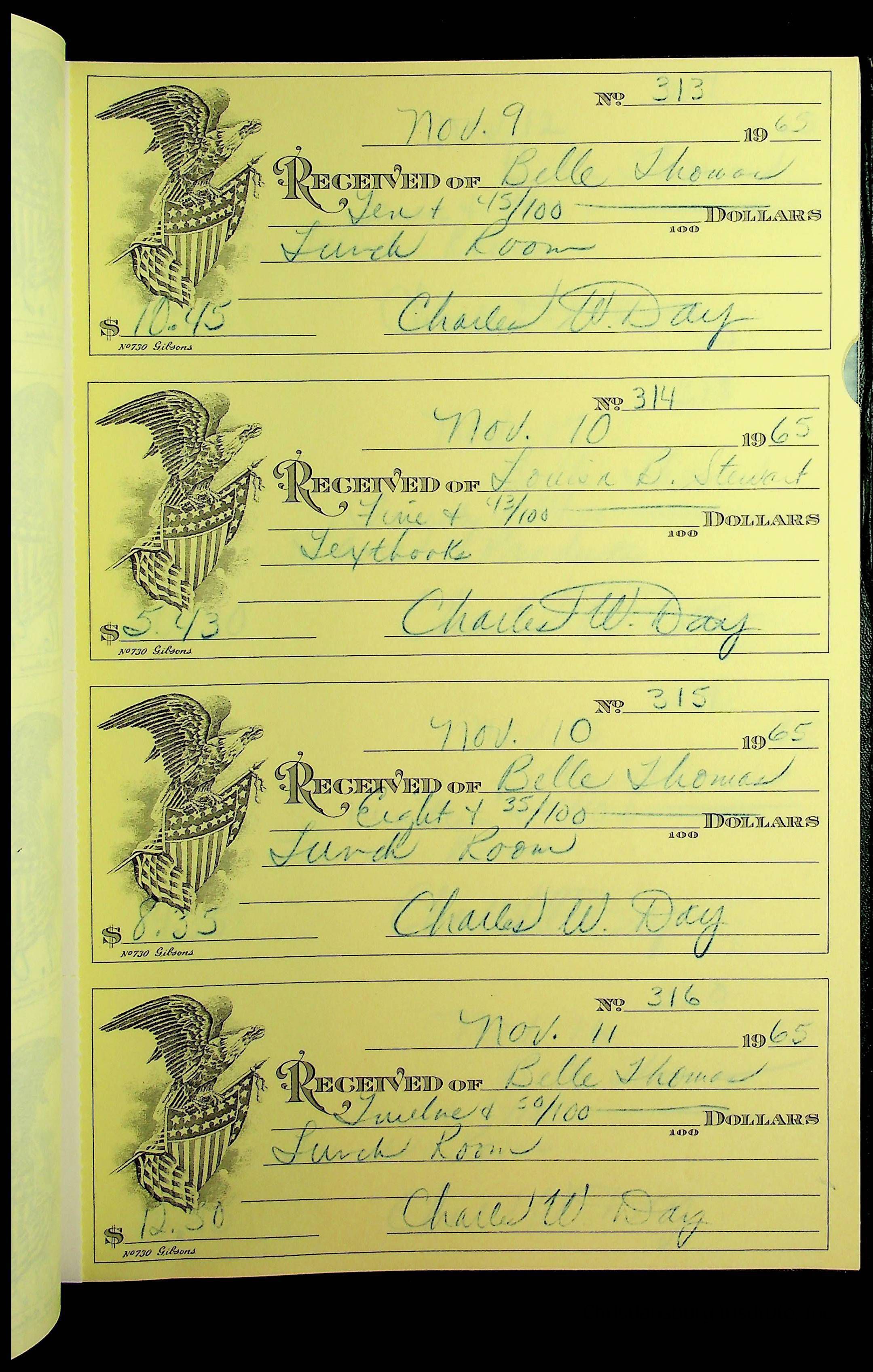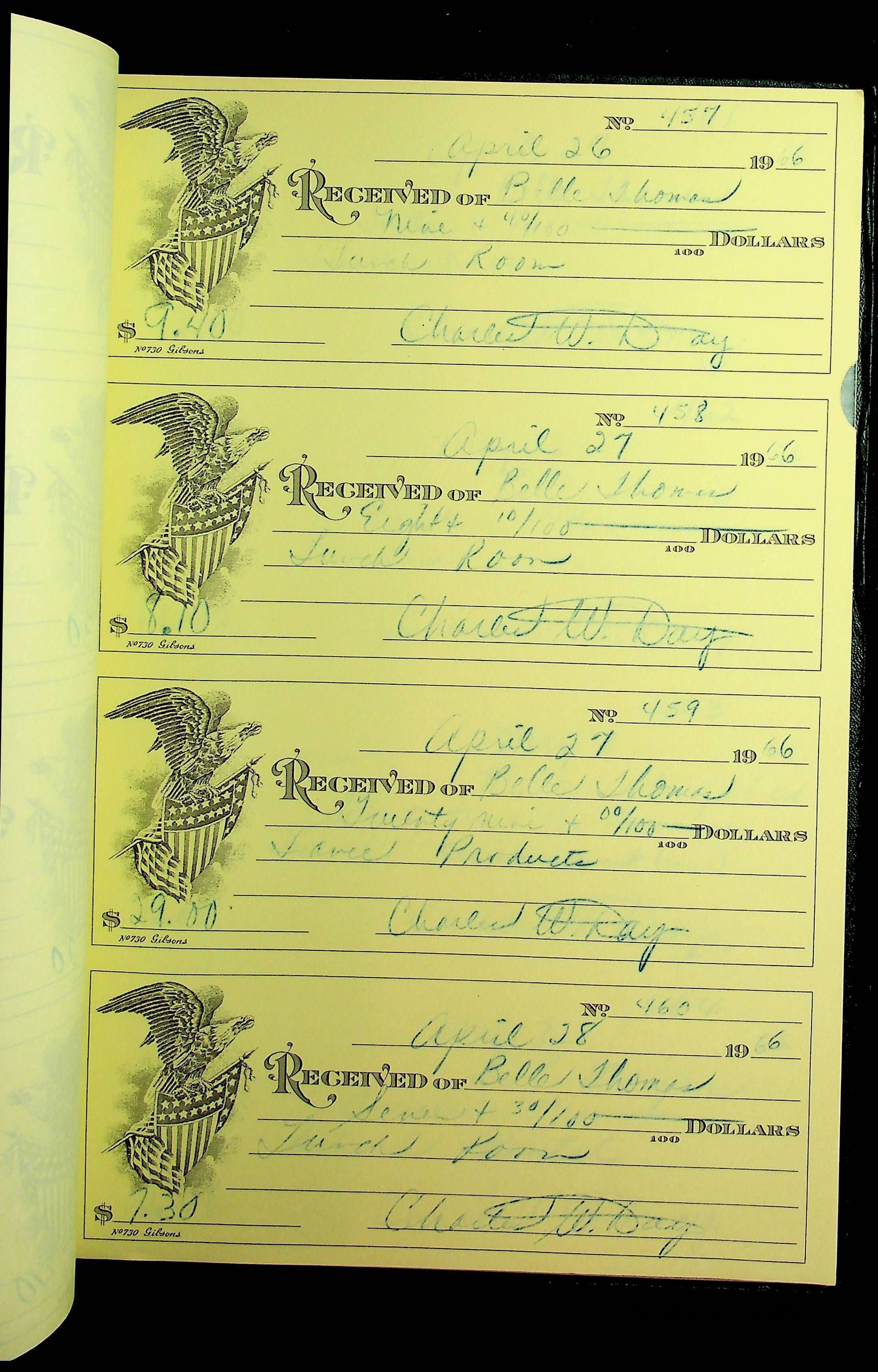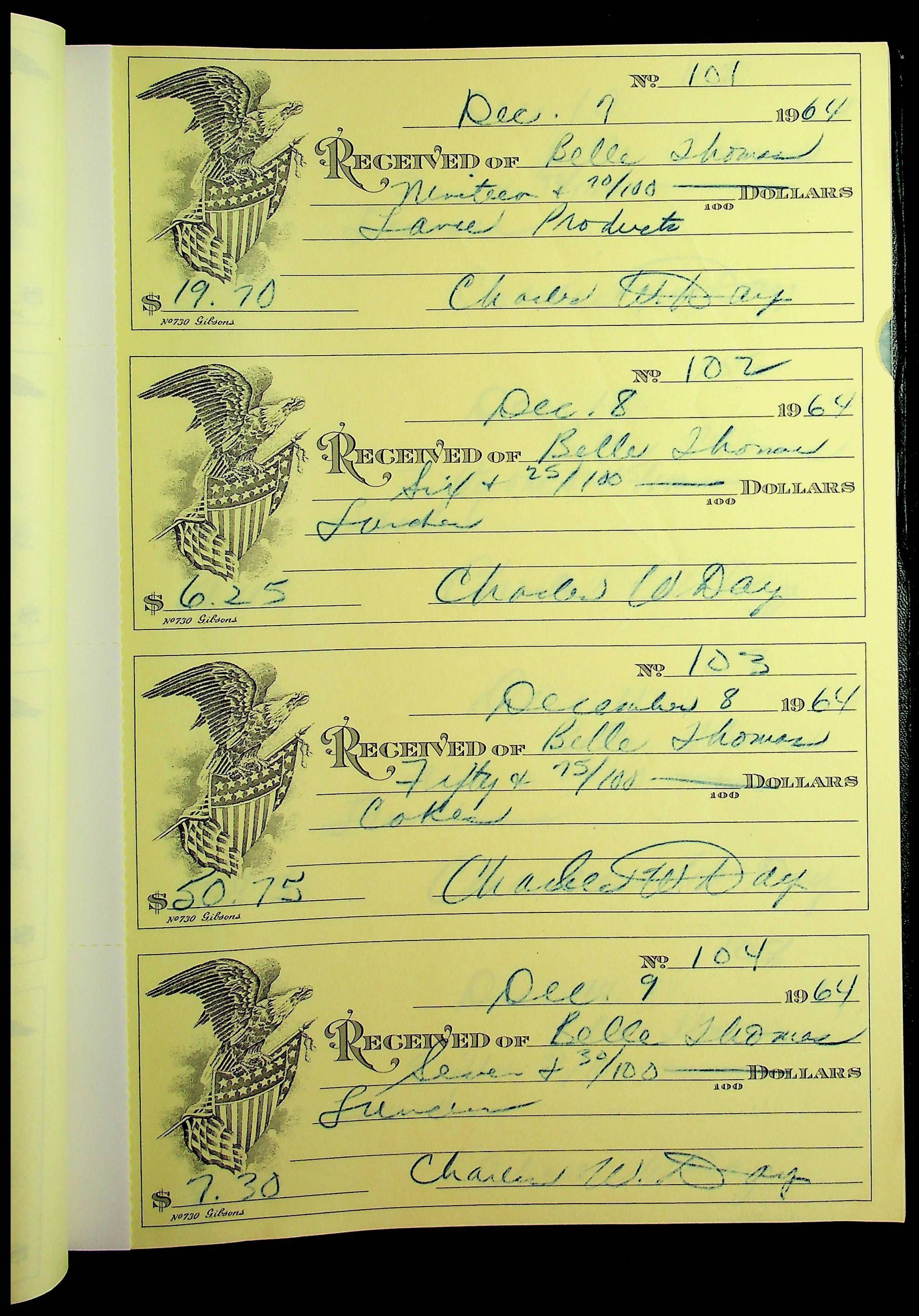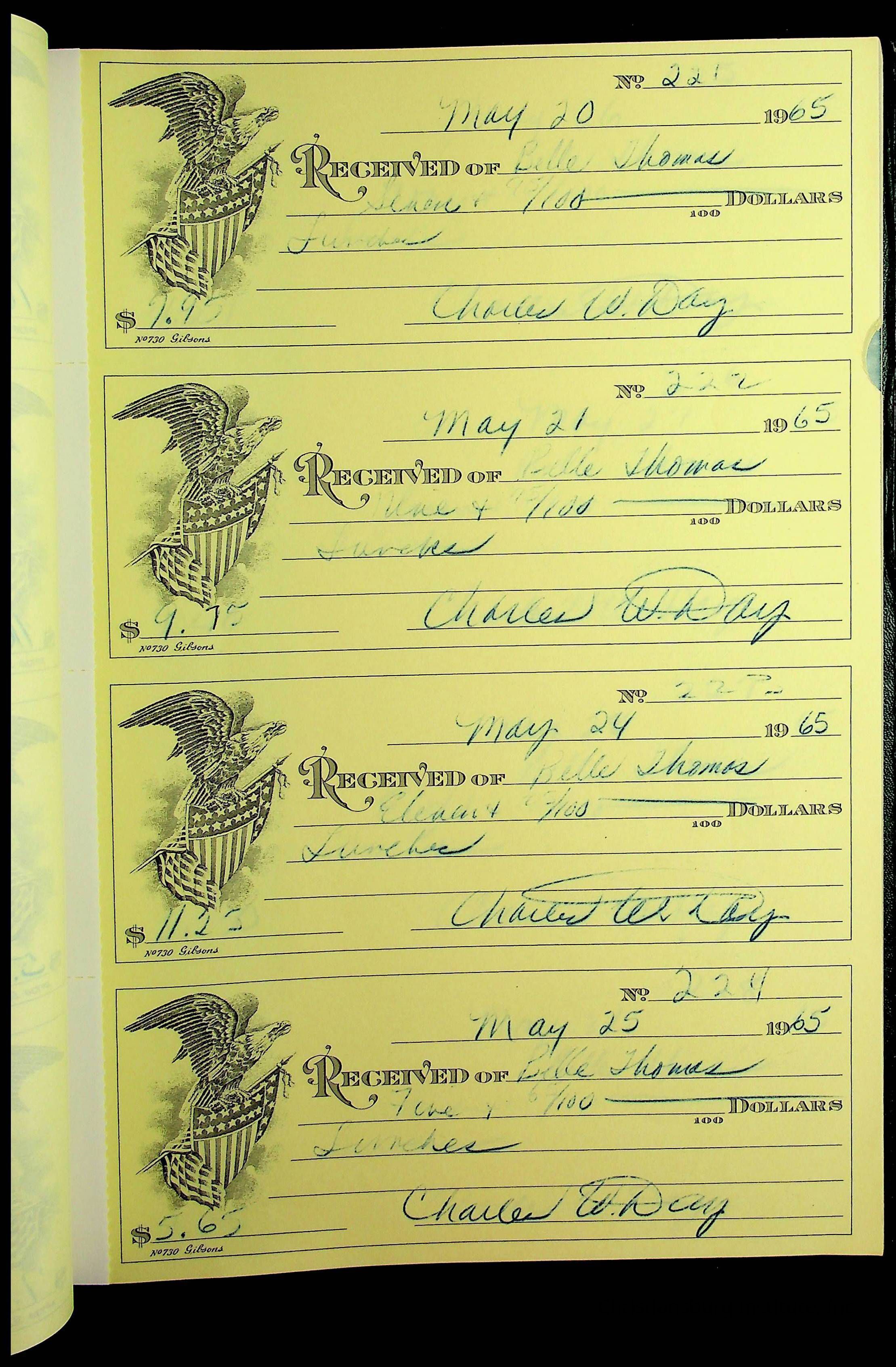 A receipt book manufactured by J.P. Bell company and used by Christiansburg Institute to document expenses and receipts from 1964 through 1966.