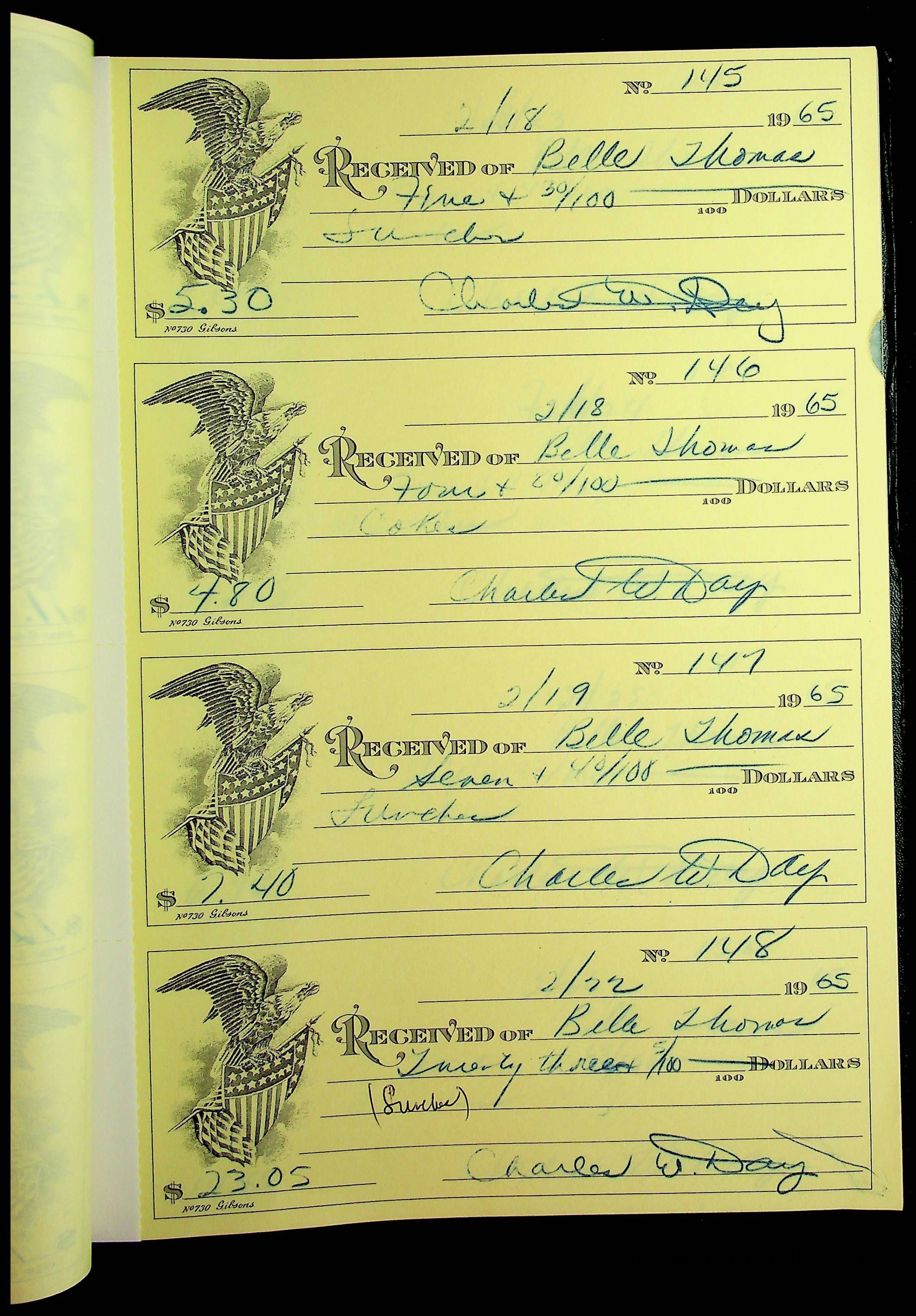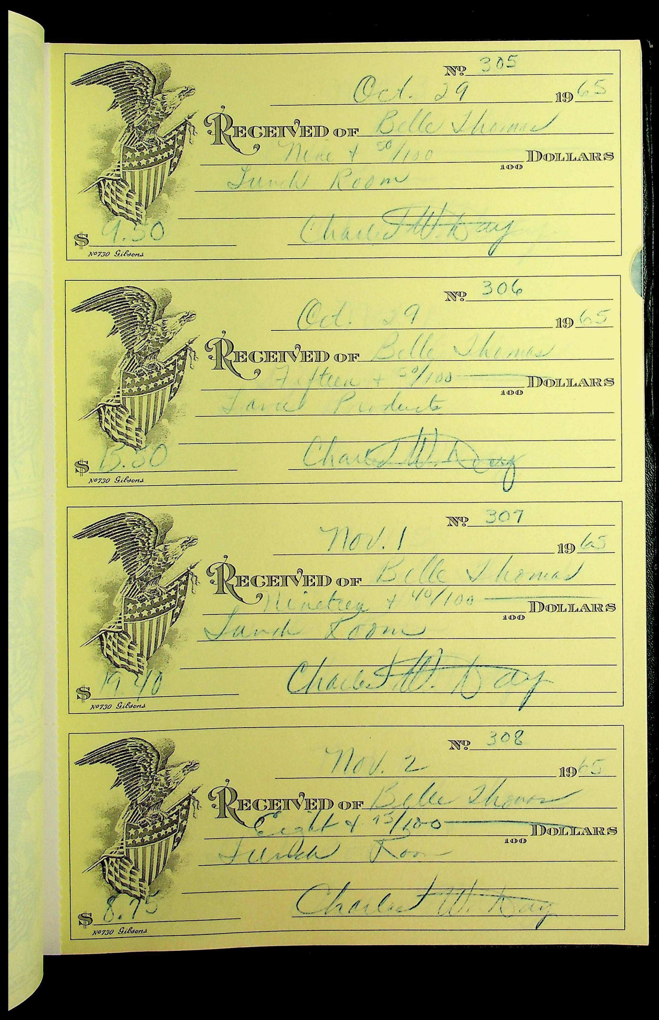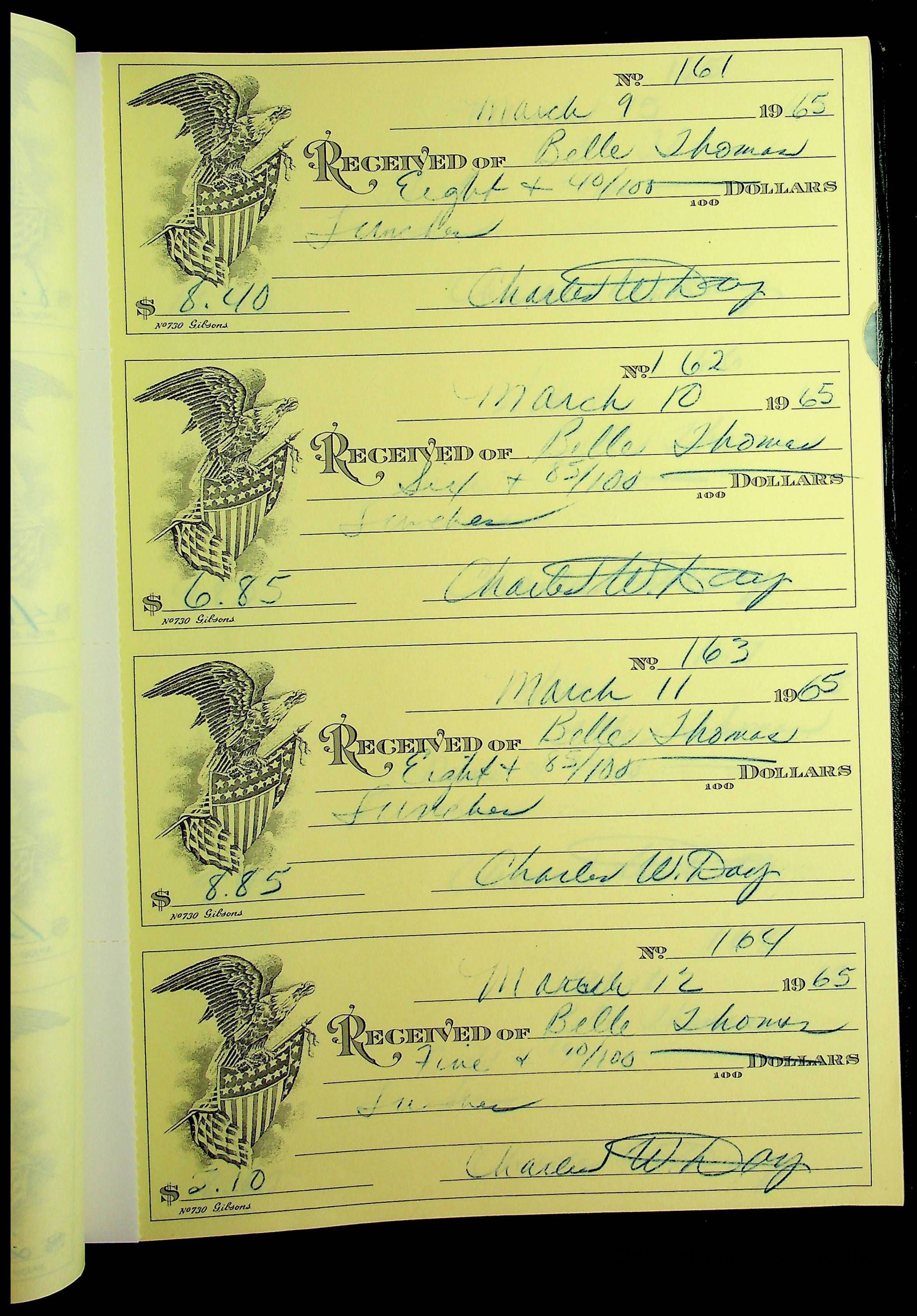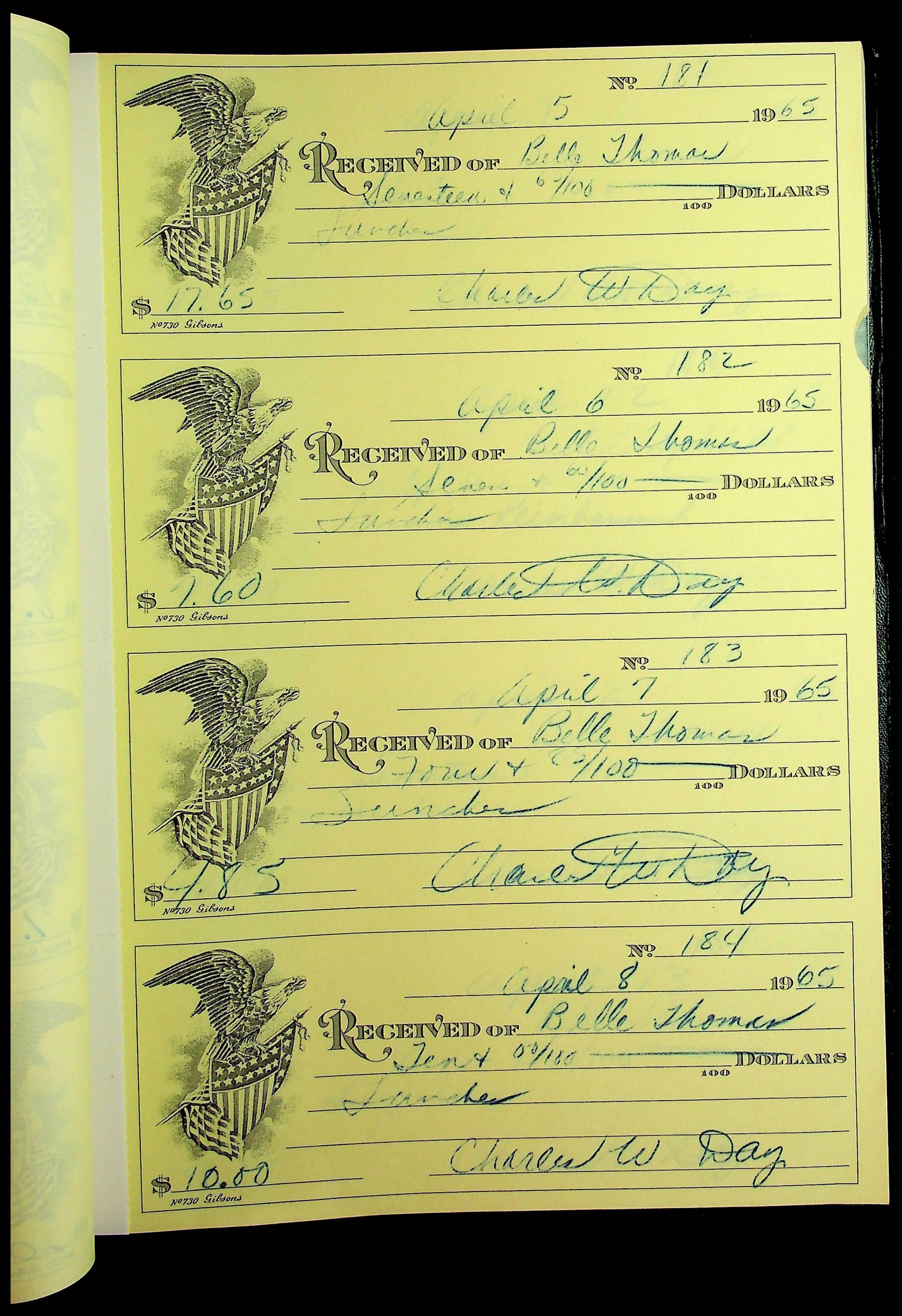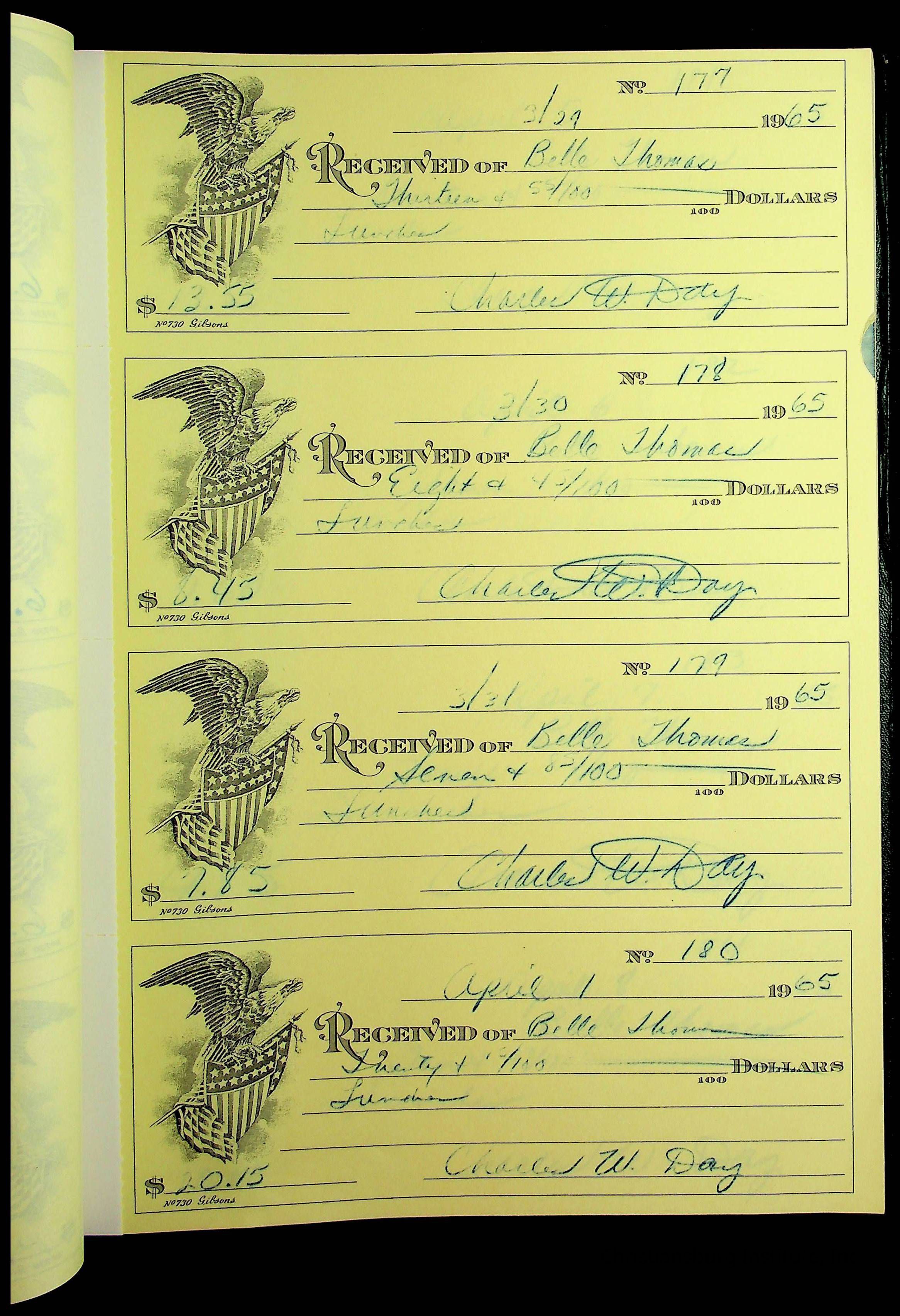 A receipt book manufactured by J.P. Bell company and used by Christiansburg Institute to document expenses and receipts from 1964 through 1966.