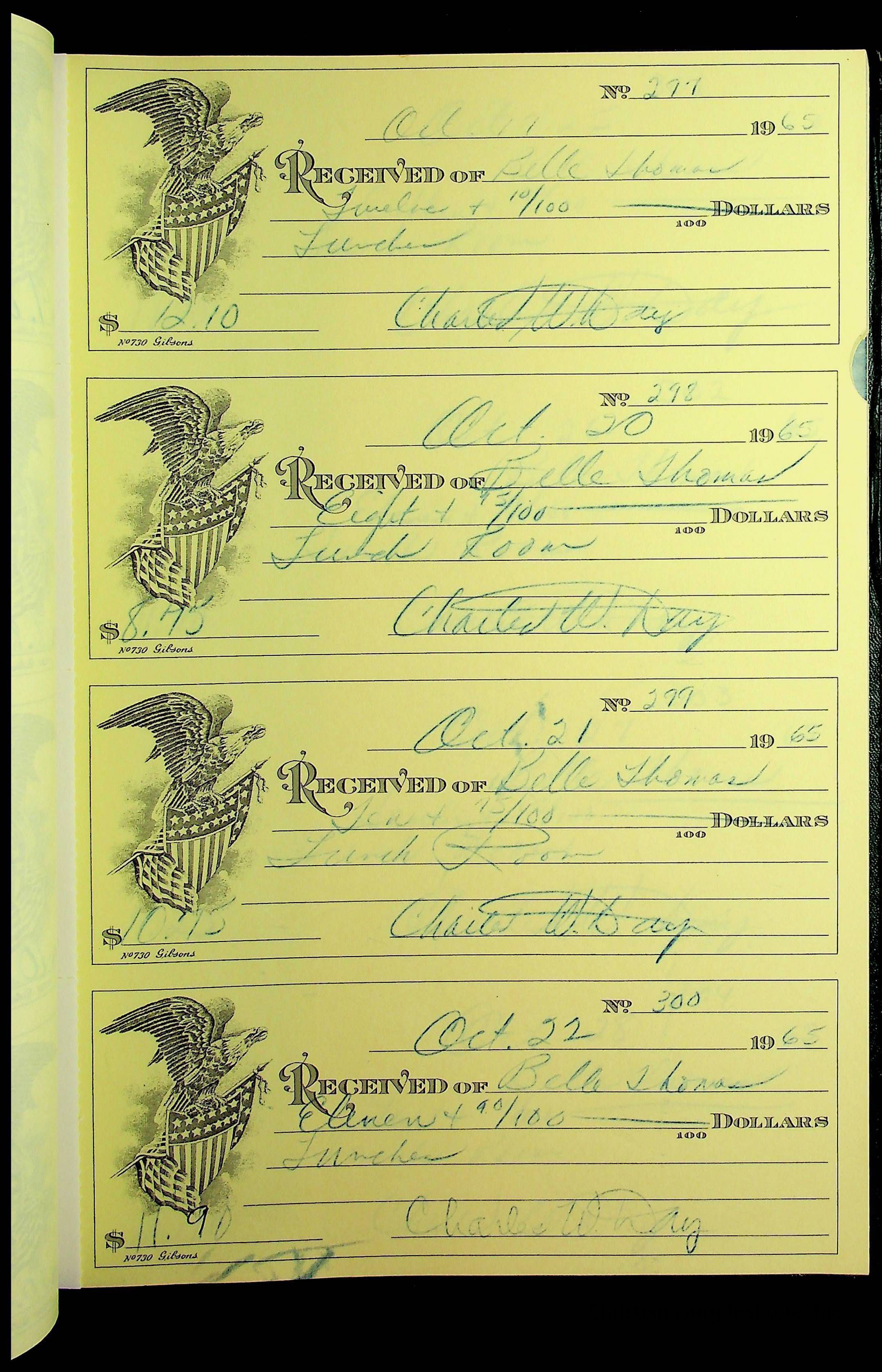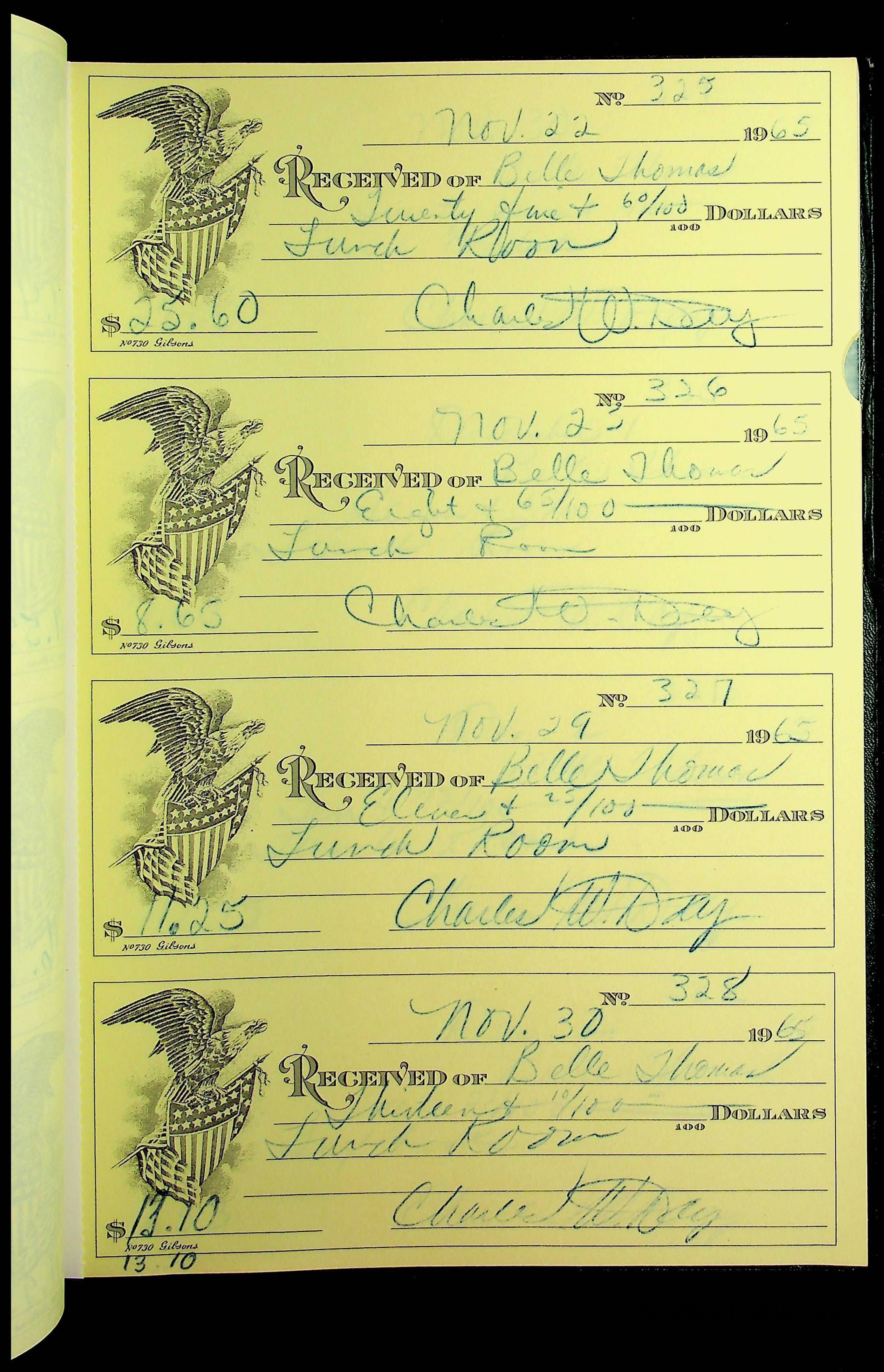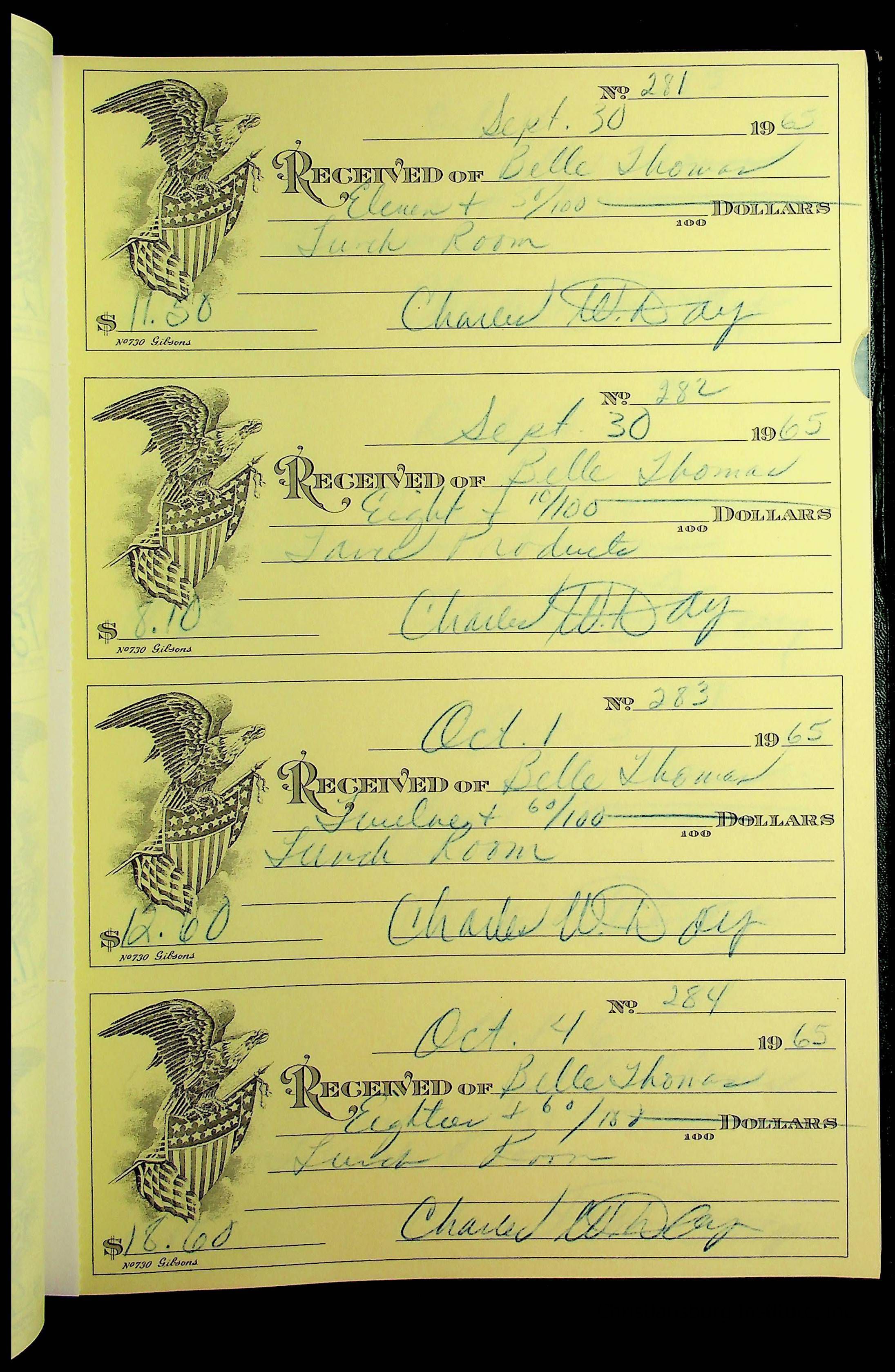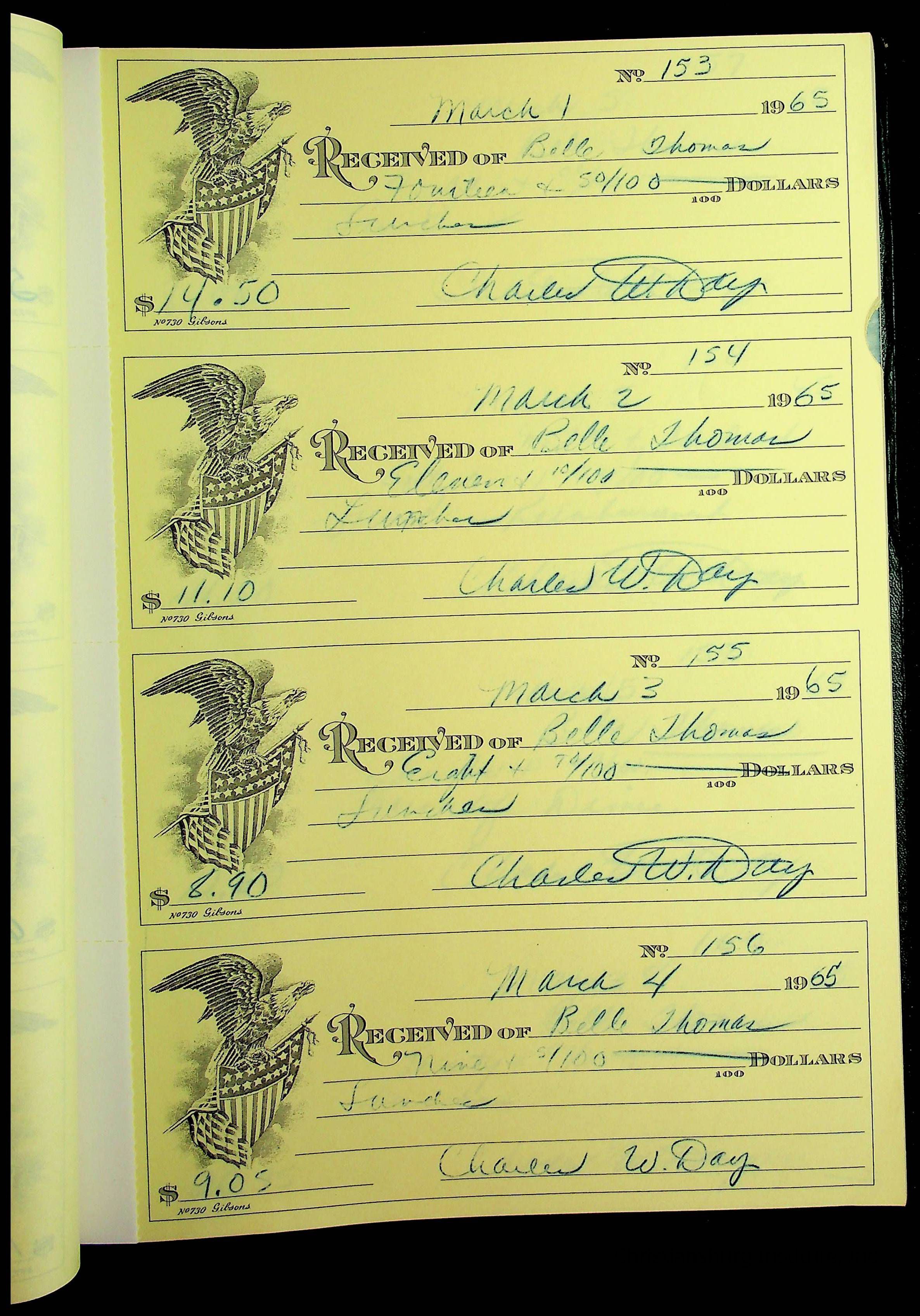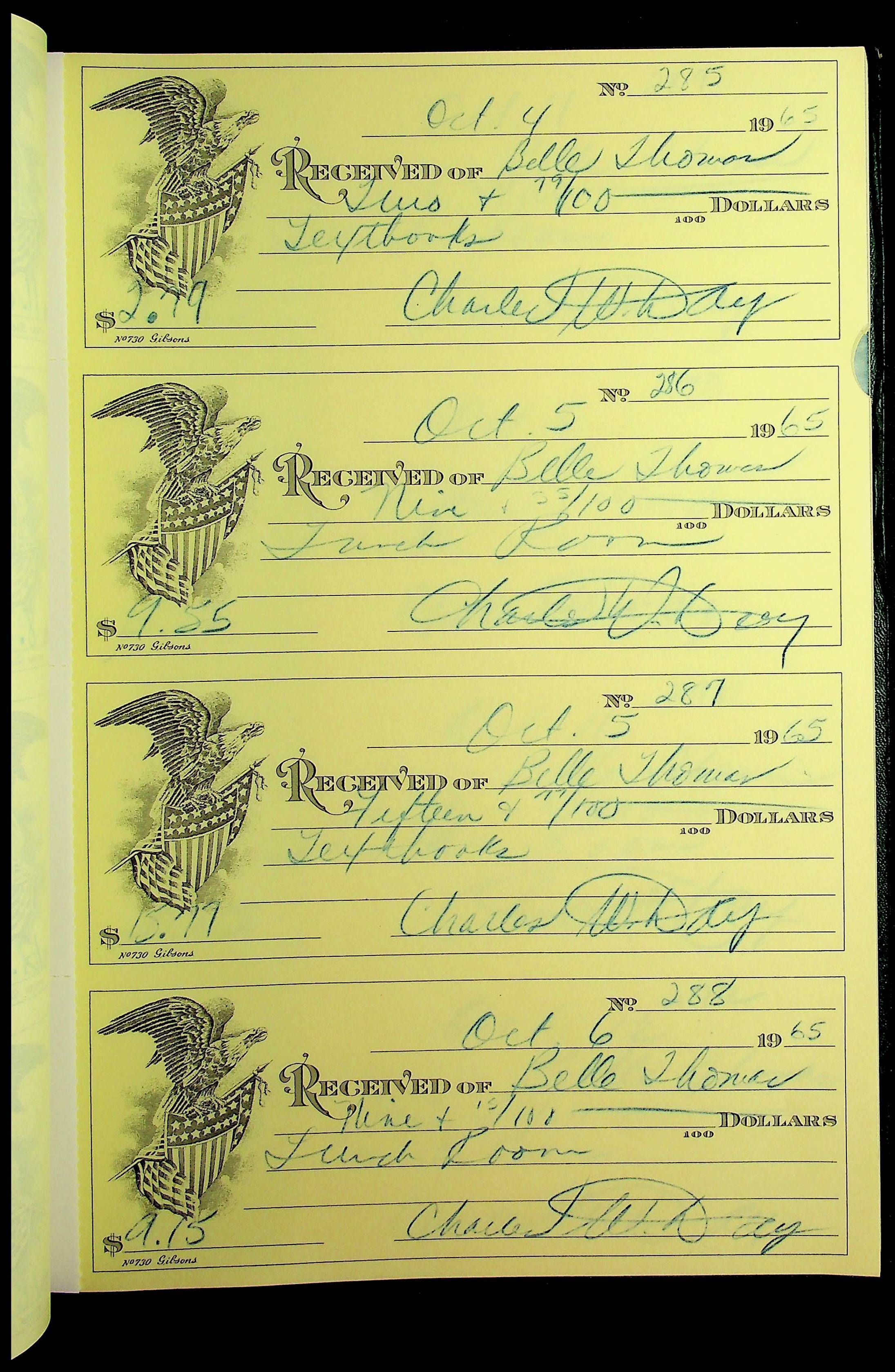A receipt book manufactured by J.P. Bell company and used by Christiansburg Institute to document expenses and receipts from 1964 through 1966.