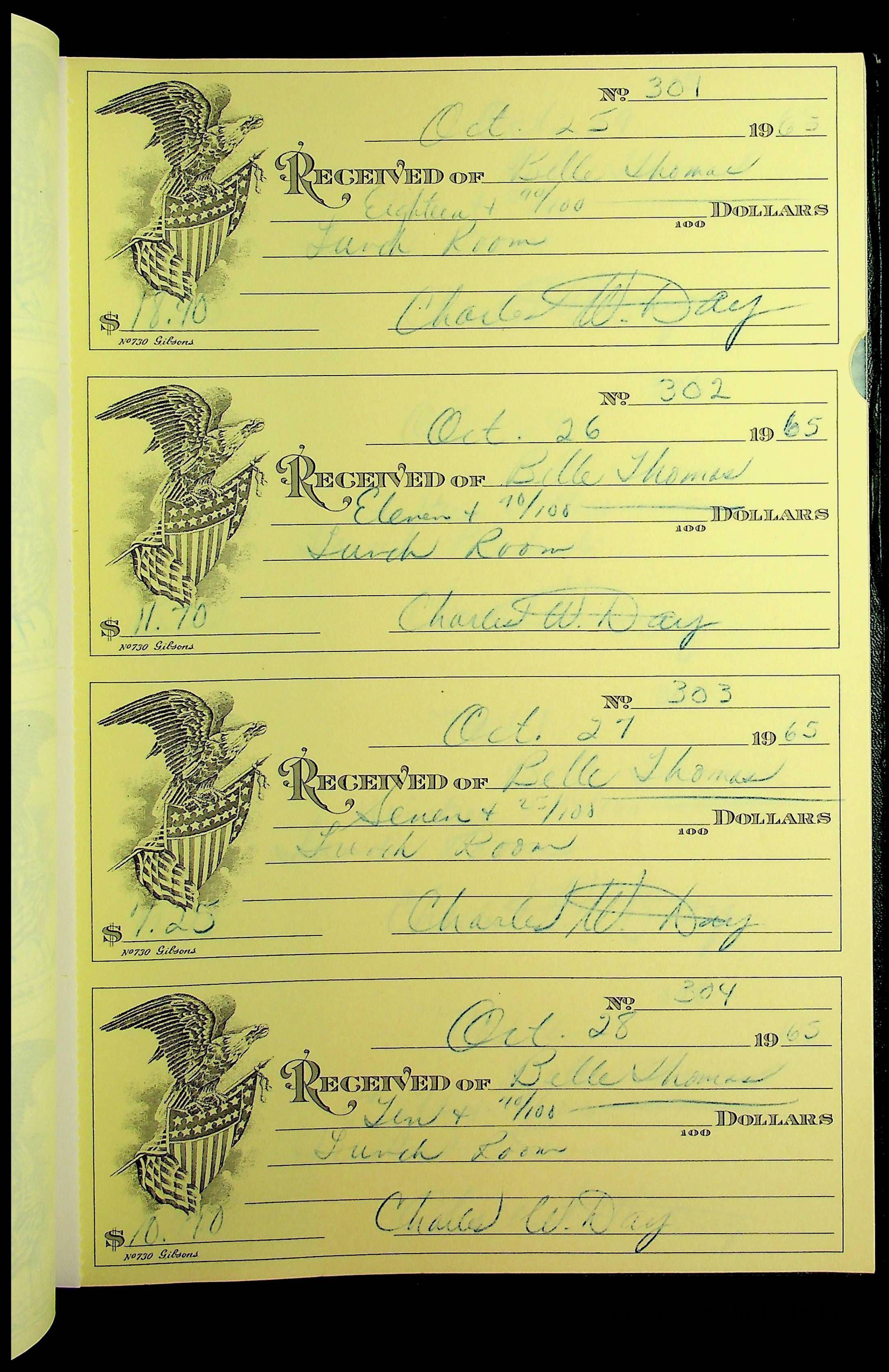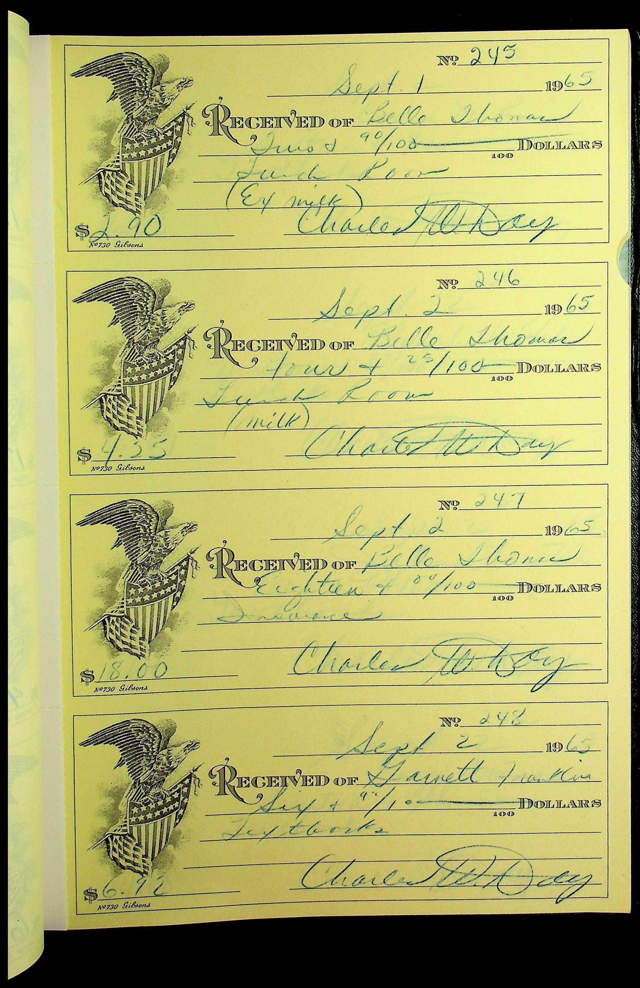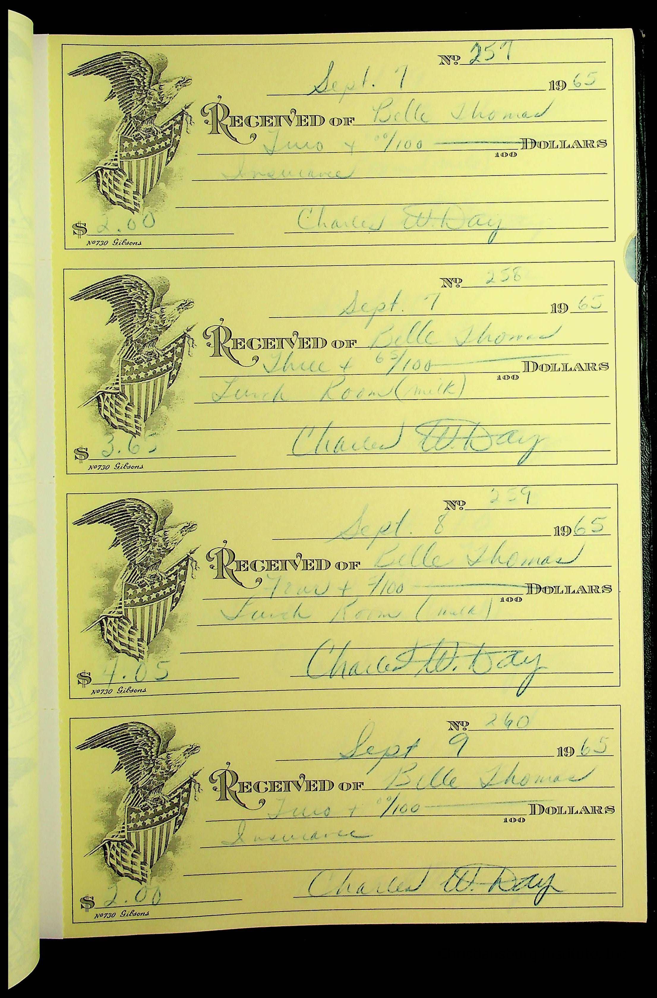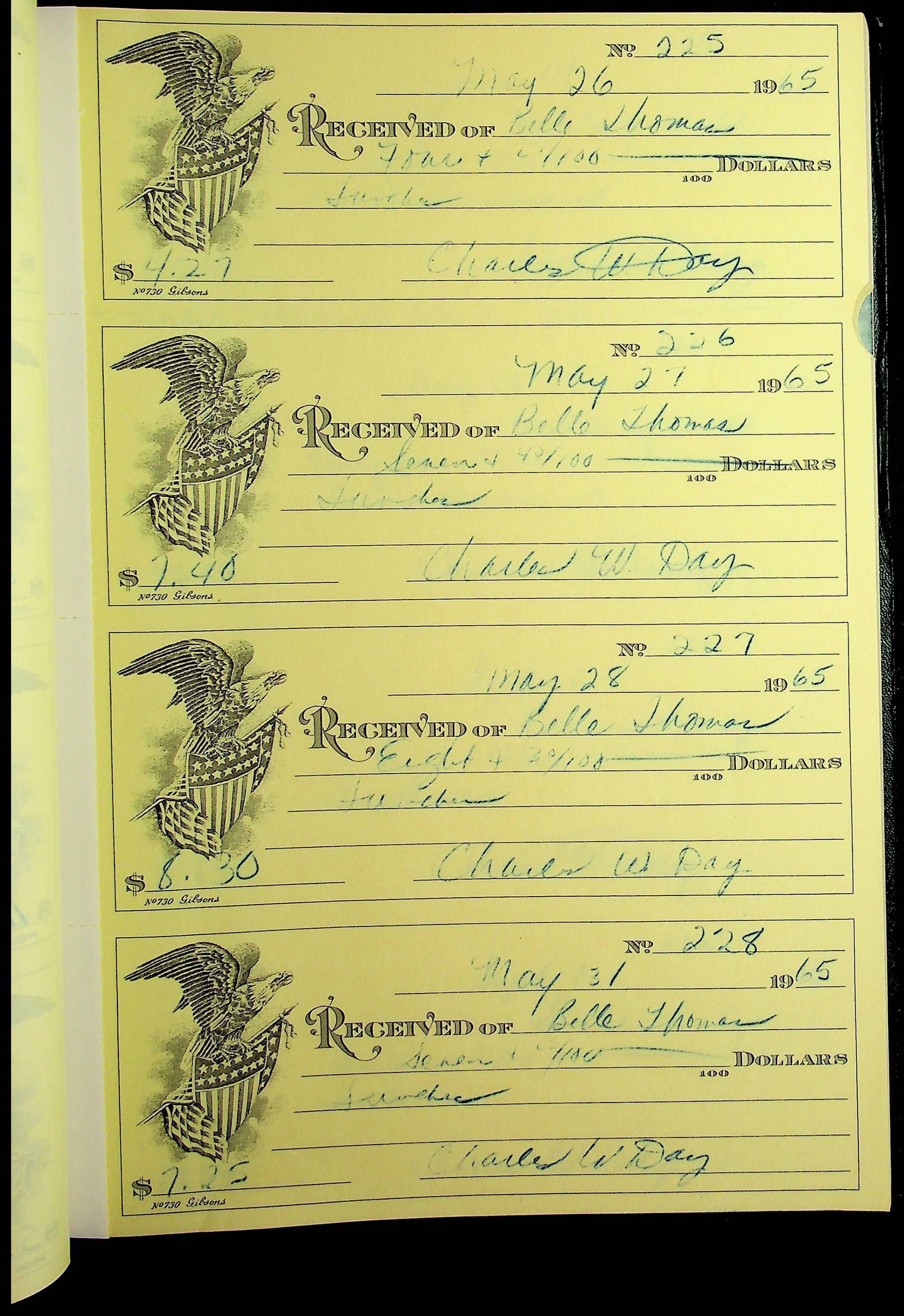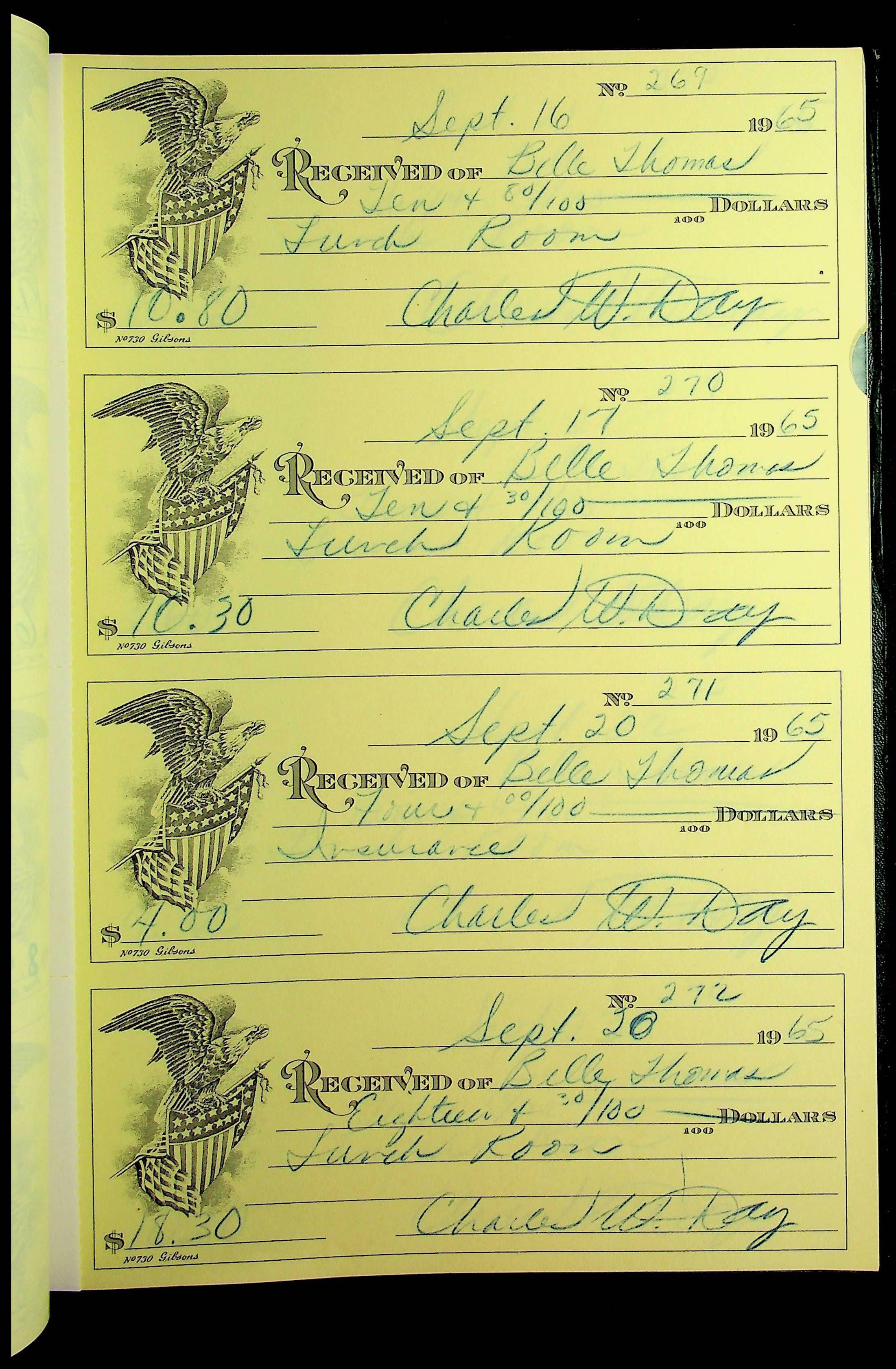 A receipt book manufactured by J.P. Bell company and used by Christiansburg Institute to document expenses and receipts from 1964 through 1966.