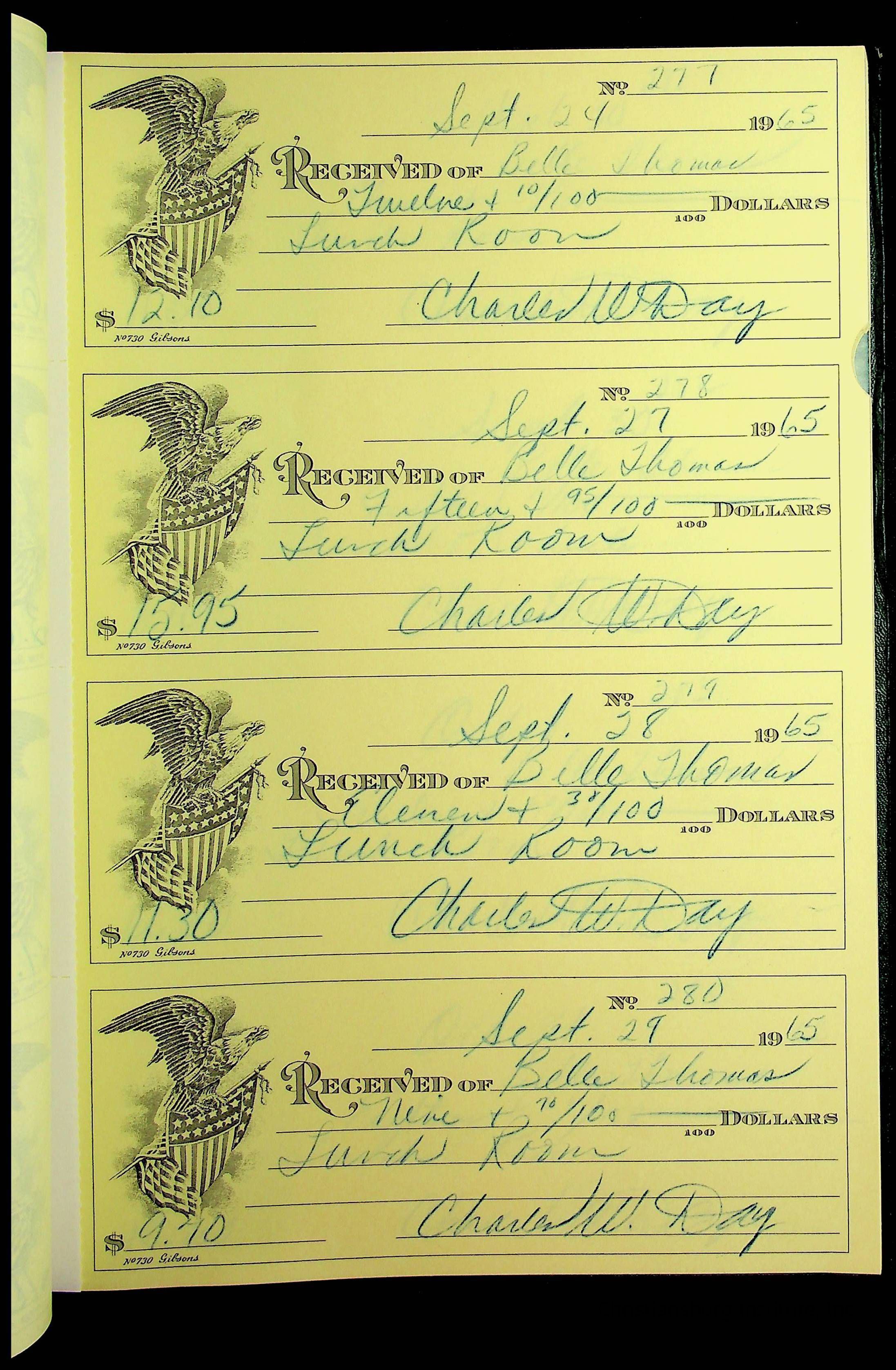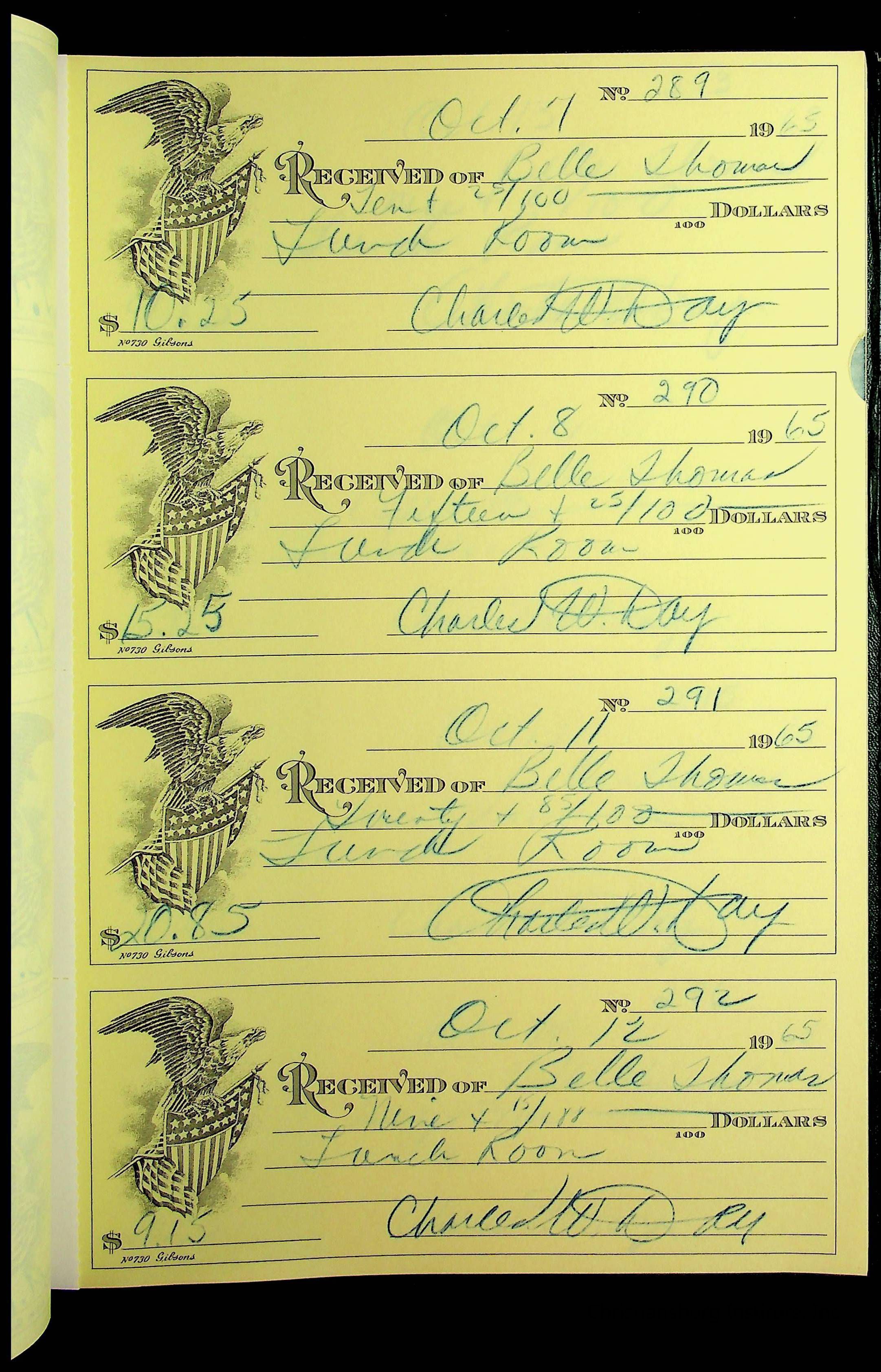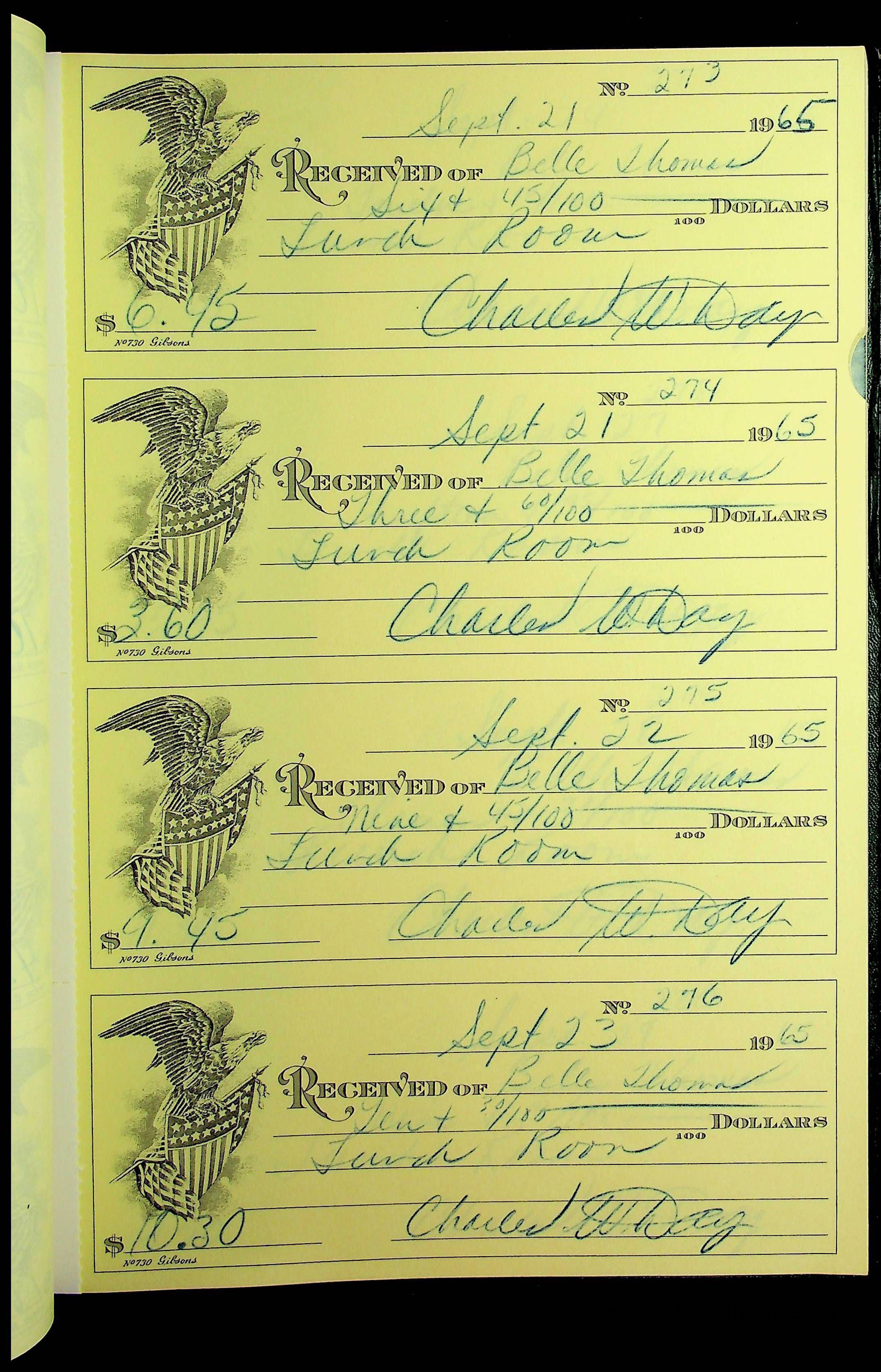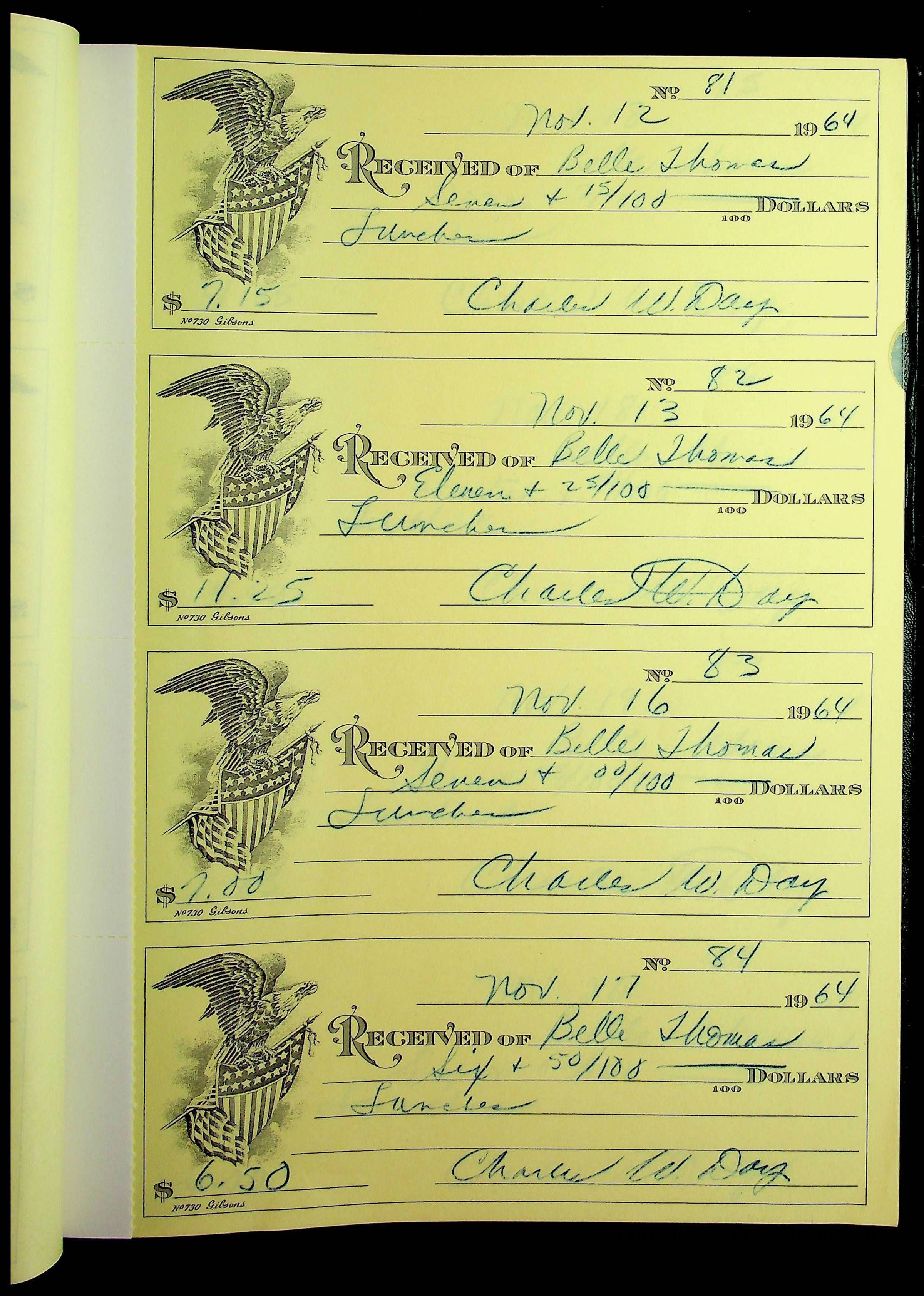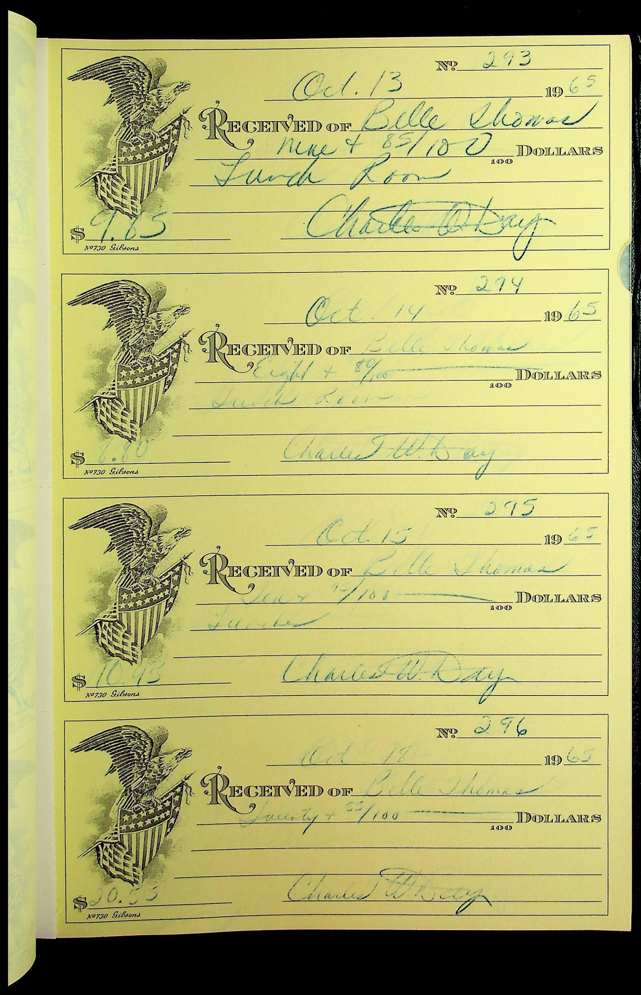 A receipt book manufactured by J.P. Bell company and used by Christiansburg Institute to document expenses and receipts from 1964 through 1966.