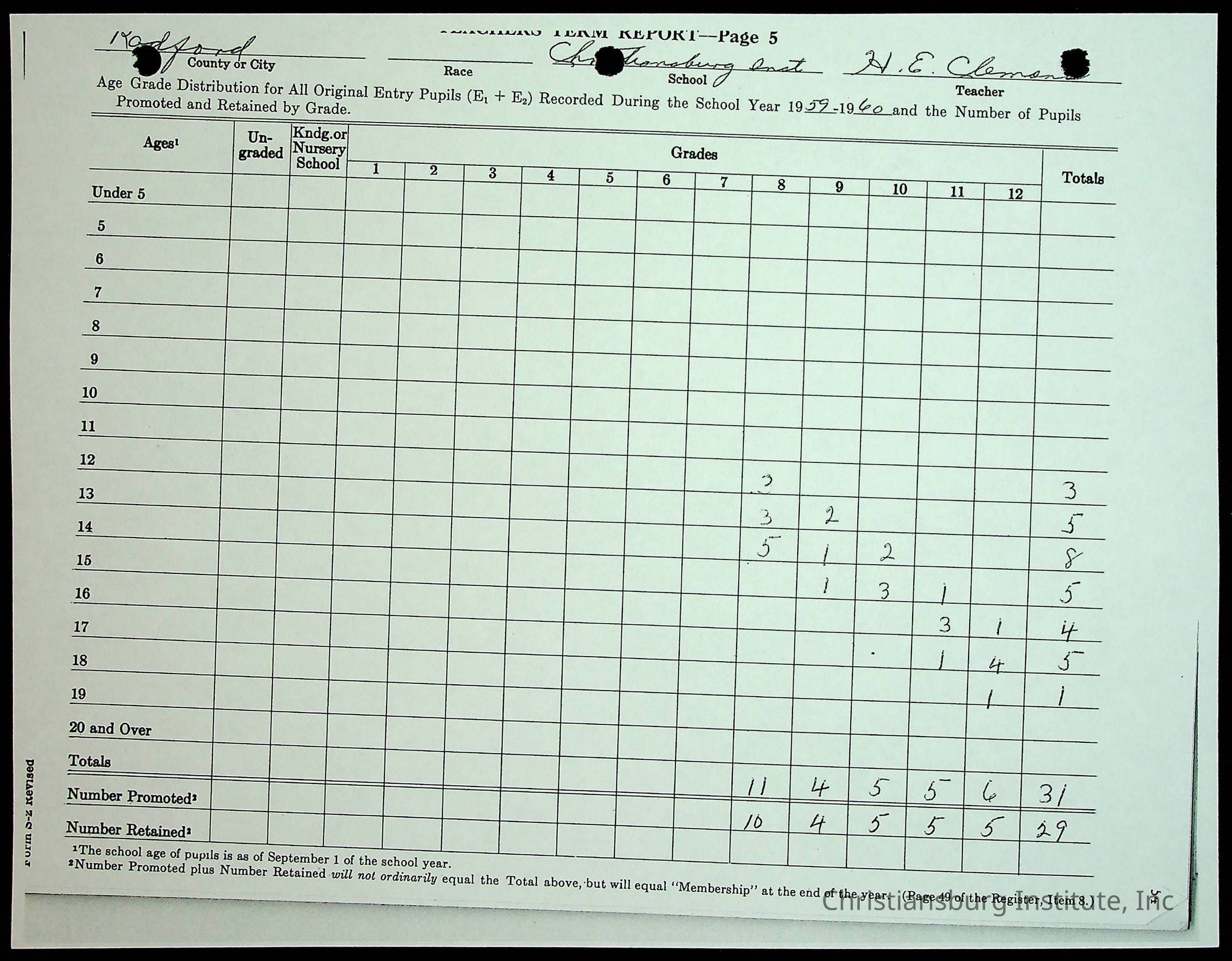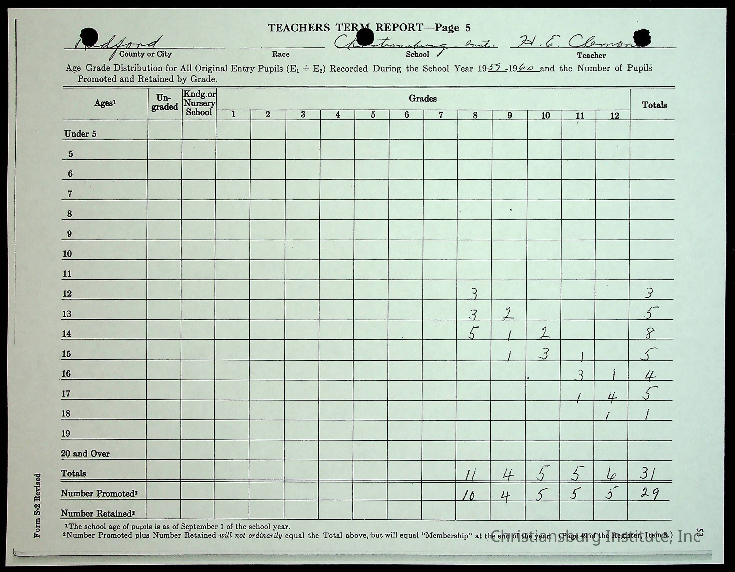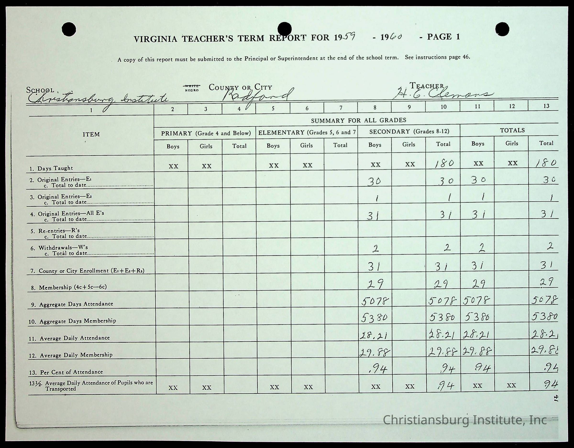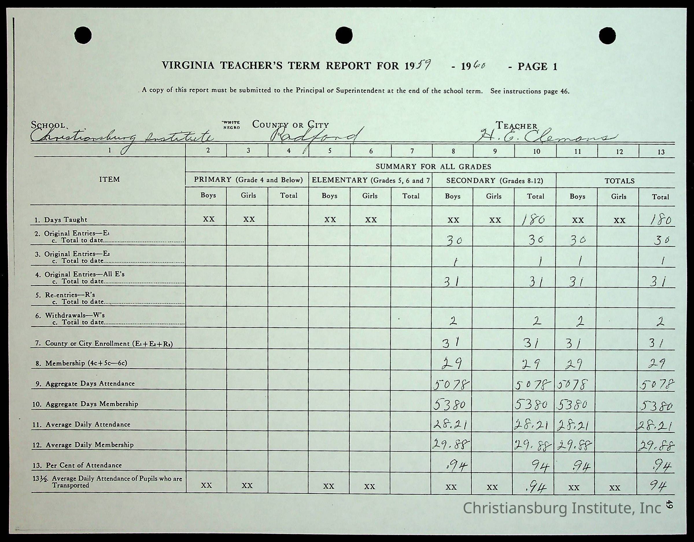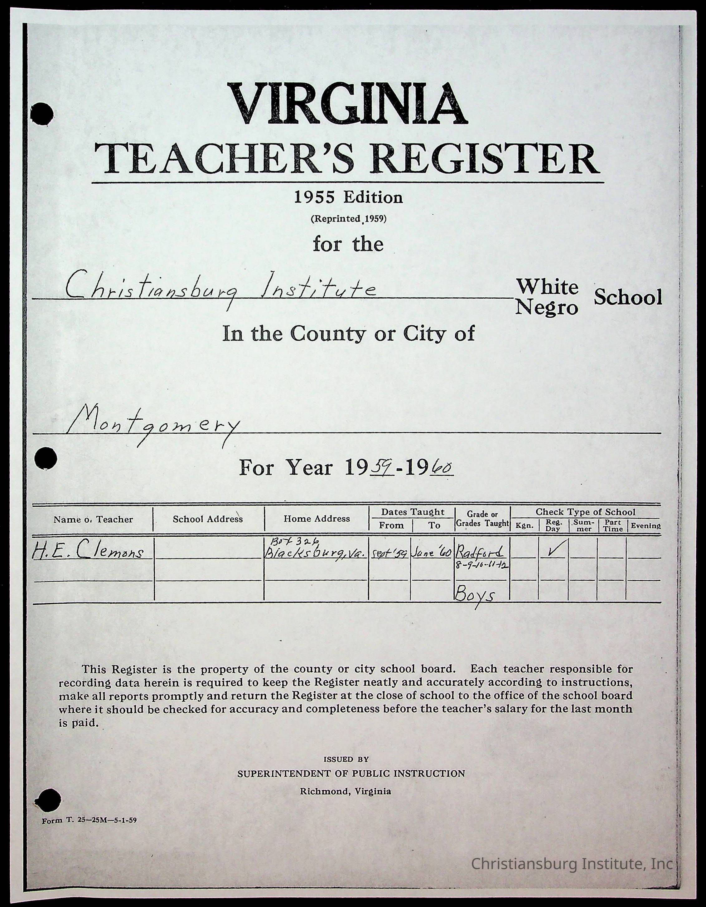 Christiansburg Institute Records of H.E. Clemons, 1959-1960