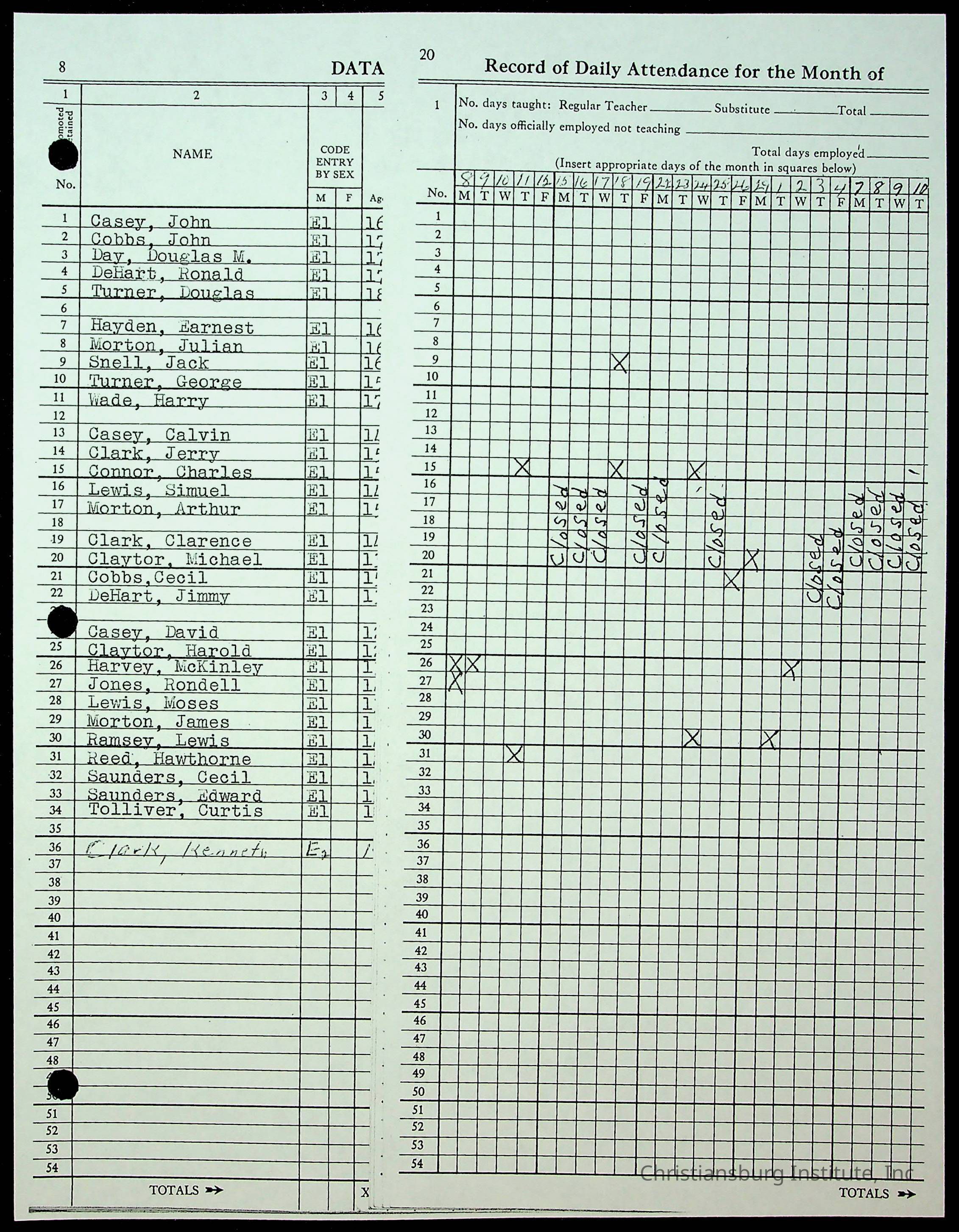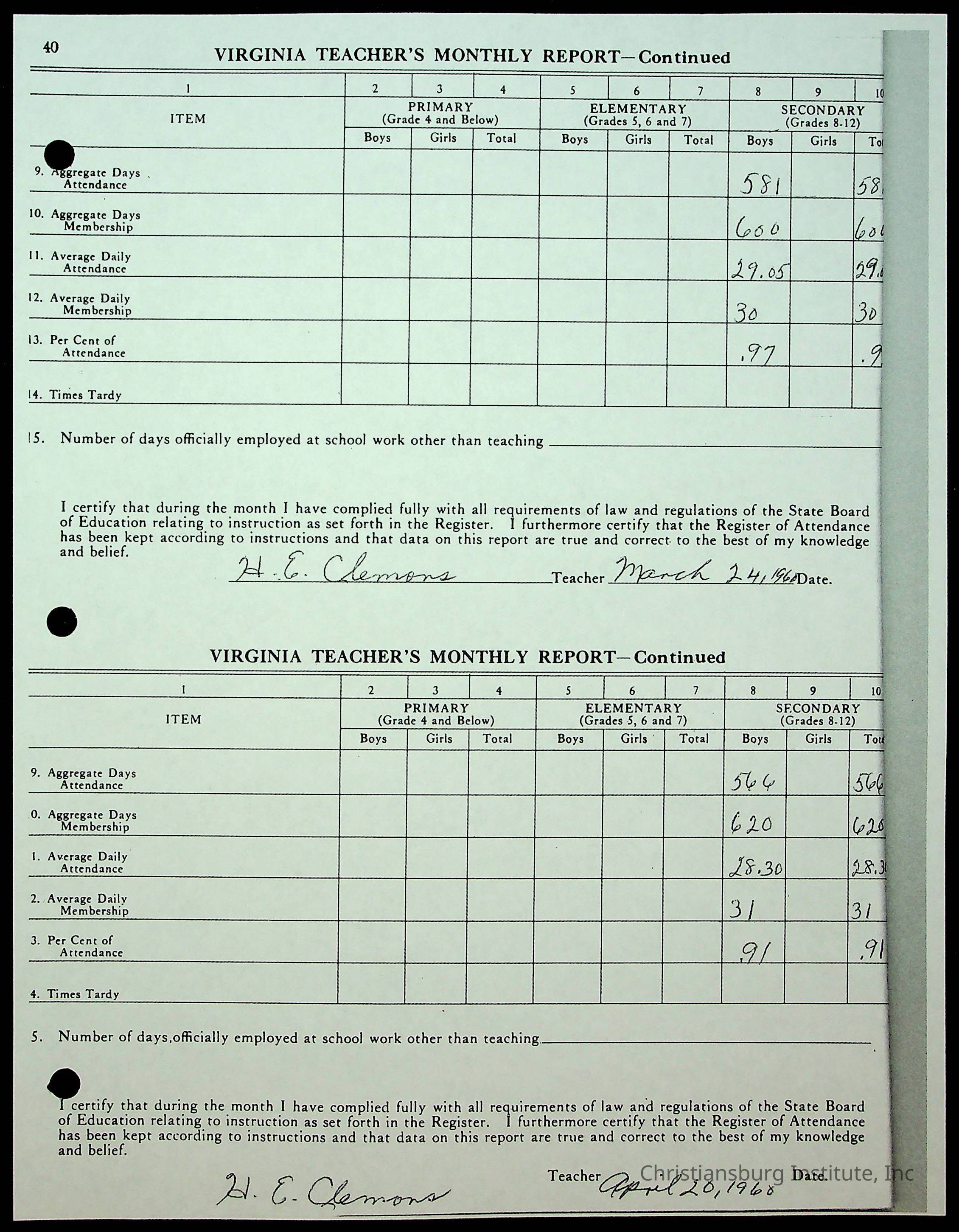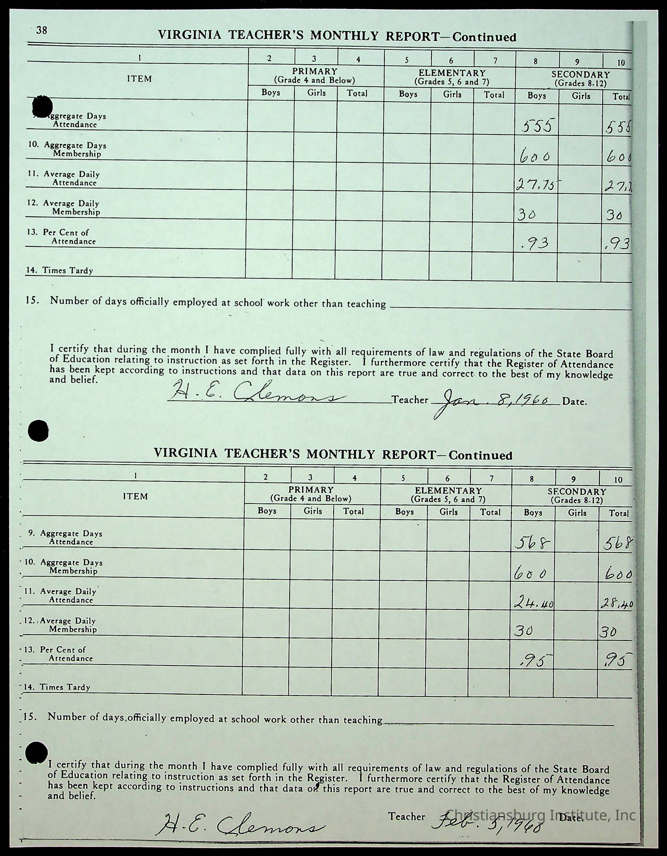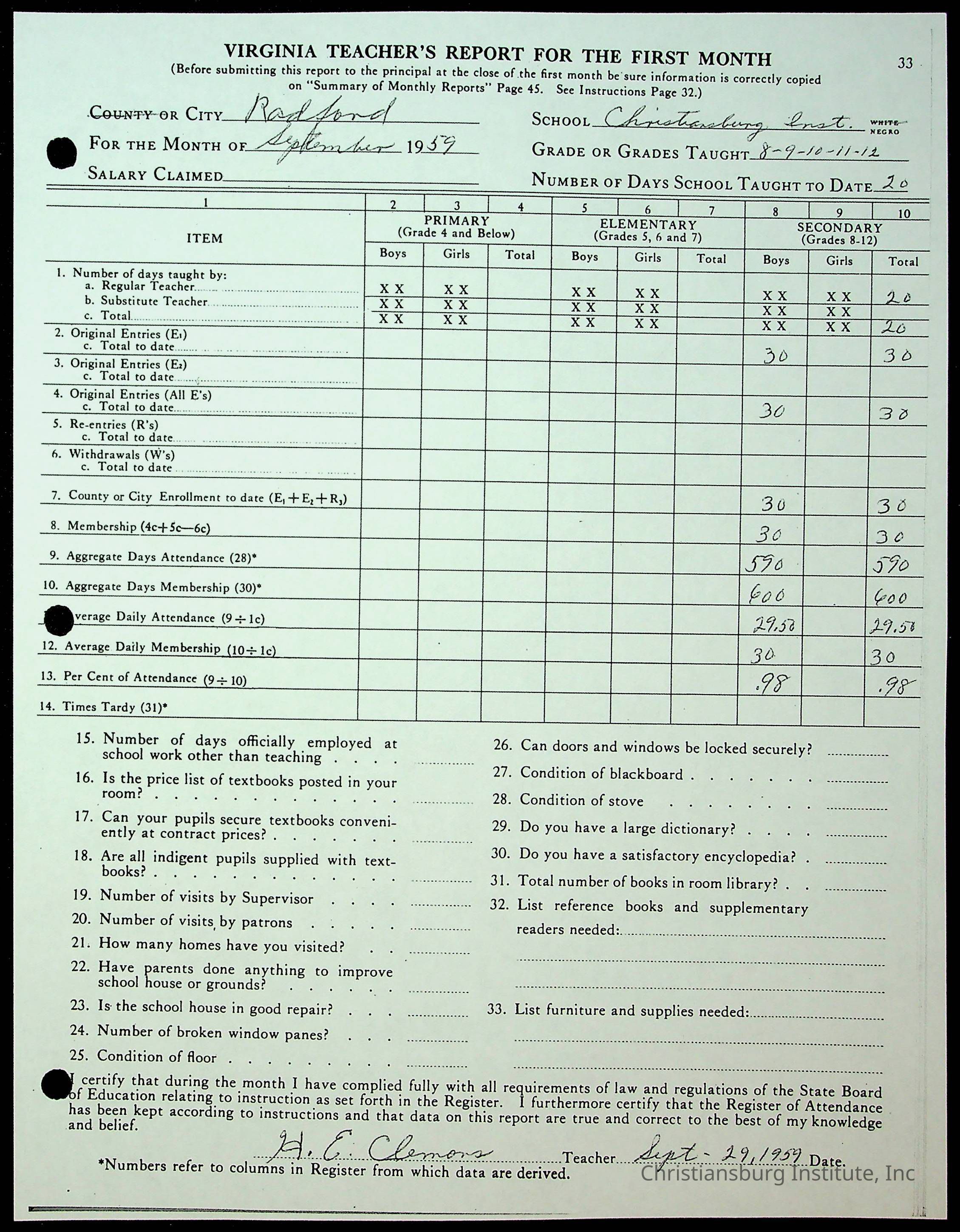 Christiansburg Institute Records of H.E. Clemons, 1959-1960