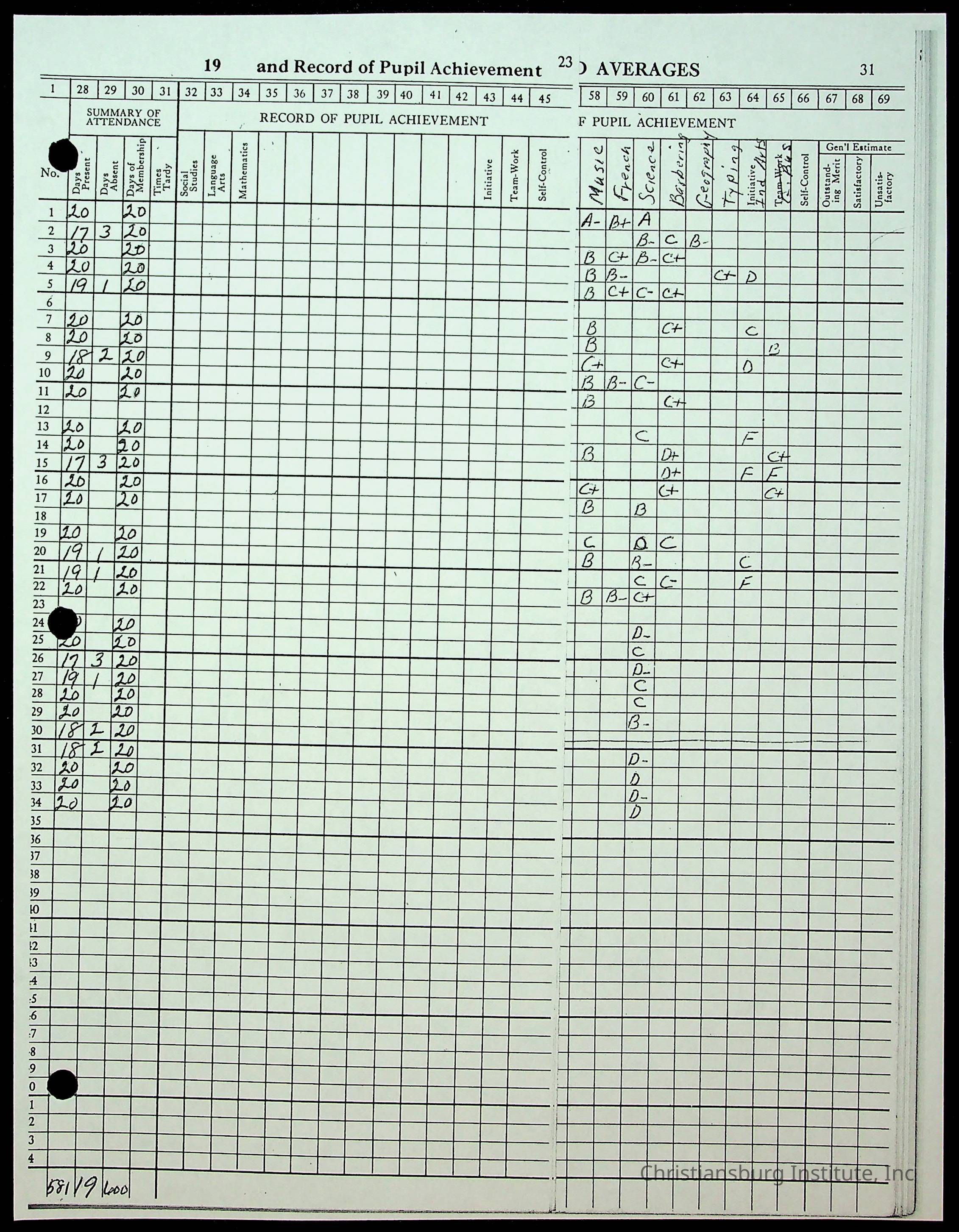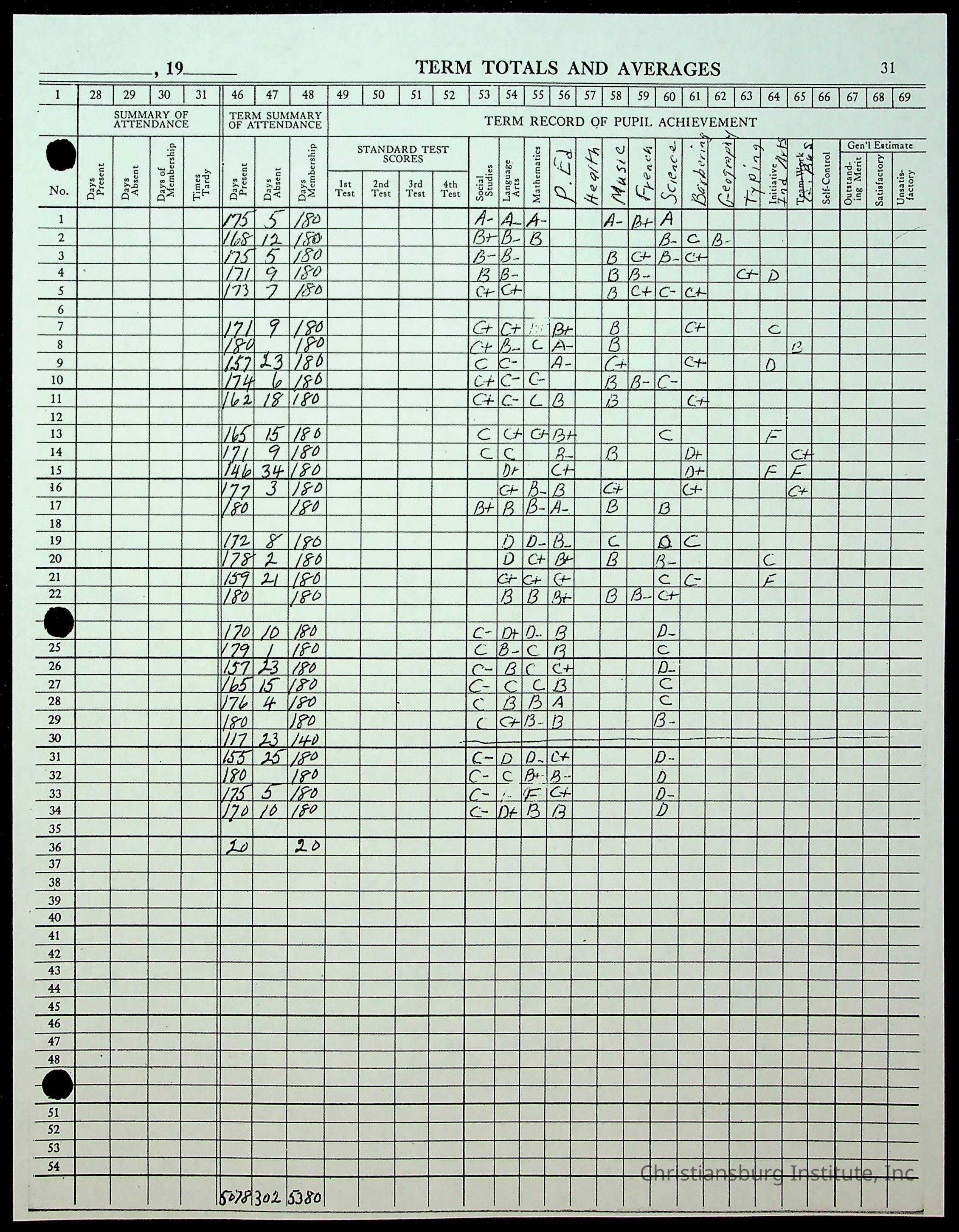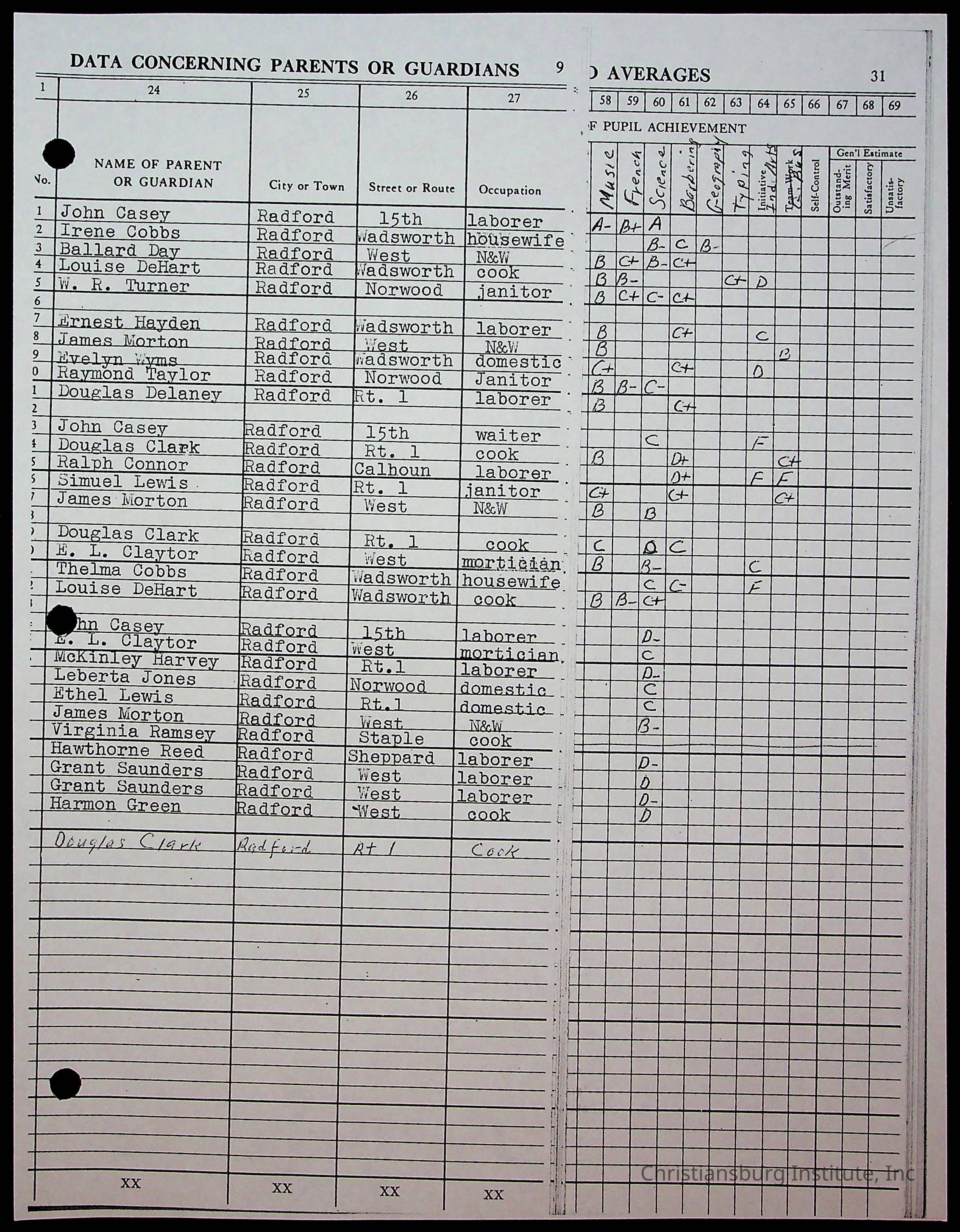 A photocopy version of Christiansburg Institute teacher, Hattie E. Clemons Virginia teacher's register for the school year 1959-1960 including information about her students and their parents.