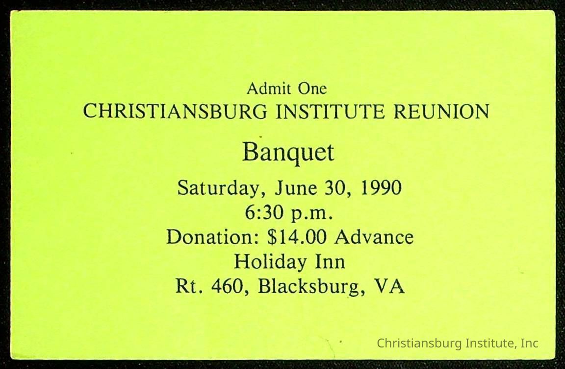 A Christiansburg Institute Reunion banquet ticket held in Blacksburg, Virginia dated Saturday, June 30th, 1990.Creator