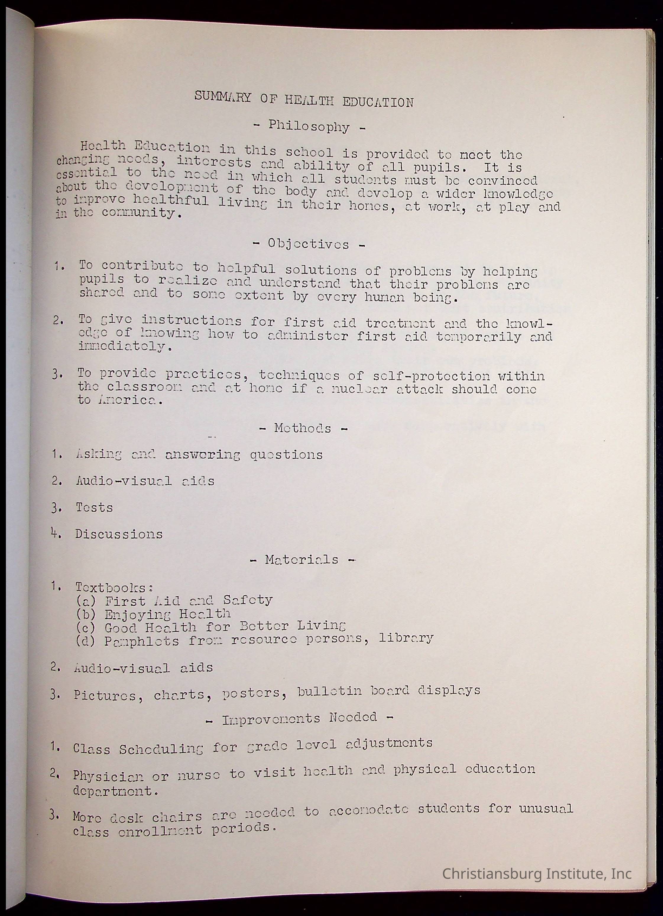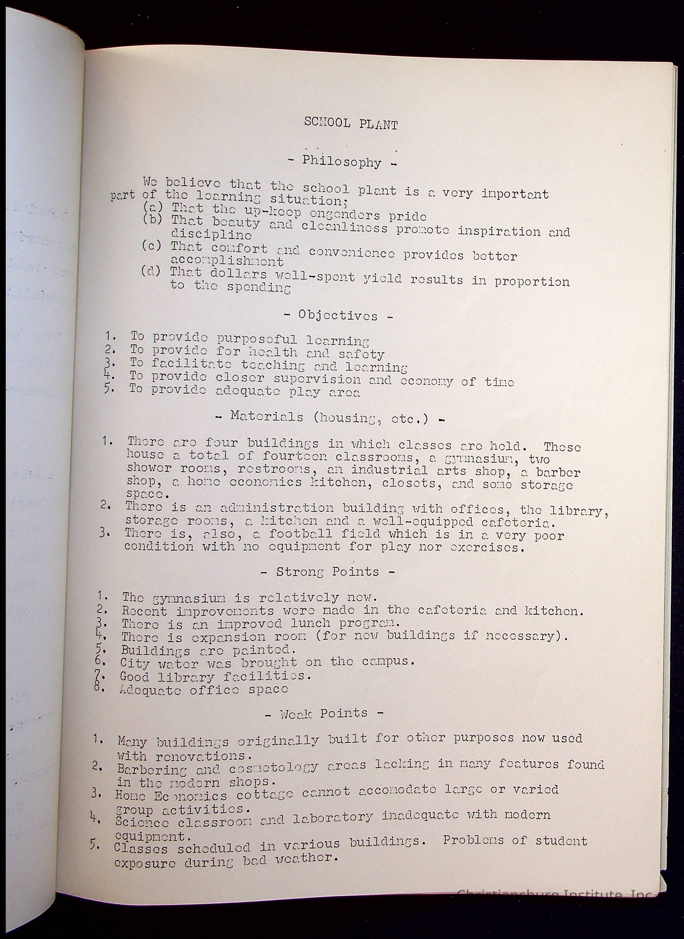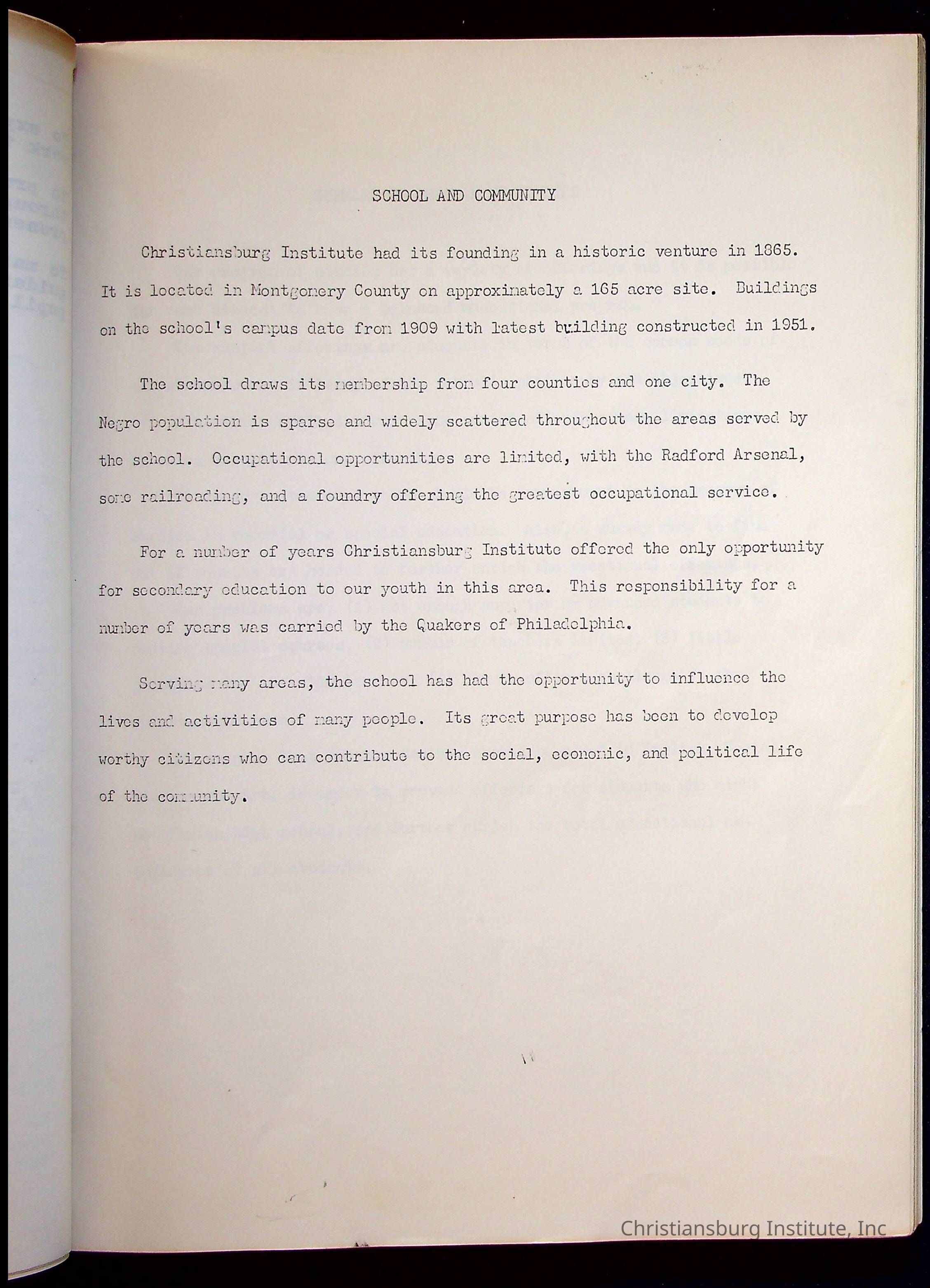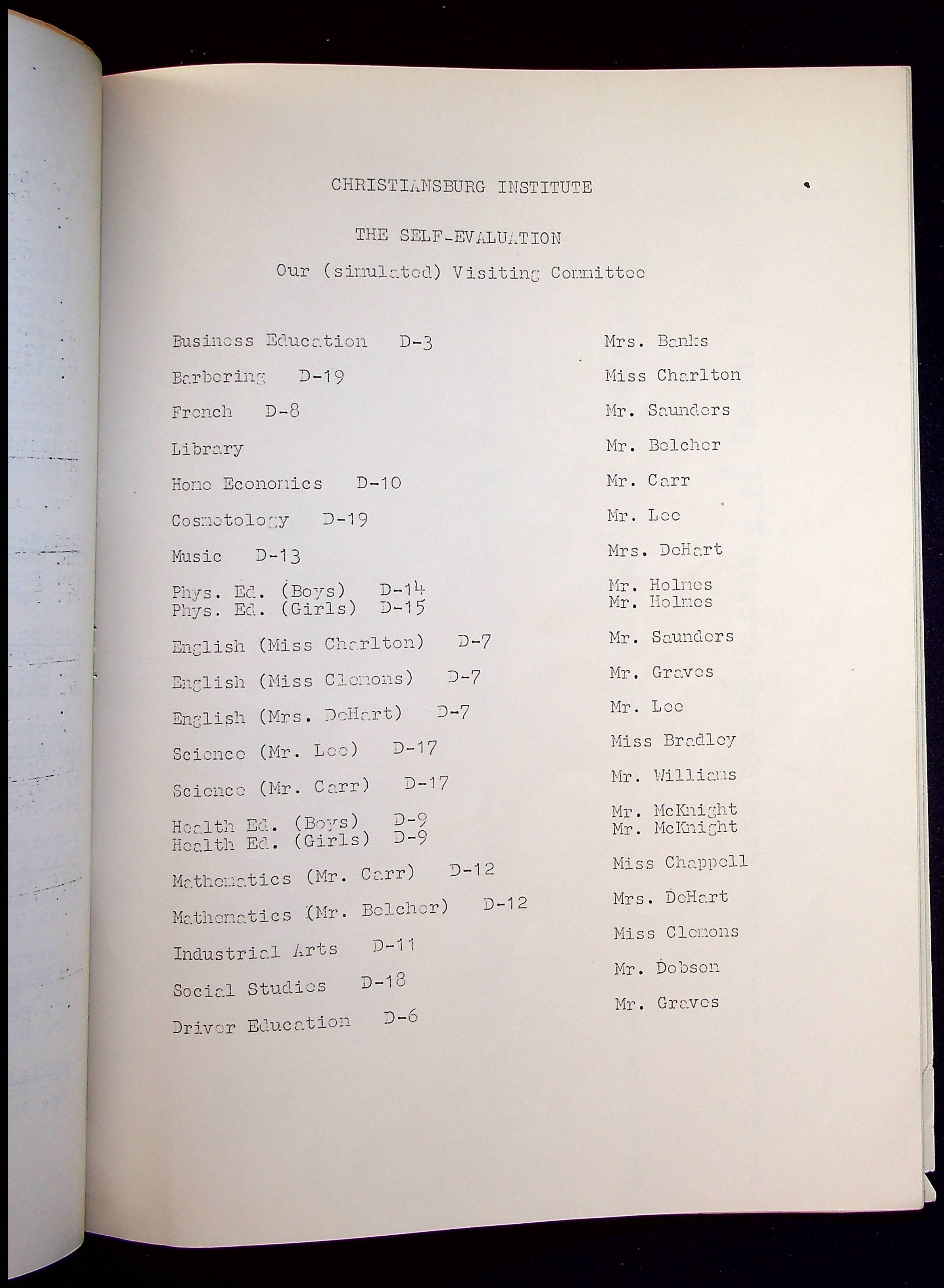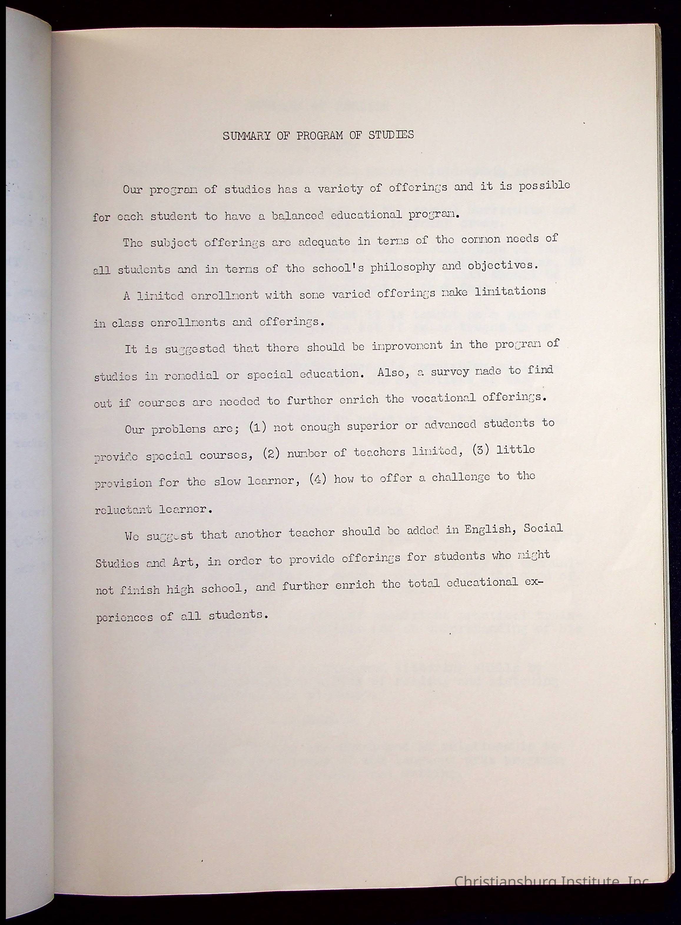 Christiansburg Institute Self Evaluation Summaries, this document was prepared for the Visiting Committee, dated April 28-30 and May 1, 1963.Creator