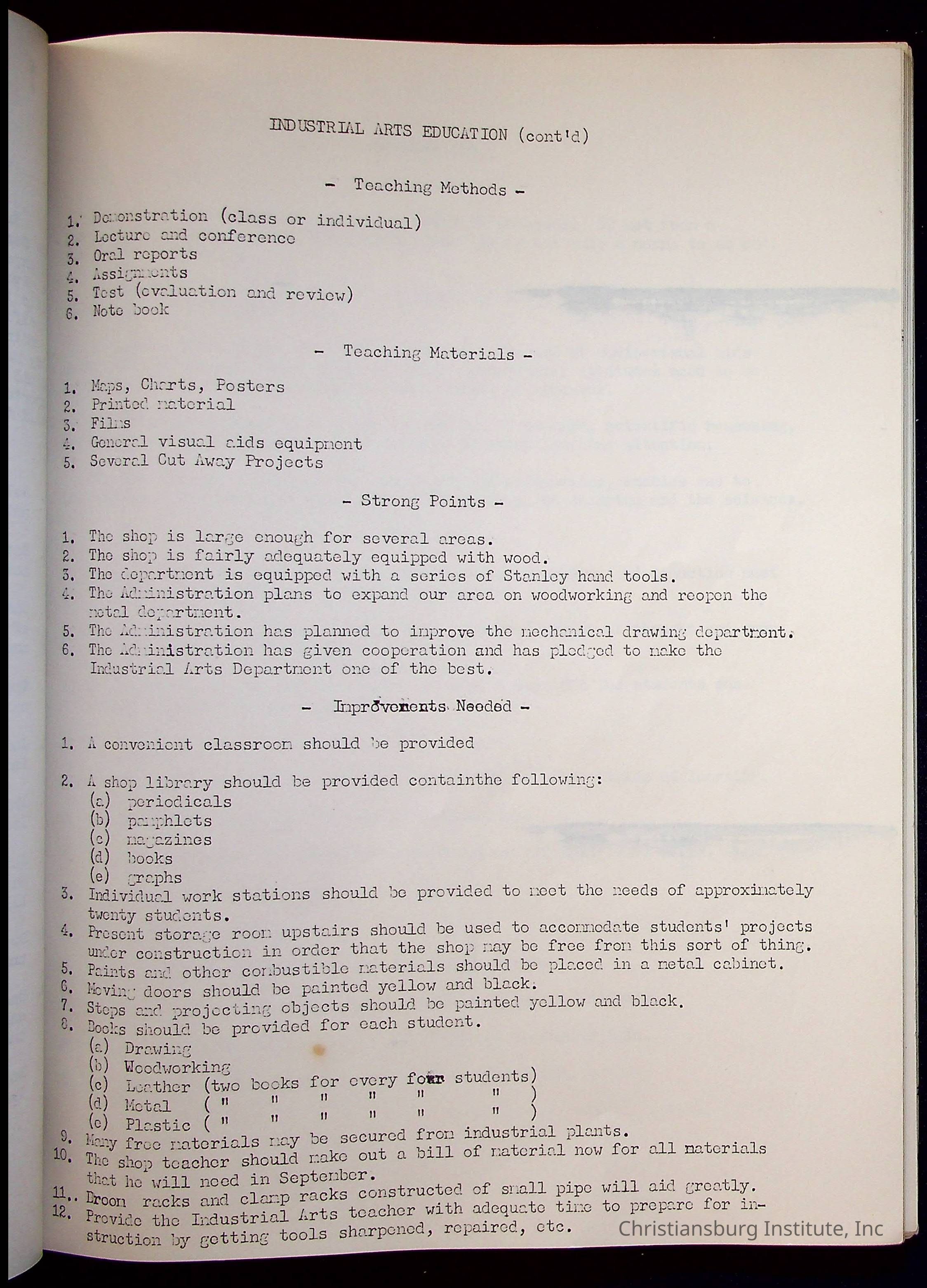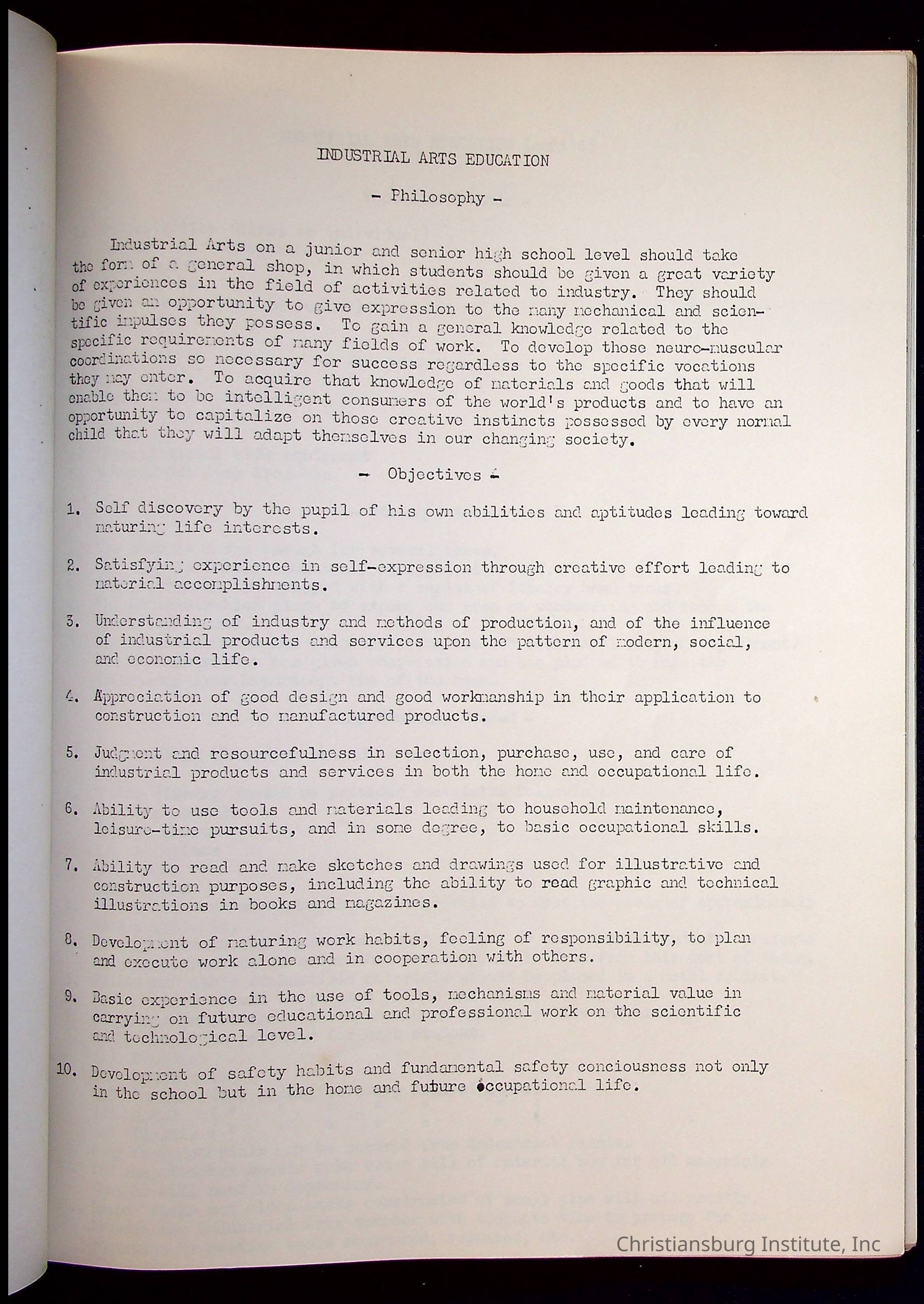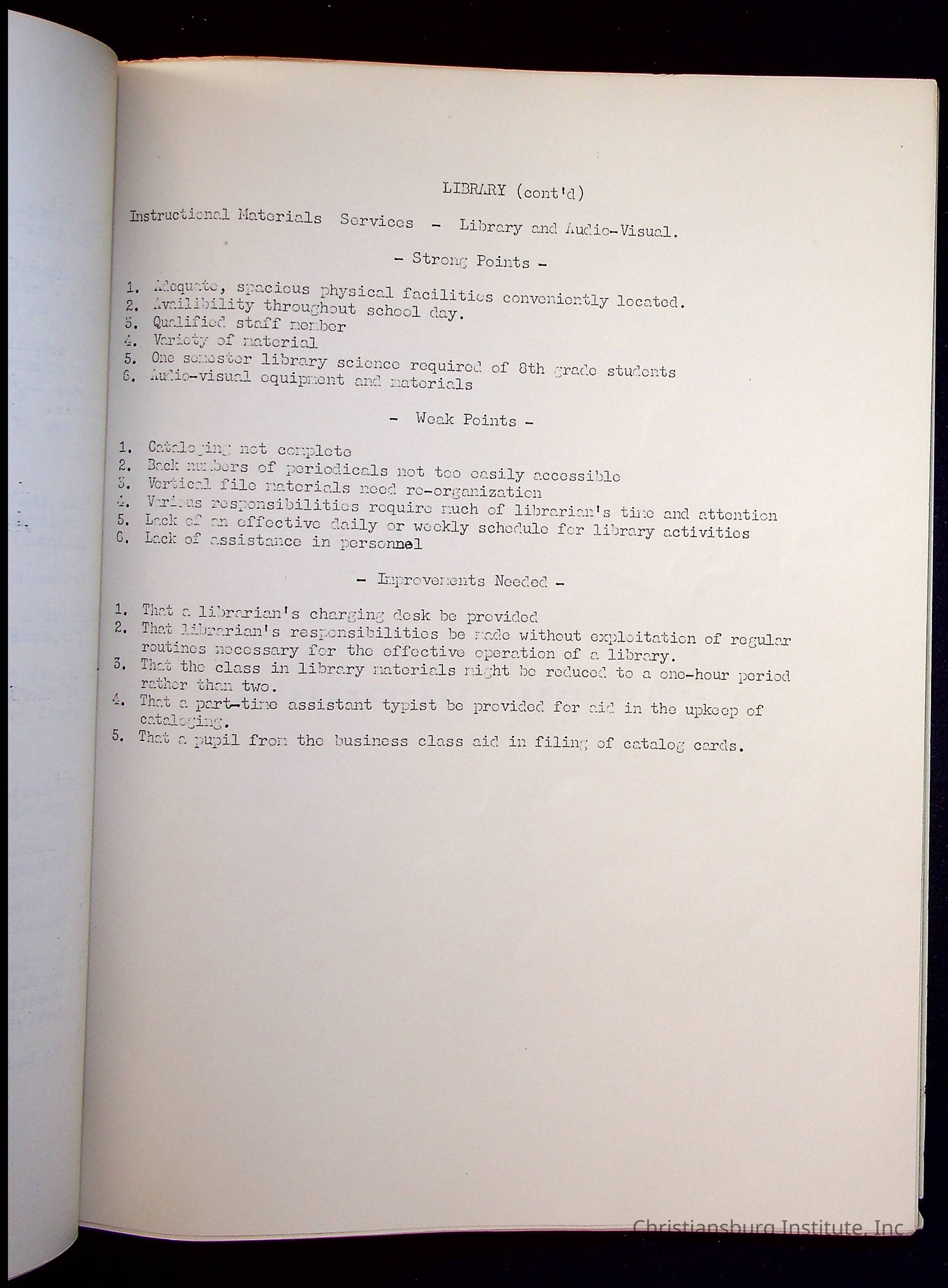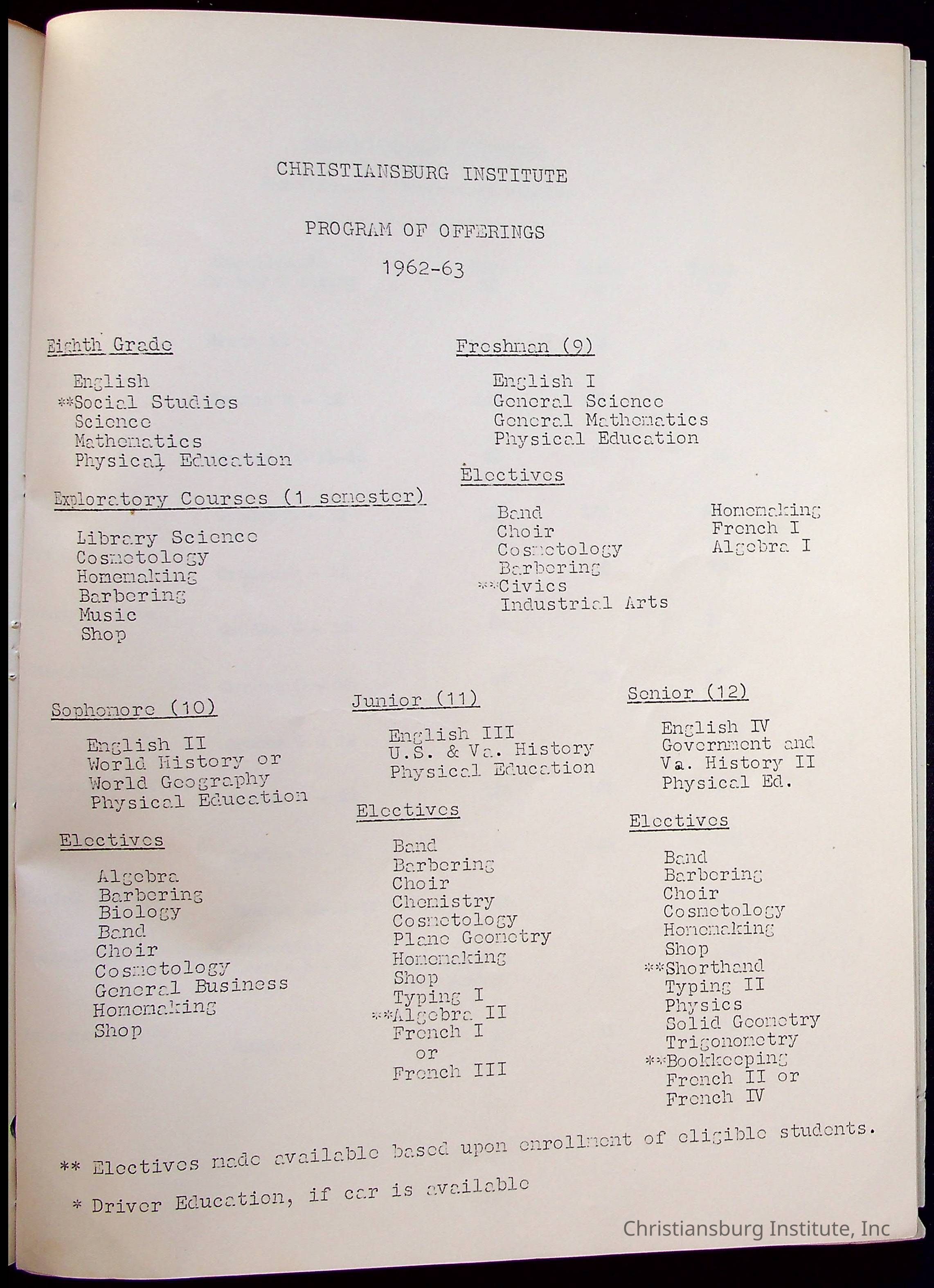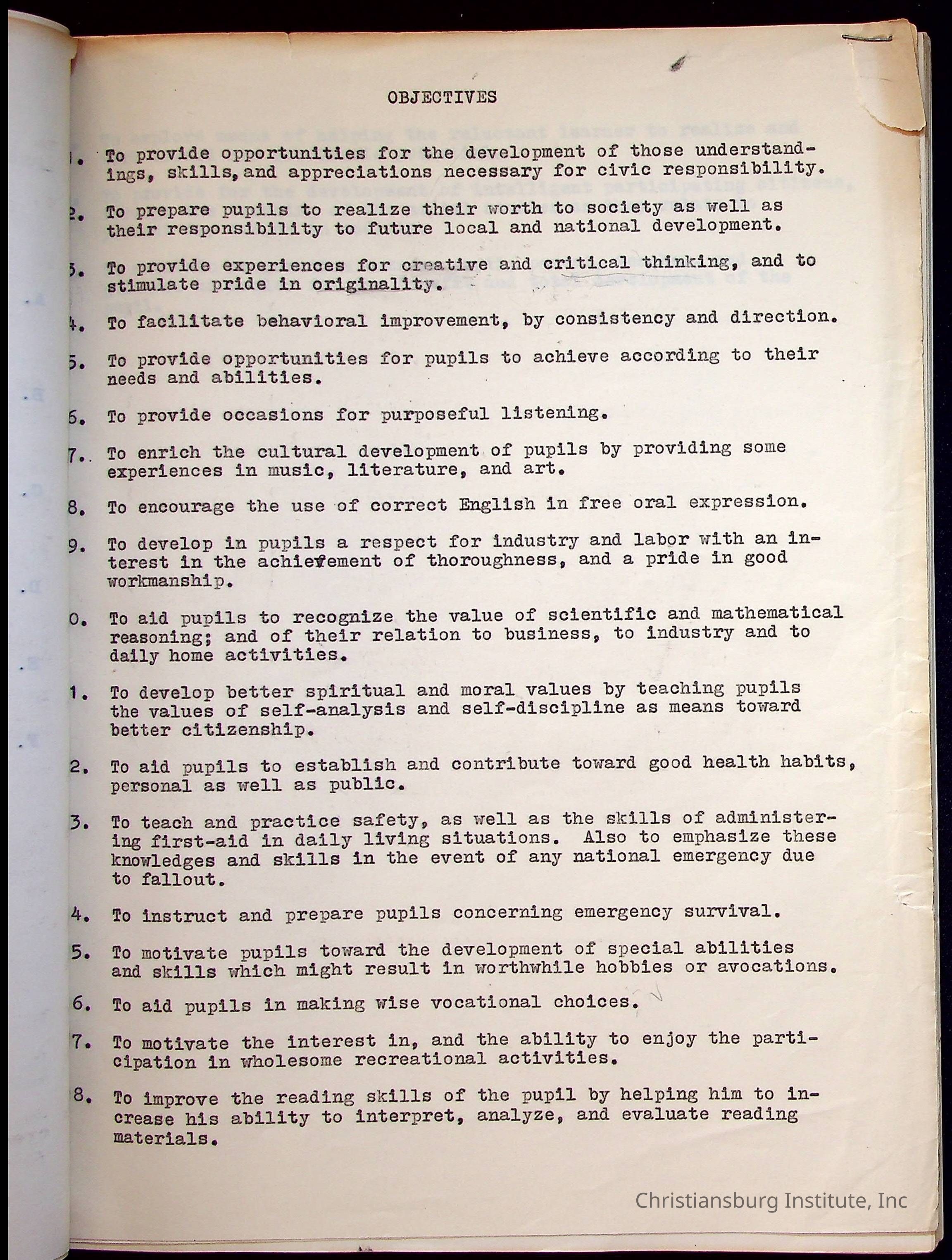 Christiansburg Institute Self Evaluation Summaries, this document was prepared for the Visiting Committee, dated April 28-30 and May 1, 1963.Creator