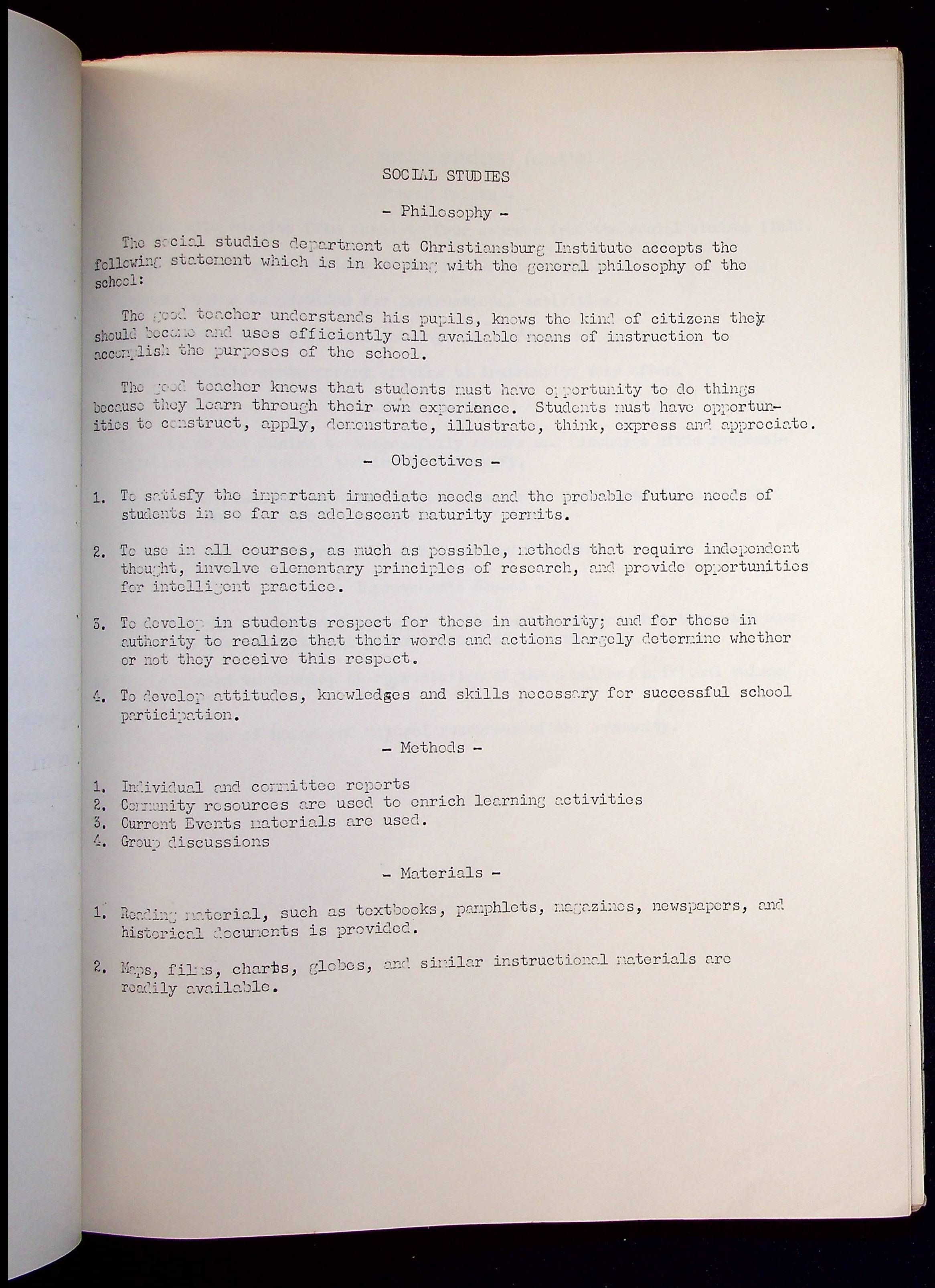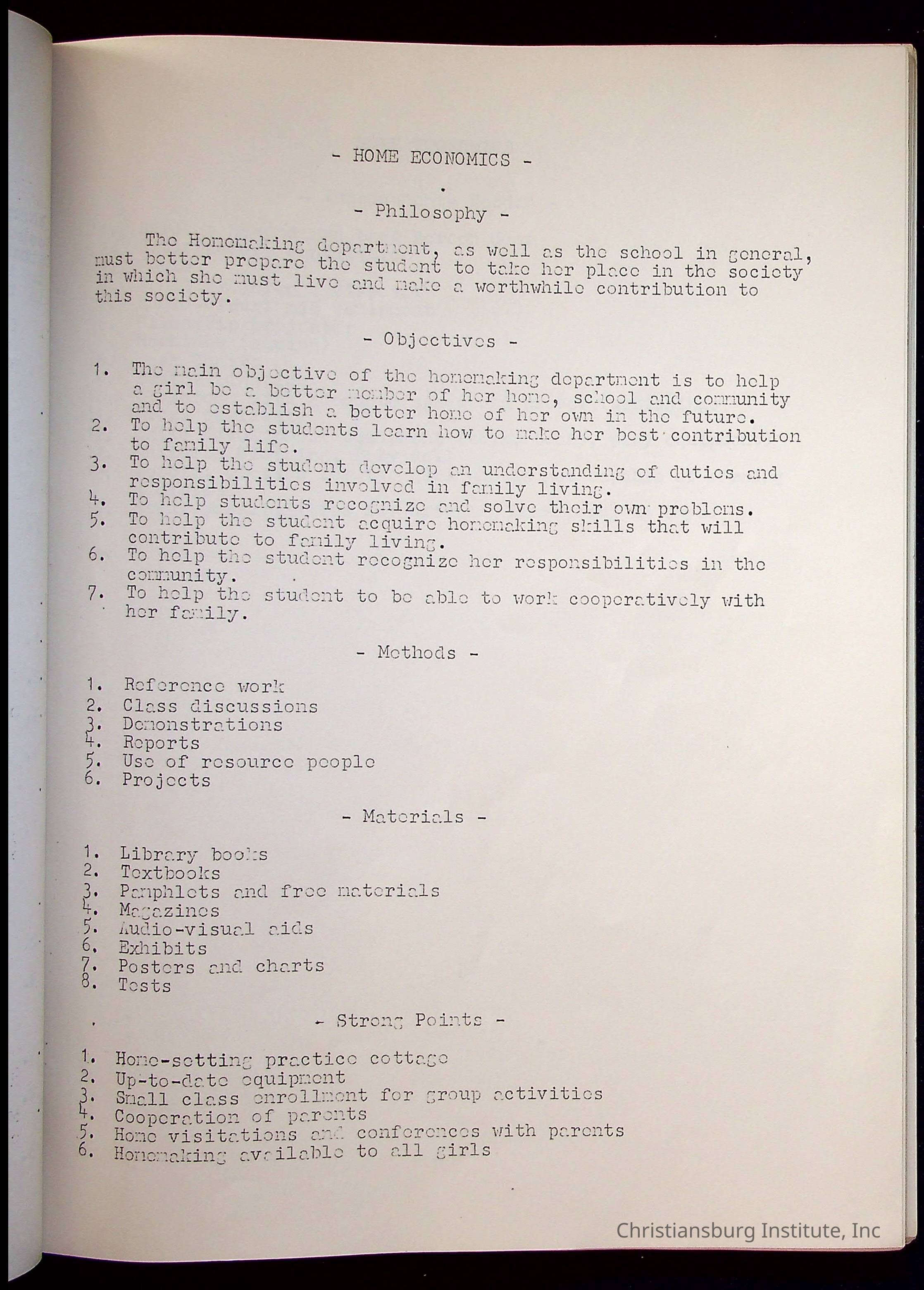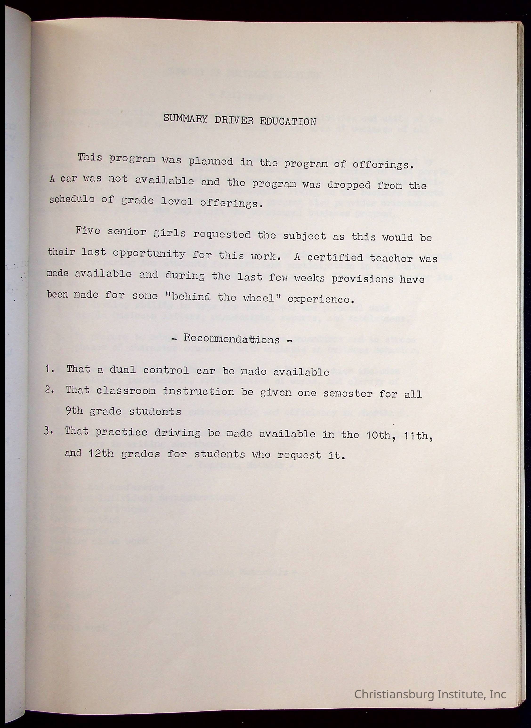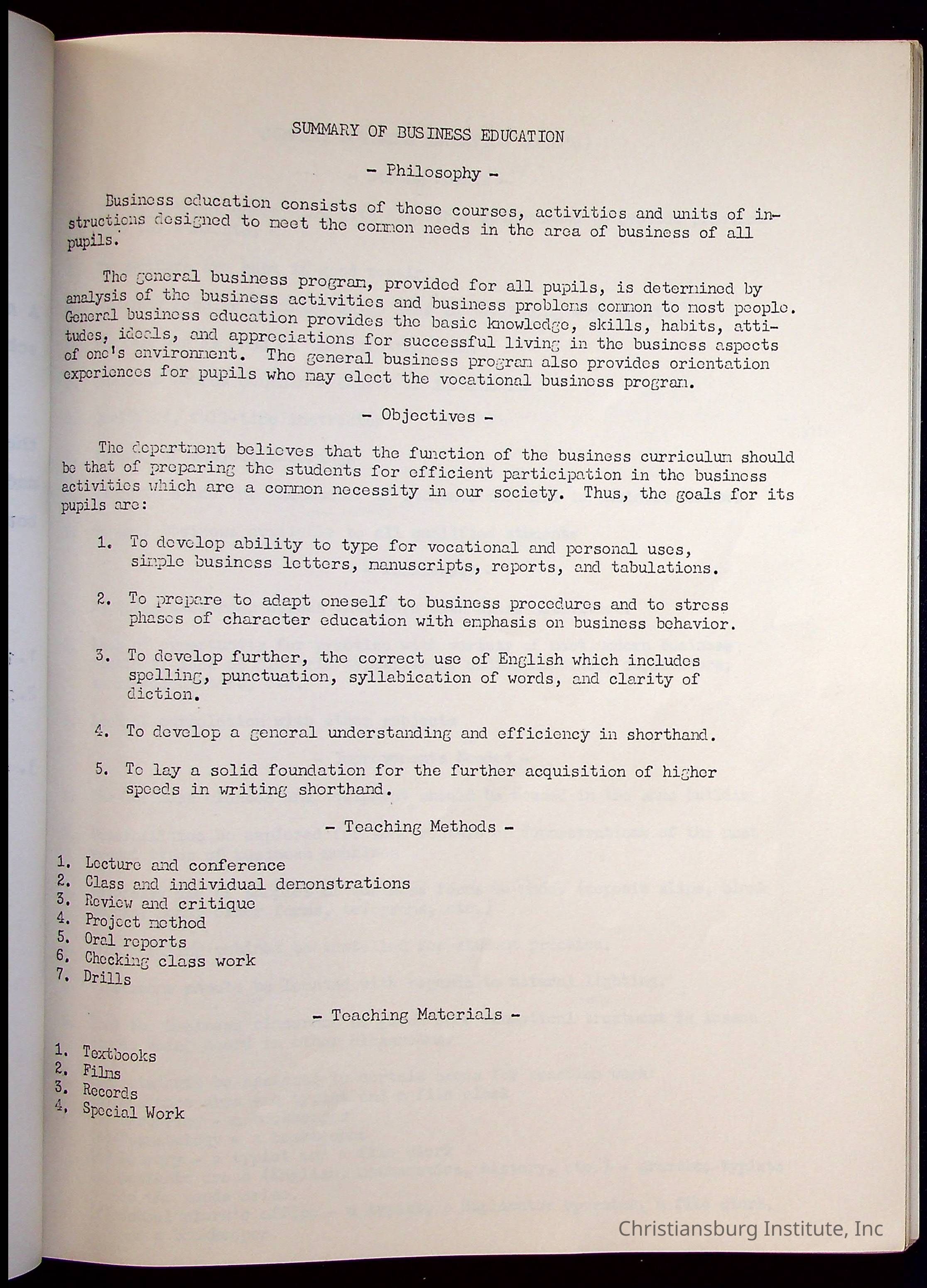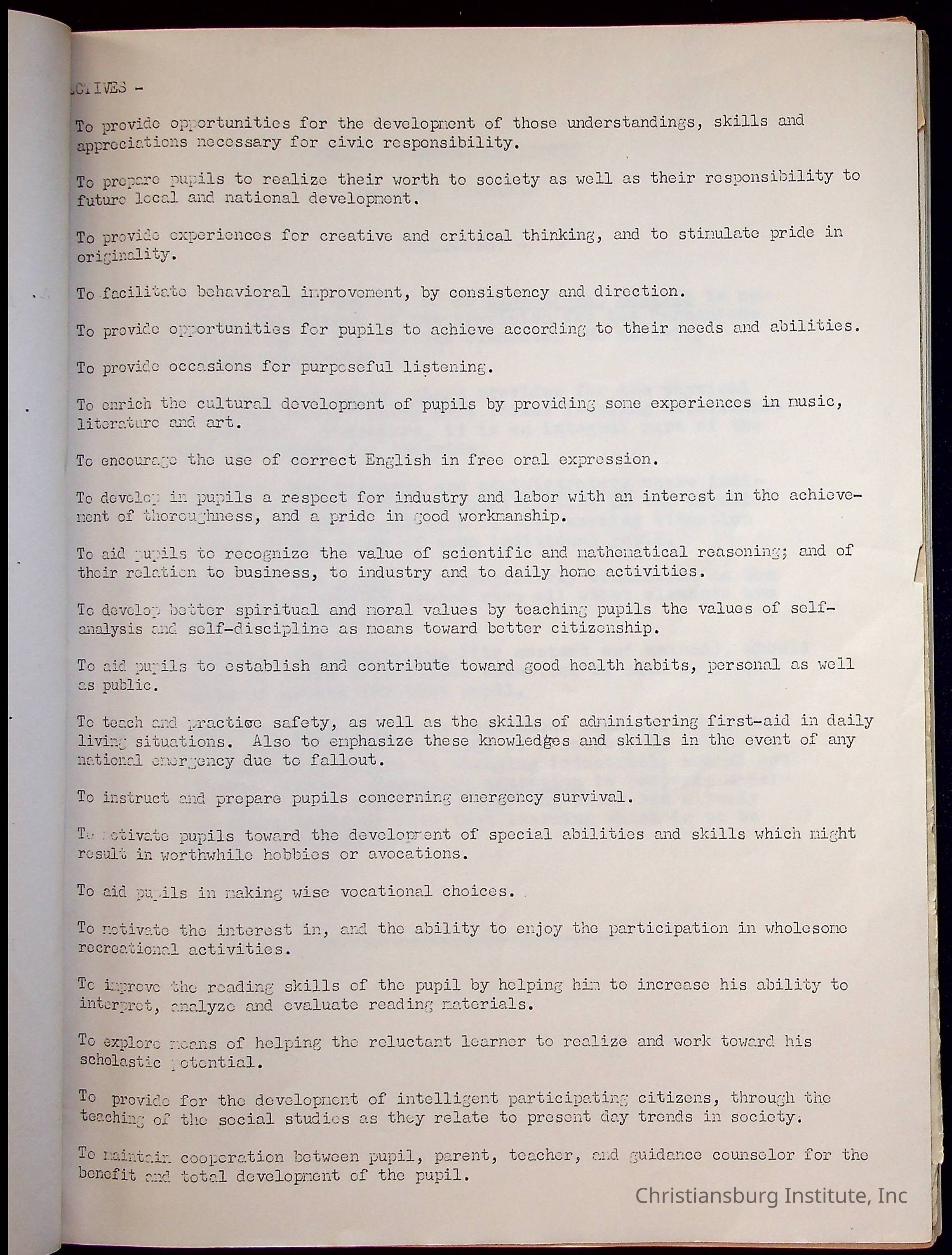 Christiansburg Institute Self Evaluation Summaries, this document was prepared for the Visiting Committee, dated April 28-30 and May 1, 1963.Creator