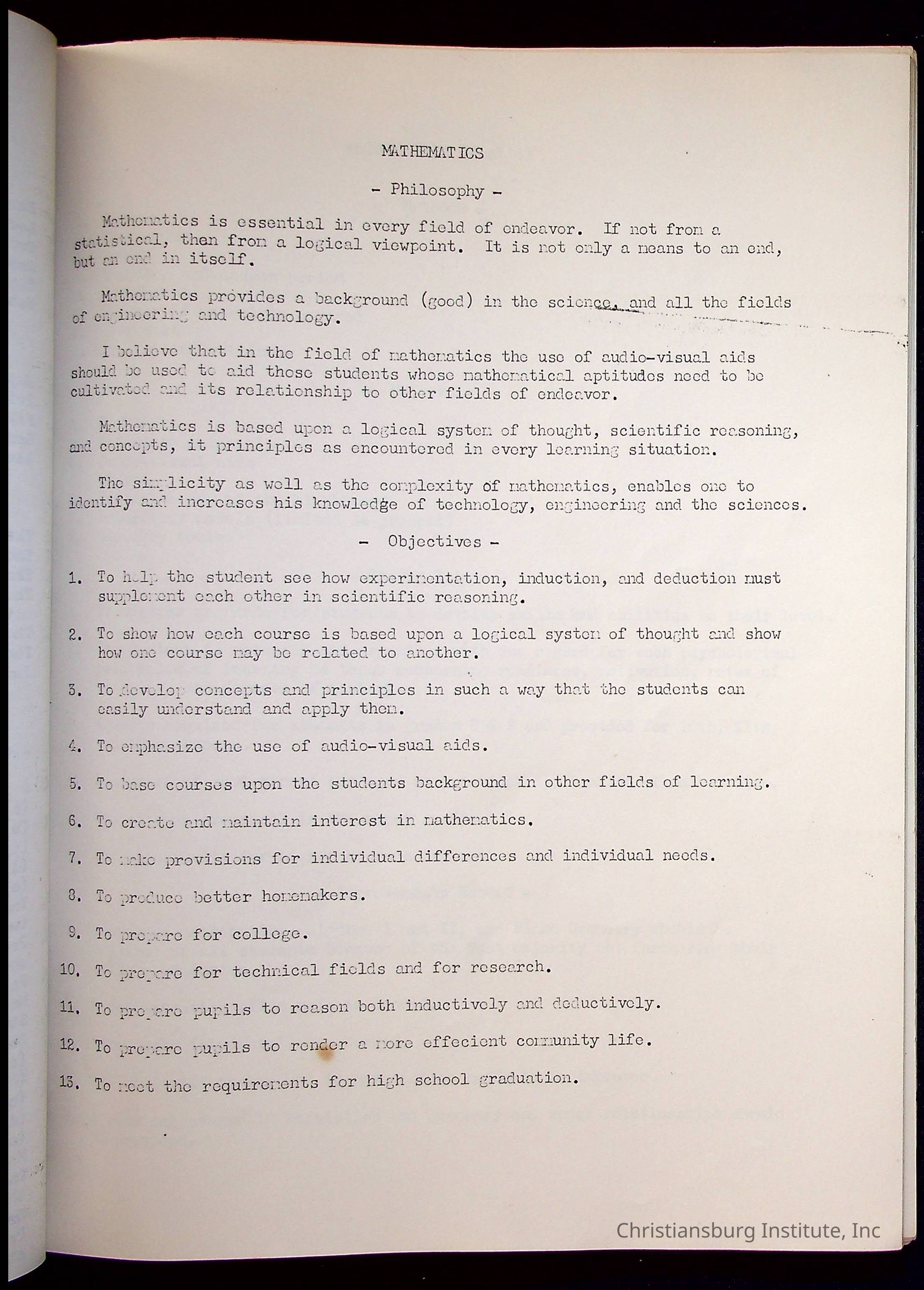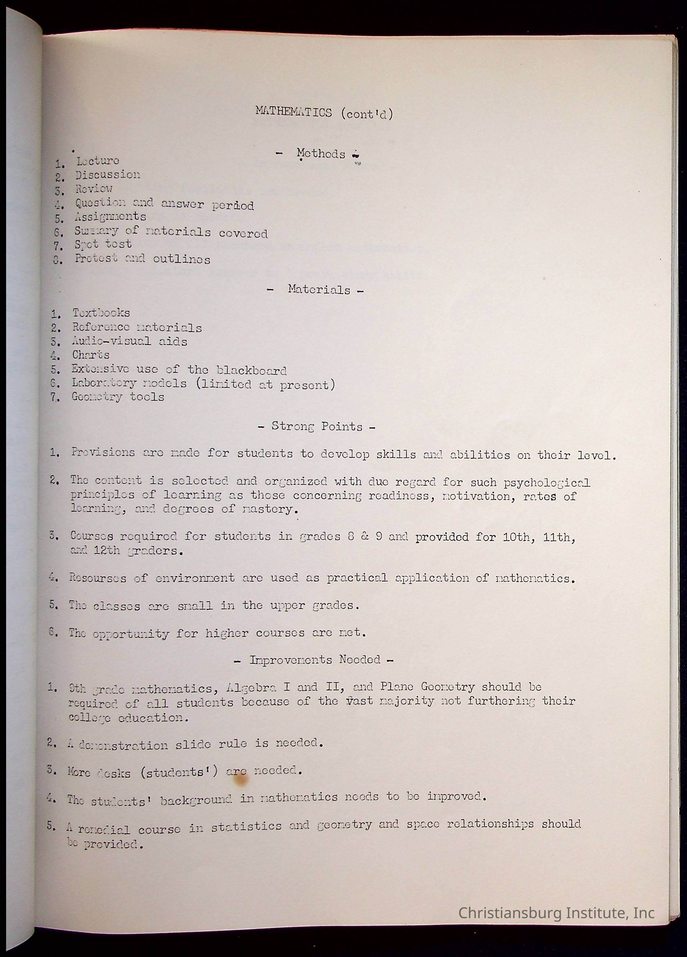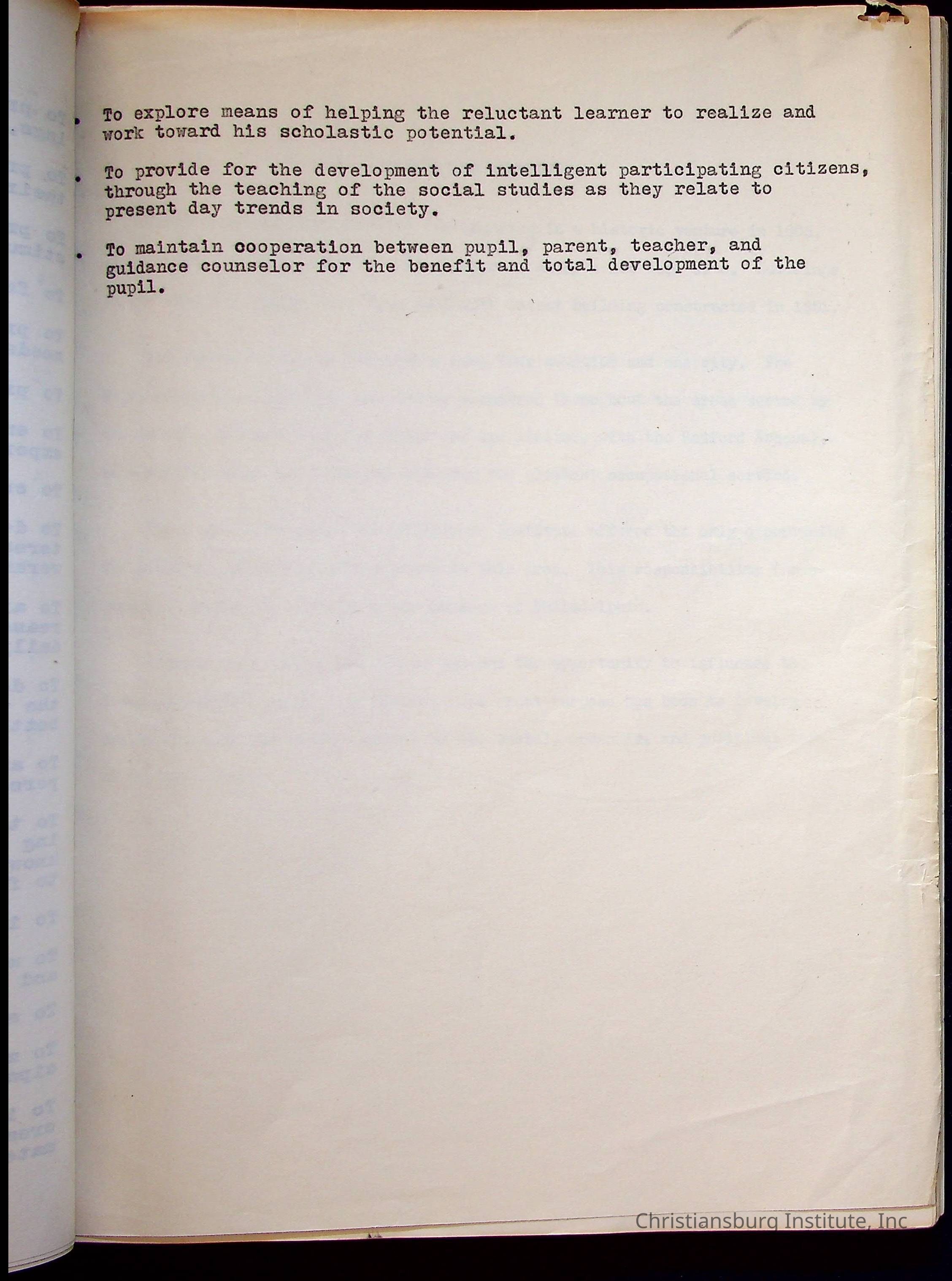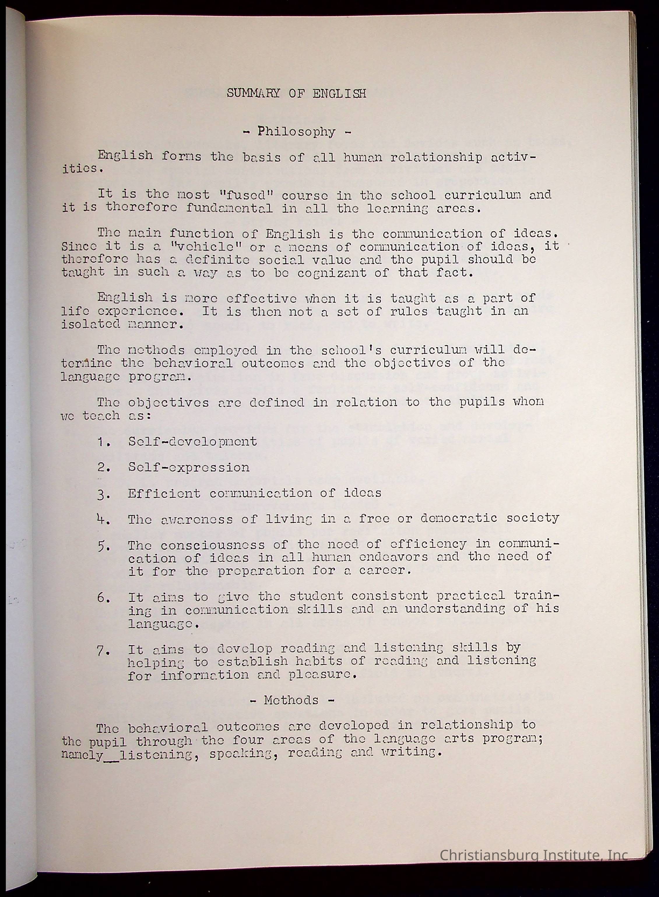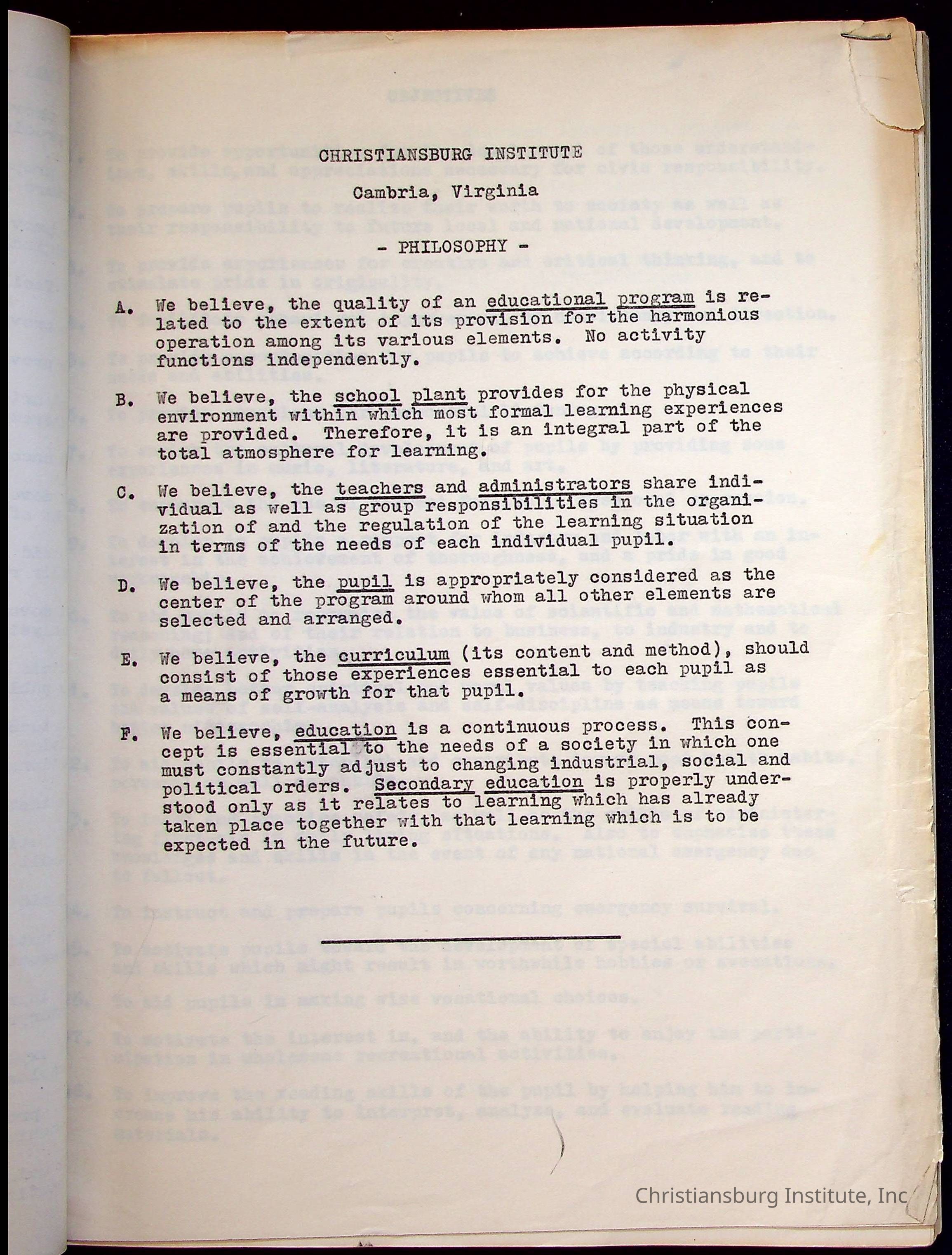 Christiansburg Institute Self Evaluation Summaries, this document was prepared for the Visiting Committee, dated April 28-30 and May 1, 1963.Creator