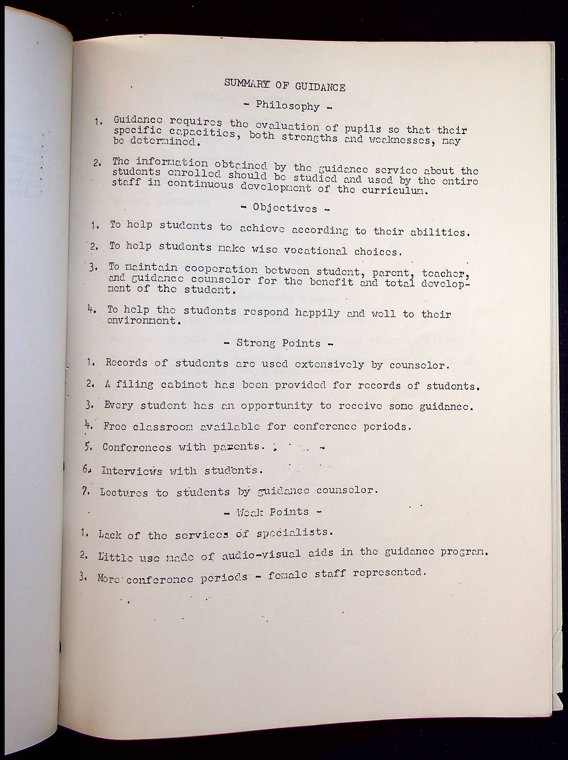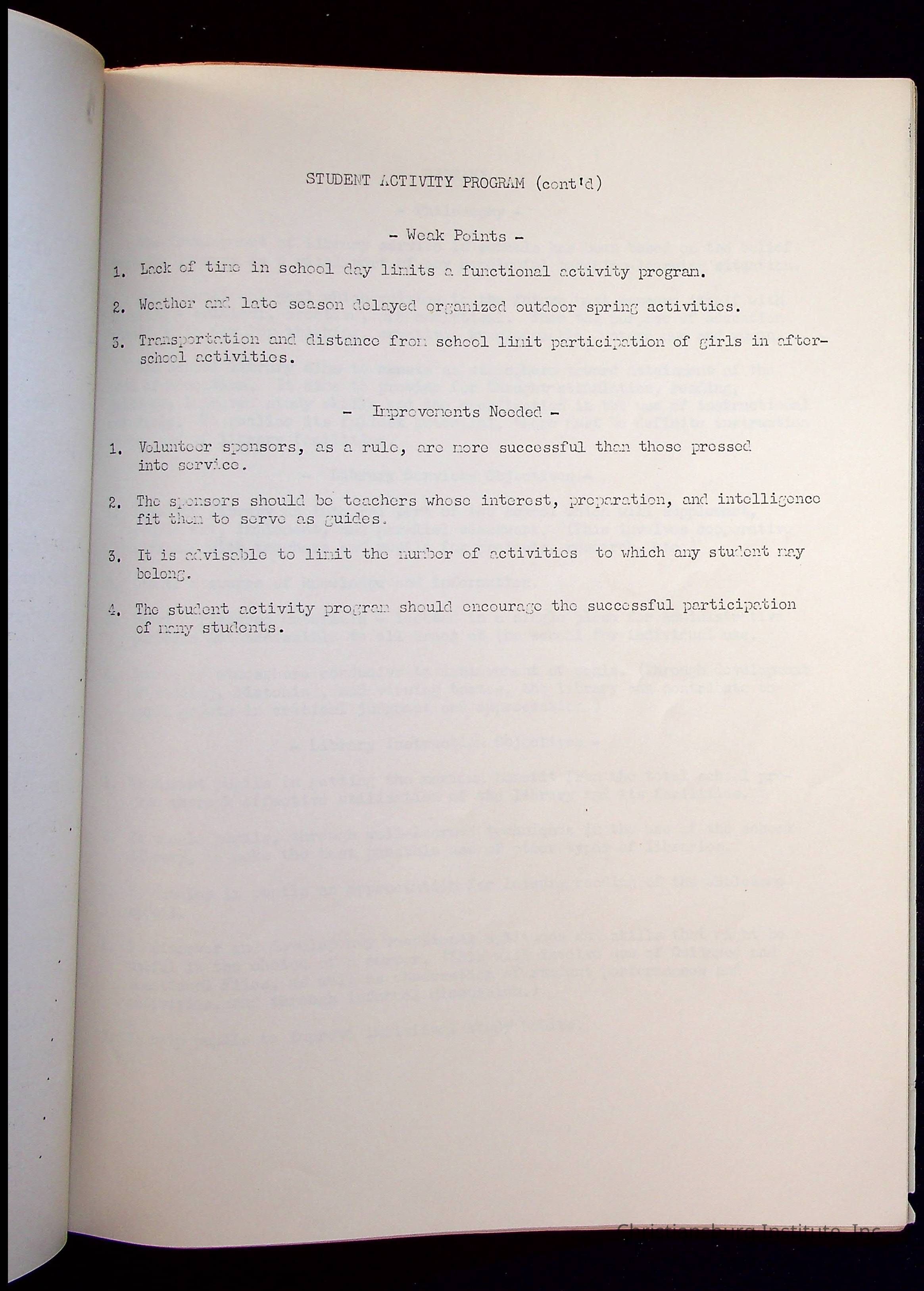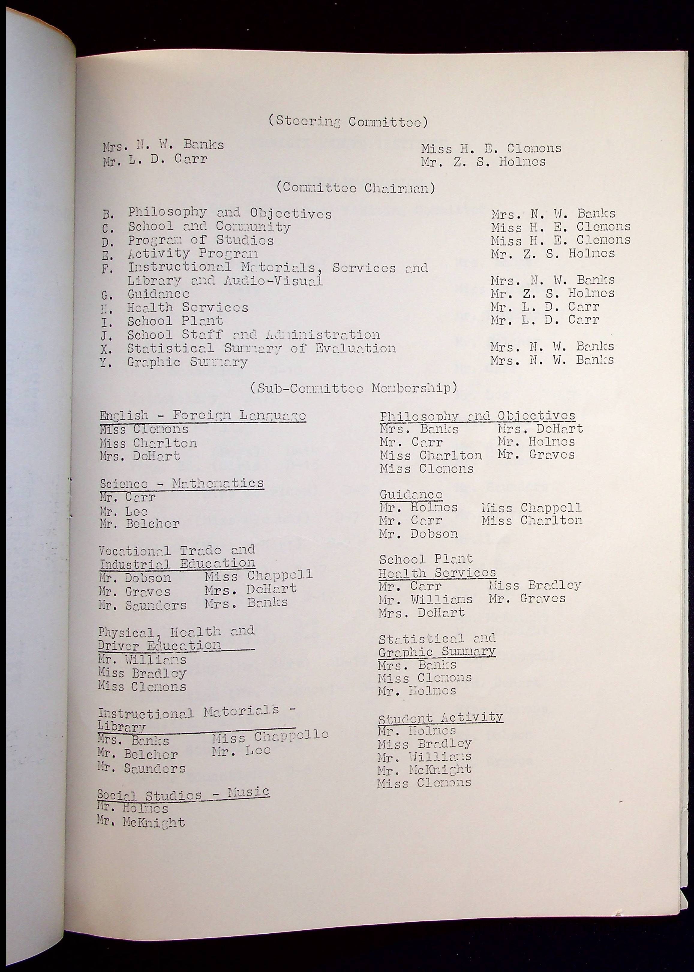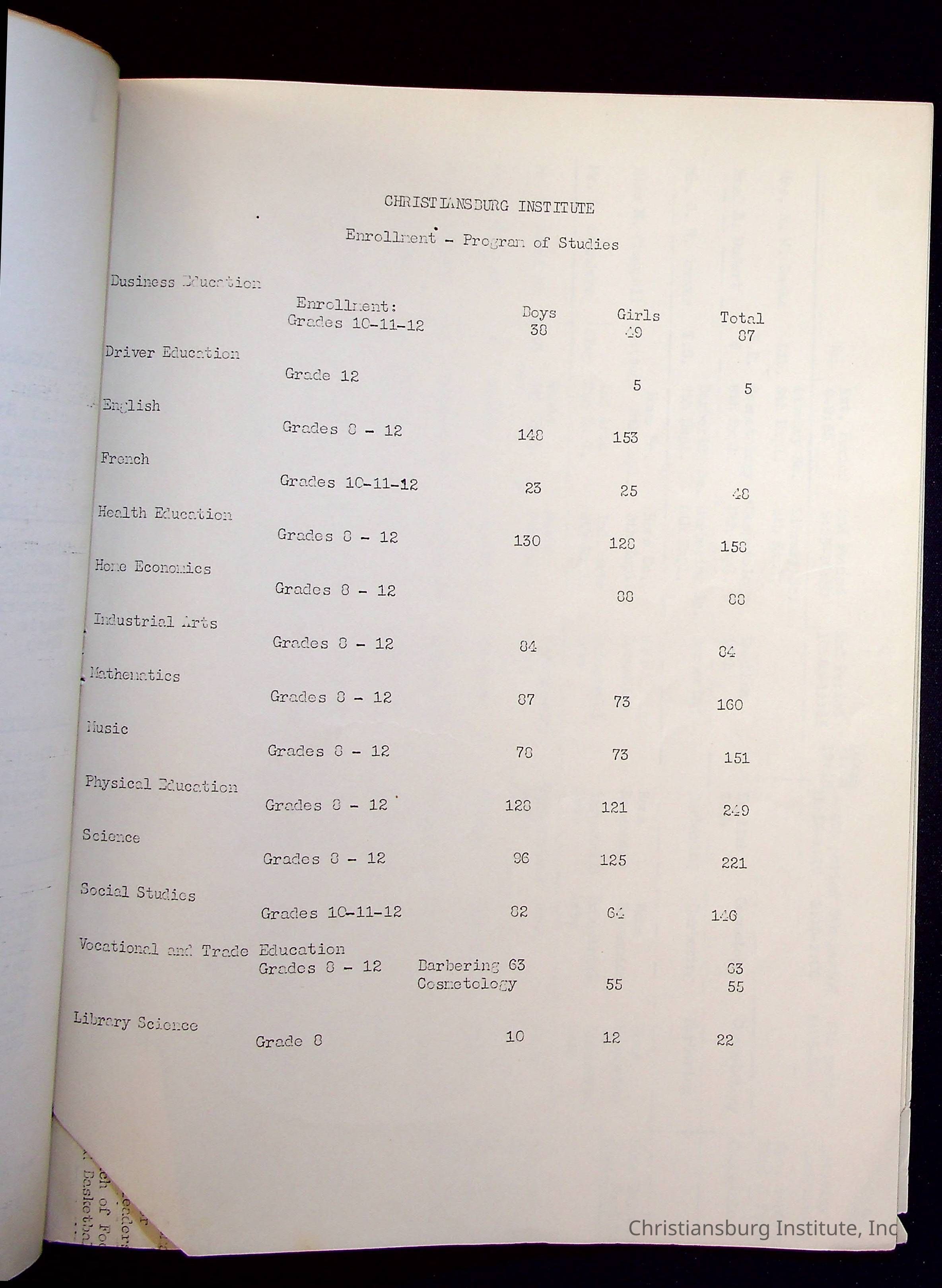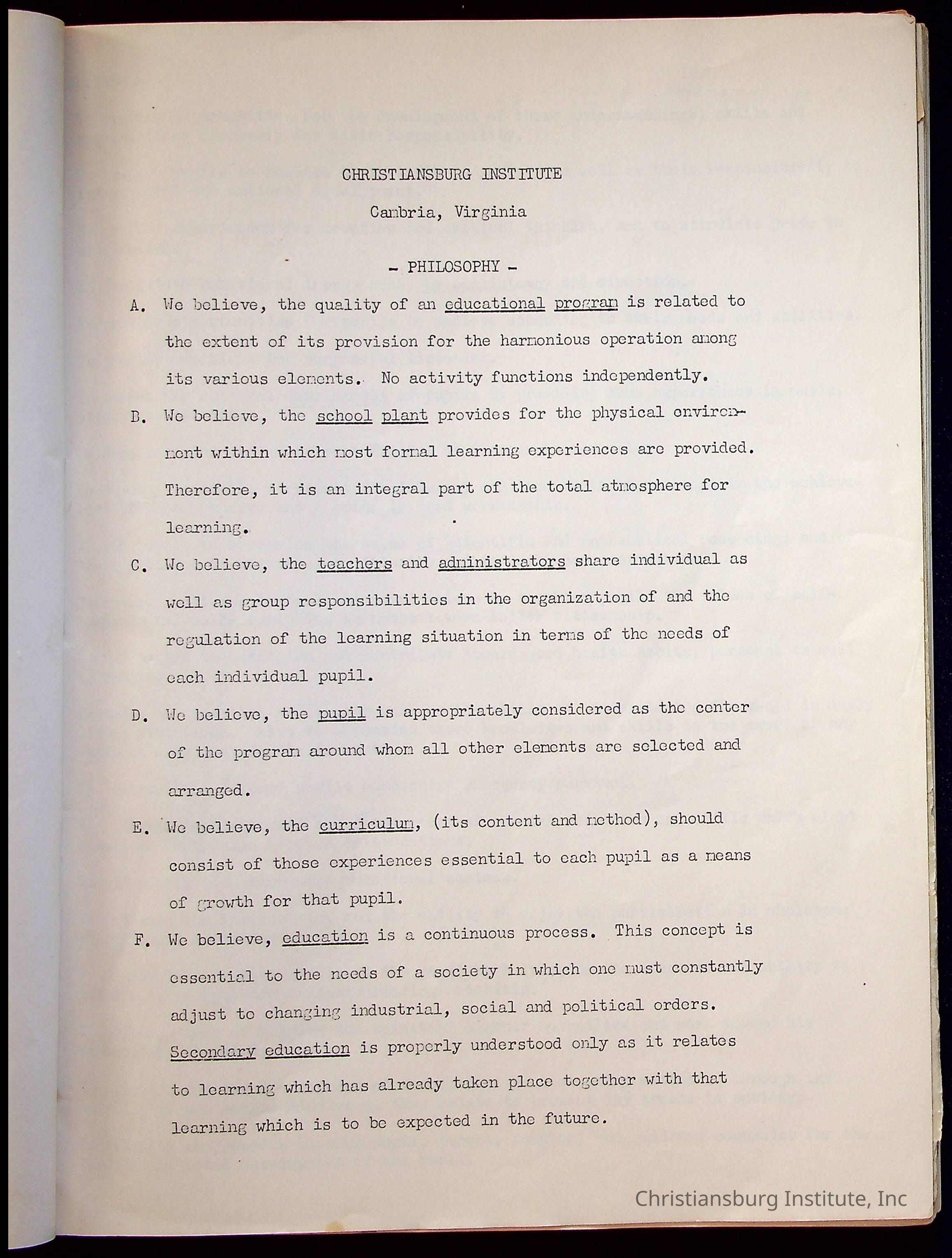 Christiansburg Institute Self Evaluation Summaries, this document was prepared for the Visiting Committee, dated April 28-30 and May 1, 1963.Creator