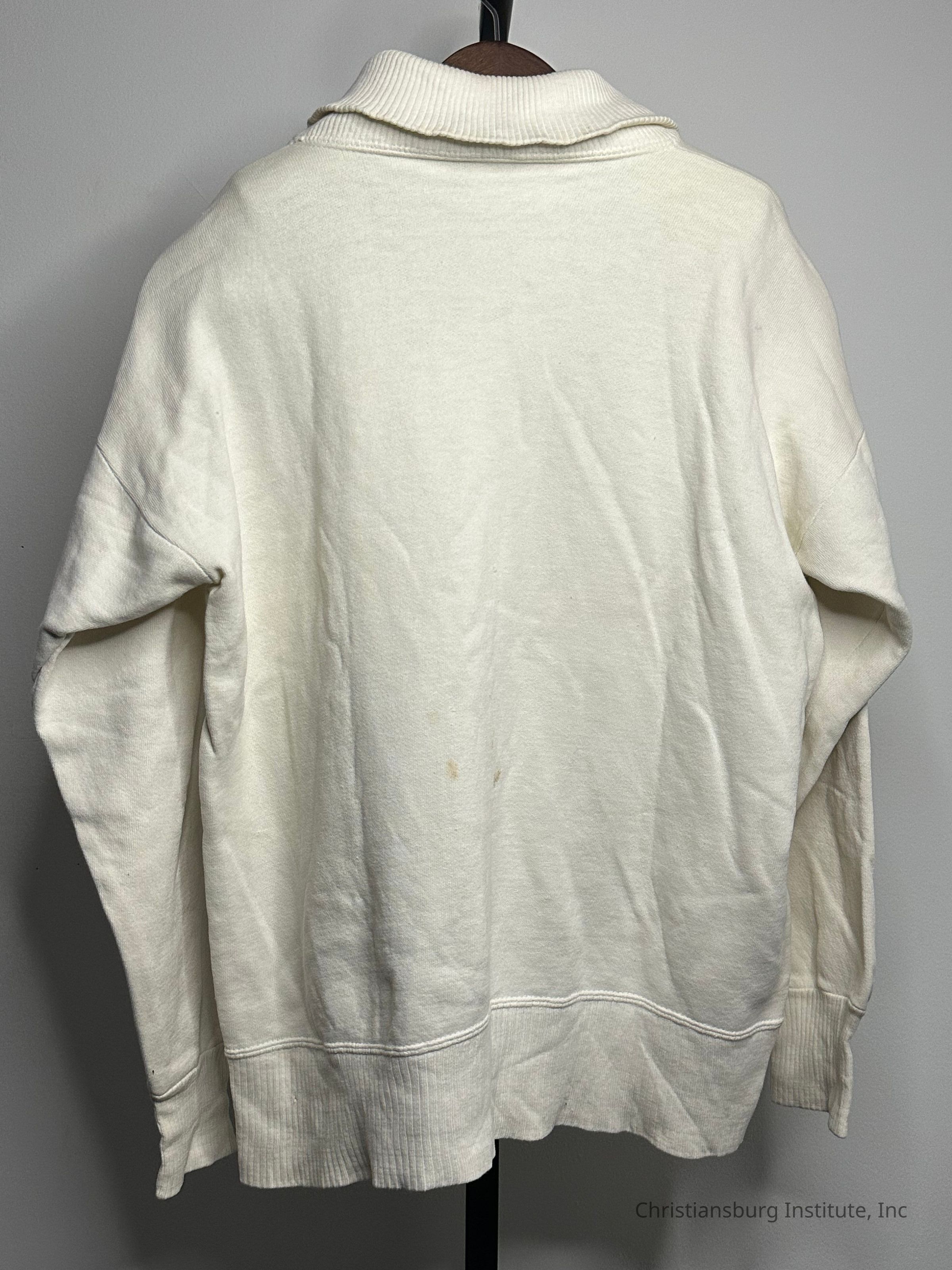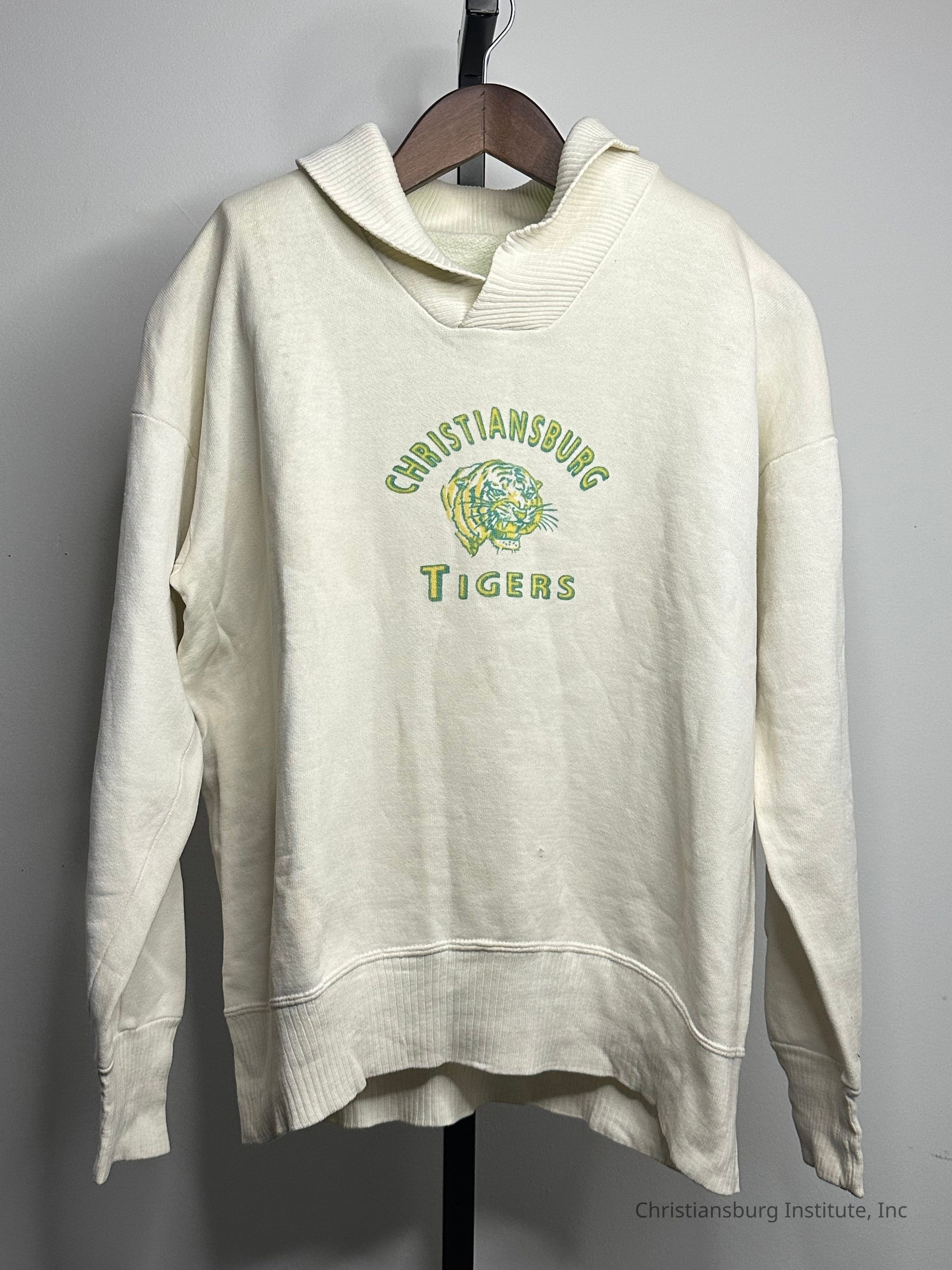 A white Christiansburg Institute sweater with a green and yellow tiger decal, undated.Collection