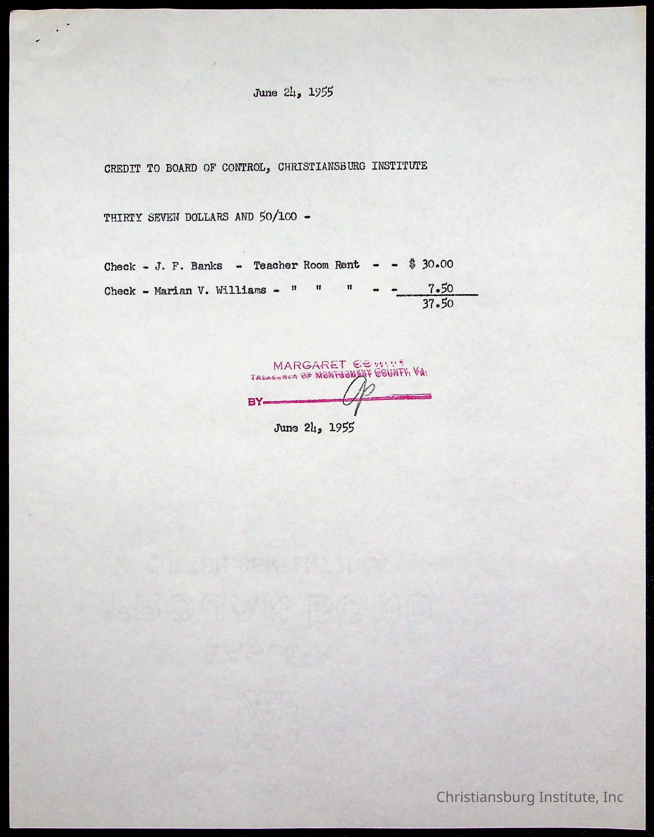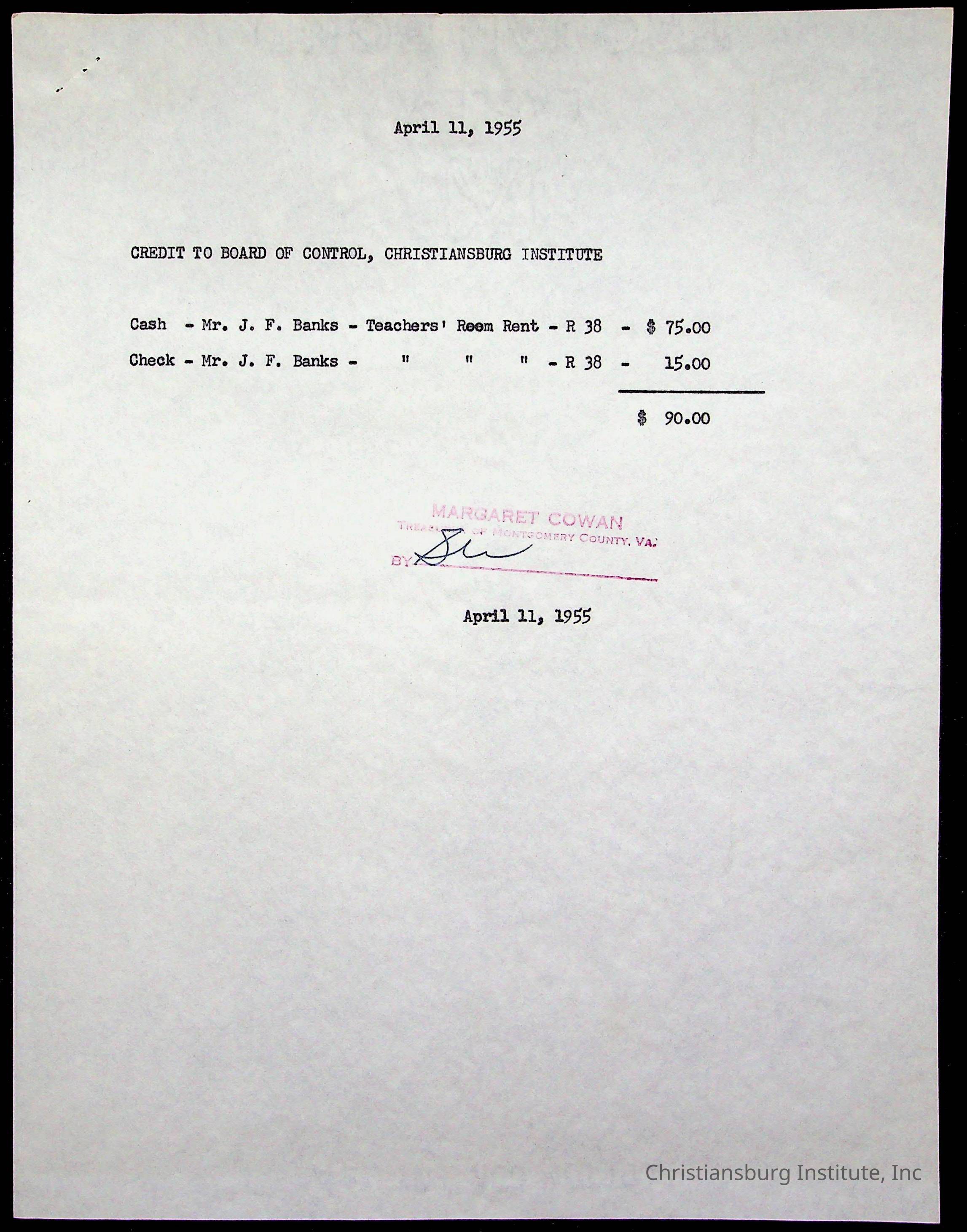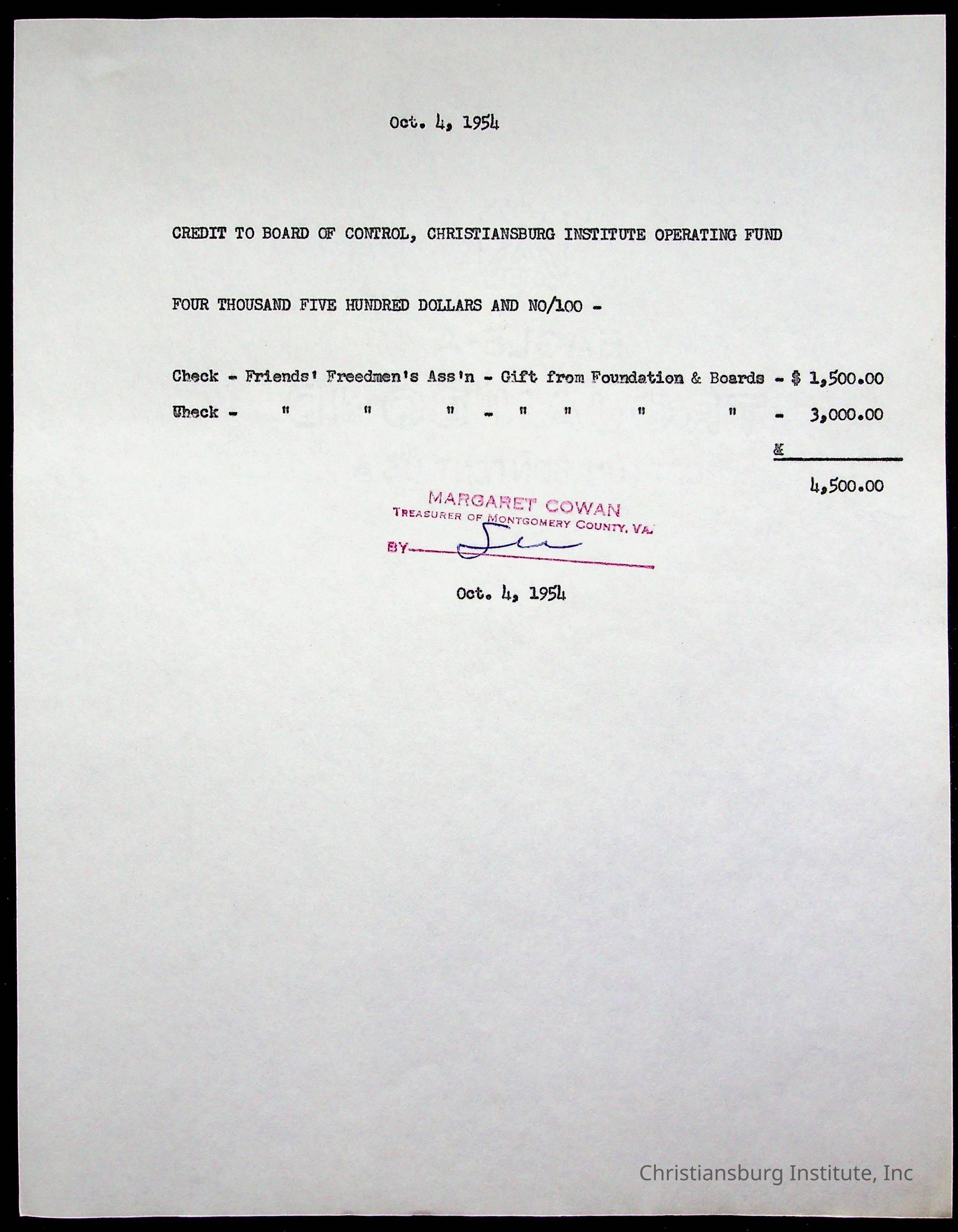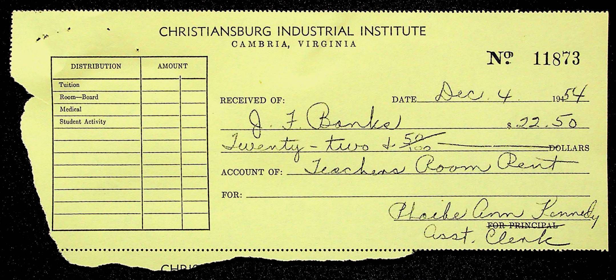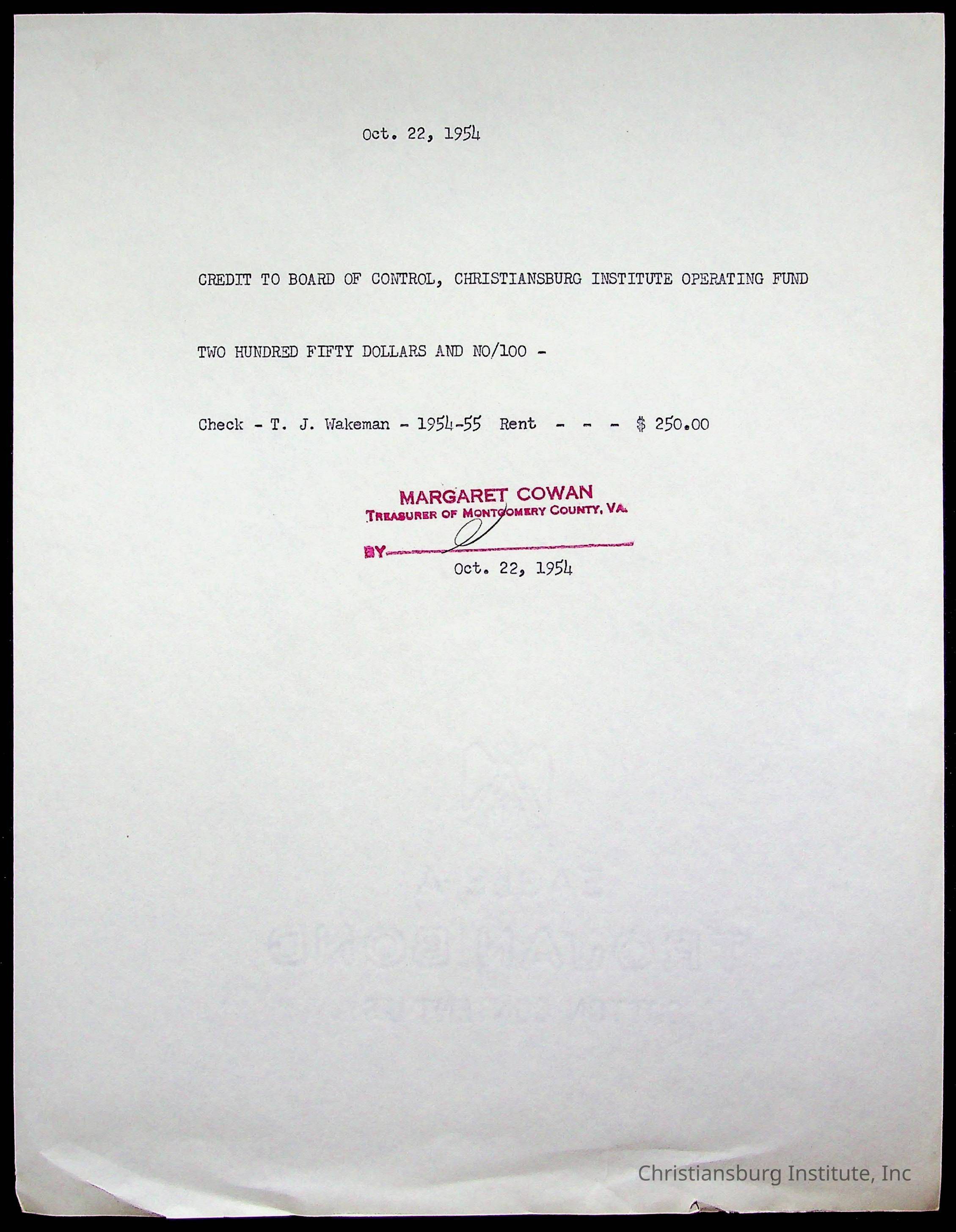 Christiansburg Institute Treasury Receipts, 1954-1955