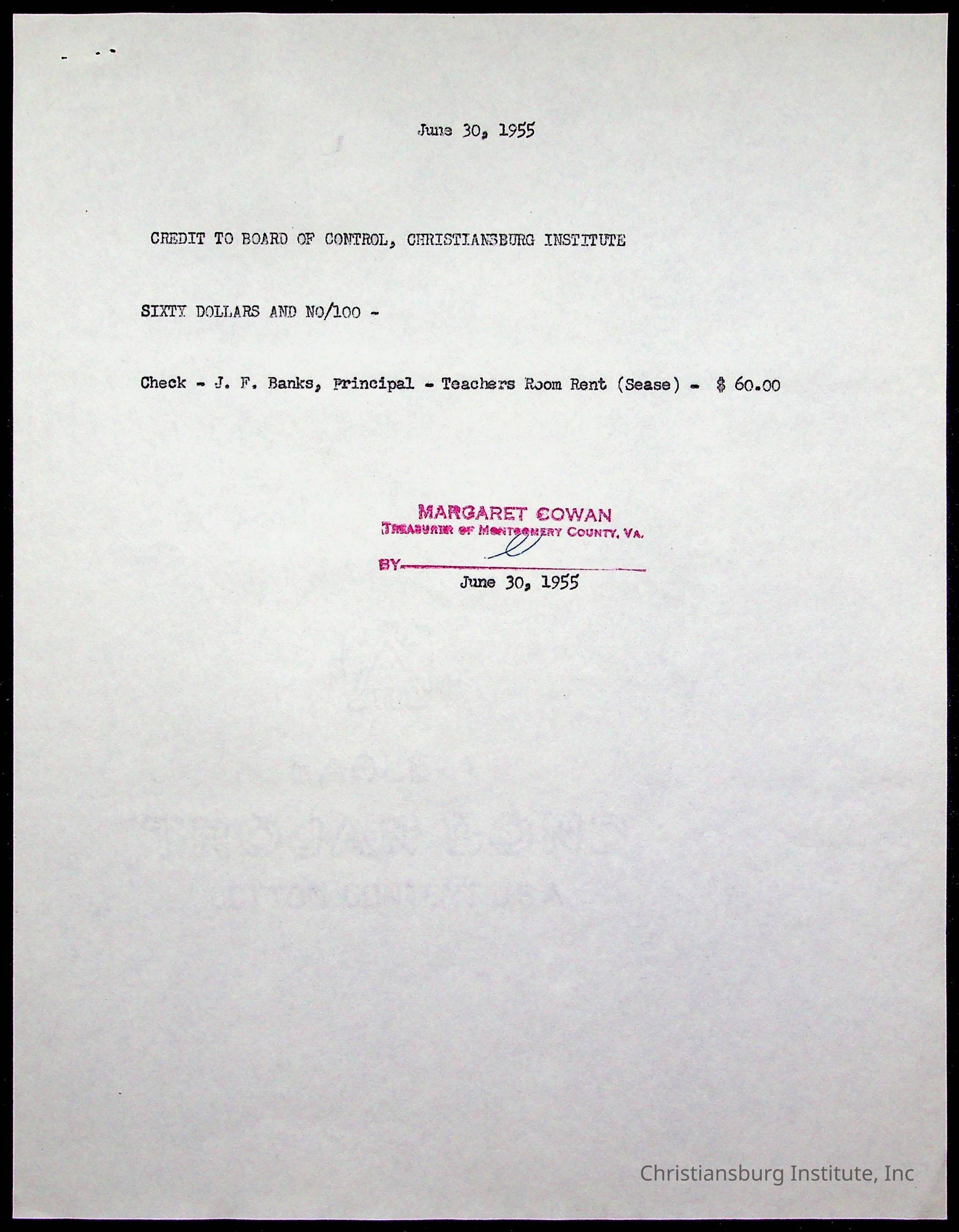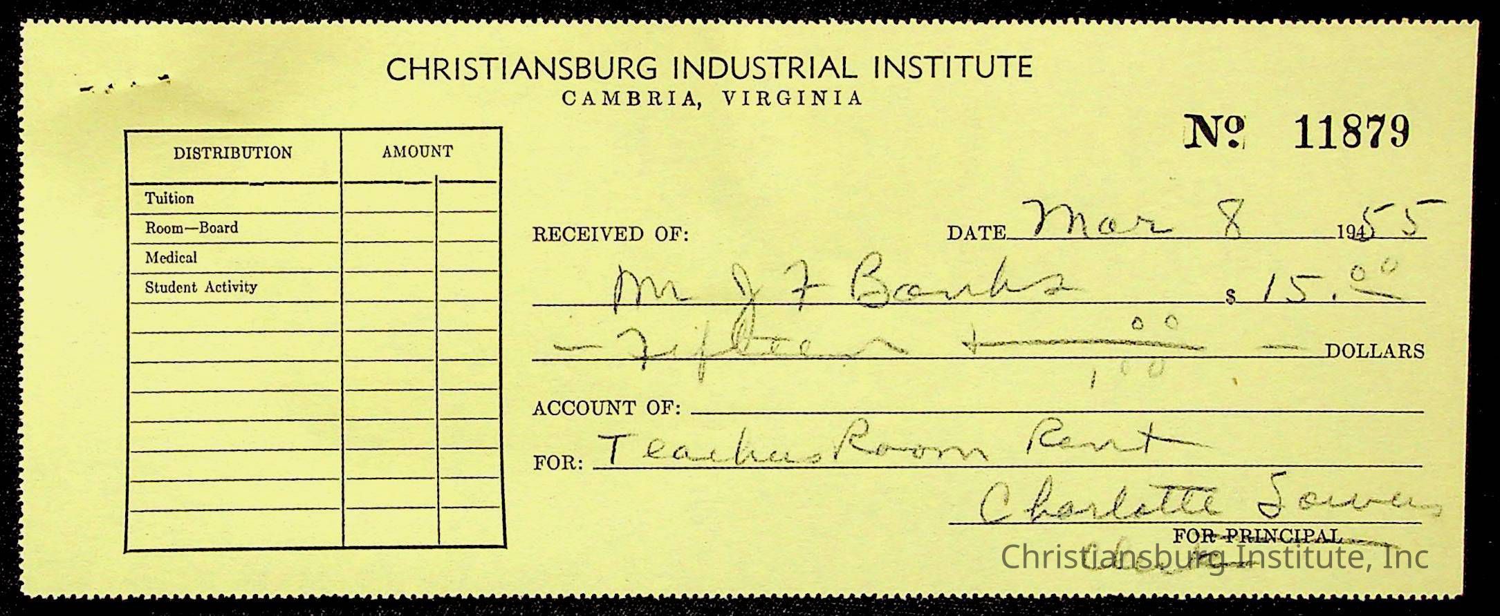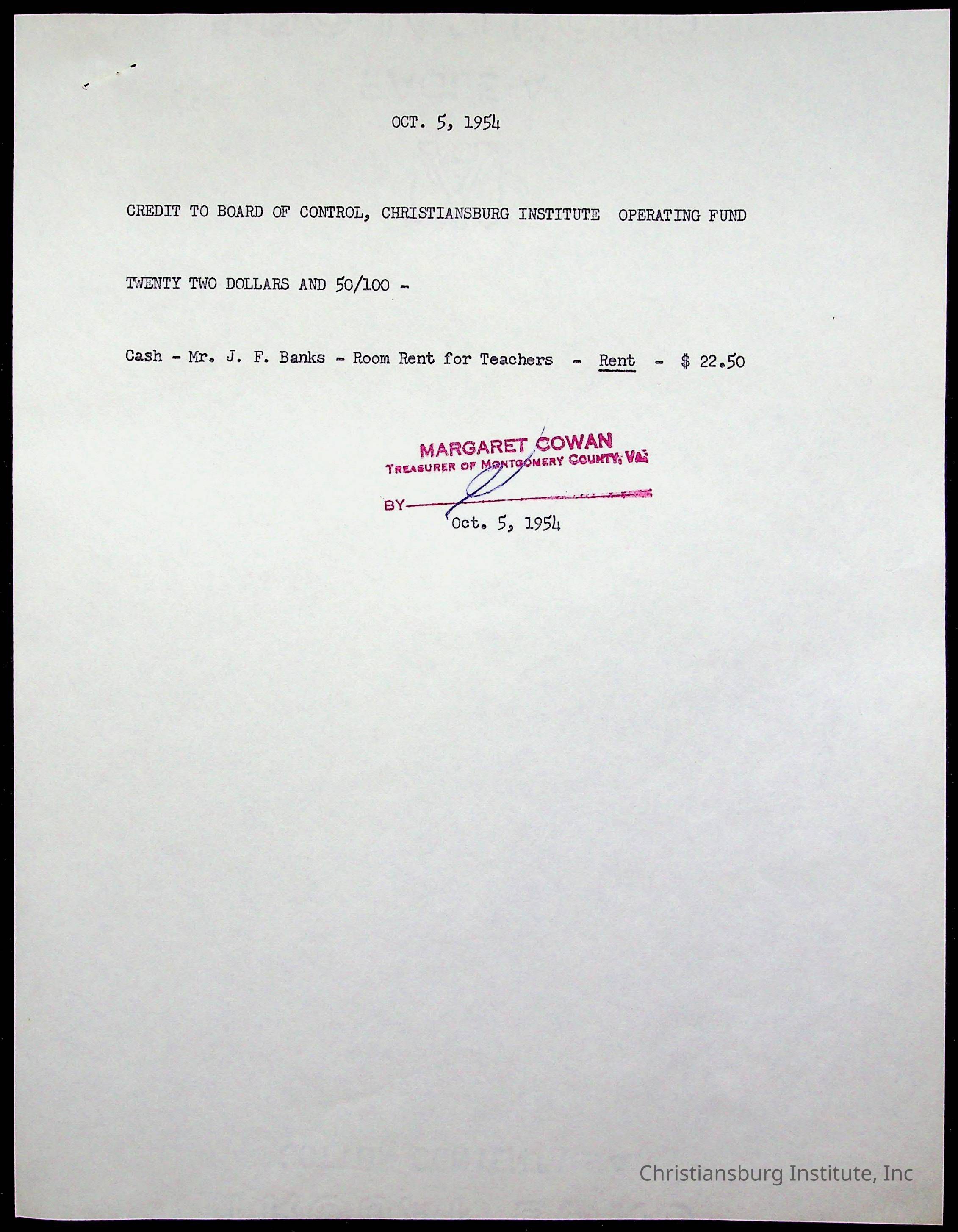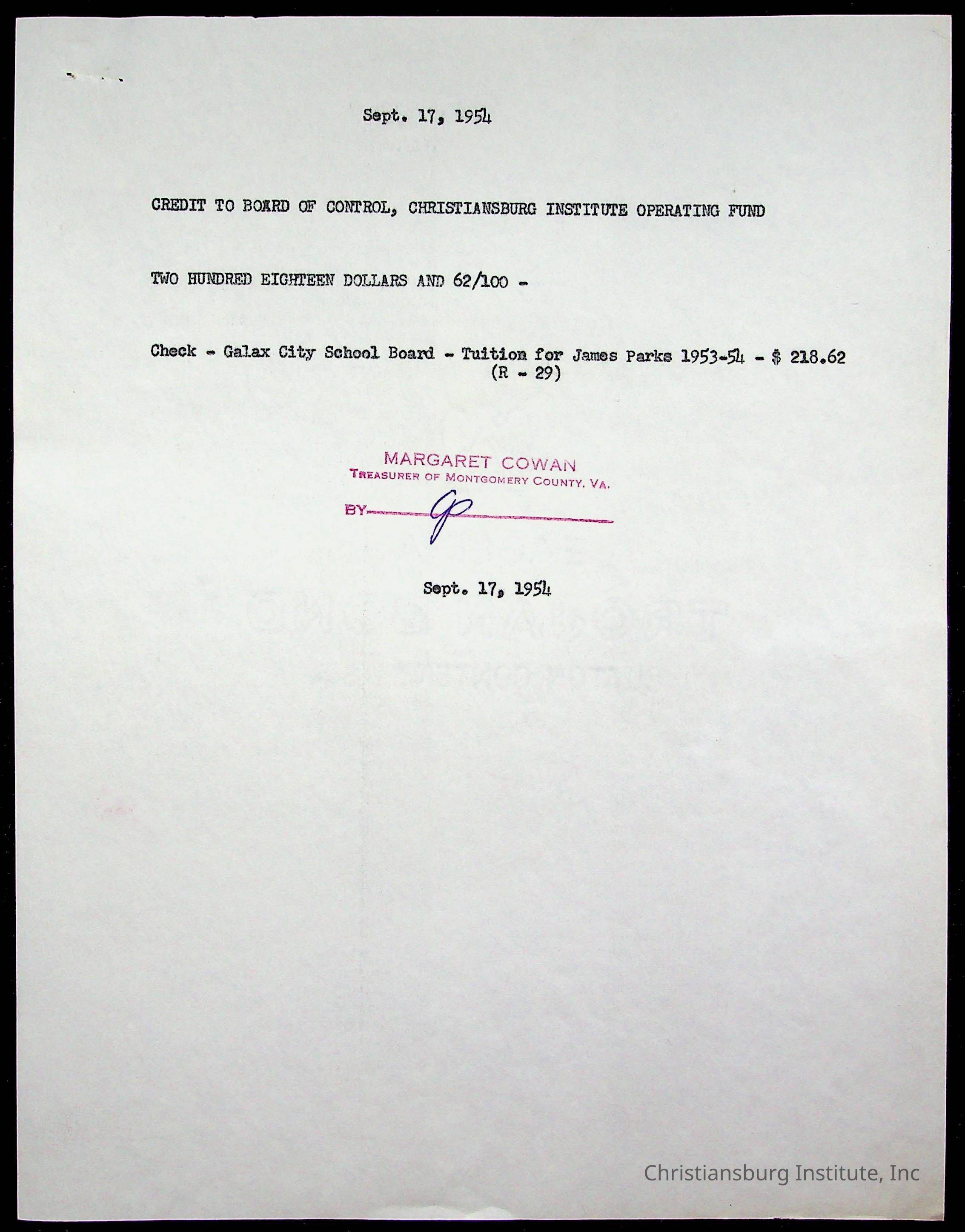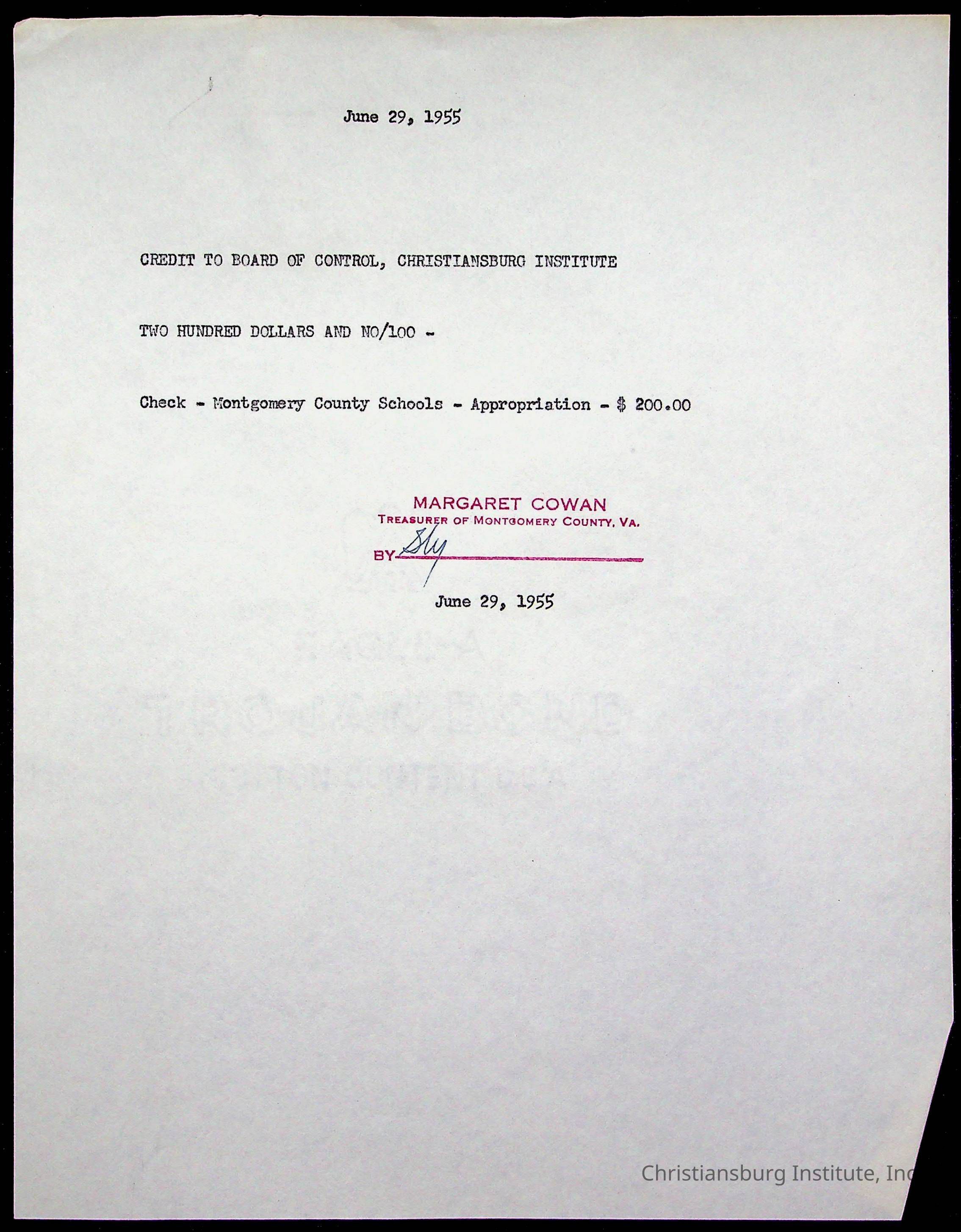 Christiansburg Institute Treasury Receipts, 1954-1955
