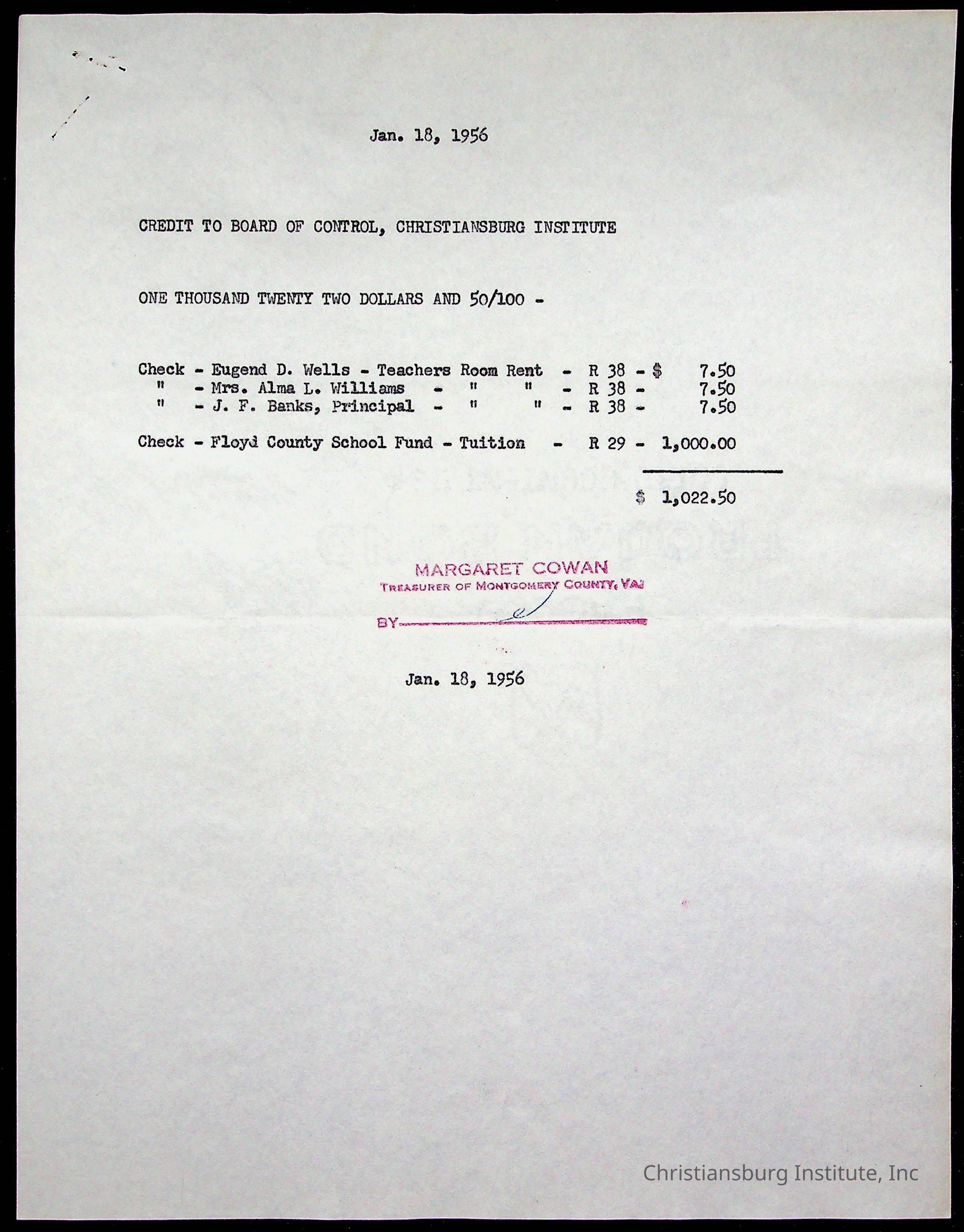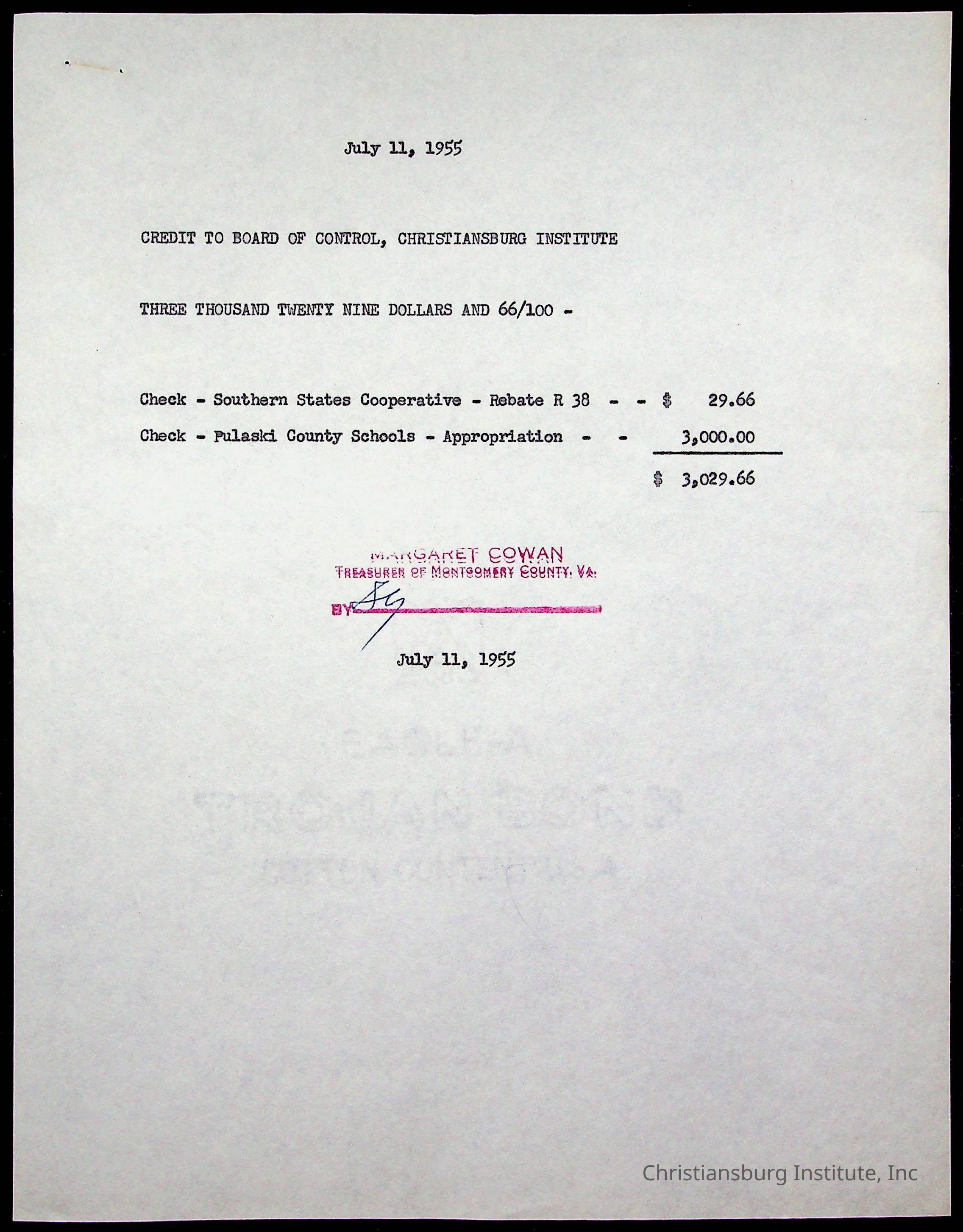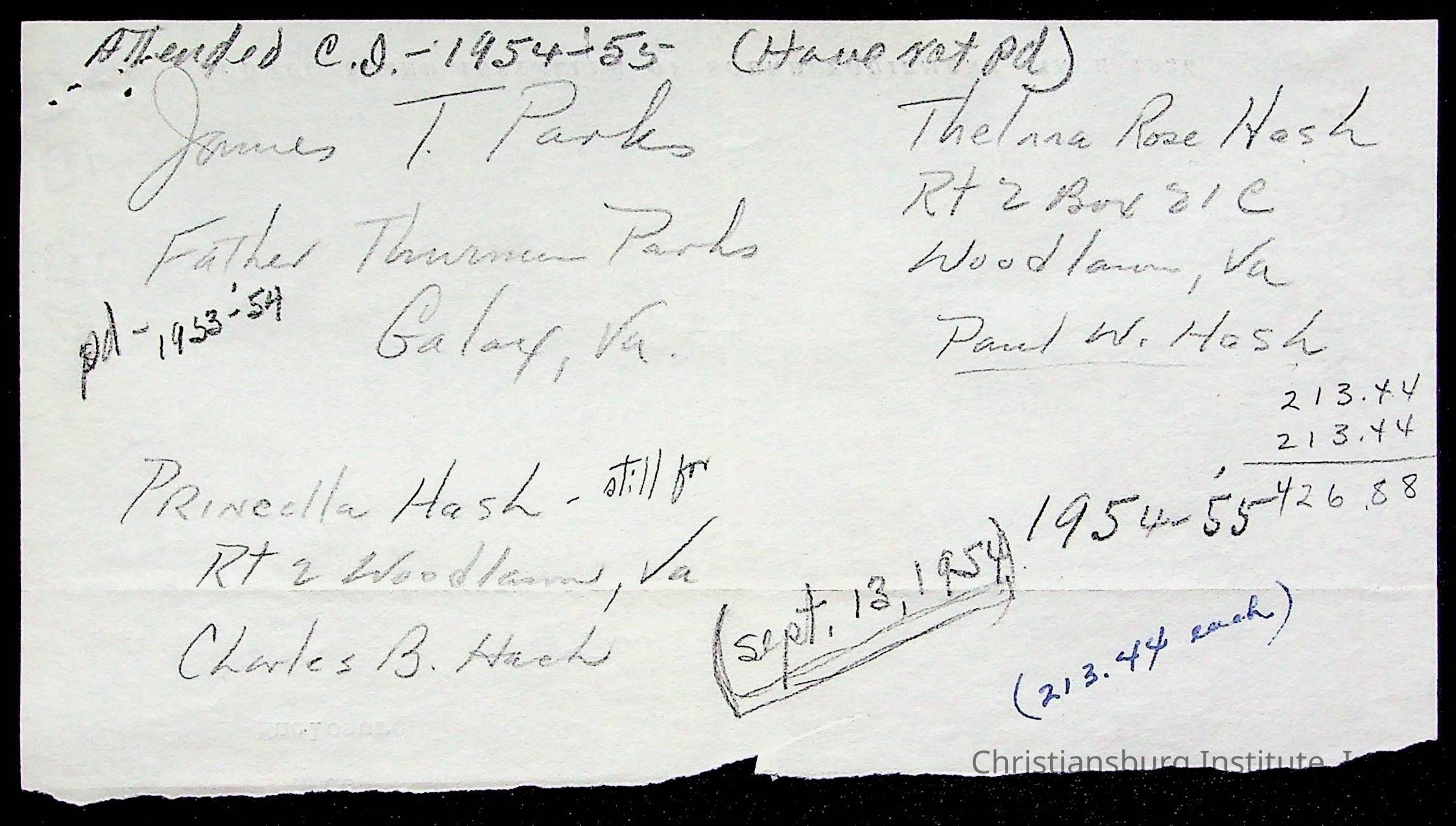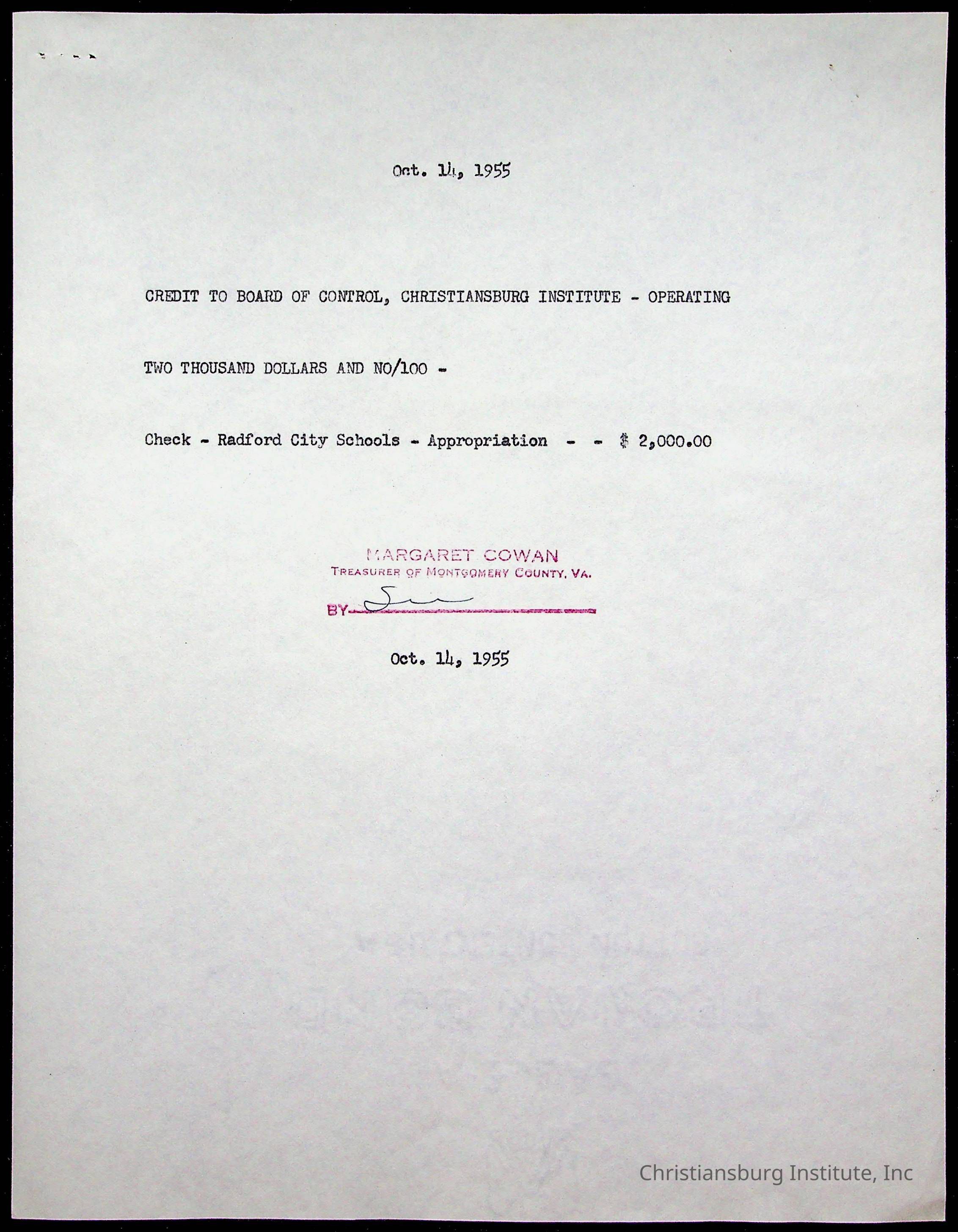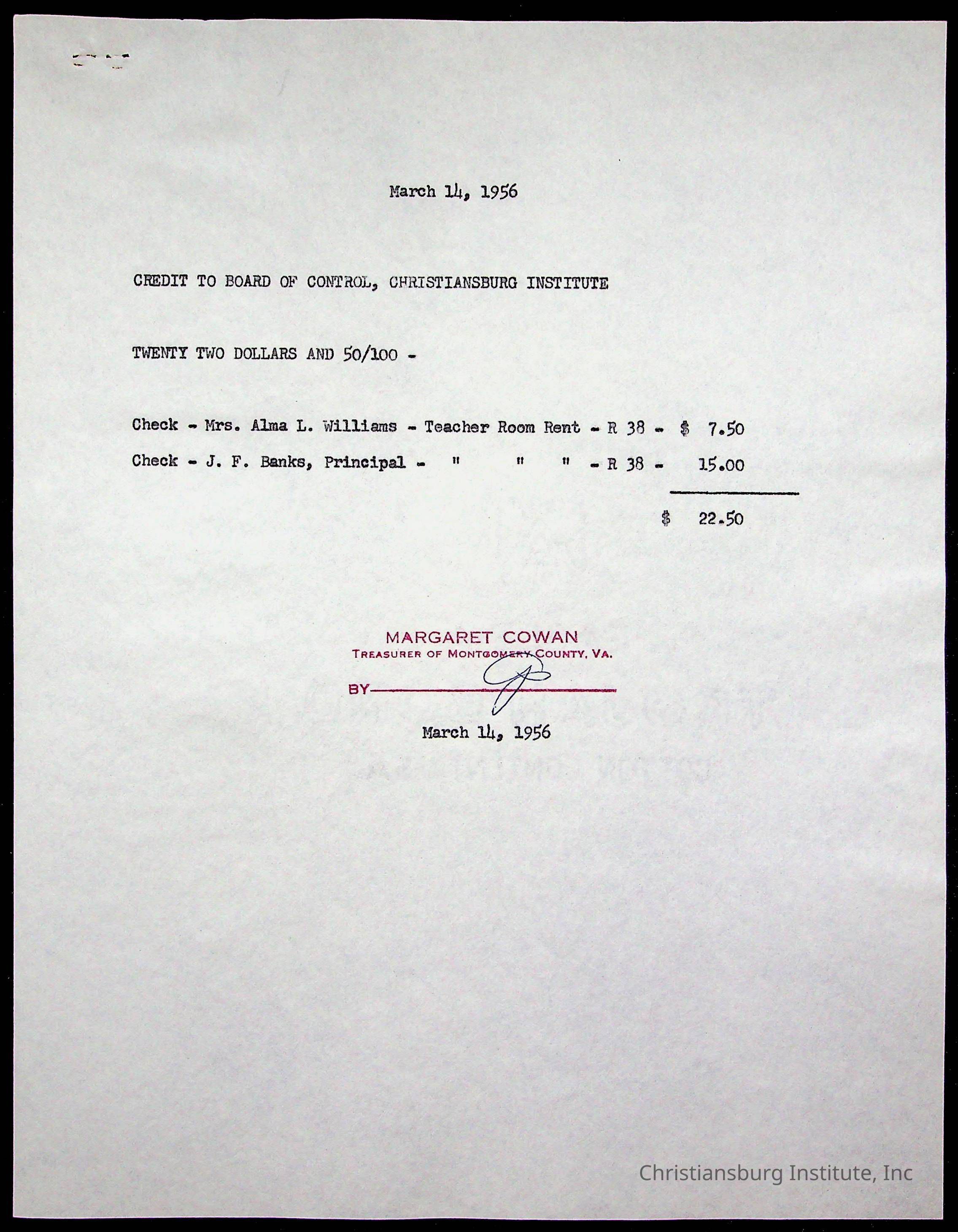 Christiansburg Institute Treasury Receipts, 1955-1956