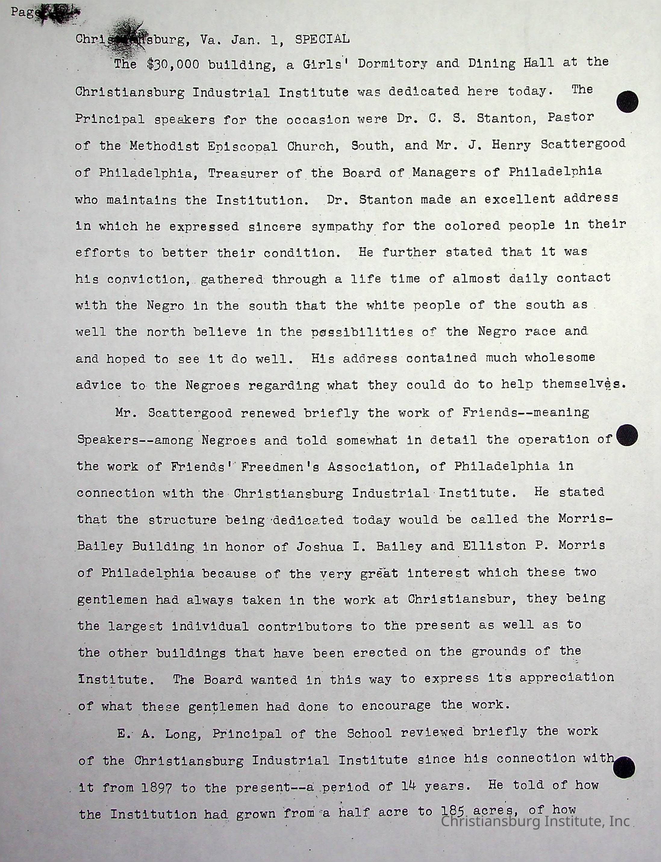 A photocopy version of a typed document titled 'Christiansburg, VA. Jan 1, Special' circa 1912. Gifted by Carlton Banks in 2001.Collection