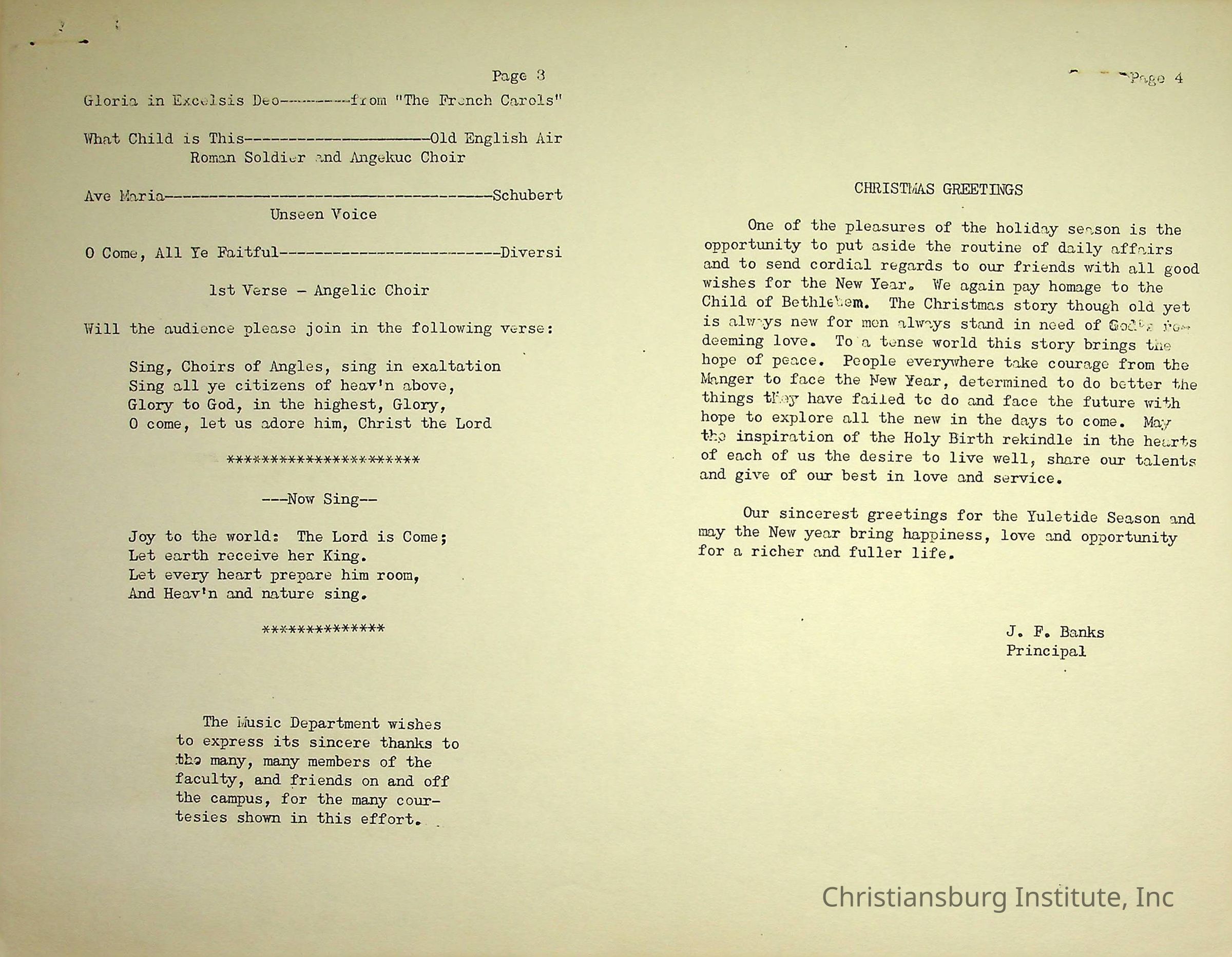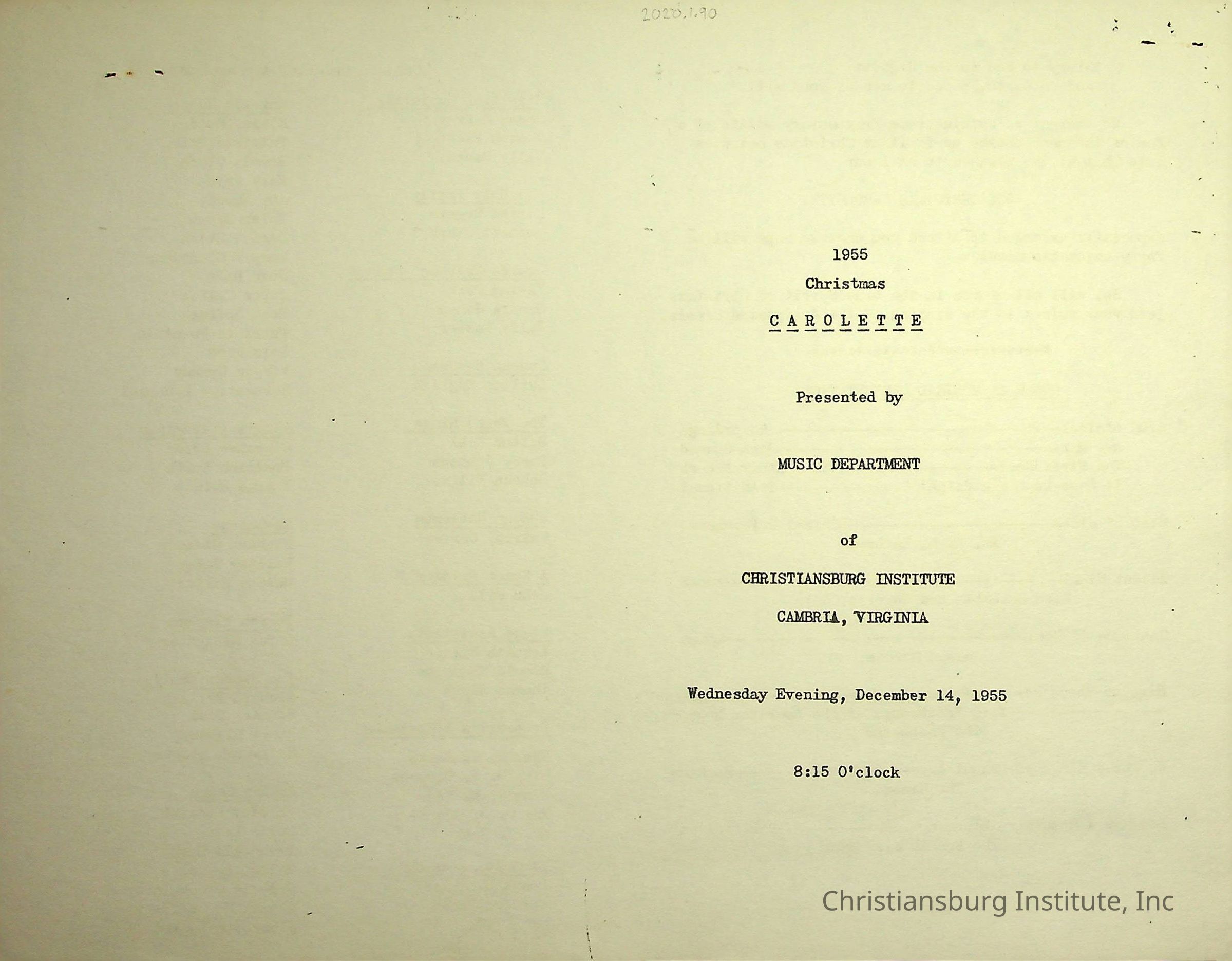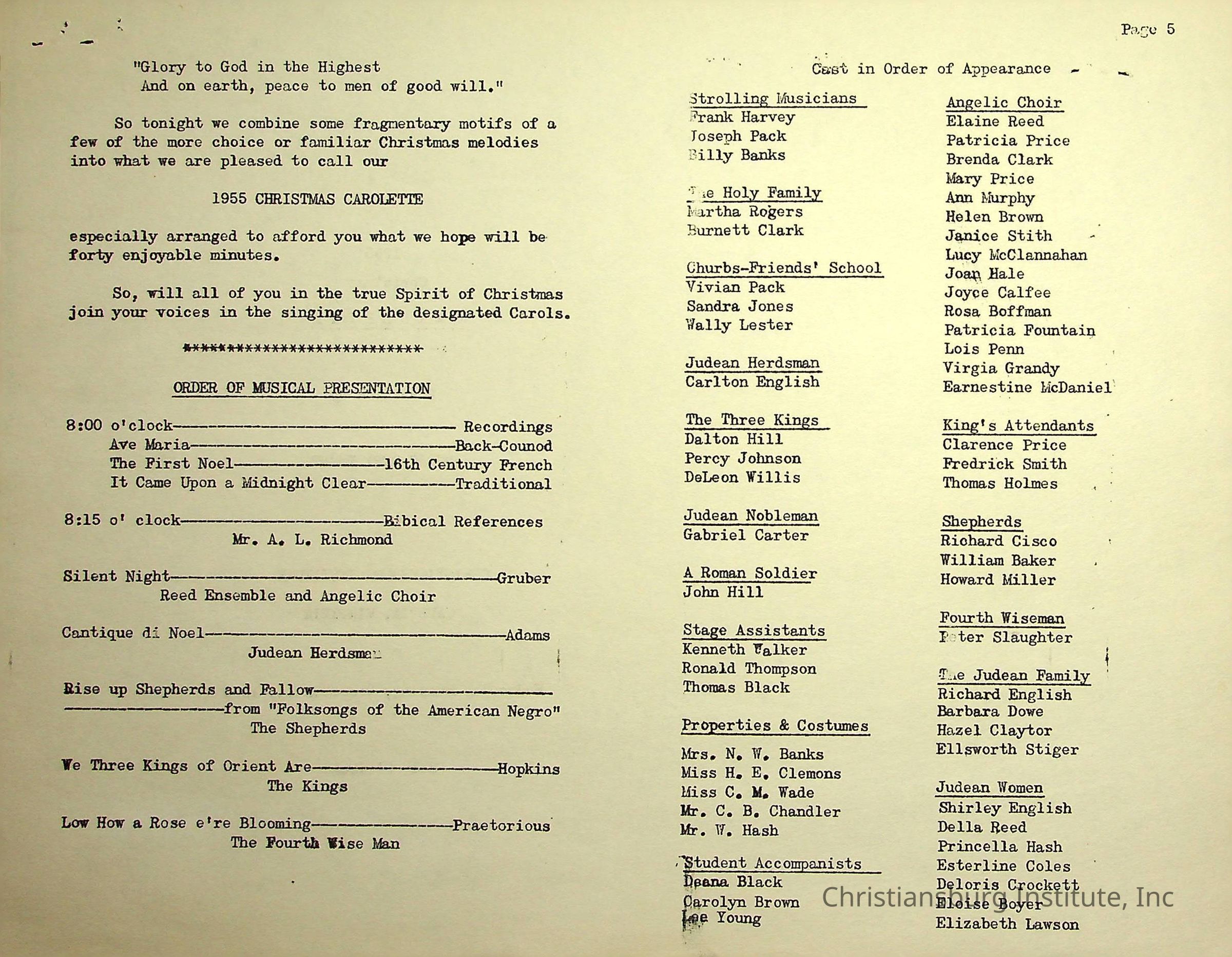An event program for the Christmas Carolette presented by Christiansburg Institute on December 14th, 1955.