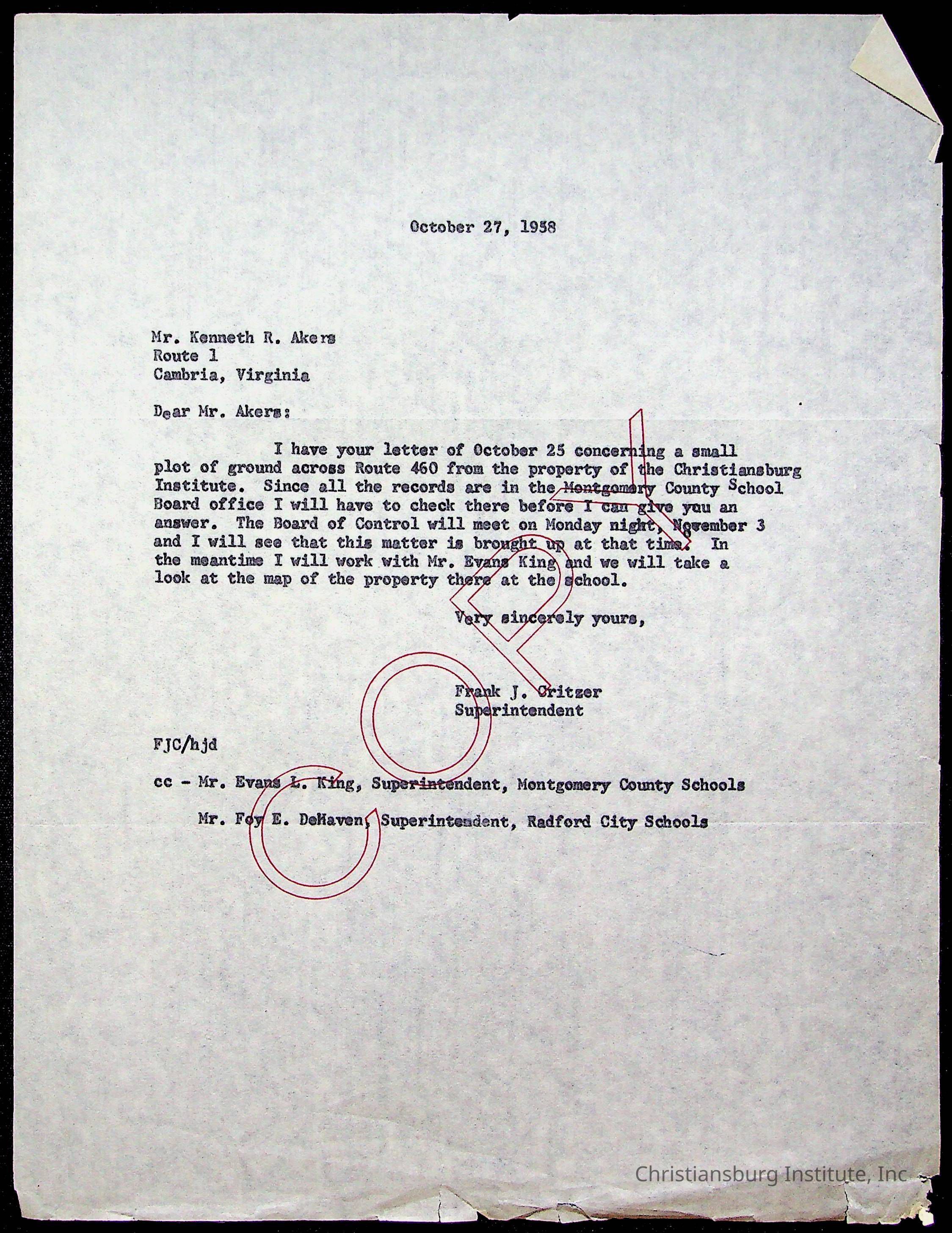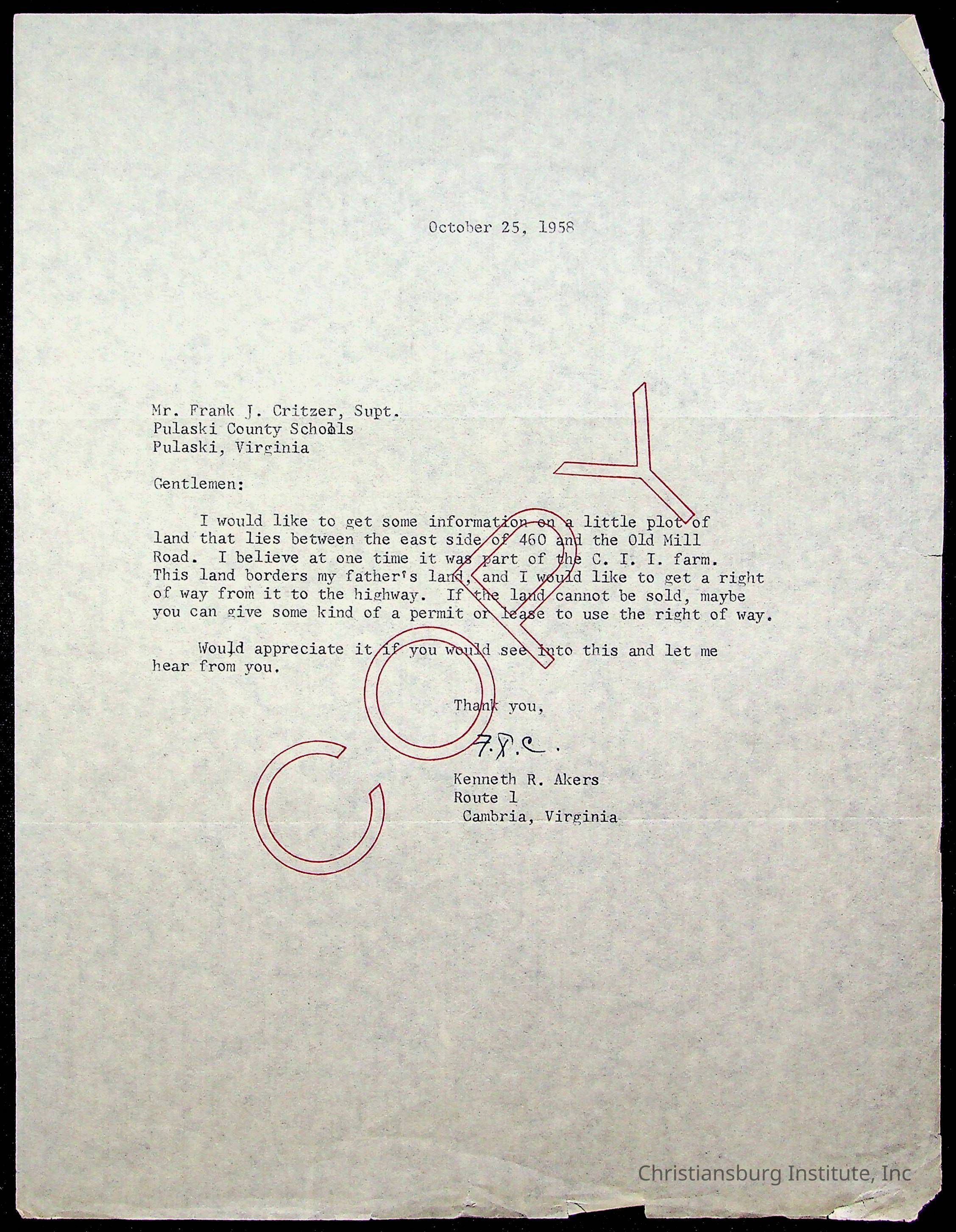 A series of correspondence between Kenneth R. Akers and Superintendent, Frank J. Critzer regarding a small plot of land owned by Christiansburg Institute and permission to access Route 1, dated October 1958.Collection