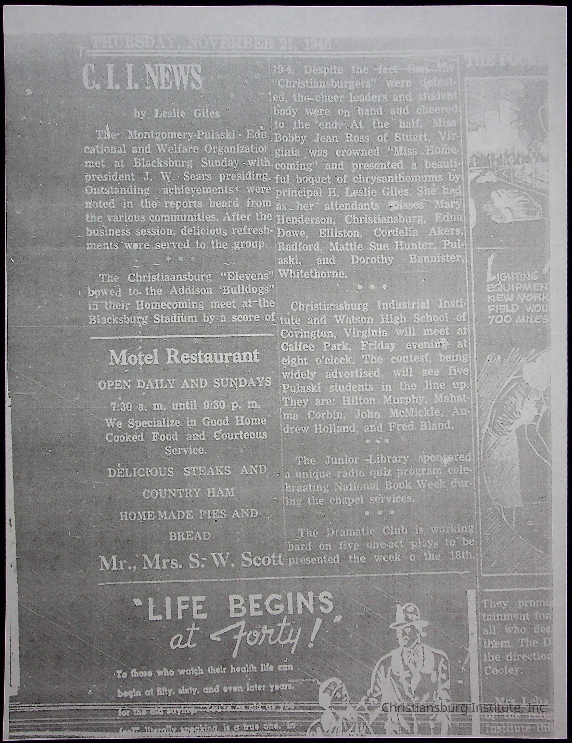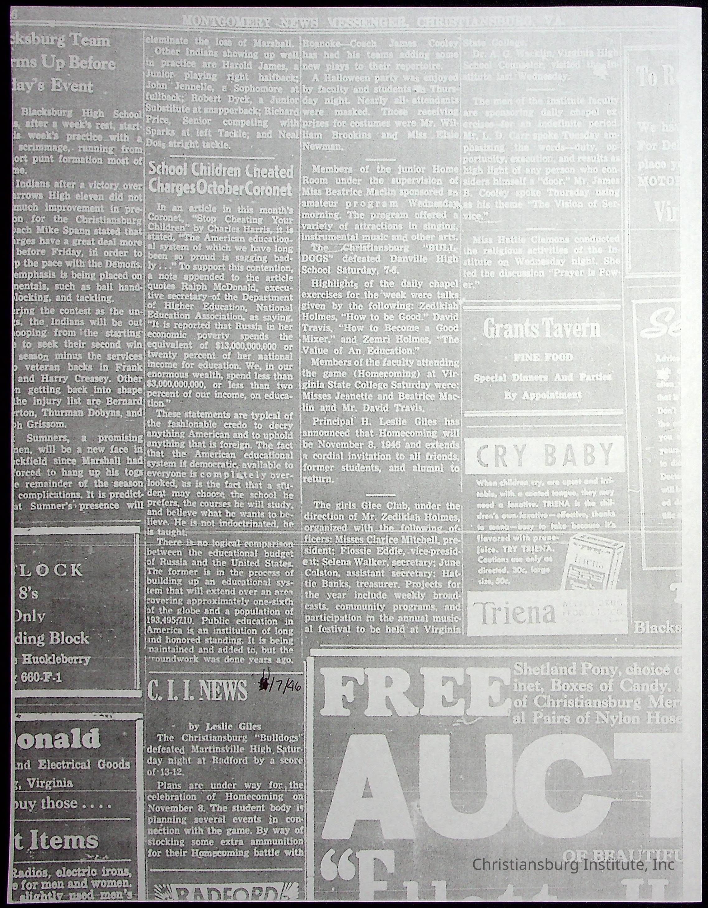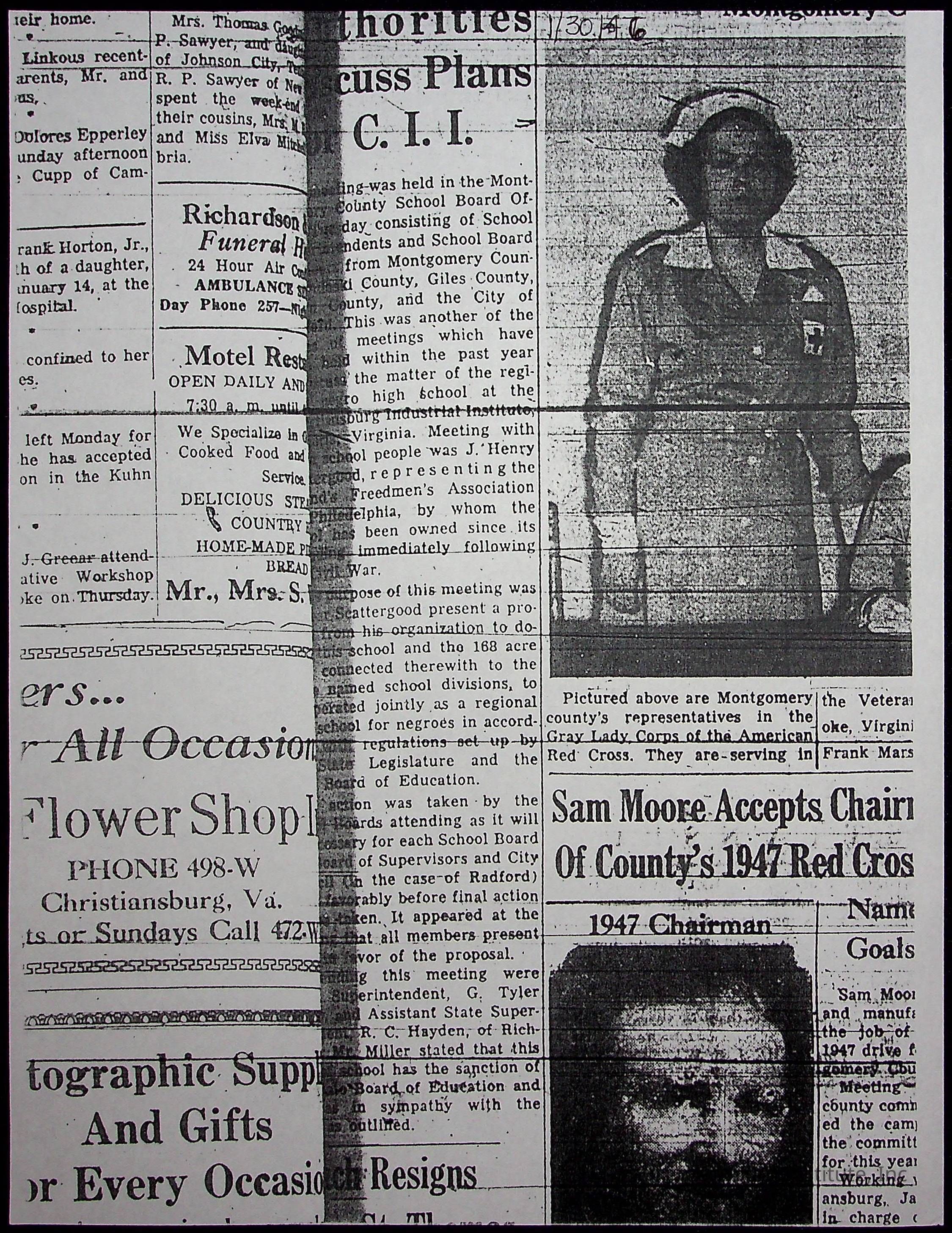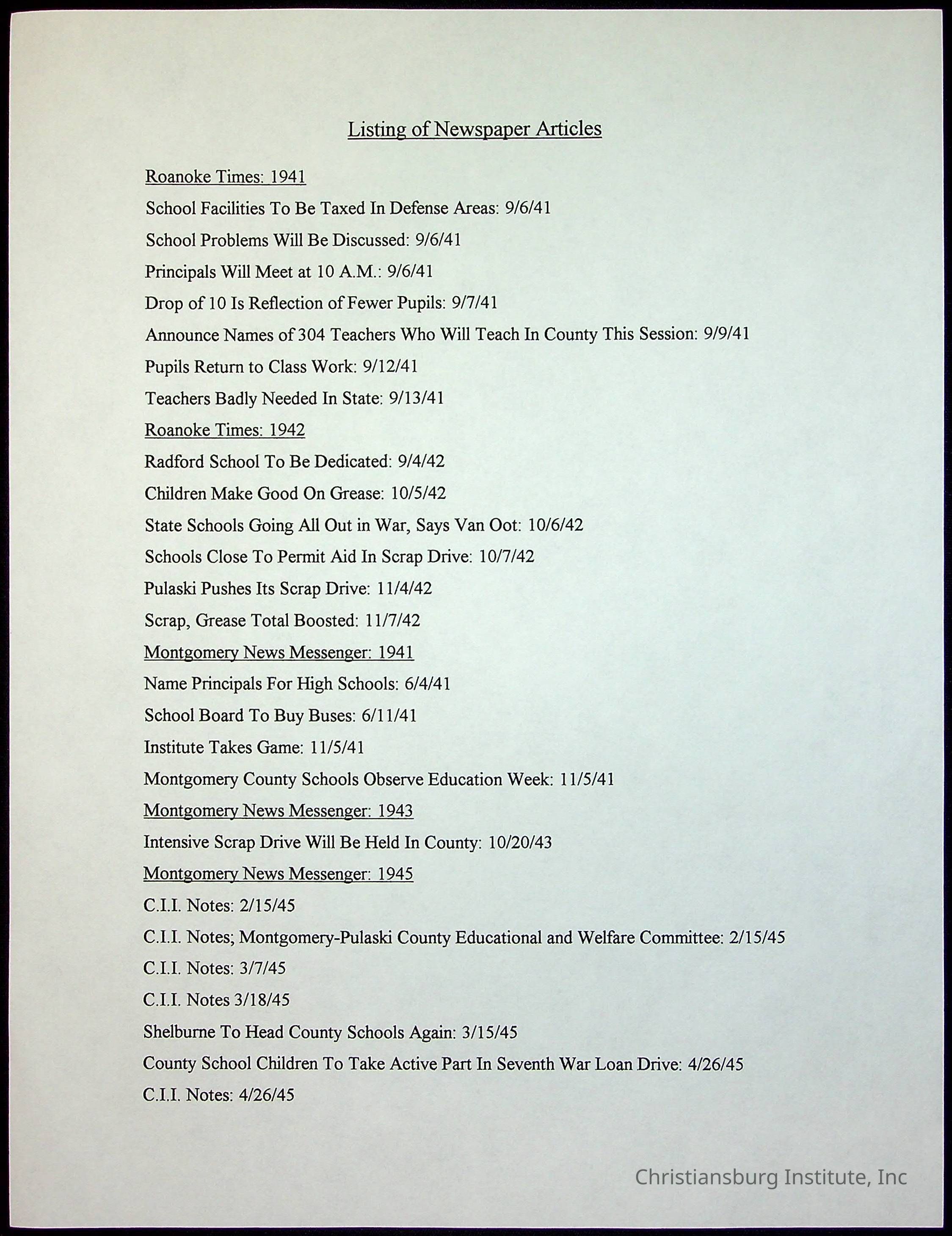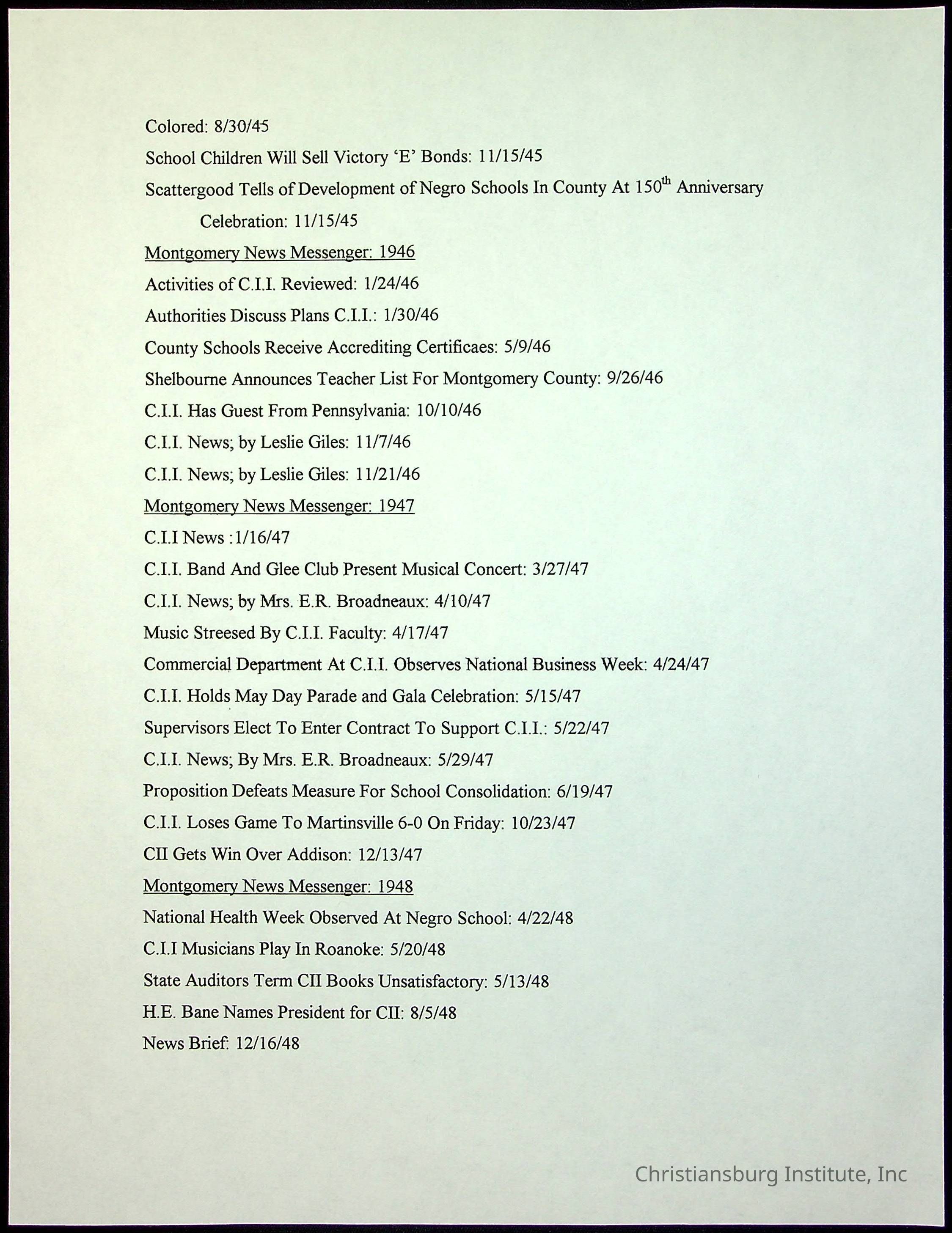 A collection of newspaper articles that feature stories about Christiansburg Institute and other Montgomery County schools dates range from 1941 through 1948. These articles come from various newspapers.Date(s) of Creation